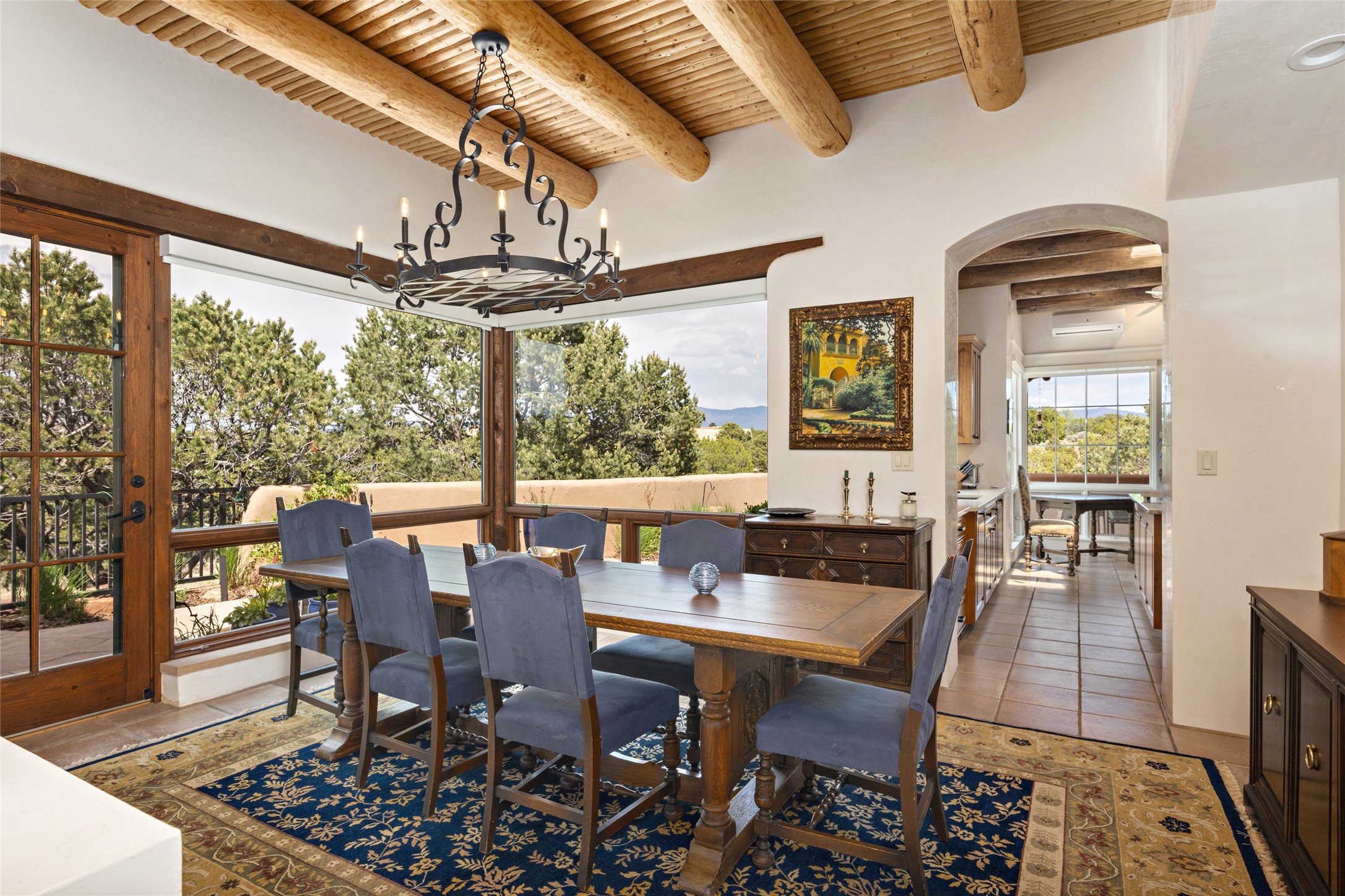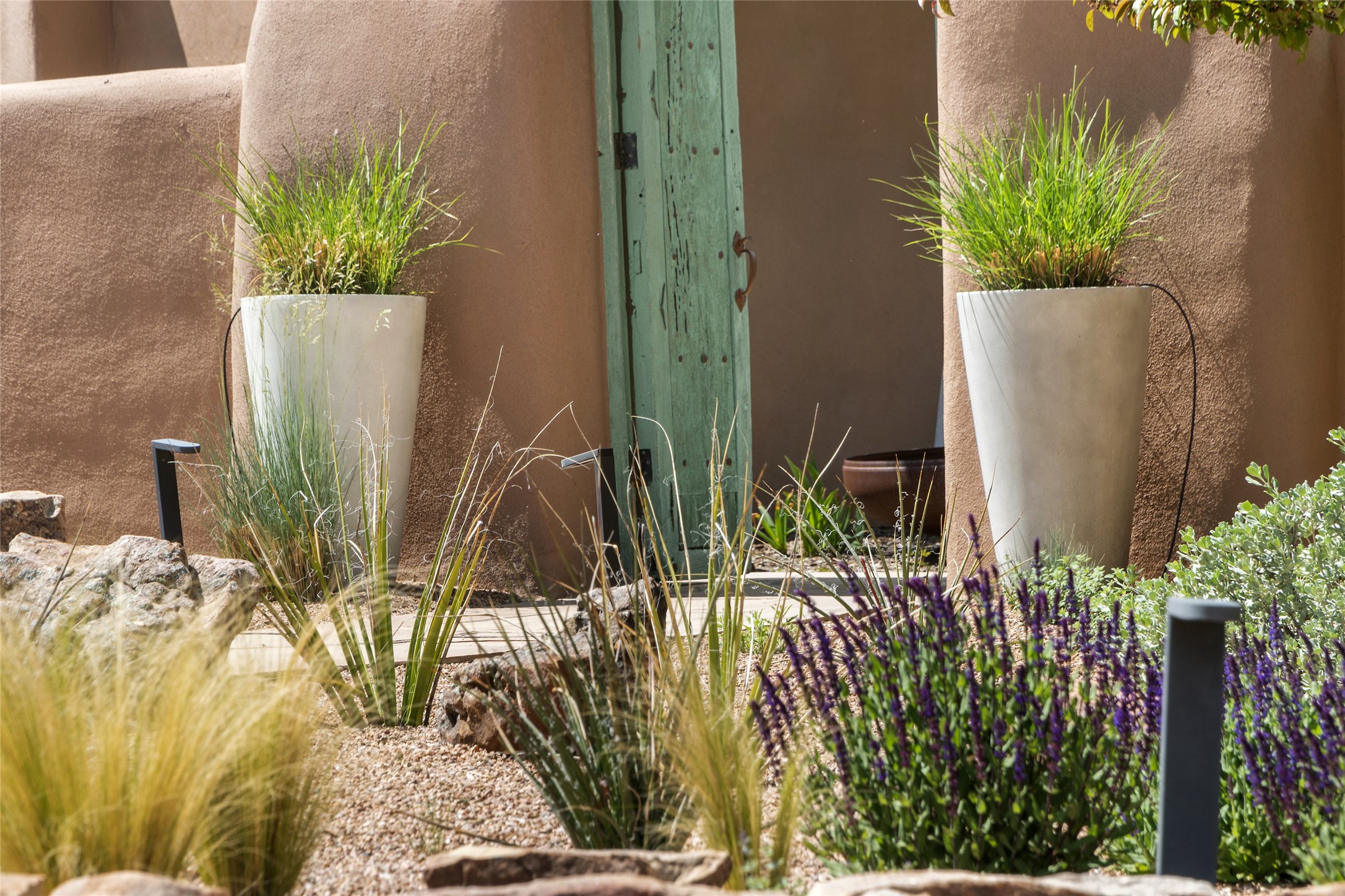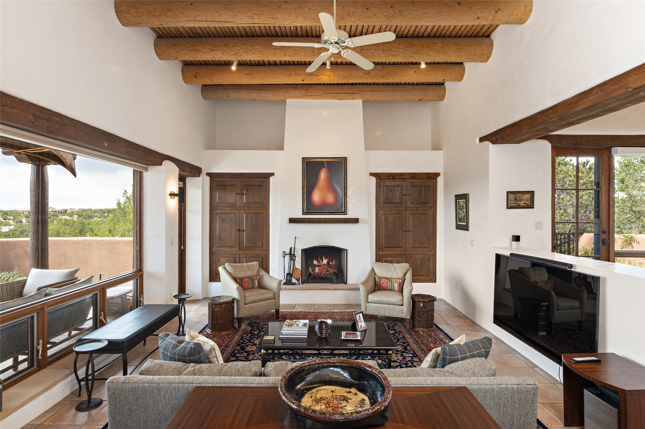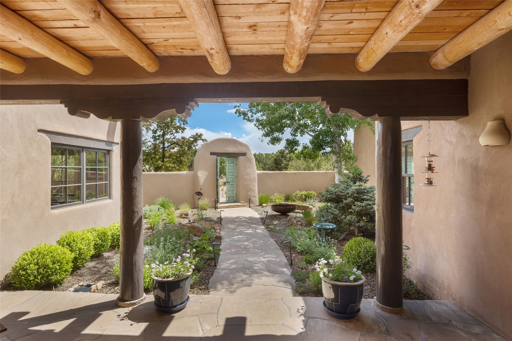 MOUNTAIN VIEWS EAST AND WEST! Welcome to your jewel box of a home in the exclusive Las Campanas community of Santa Fe. This stunning 3 bedroom, 3.5 bathroom single level home on an elevated lot offers unparalleled views of the majestic Sangre de Cristo & Jemez mountains, and the serene high desert landscape. A spacious and elegant floor plan, featuring plaster walls, high ceilings, abundant natural light, and a cook's kitchen with stone and quartz countertops, stainless steel appliances, plus sunny breakfast nook. The formal dining area is perfect for hosting family and friends, while the cozy living room boasts a fireplace and a wall of windows that showcase the breathtaking scenery. The owner's suite is a true retreat, with a walk-in closet, a spa-like bathroom, and a private portal where you can relax and enjoy the sunsets. The other two bedrooms are also generous in size and feature views and en-suite bathrooms. The outdoor living space is equally impressive, with three portals and courtyards that offer different perspectives of the stunning surroundings. The backyard is beautifully landscaped with native plants and flowers and has plenty of room for entertaining or gardening. This home is located in a core location in the coveted Las Campanas subdivision, which offers 24-hour security for homeowners, and offers private club members amenities such as golf, tennis, fitness center, spa, equestrian center, and fine dining. You will also appreciate the proximity to downtown Santa Fe, where you can explore the rich culture, history, and art of the City Different. This home is a rare opportunity to own a piece of paradise in one of the most desirable locations in New Mexico. Easy lock and leave. Don't miss this chance to make it yours!