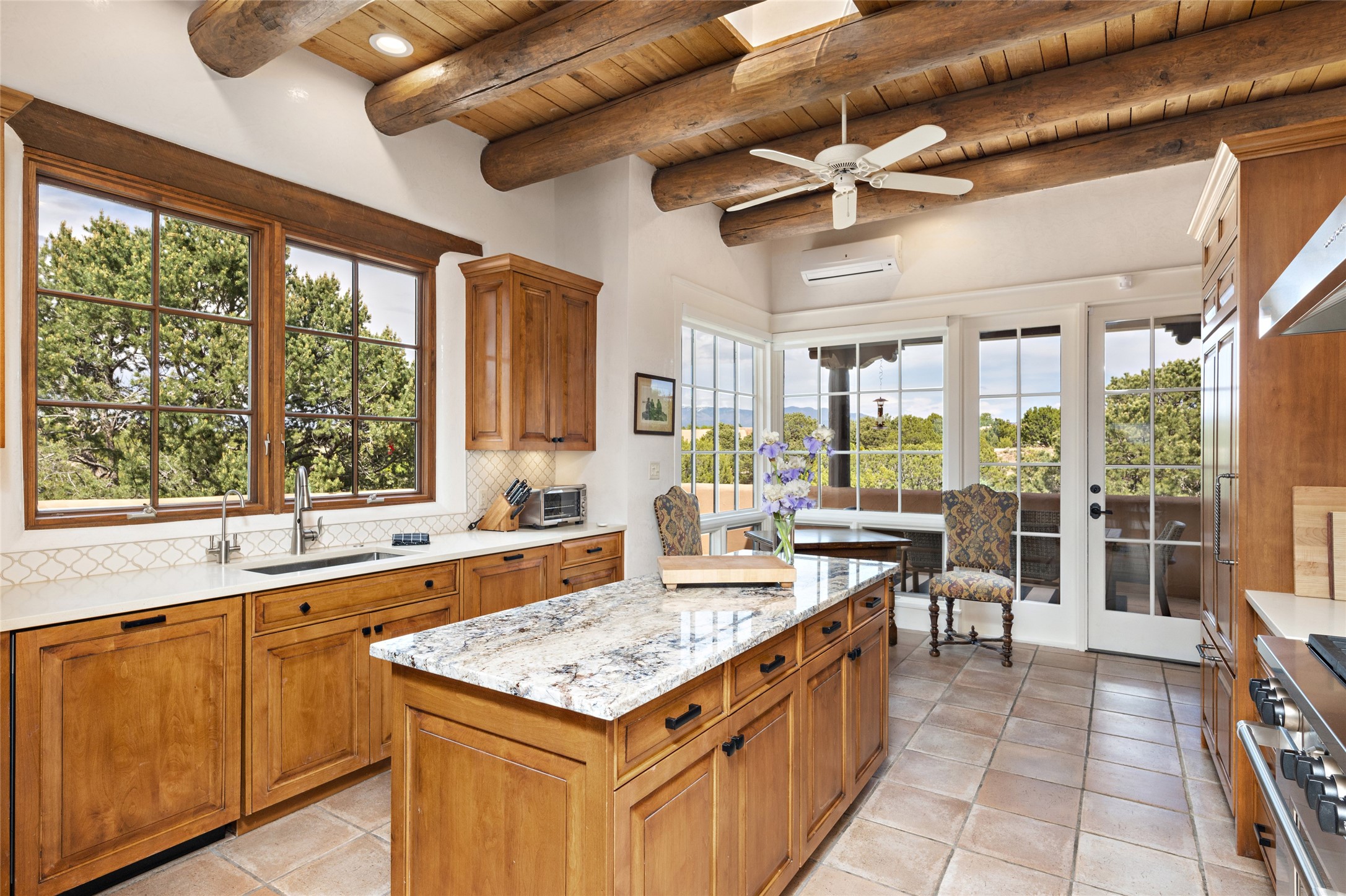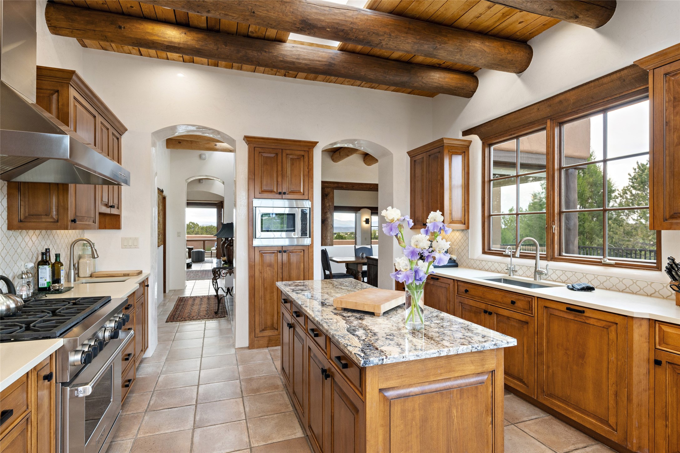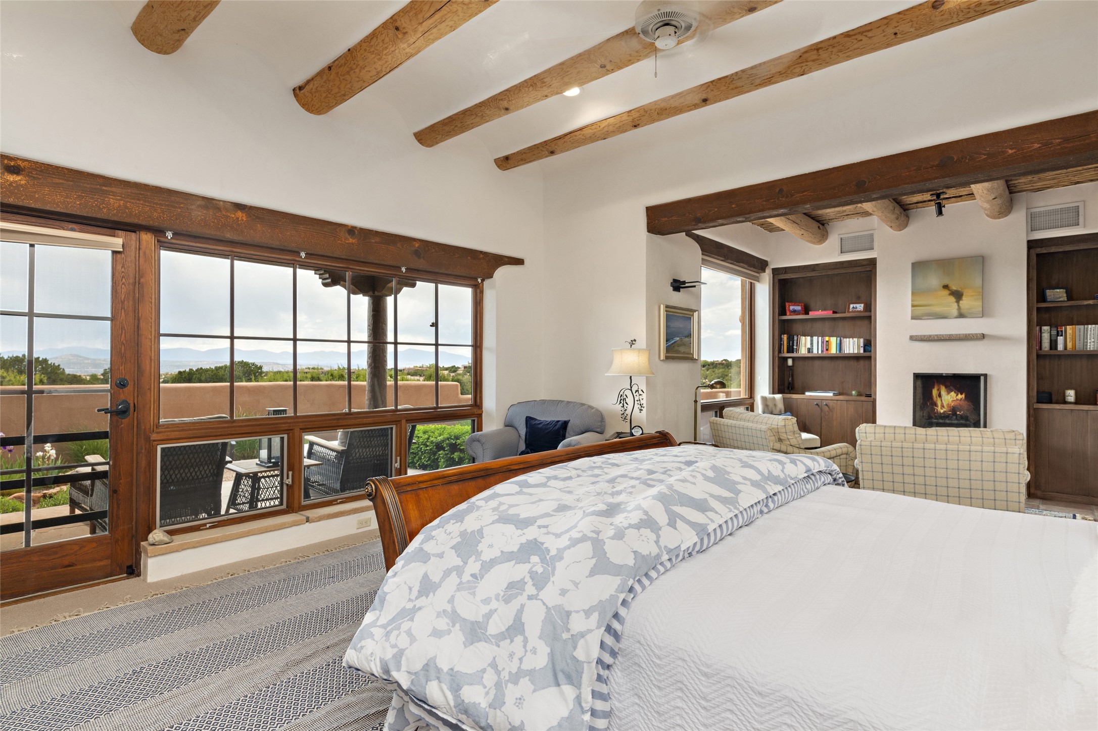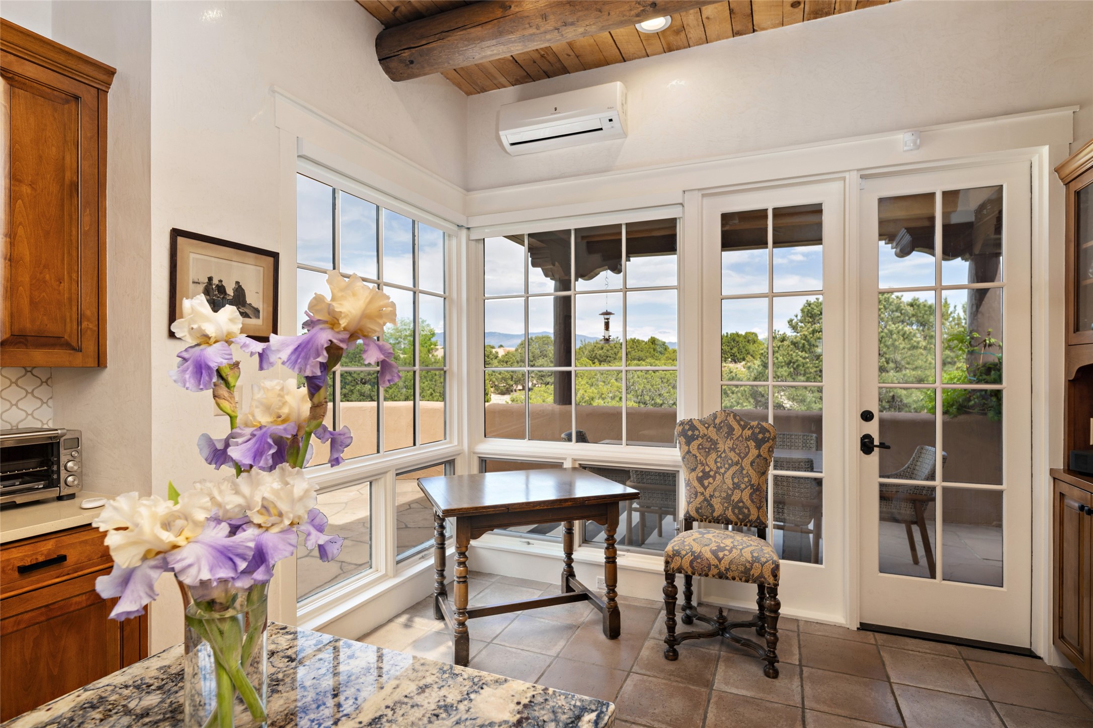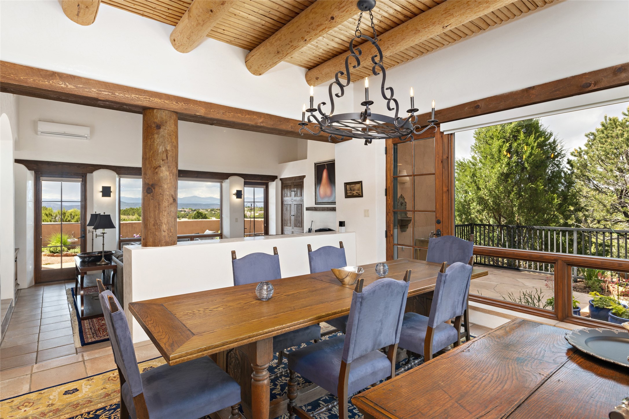 MOUNTAIN VIEWS EAST AND WEST! Welcome to your jewel box of a home in the exclusive Las Campanas community of Santa Fe. This stunning 3 bedroom, 3.5 bathroom single level home on an elevated lot offers unparalleled views of the majestic Sangre de Cristo & Jemez mountains, and the serene high desert landscape. A spacious and elegant floor plan, featuring plaster walls, high ceilings, abundant natural light, and a cook's kitchen with stone and quartz countertops, stainless steel appliances, plus sunny breakfast nook. The formal dining area is perfect for hosting family and friends, while the cozy living room boasts a fireplace and a wall of windows that showcase the breathtaking scenery. The owner's suite is a true retreat, with a walk-in closet, a spa-like bathroom, and a private portal where you can relax and enjoy the sunsets. The other two bedrooms are also generous in size and feature views and en-suite bathrooms. The outdoor living space is equally impressive, with three portals and courtyards that offer different perspectives of the stunning surroundings. The backyard is beautifully landscaped with native plants and flowers and has plenty of room for entertaining or gardening. This home is located in a core location in the coveted Las Campanas subdivision, which offers 24-hour security for homeowners, and offers private club members amenities such as golf, tennis, fitness center, spa, equestrian center, and fine dining. You will also appreciate the proximity to downtown Santa Fe, where you can explore the rich culture, history, and art of the City Different. This home is a rare opportunity to own a piece of paradise in one of the most desirable locations in New Mexico. Easy lock and leave. Don't miss this chance to make it yours!