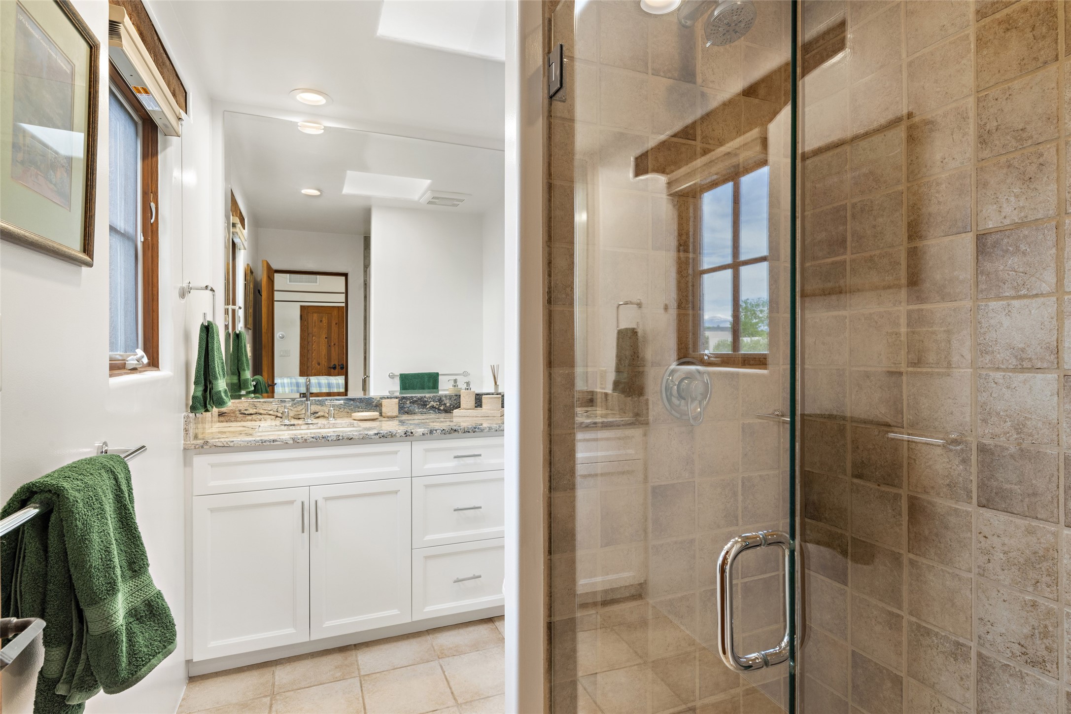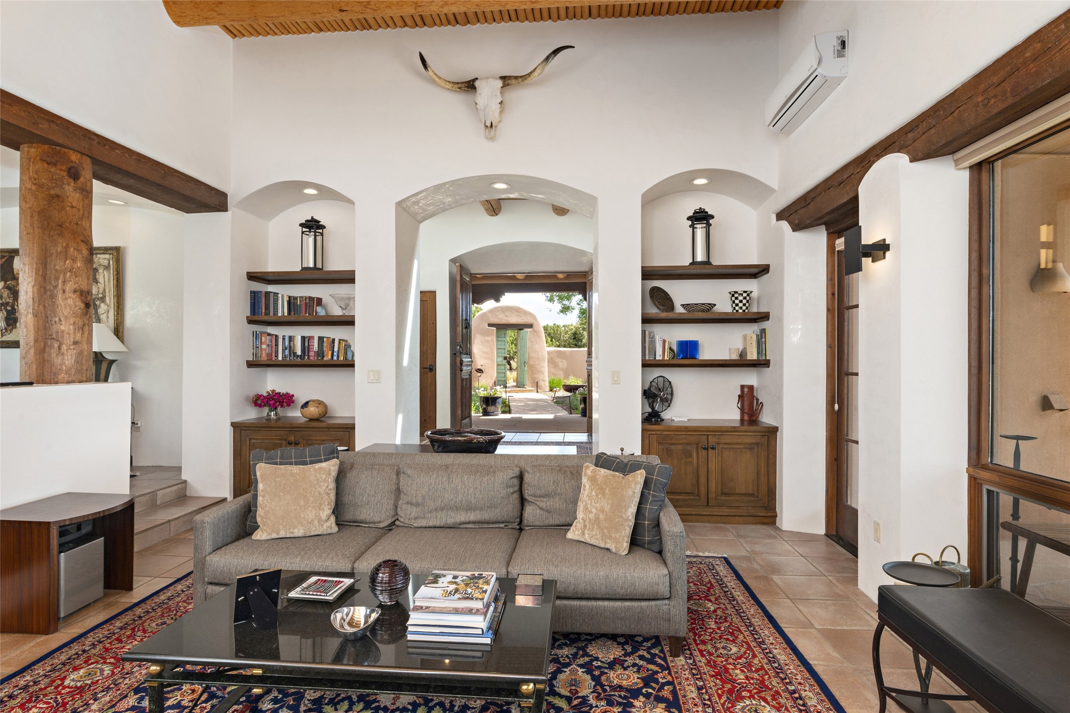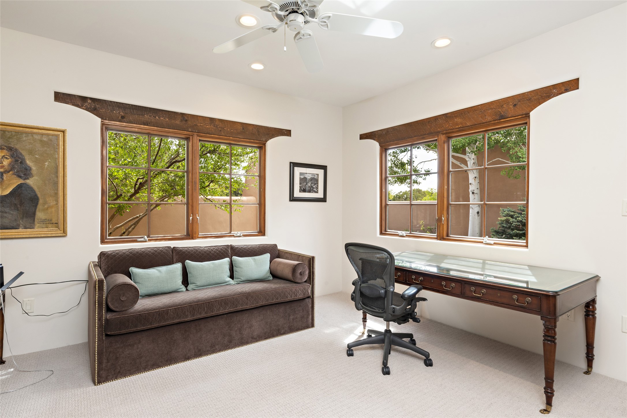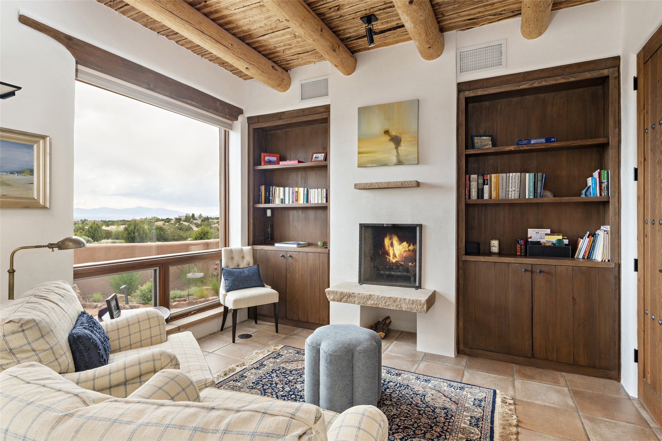 MOUNTAIN VIEWS EAST AND WEST! Welcome to your jewel box of a home in the exclusive Las Campanas community of Santa Fe. This stunning 3 bedroom, 3.5 bathroom single level home on an elevated lot offers unparalleled views of the majestic Sangre de Cristo & Jemez mountains, and the serene high desert landscape. A spacious and elegant floor plan, featuring plaster walls, high ceilings, abundant natural light, and a cook's kitchen with stone and quartz countertops, stainless steel appliances, plus sunny breakfast nook. The formal dining area is perfect for hosting family and friends, while the cozy living room boasts a fireplace and a wall of windows that showcase the breathtaking scenery. The owner's suite is a true retreat, with a walk-in closet, a spa-like bathroom, and a private portal where you can relax and enjoy the sunsets. The other two bedrooms are also generous in size and feature views and en-suite bathrooms. The outdoor living space is equally impressive, with three portals and courtyards that offer different perspectives of the stunning surroundings. The backyard is beautifully landscaped with native plants and flowers and has plenty of room for entertaining or gardening. This home is located in a core location in the coveted Las Campanas subdivision, which offers 24-hour security for homeowners, and offers private club members amenities such as golf, tennis, fitness center, spa, equestrian center, and fine dining. You will also appreciate the proximity to downtown Santa Fe, where you can explore the rich culture, history, and art of the City Different. This home is a rare opportunity to own a piece of paradise in one of the most desirable locations in New Mexico. Easy lock and leave. Don't miss this chance to make it yours!