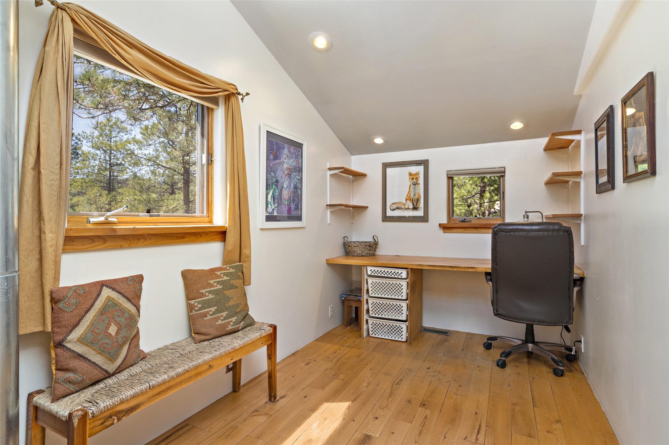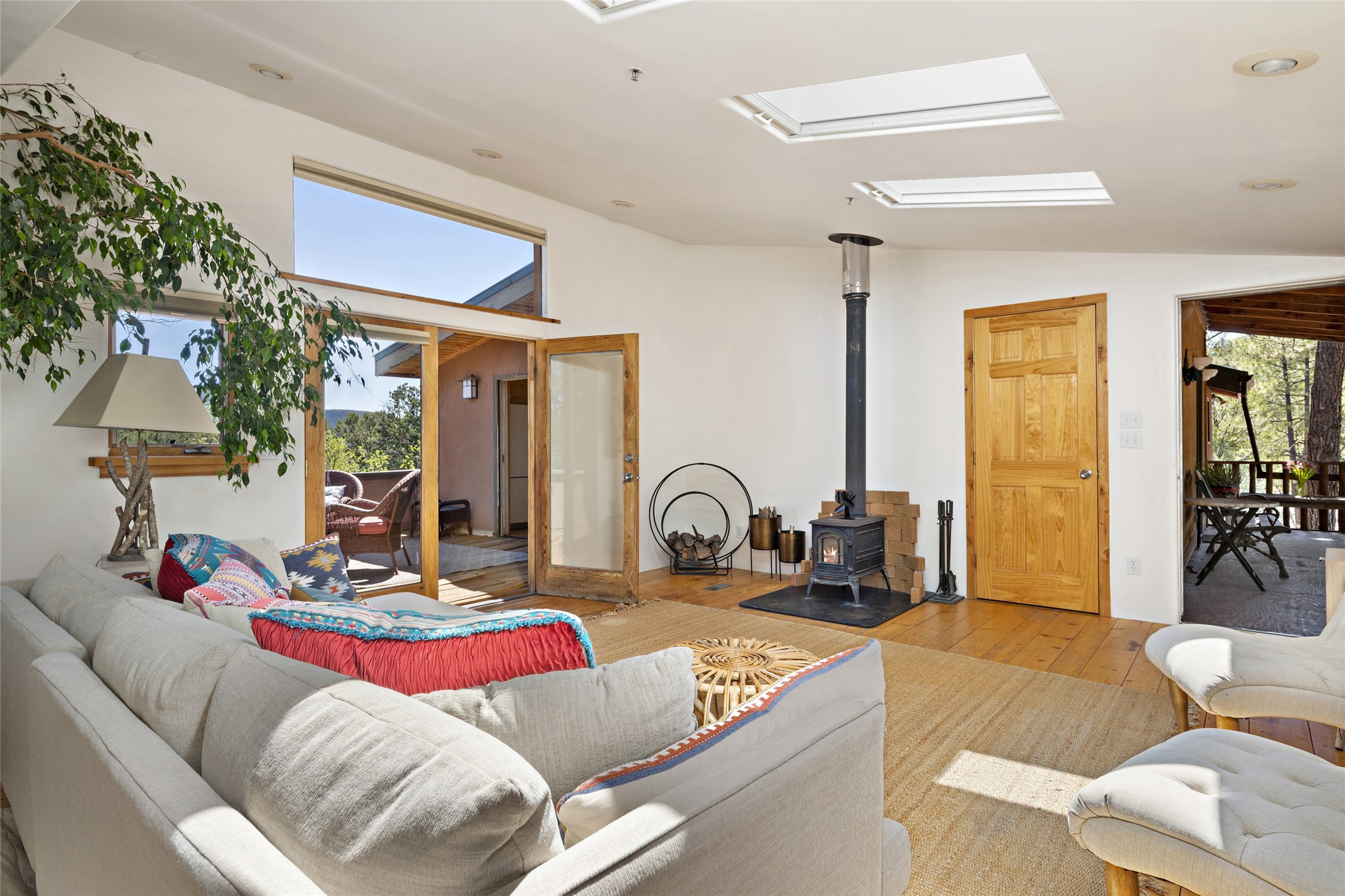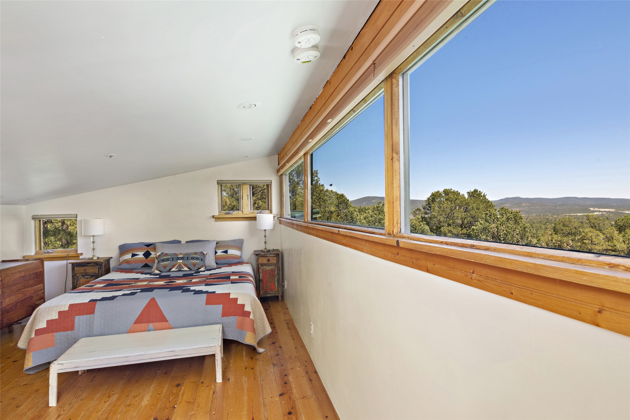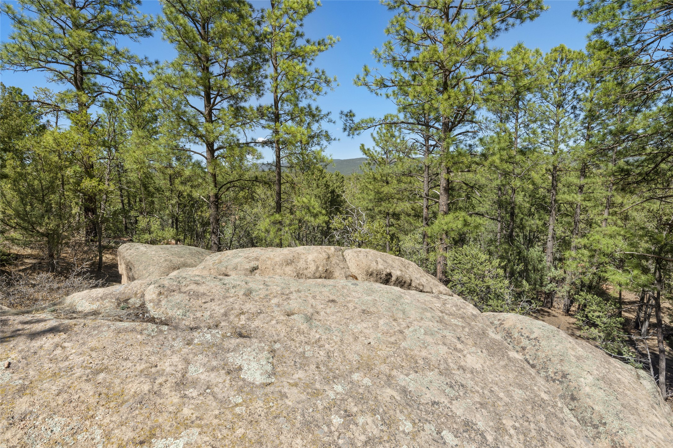 Located at the top of the hill amid Ponderosa pines and incredible rock outcroppings, this magical 4-acre property with income producing rental, is a single family residence with two completely separate living spaces of 1700 sq ft and 1500 sq ft which are separately metered and have two bedrooms each. This passive solar home was owner built with lumber from the surrounding forest and has loads of light, skylights, and views, as well as a front garden planted by a master gardener with fruit trees and perennials. The pro-panel roof is 7 years old, the eco-septic system by AAA is 3 years old and there is also fire suppression system; as well as a garage/workshop. Peaceful and quiet, with incredible starry night skies, there is amazing hiking and wildlife watching. Perfect for those desiring to be immersed in nature and close to Santa Fe!