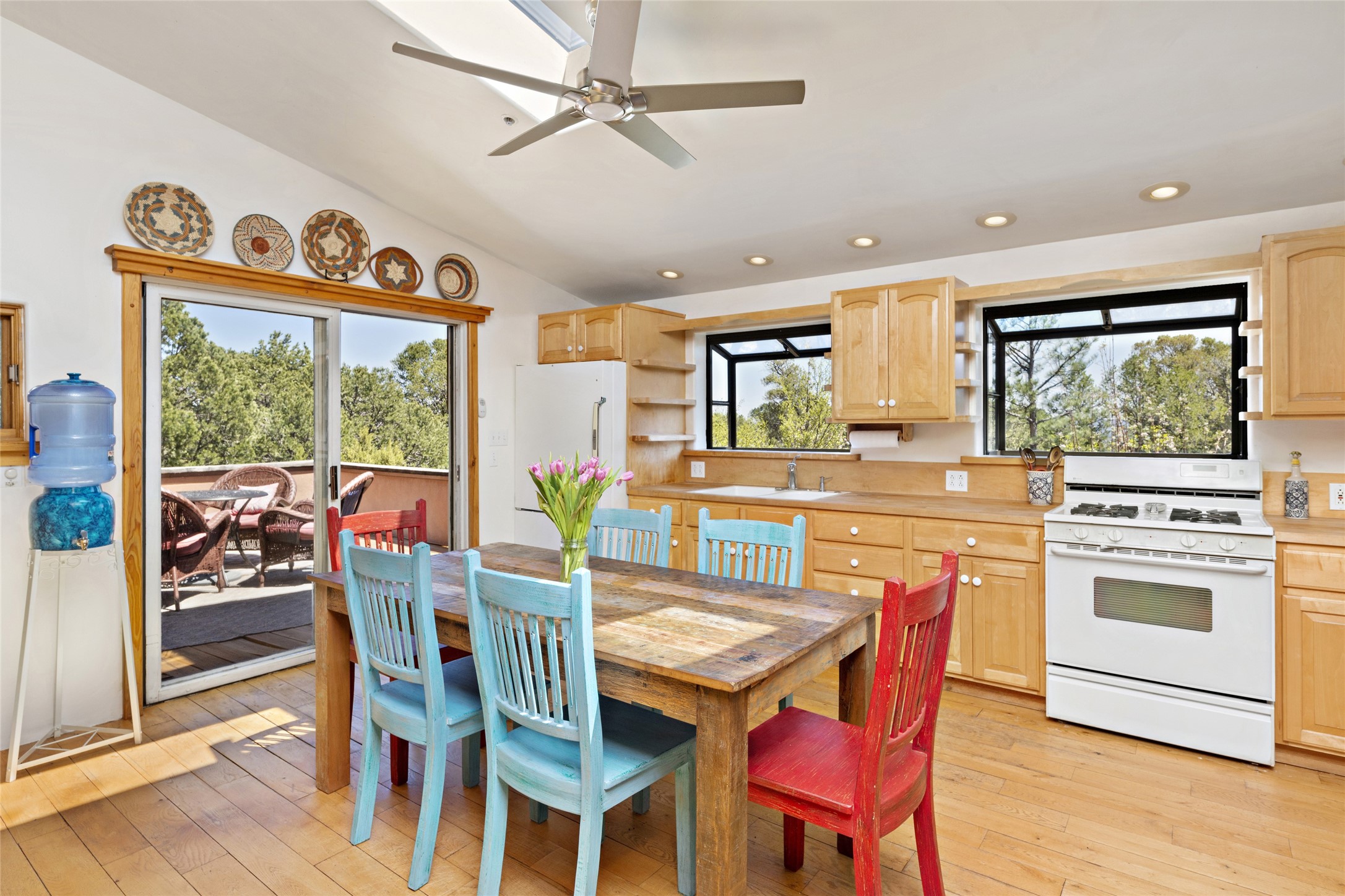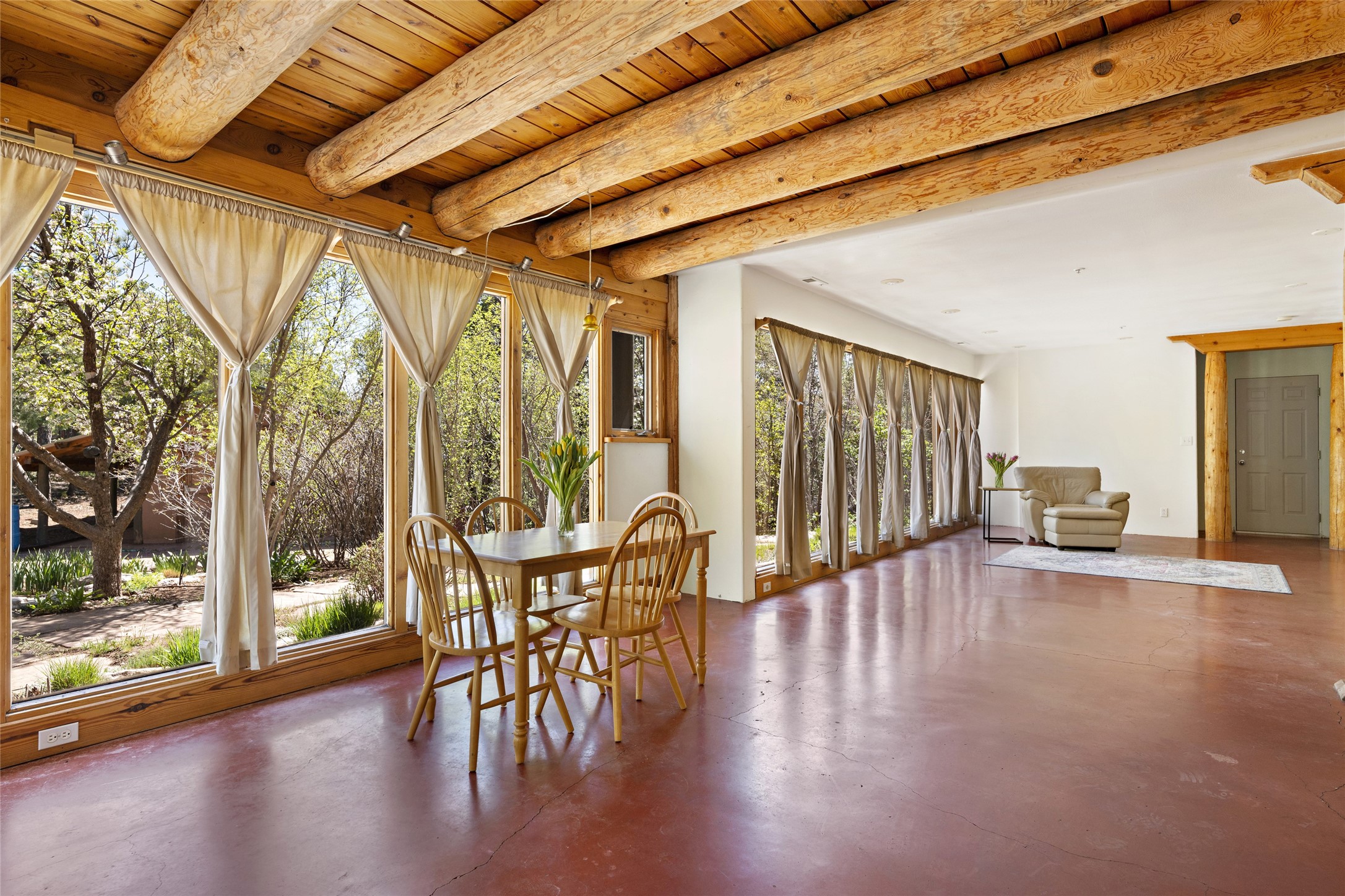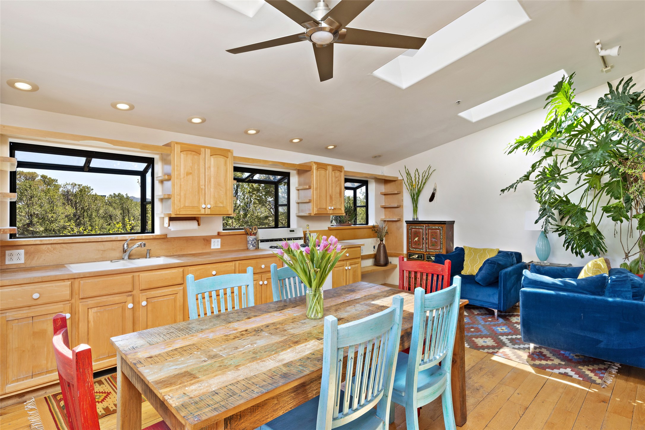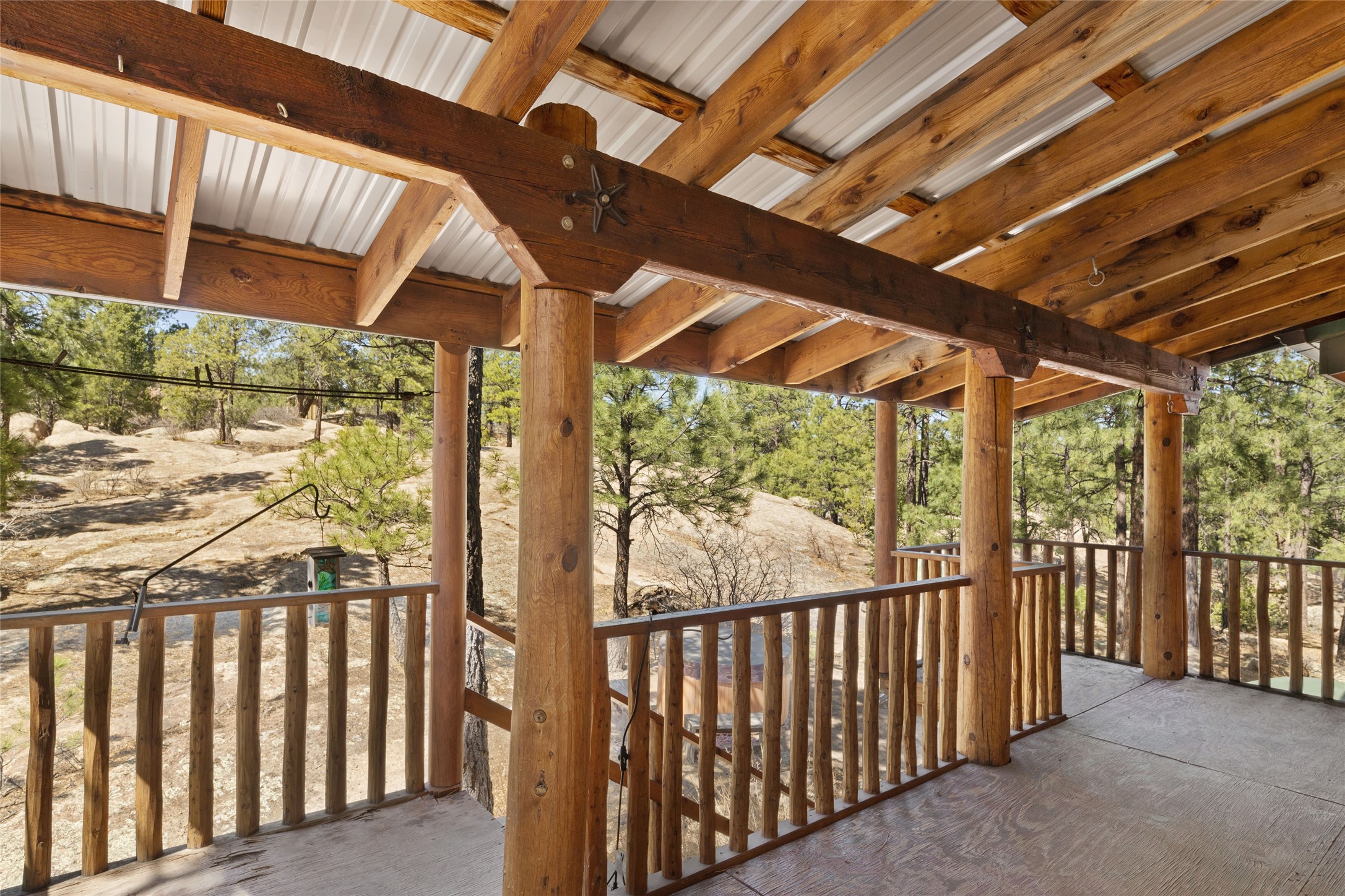 Located at the top of the hill amid Ponderosa pines and incredible rock outcroppings, this magical 4-acre property with income producing rental, is a single family residence with two completely separate living spaces of 1700 sq ft and 1500 sq ft which are separately metered and have two bedrooms each. This passive solar home was owner built with lumber from the surrounding forest and has loads of light, skylights, and views, as well as a front garden planted by a master gardener with fruit trees and perennials. The pro-panel roof is 7 years old, the eco-septic system by AAA is 3 years old and there is also fire suppression system; as well as a garage/workshop. Peaceful and quiet, with incredible starry night skies, there is amazing hiking and wildlife watching. Perfect for those desiring to be immersed in nature and close to Santa Fe!