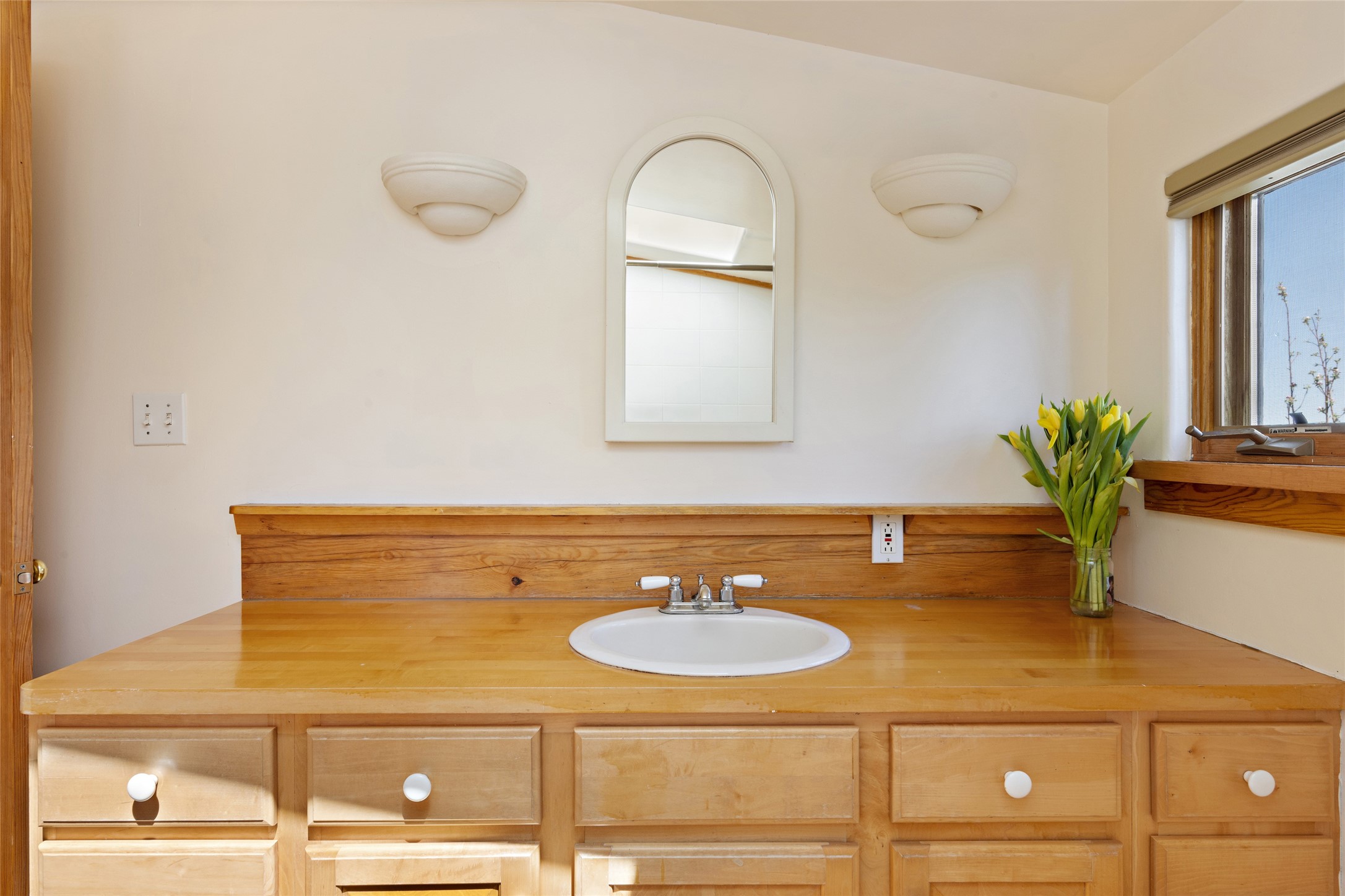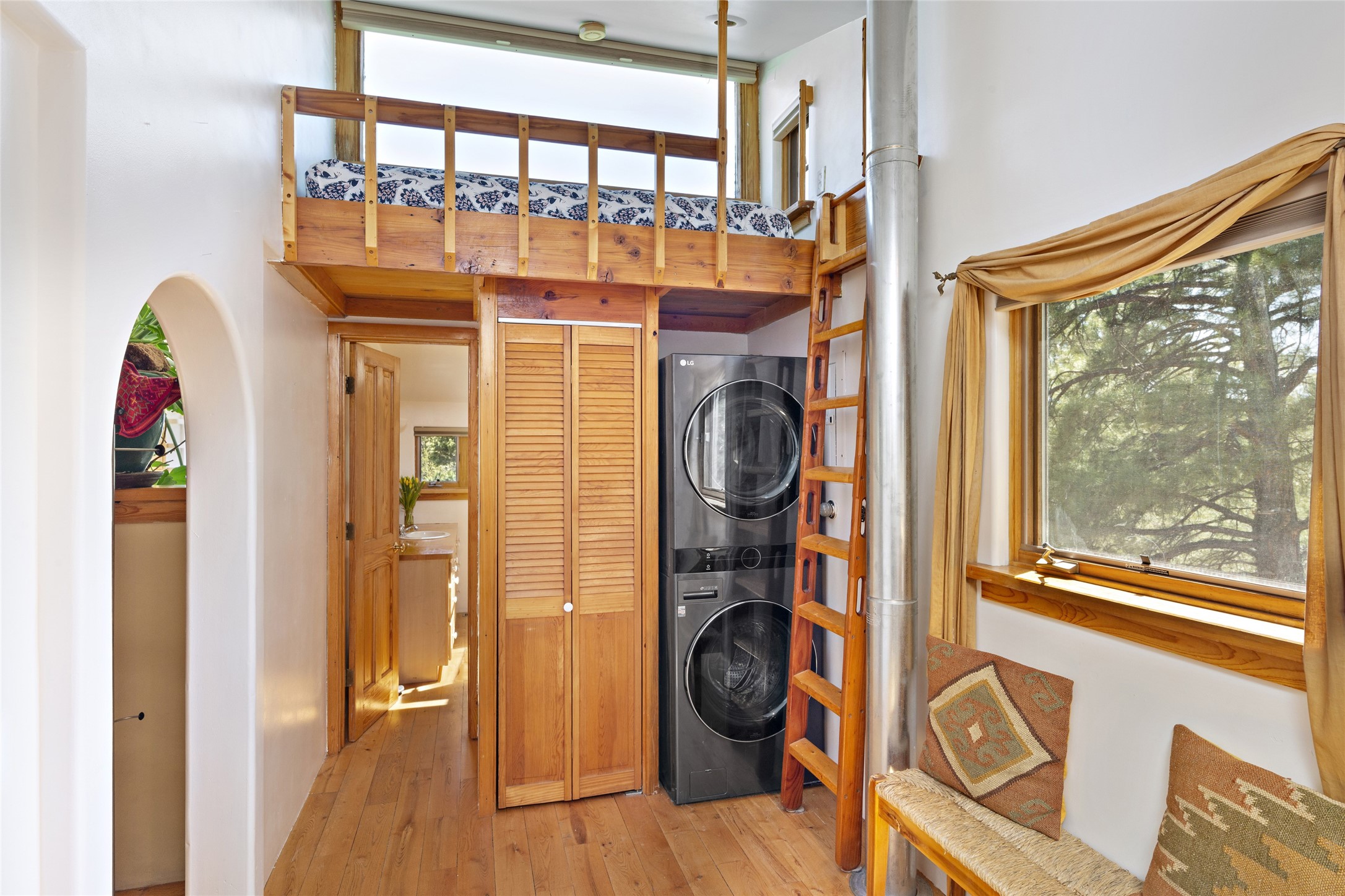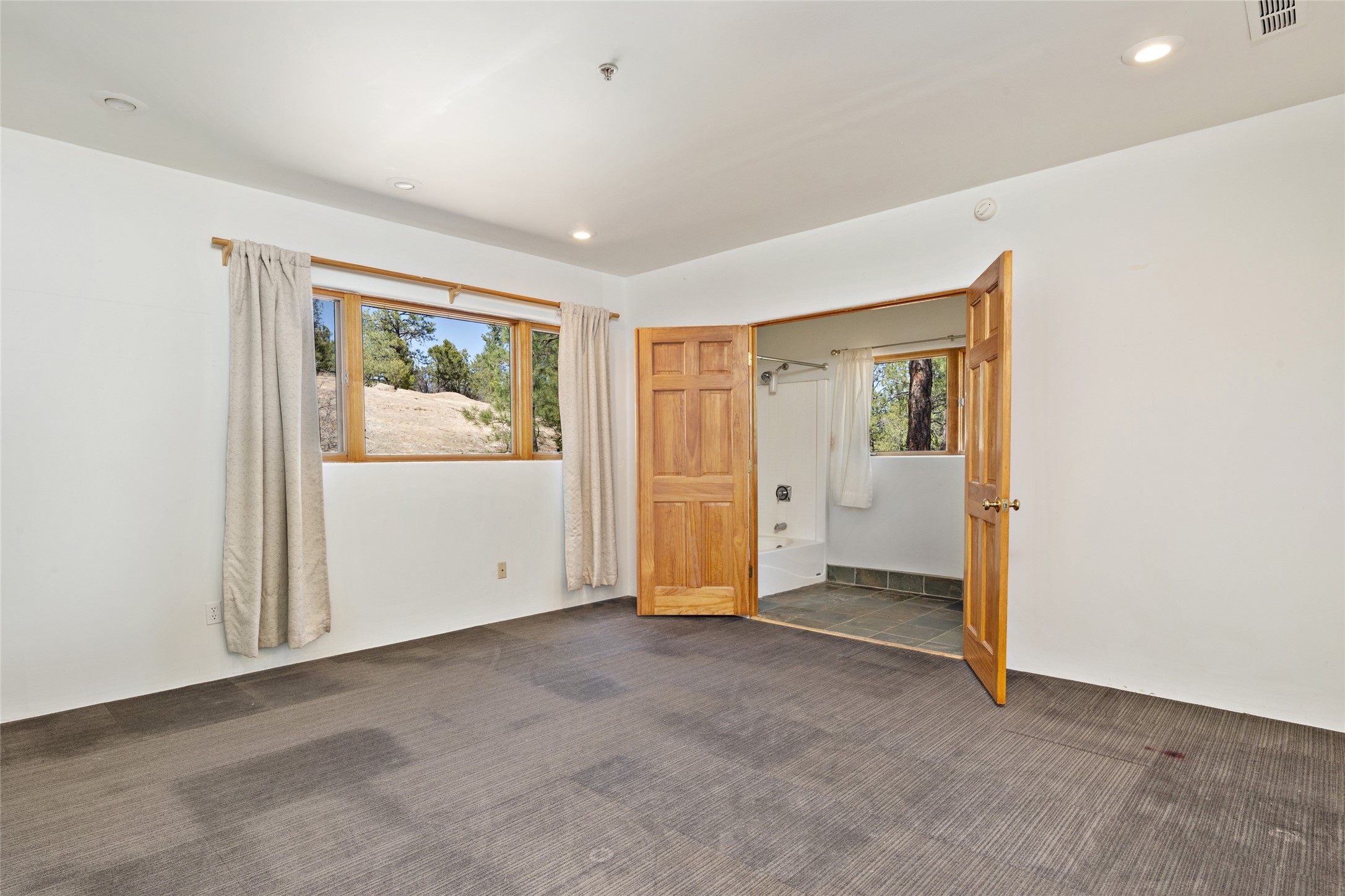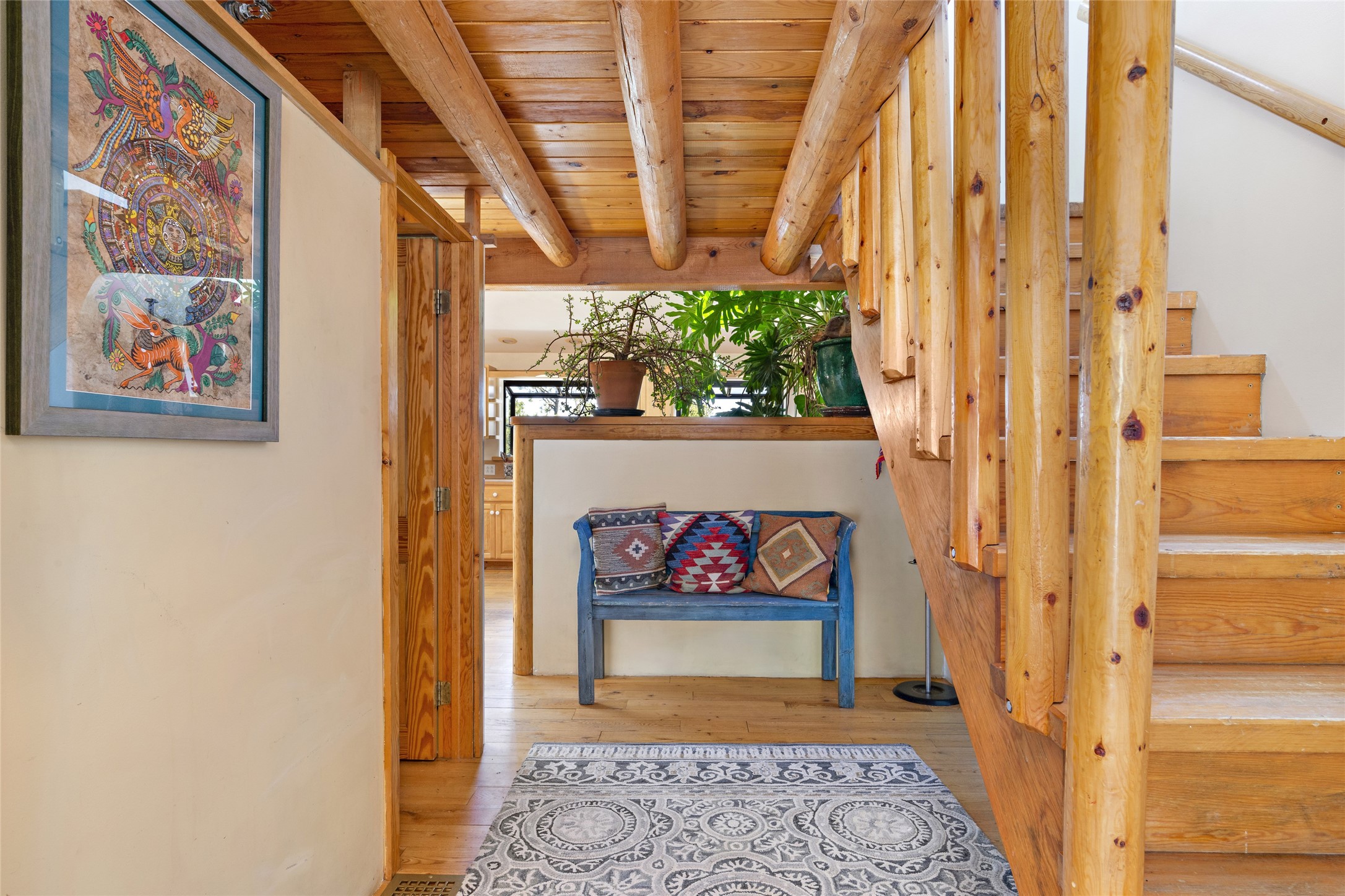 Located at the top of the hill amid Ponderosa pines and incredible rock outcroppings, this magical 4-acre property with income producing rental, is a single family residence with two completely separate living spaces of 1700 sq ft and 1500 sq ft which are separately metered and have two bedrooms each. This passive solar home was owner built with lumber from the surrounding forest and has loads of light, skylights, and views, as well as a front garden planted by a master gardener with fruit trees and perennials. The pro-panel roof is 7 years old, the eco-septic system by AAA is 3 years old and there is also fire suppression system; as well as a garage/workshop. Peaceful and quiet, with incredible starry night skies, there is amazing hiking and wildlife watching. Perfect for those desiring to be immersed in nature and close to Santa Fe!