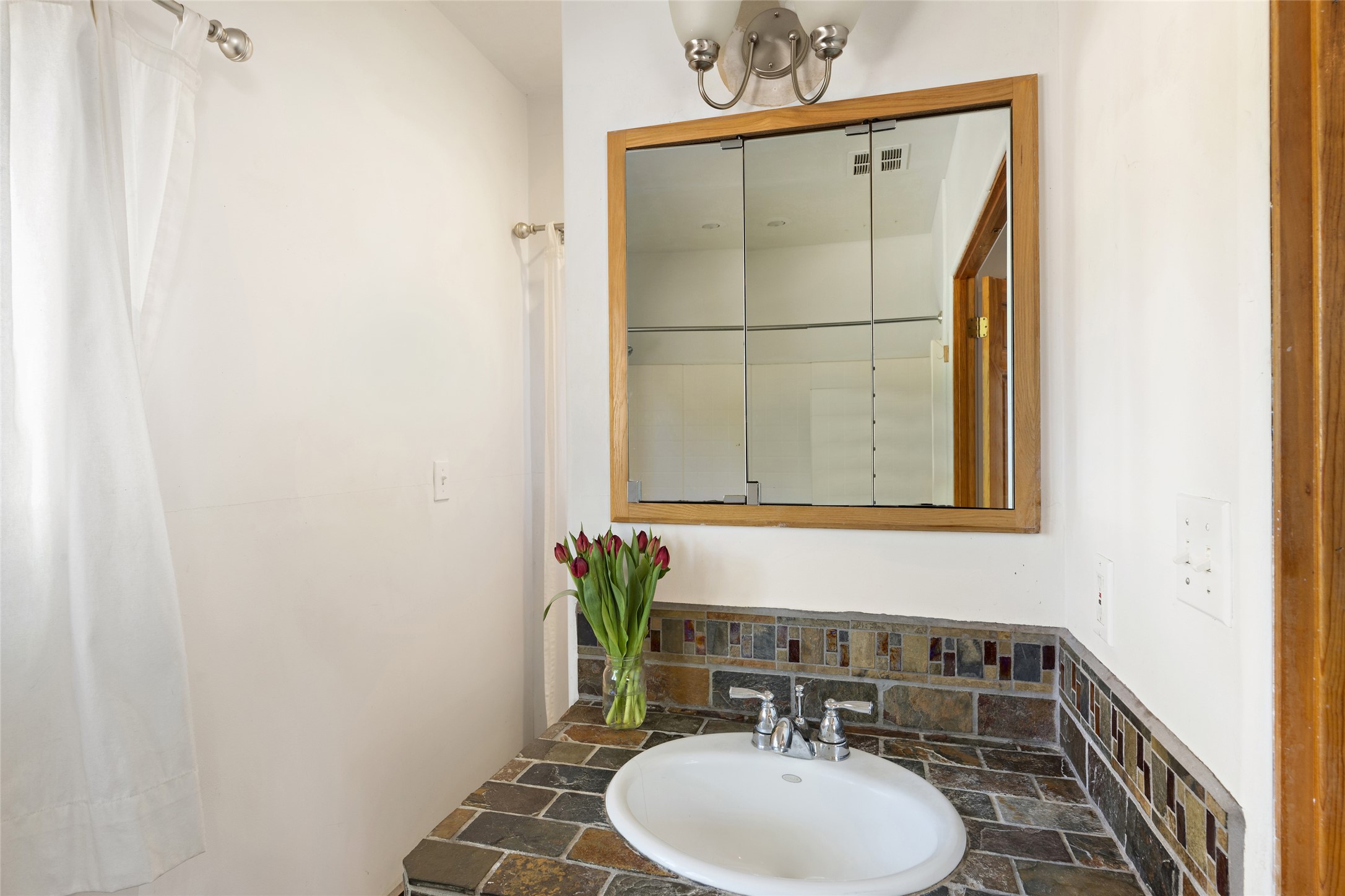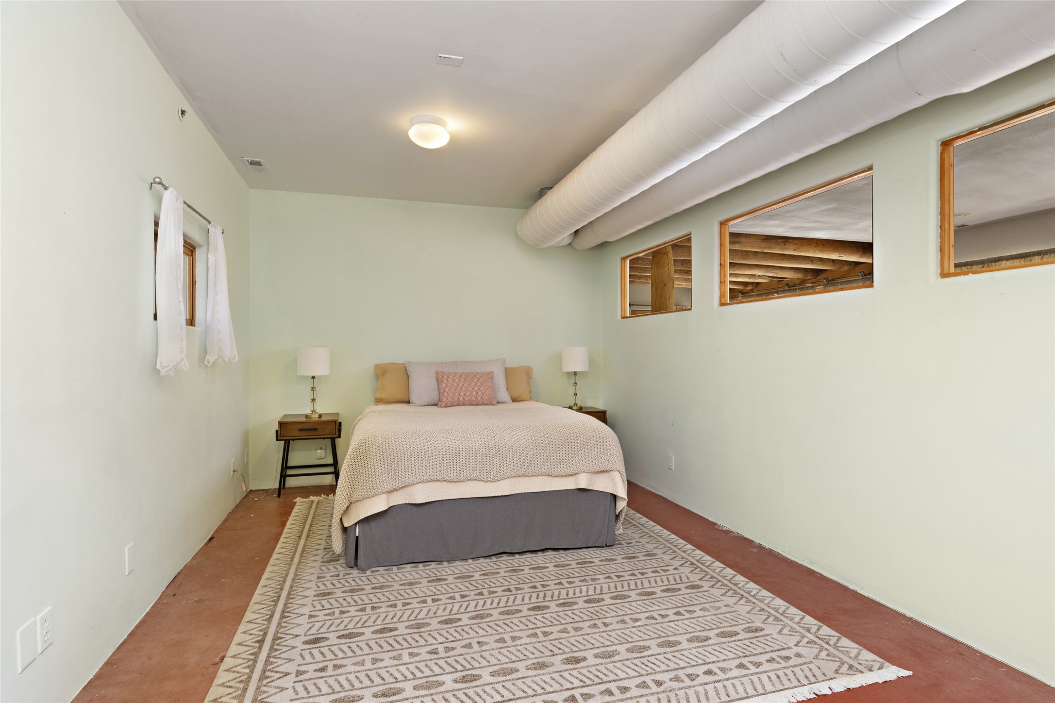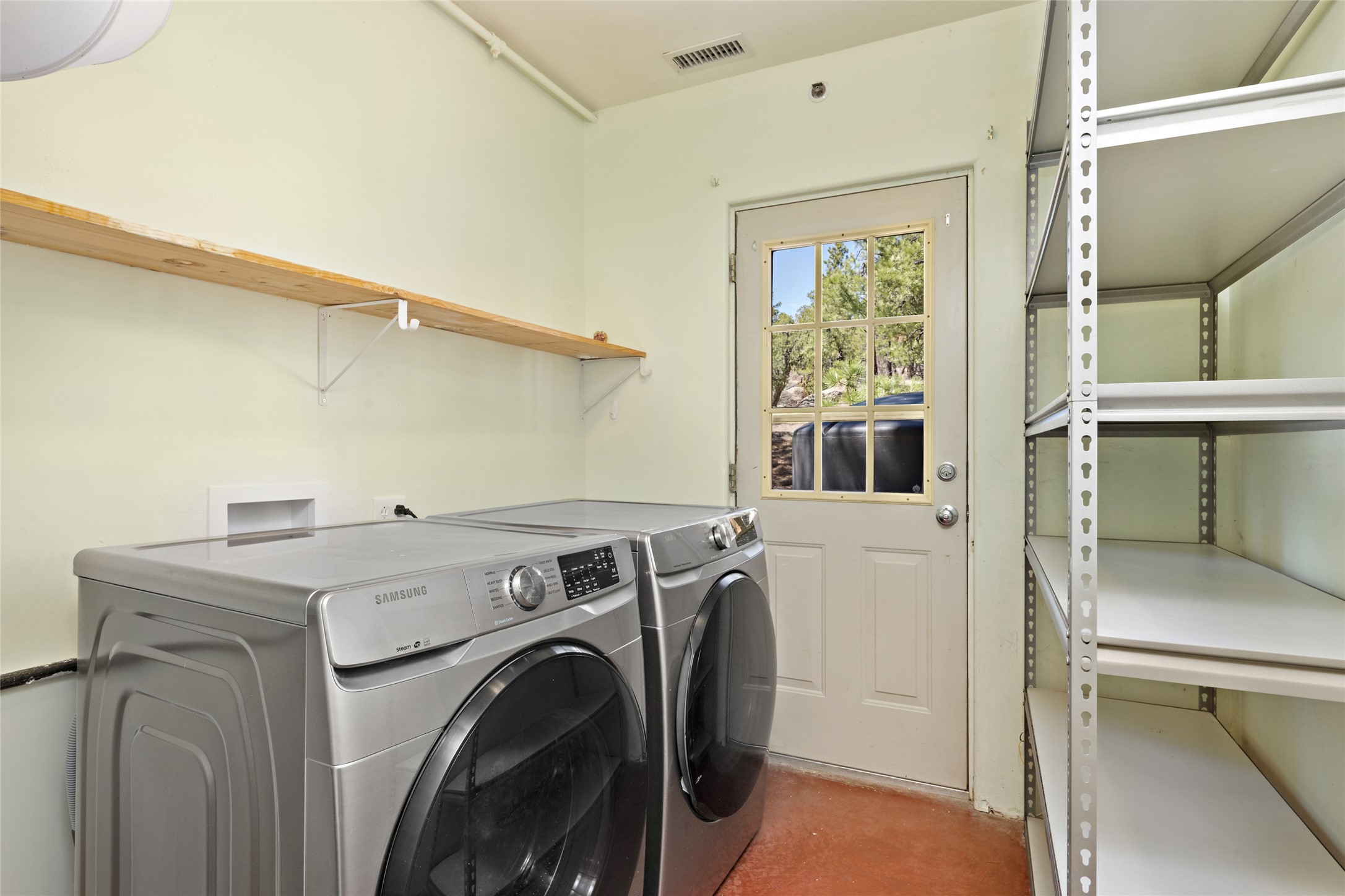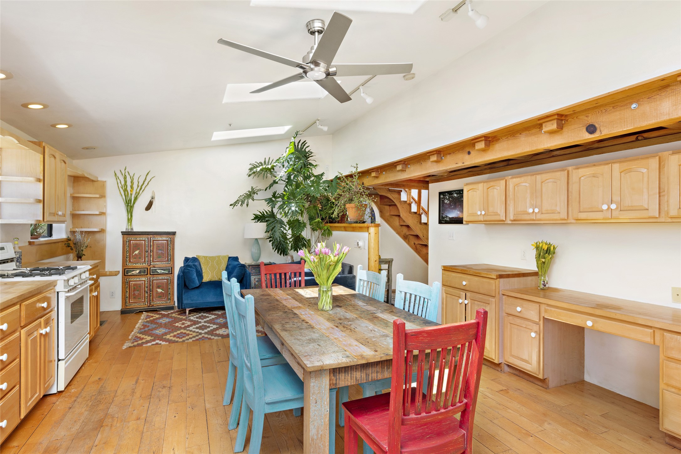 Located at the top of the hill amid Ponderosa pines and incredible rock outcroppings, this magical 4-acre property with income producing rental, is a single family residence with two completely separate living spaces of 1700 sq ft and 1500 sq ft which are separately metered and have two bedrooms each. This passive solar home was owner built with lumber from the surrounding forest and has loads of light, skylights, and views, as well as a front garden planted by a master gardener with fruit trees and perennials. The pro-panel roof is 7 years old, the eco-septic system by AAA is 3 years old and there is also fire suppression system; as well as a garage/workshop. Peaceful and quiet, with incredible starry night skies, there is amazing hiking and wildlife watching. Perfect for those desiring to be immersed in nature and close to Santa Fe!