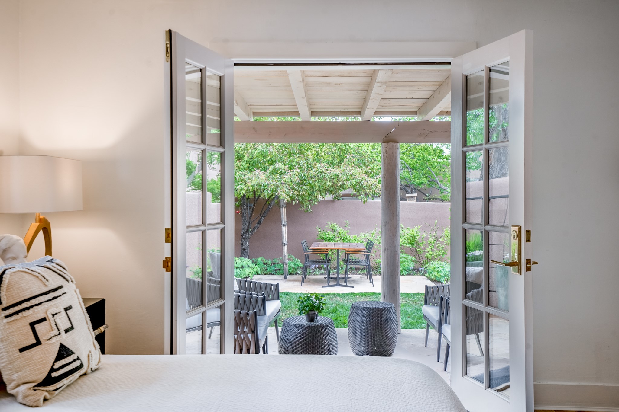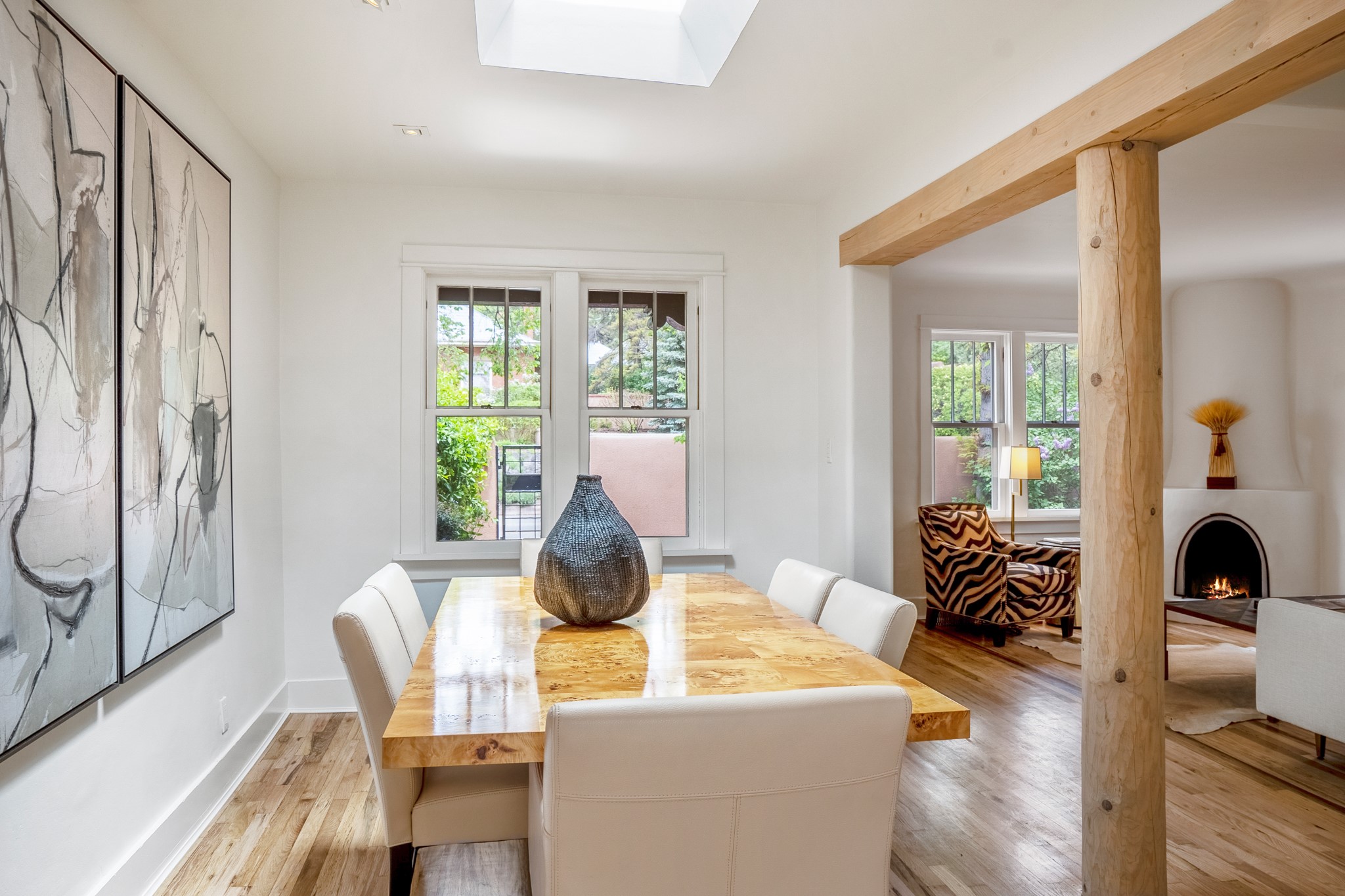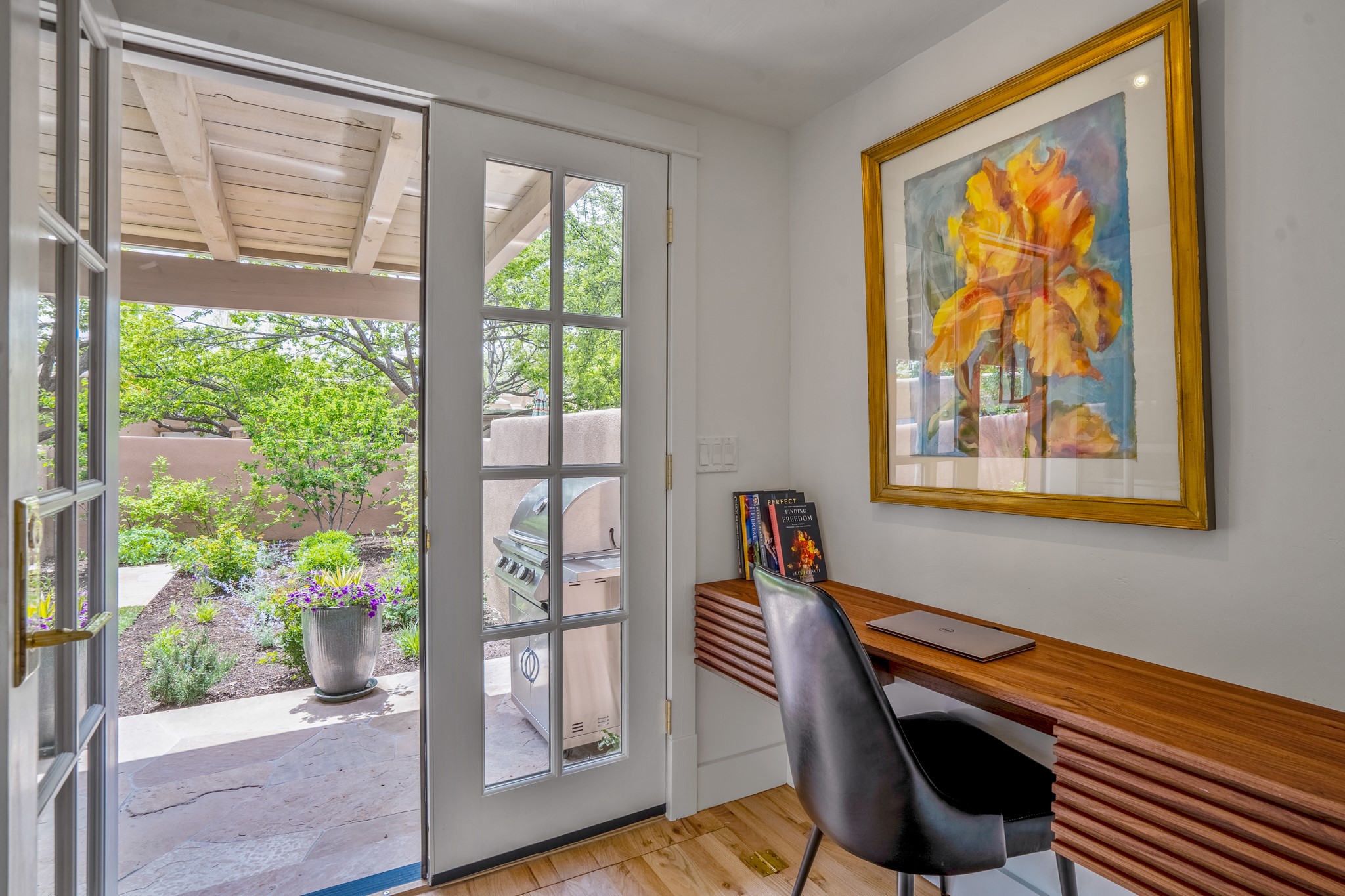 Step into this stunning condo and experience the perfect blend of Santa Fe meets Manhattan luxury. Located just a few blocks from the Santa Fe Plaza, this exceptional property boasts an open floor plan that feels generous on space, with the ability to open to the front courtyard and rear portal and garden area for a seamless indoor-outdoor living experience.Originally built in the 1920s, this adobe condo was completely re-imagined in 2022 by its architect owners, with no detail overlooked. From the refinished oak floors to the re-plastered white walls with matching baseboards and recessed art-lighting, this home exudes sophistication and elegance.The living room showcases a corner kiva fireplace, perfect for cozying up on chilly evenings. The open-concept dining room features a skylight and plenty of room for entertaining. The kitchen is a true masterpiece with stunning Ebony Macassar cabinetry, solid brass hardware by Water Street, and premium Asko, Sub-zero, and Wolf appliances. The Classico Quartz countertops and Black Marquina marble tile on the walls add to the space's bold and striking aesthetic.Just off the kitchen, you'll find a laundry room with an integrated Asko washer and dryer, and a built-in work desk that looks out on the garden through French doors. Adjacent to the kitchen is the spacious bedroom, which features custom French doors that open to the portal and garden. The custom closet with built-ins ensures ample storage space.The bathroom is a work of art in itself, with a walk-in shower featuring a black and white marble mosaic and a stunning custom rosewood vanity with bronze hardware and a Black Nero Marquina marble top.The lush gardens in the front courtyard and surrounding the rear portal were designed by Linda Churchill of the Santa Fe Botanical Gardens. The space features integrated site lighting, zoned irrigation, a flagstone patio, and a beautiful setting for your morning coffee or evening cocktail.This exceptional property also features new ductless heating and A/C, upgraded electrical, plumbing, and a resurfaced roof, ensuring that there is nothing to do except move in. There is also a roomy basement for storage that is not included in the square footage. (See Matterport). This condo is just steps away from all the amenities that the City Different has to offer, including world-class dining, shopping, and entertainment. Don't miss your opportunity to experience the perfect blend of luxury in this sophisticated and elegant residence.