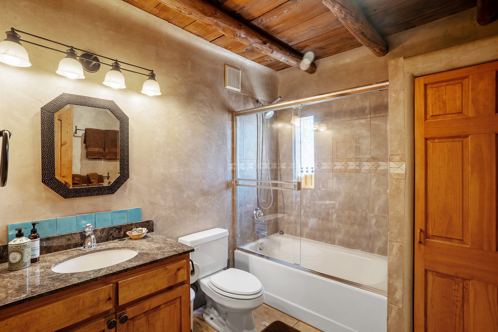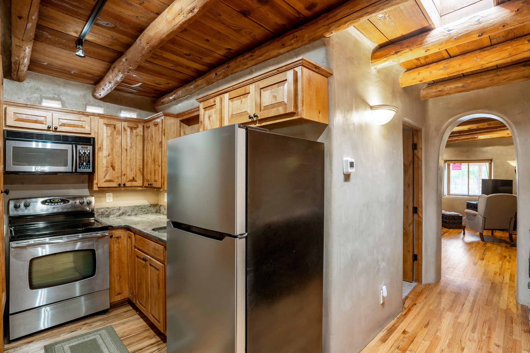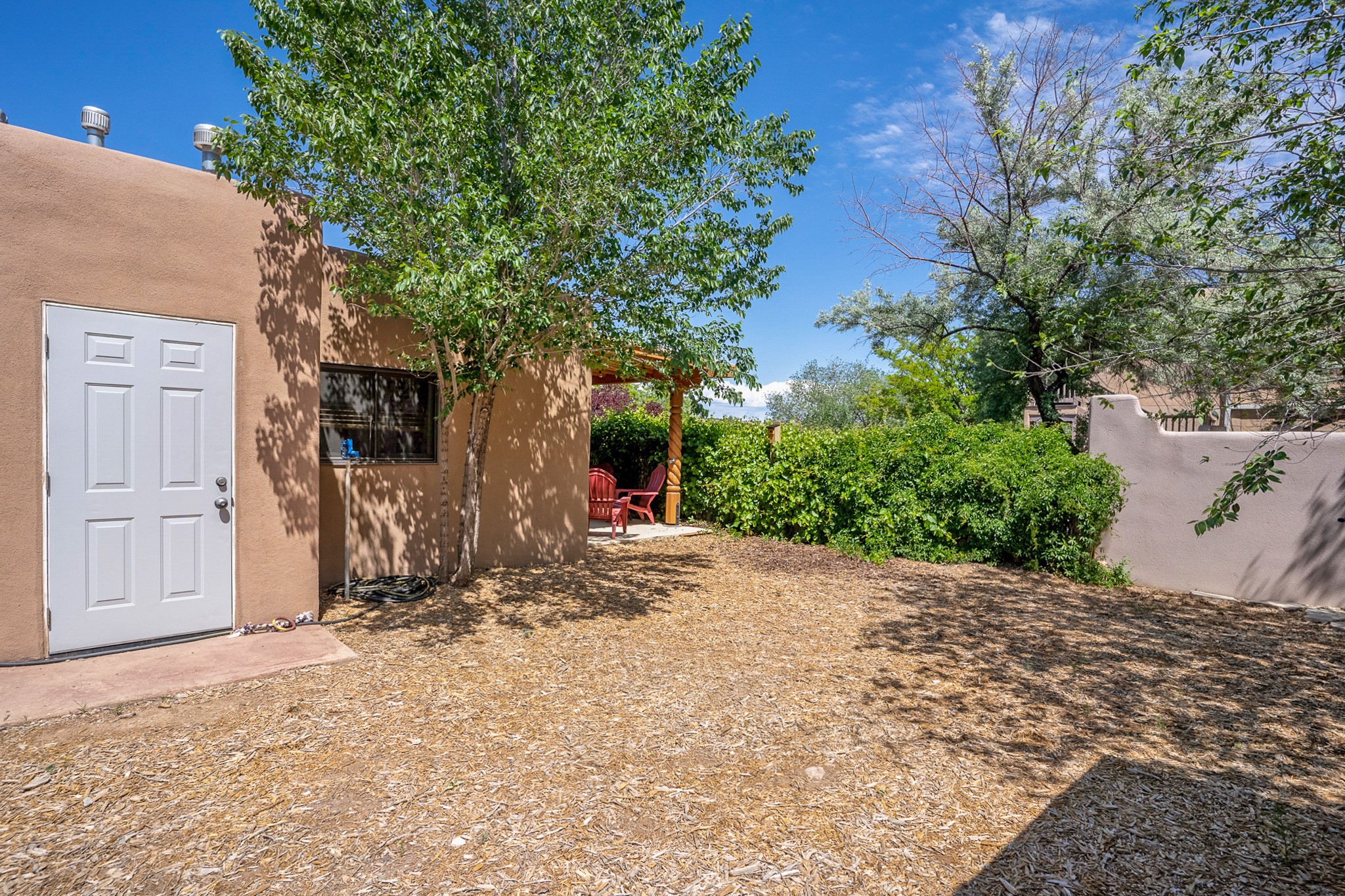 This truly turn-key adobe home at doorstep to downtown is the perfect pied-a-terre. In immaculate condition, the thick adobe walls insulate you from the outside world. Inside, diamond plaster walls, wood flooring, vigas, and nichos add an unmistakable southwestern flair that makes you feel instantly at home. Other features like A/C, track lighting, custom cabinetry, stone countertops, a full bathroom and a portal for entertaining or al-fresco dining provide a cozy environment for relaxation. The large, xeriscaped backyard is a breeze to keep manicured. This property is truly flexible in use as a residence, office, long or short term rental. Zoning (C4) allows for fast-tracked short term rental approval! With plenty of off street parking just steps from the Santa Fe River Trail, the Plaza, shopping & dining, this unique gem reflects the heartbeat of Santa Fe.