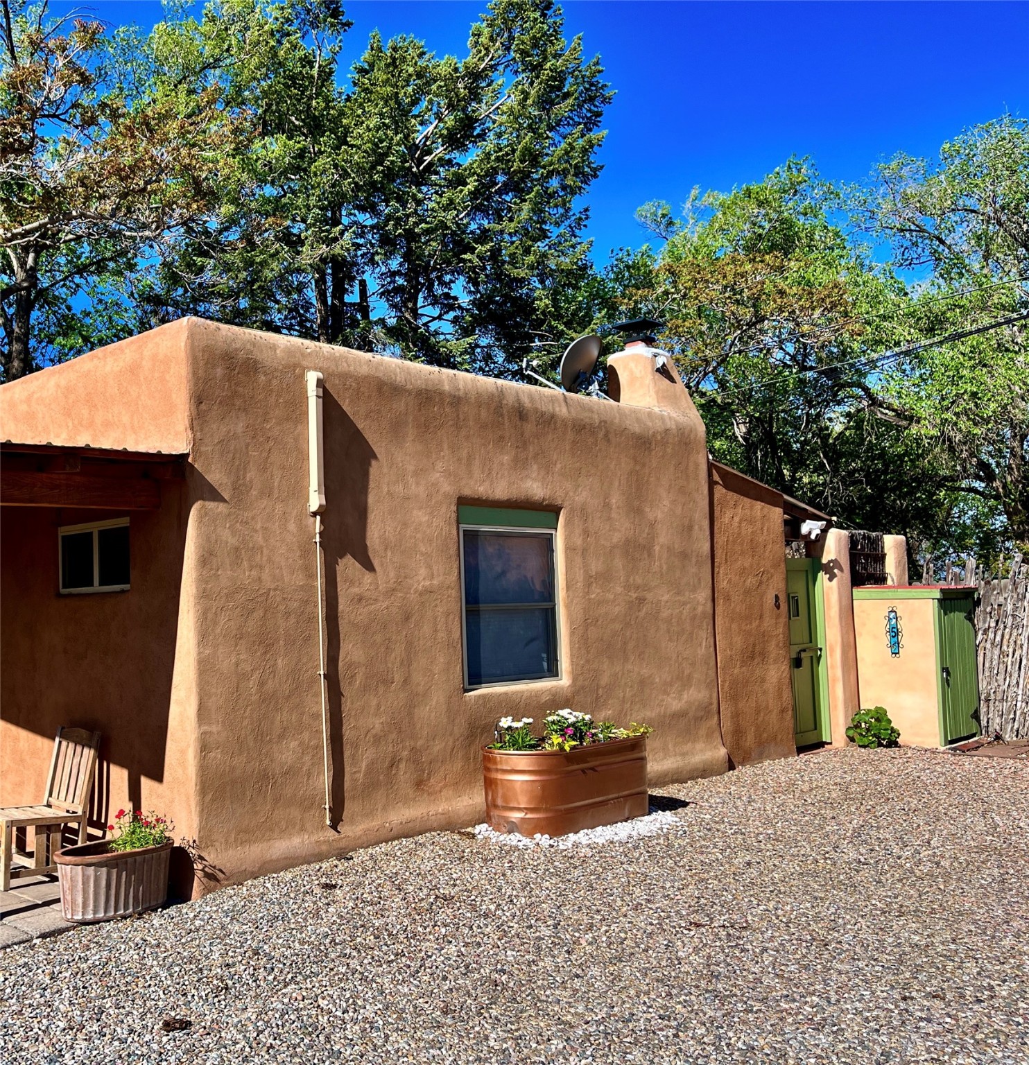 Look no further! Once you see this super clean and beautiful condo with large garden and outdoor patioareas surrounding it you will understand the beauty of this home and its natural, organic environment. Enveloped by old growth trees, this condo feels more like a single family home... and it is sequestered at the very end of the compound for total privacy. It is completely walled and gated. Beautiful interior finishes include brick floors throughout, splendid wood and viga ceilings, corner kiva fireplace and an absolutely stunning kitchen with cherry cabinets and granite countertops. Oversized 1 bedroom which accommodates a large king bed with French door out to the patio. And oh so close to everything- the Railyard, Canyon Rd and the Plaza. Designated parking for 2 cars and extra outdoor stuccoed storage!