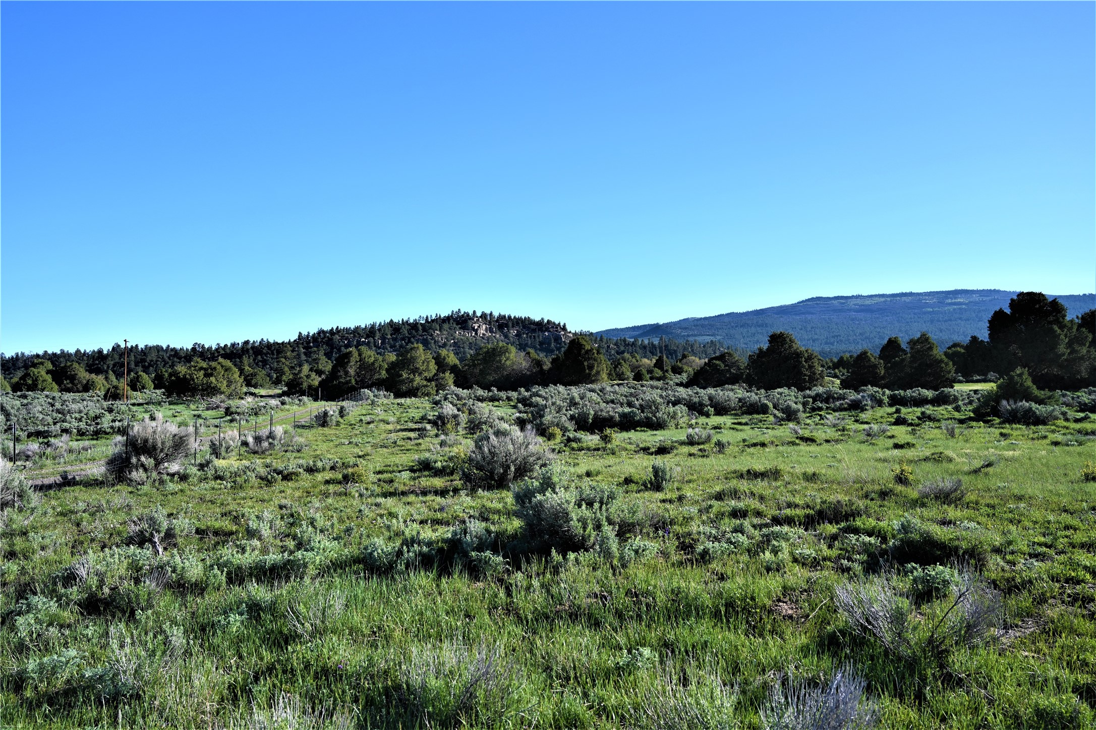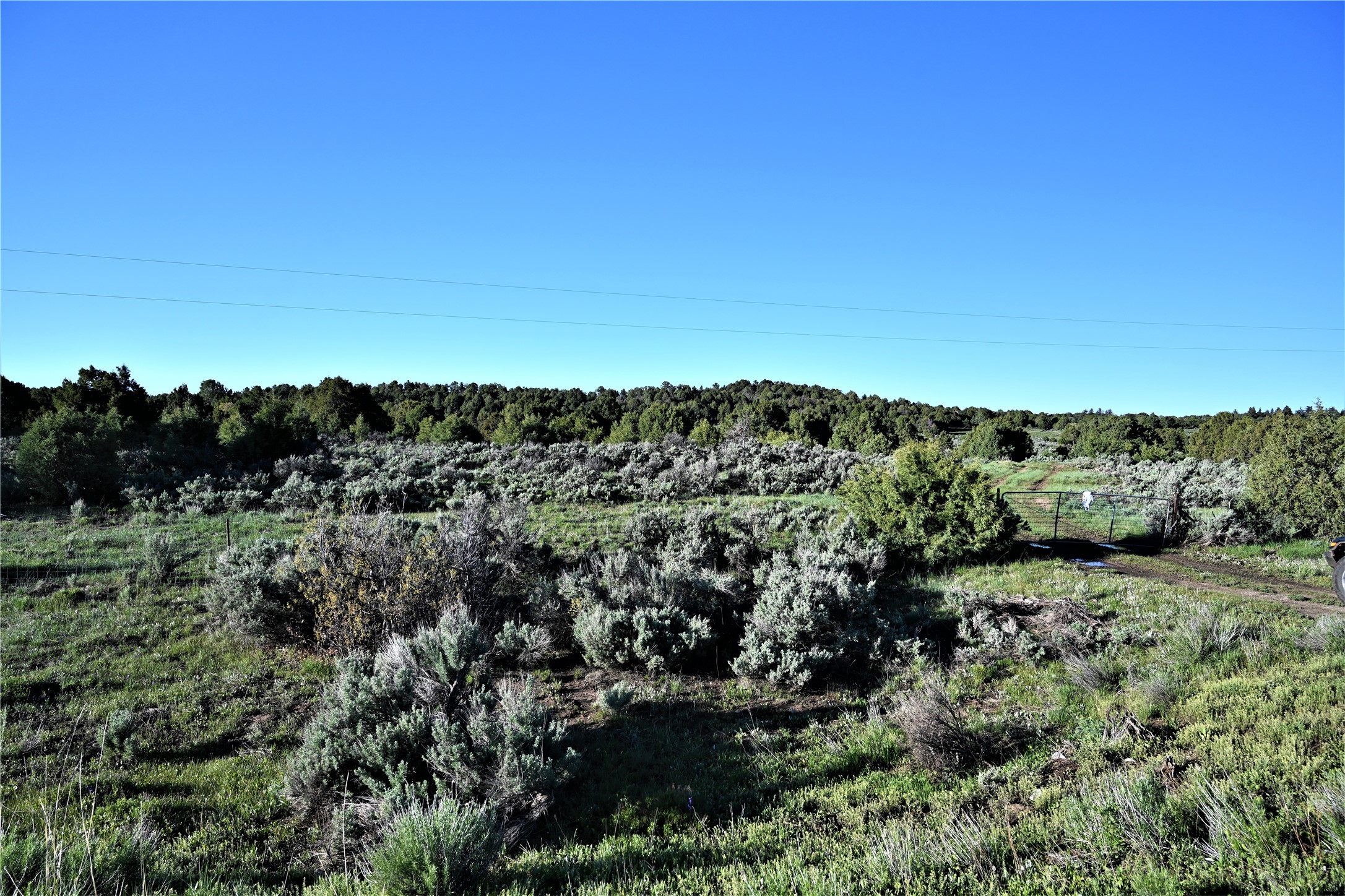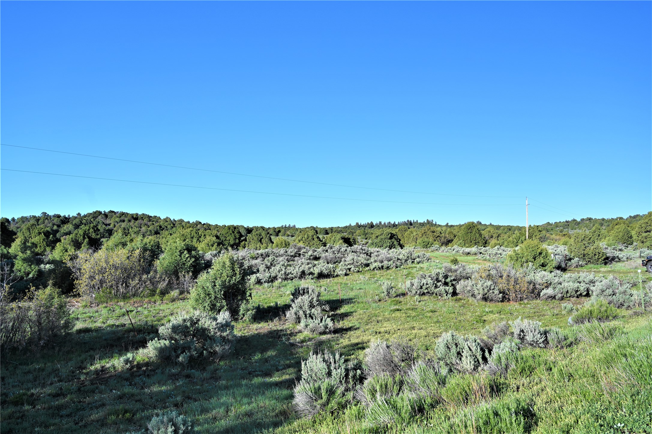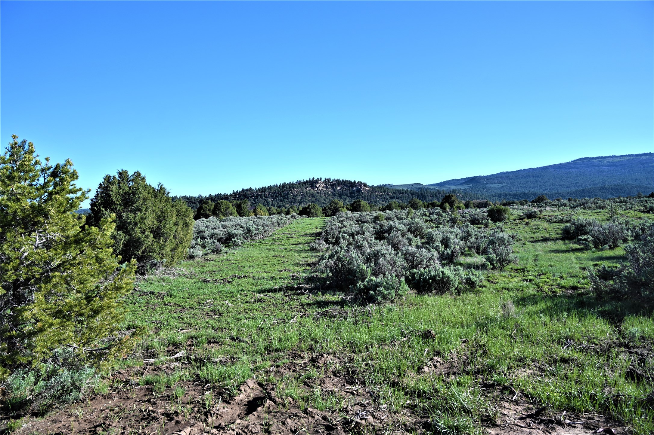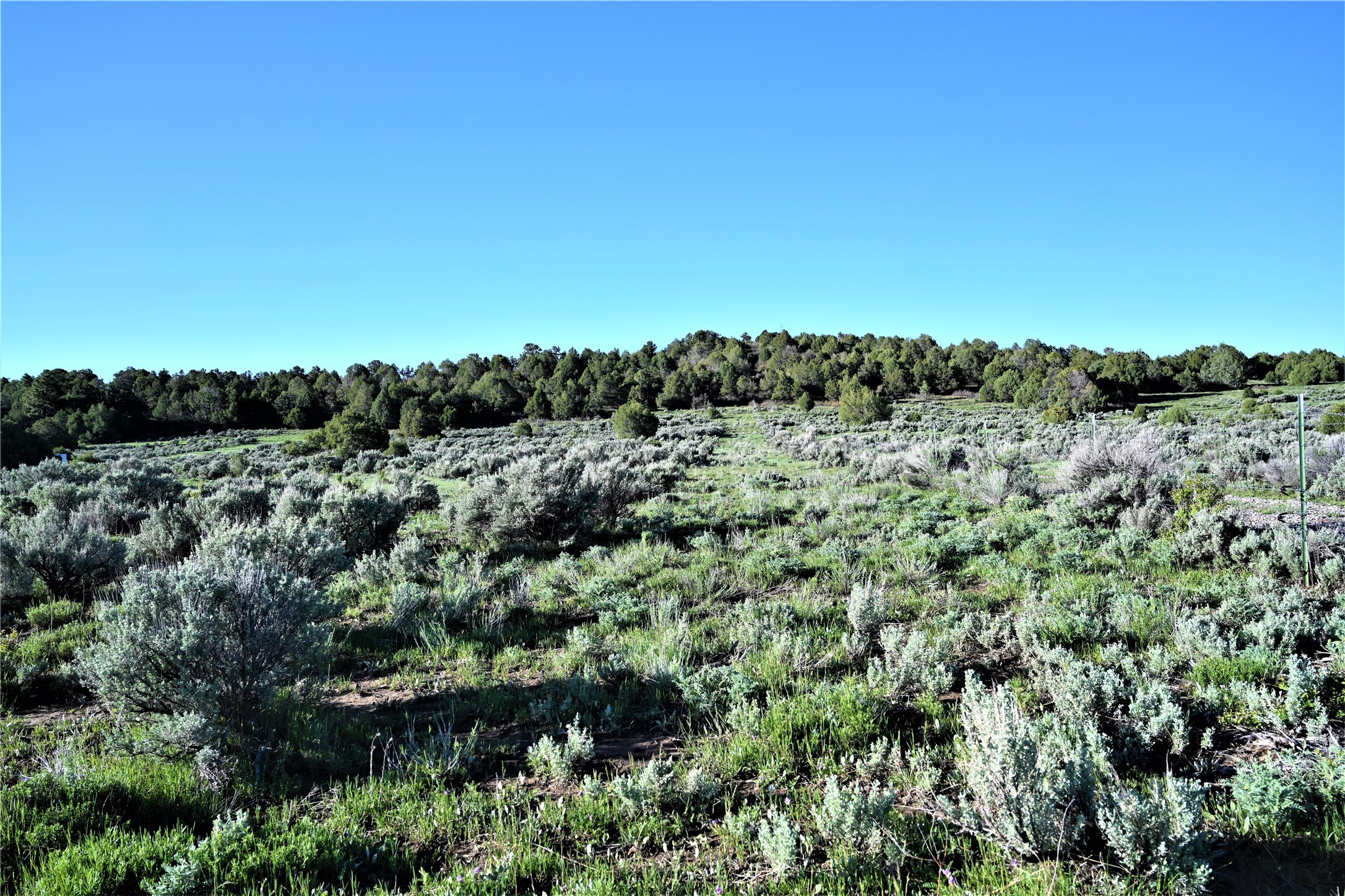 Beautiful Northern NM hunting property. The place has been set up for Elk and Mule Deer hunting. Has been assigned 1 Elk tag in the past years and a couple of Mule Deer tags as well. Turkey and Black Bear also roam this property. The current owner has put in work to get this place where its at today. Some areas of Sage have been cleared and planted with Grass and Alfalfa. Hunting Stand put in place. The fence has special areas for the animals to cross back and forth. Nice deep water hole that is spring and run off fed. A 300 yard shooting range for getting your Rifles zeroed in. This is GREAT private hunting property. Real easy to get around in. Power at the front of the property.