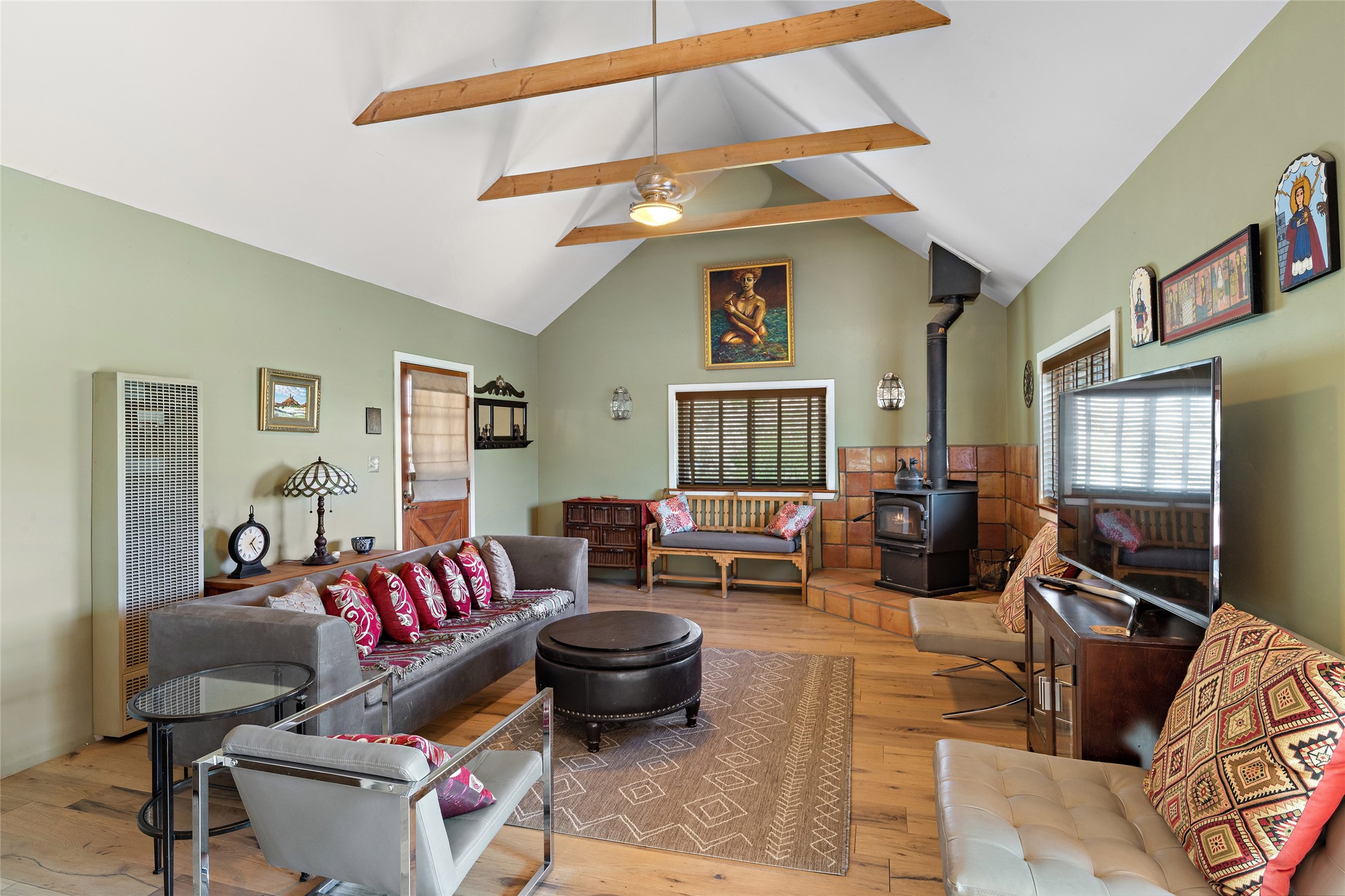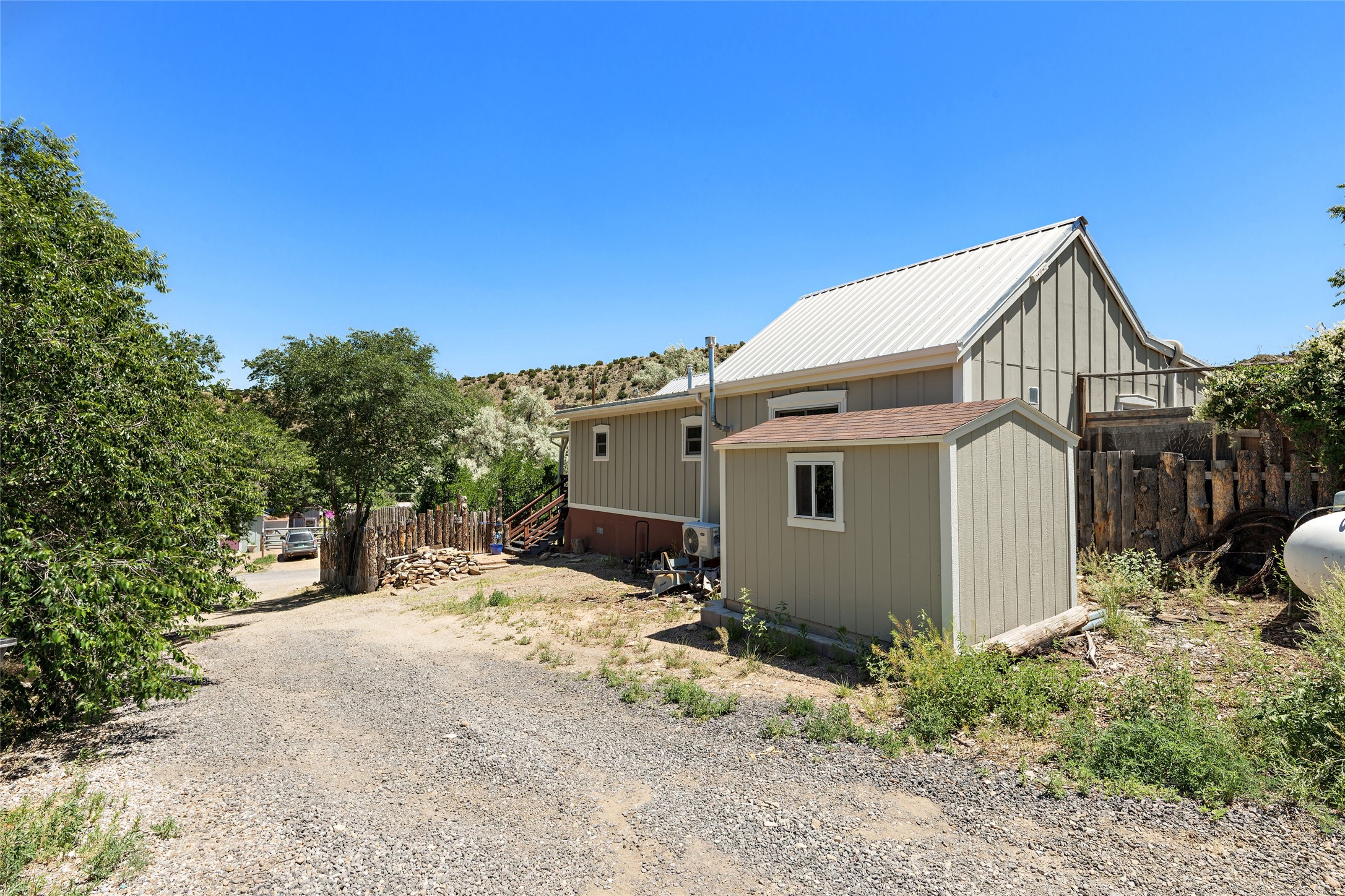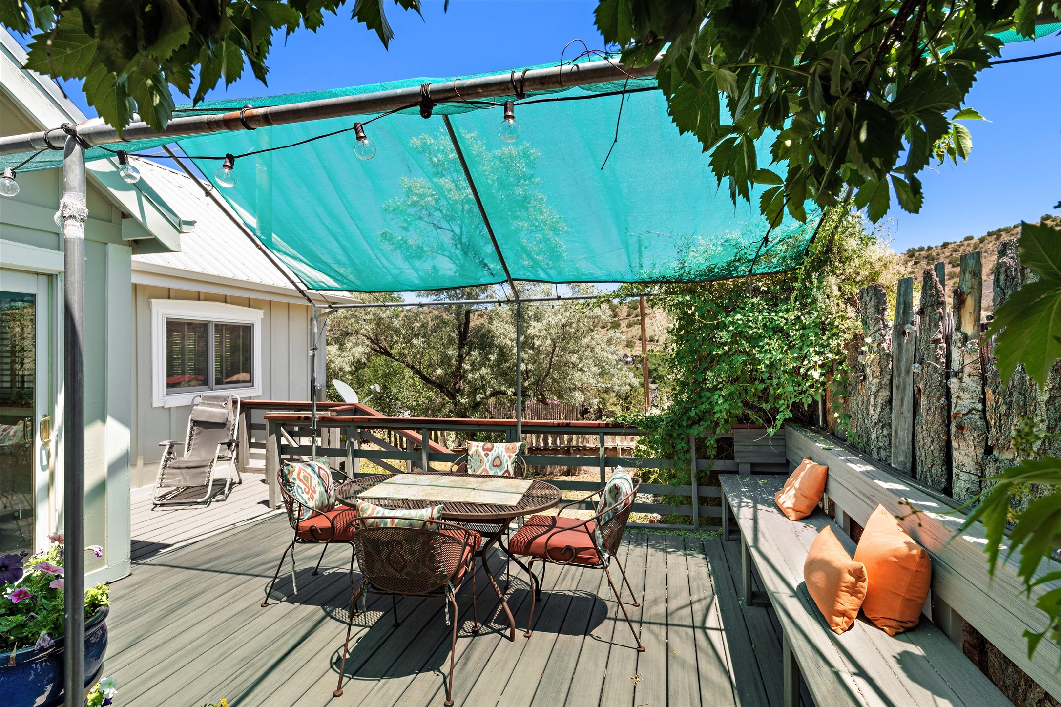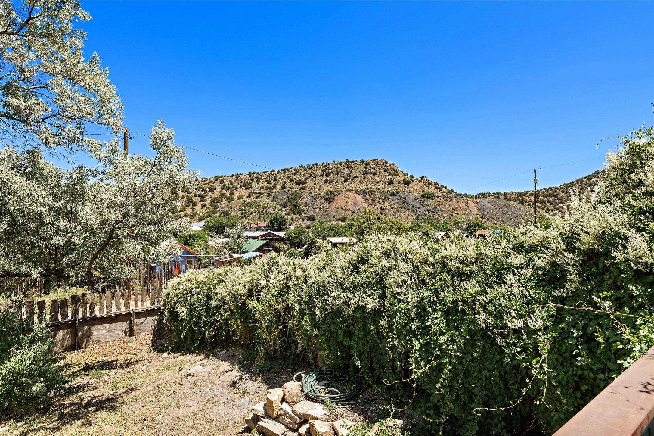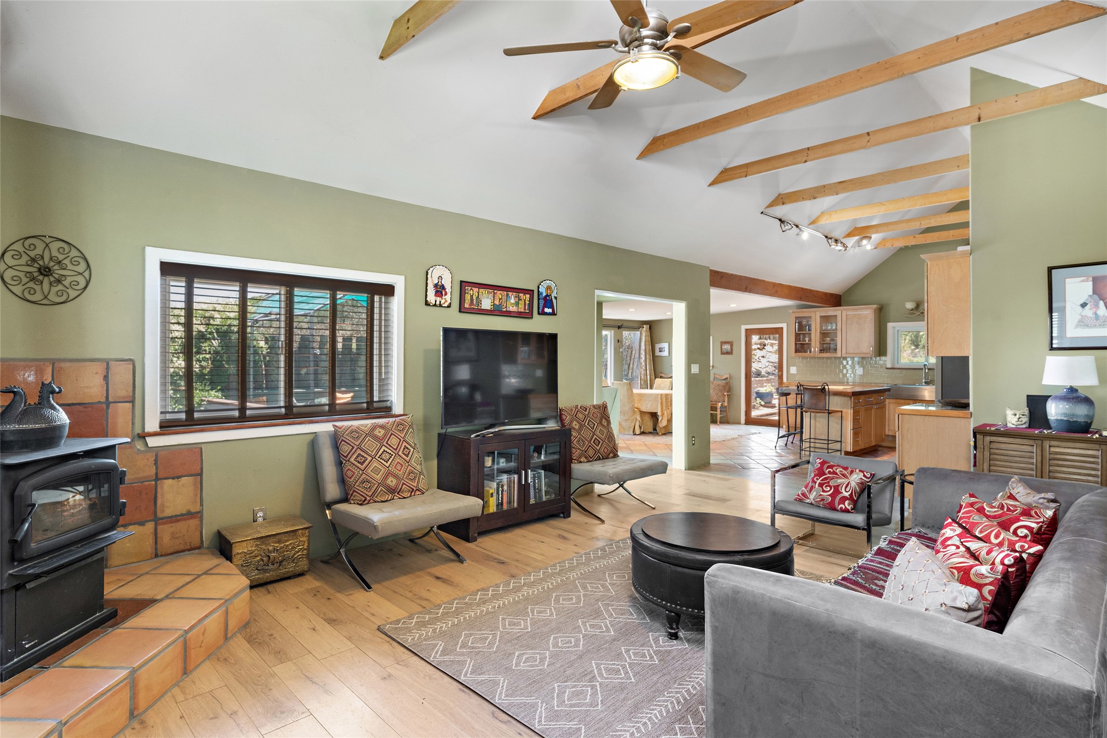 Sitting above the vibrant and historic village of Madrid, this newer home is full of natural light with multiple covered patios, beautifully updated kitchen, and soaring ceilings. Enter through the covered porch with views to the Sangre de Cristos to the open great room with engineered hardwood and Saltillo tile floors, all recently installed. Newer wood stove adds to the warmth of this room open to the kitchen and dining area with access to the two, covered back patios. The kitchen is a cook's dream with amply counter and storage space, stainless steel farm sink, and stunning copper-topped eat-in island. Anderson high-quality windows installed throughout in 2020 all with custom wood blinds. Two back bedrooms, one with office area and walk-in closet and access to the back deck. The yard is fully-fenced with mature landscaping. Fully air conditioned and whole house water filtration system. Furnishings package negotiable. Owner/Broker.