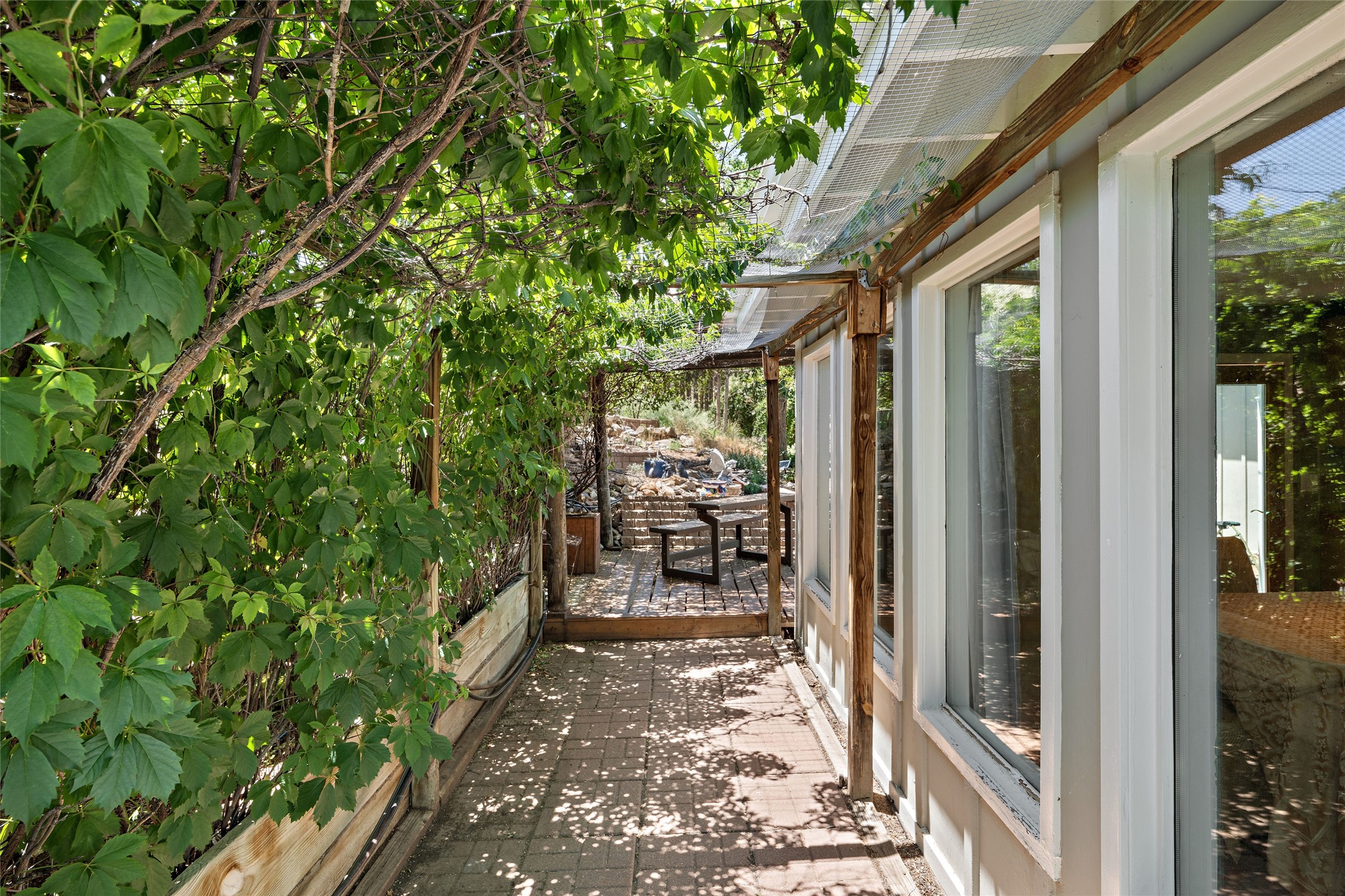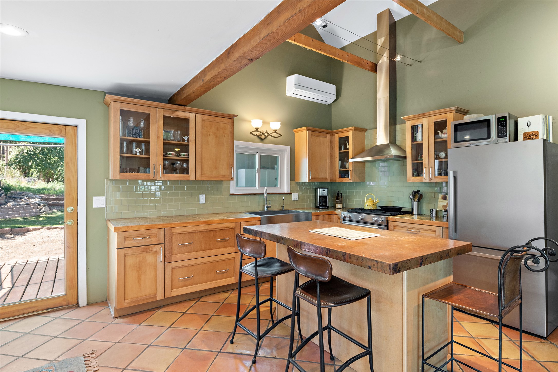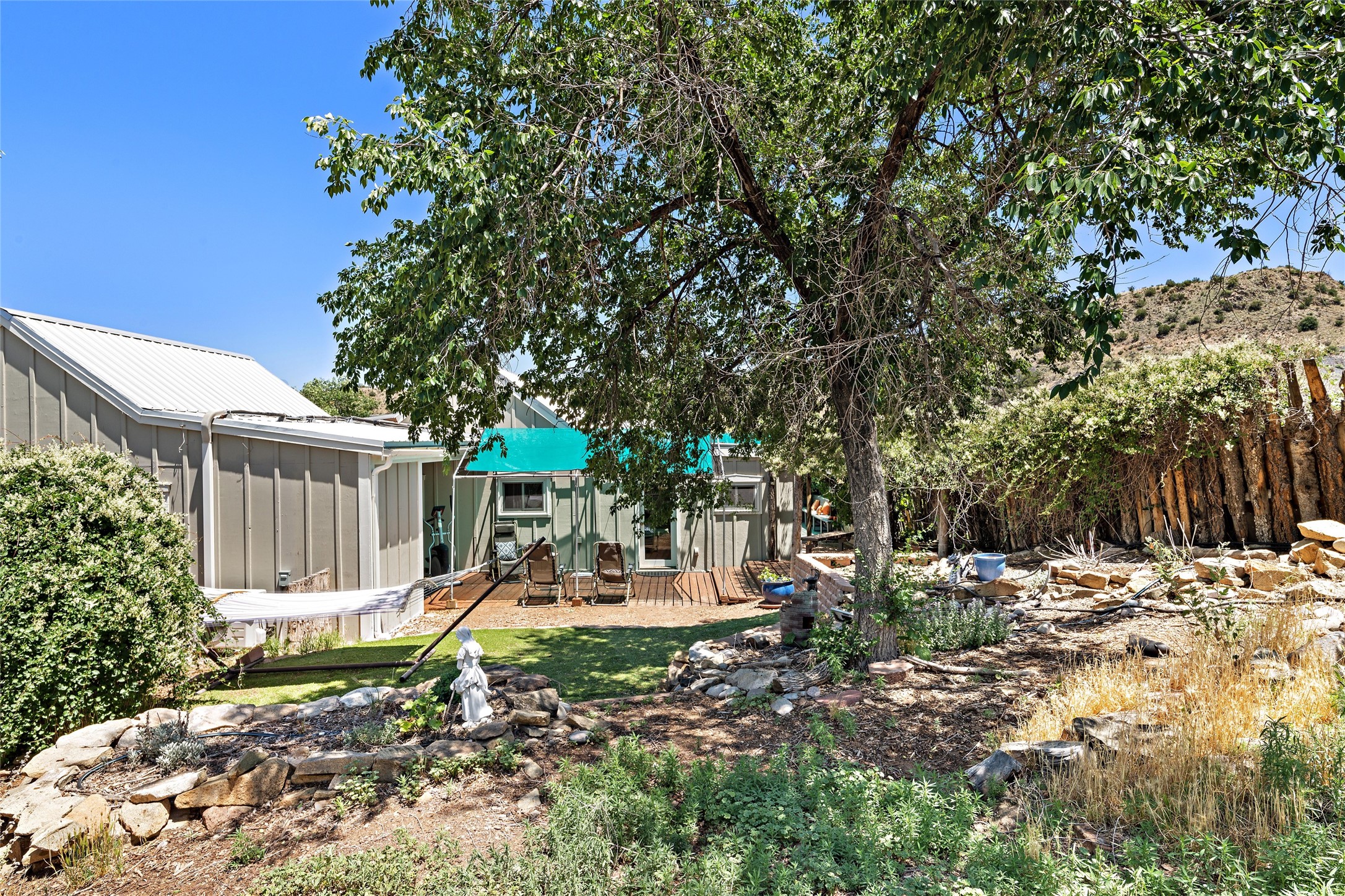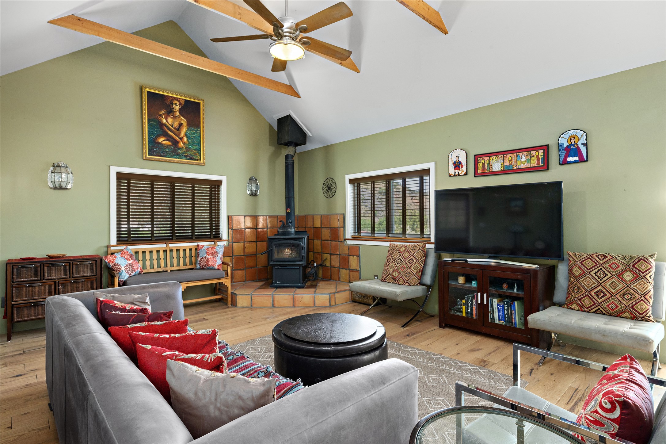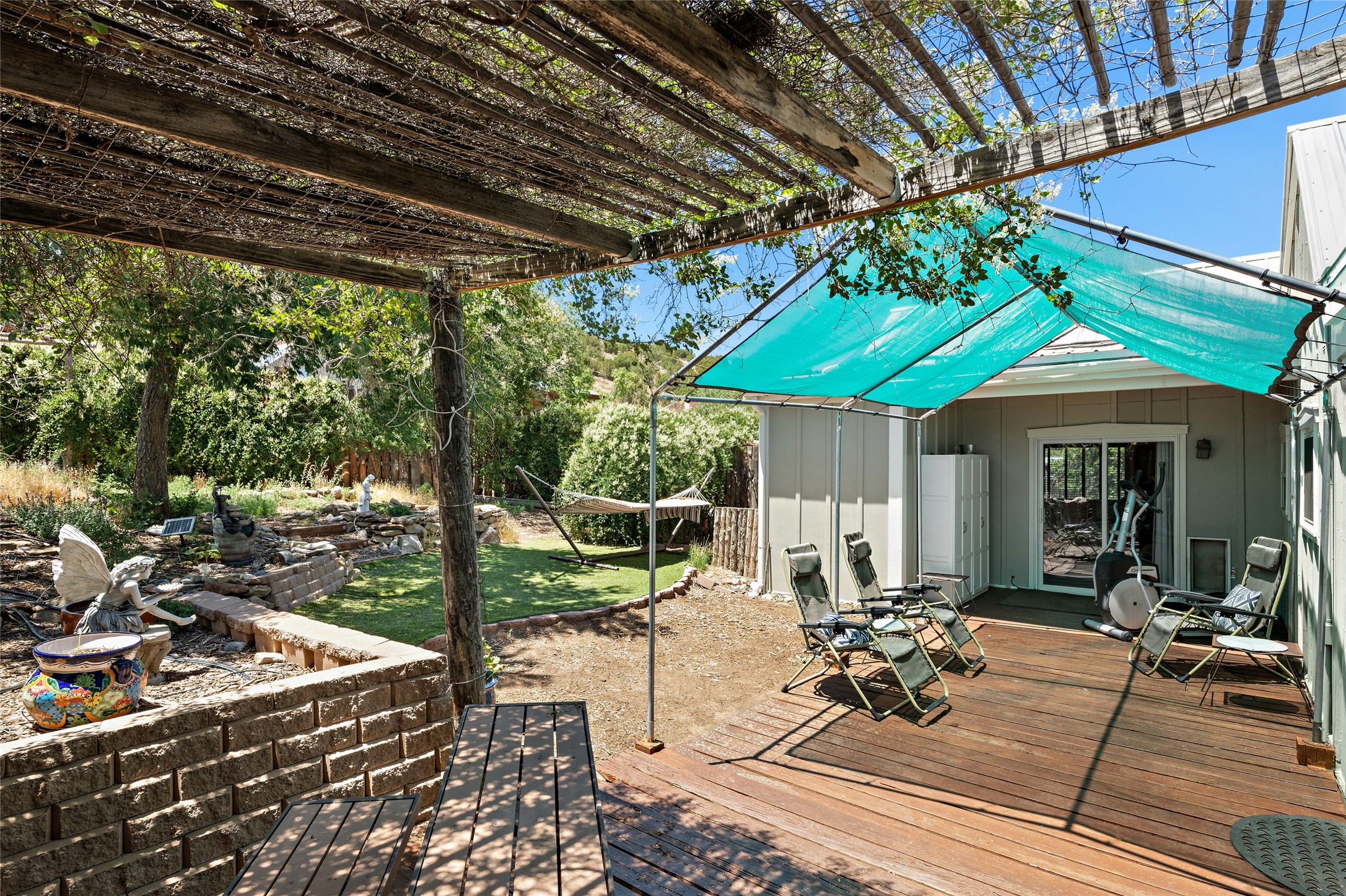 Sitting above the vibrant and historic village of Madrid, this newer home is full of natural light with multiple covered patios, beautifully updated kitchen, and soaring ceilings. Enter through the covered porch with views to the Sangre de Cristos to the open great room with engineered hardwood and Saltillo tile floors, all recently installed. Newer wood stove adds to the warmth of this room open to the kitchen and dining area with access to the two, covered back patios. The kitchen is a cook's dream with amply counter and storage space, stainless steel farm sink, and stunning copper-topped eat-in island. Anderson high-quality windows installed throughout in 2020 all with custom wood blinds. Two back bedrooms, one with office area and walk-in closet and access to the back deck. The yard is fully-fenced with mature landscaping. Fully air conditioned and whole house water filtration system. Furnishings package negotiable. Owner/Broker.
