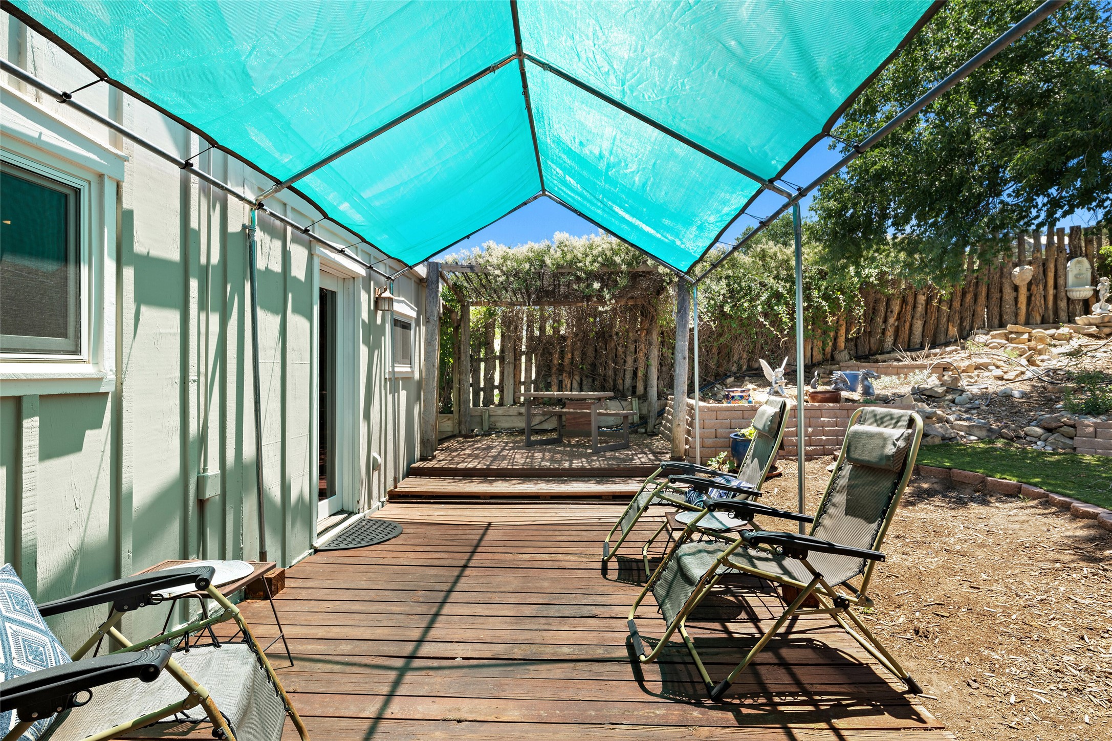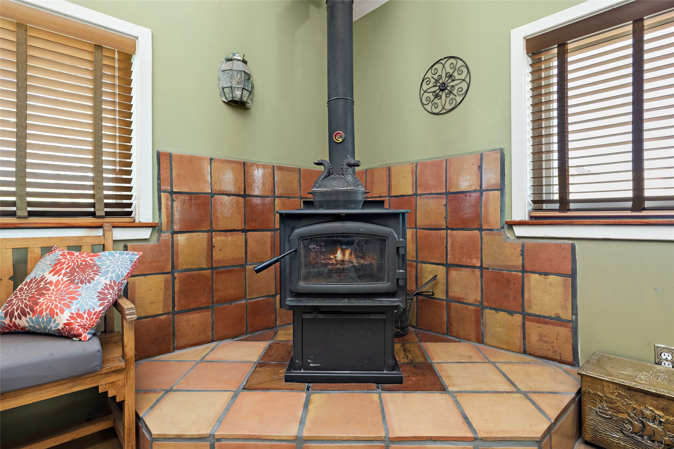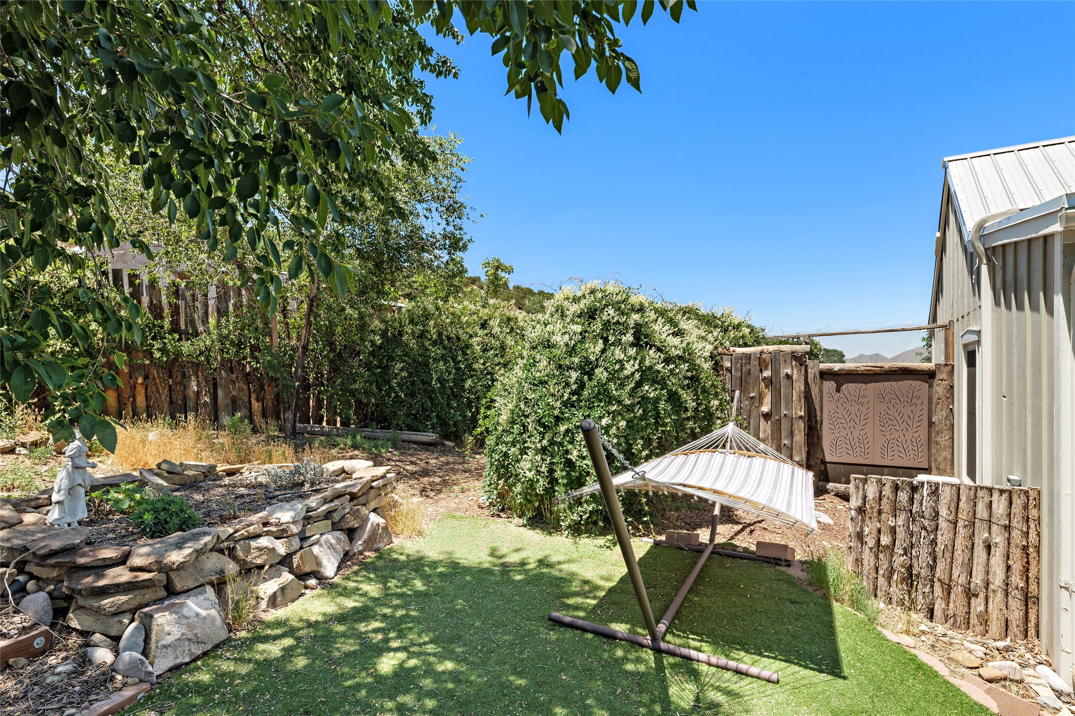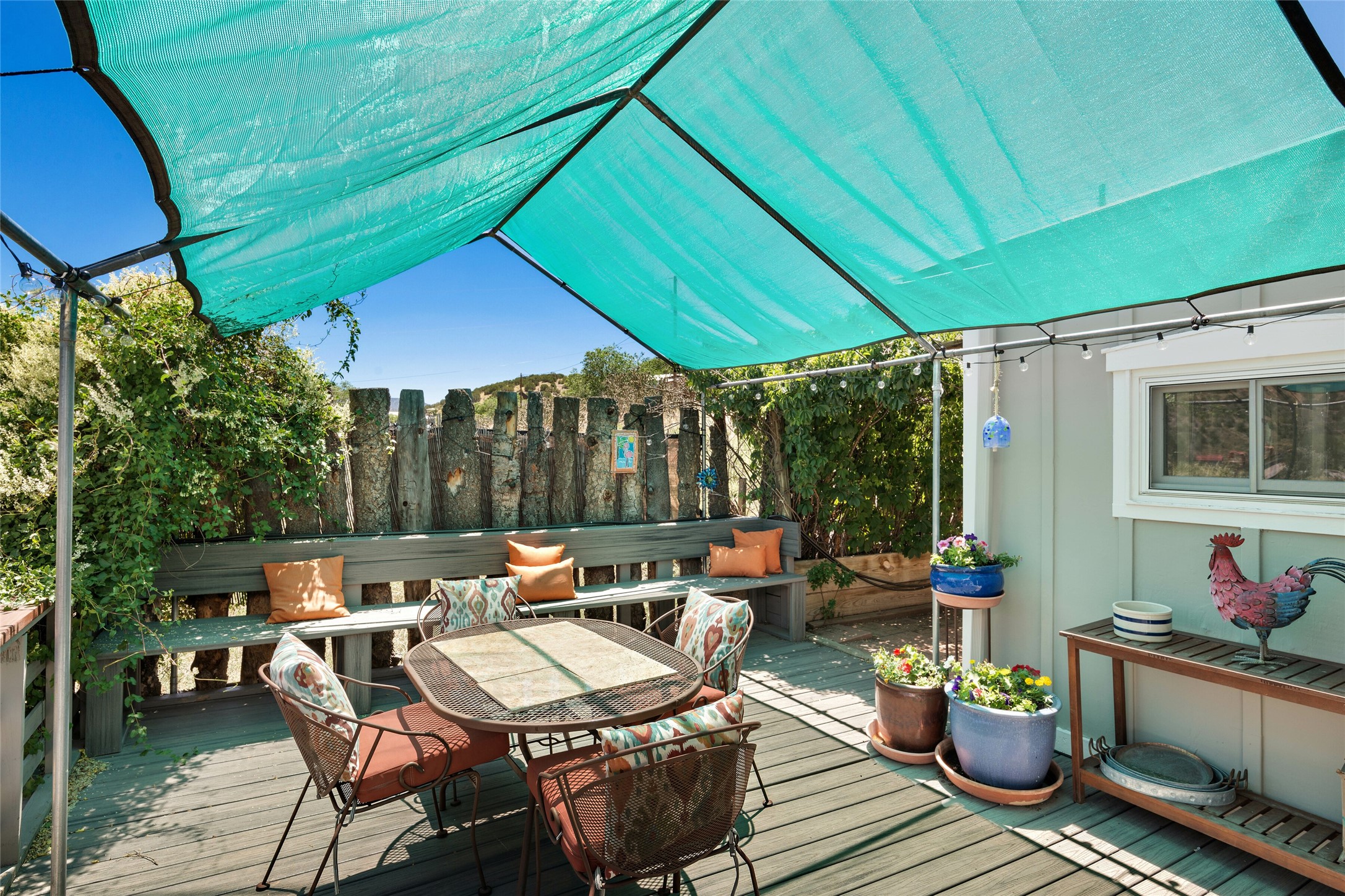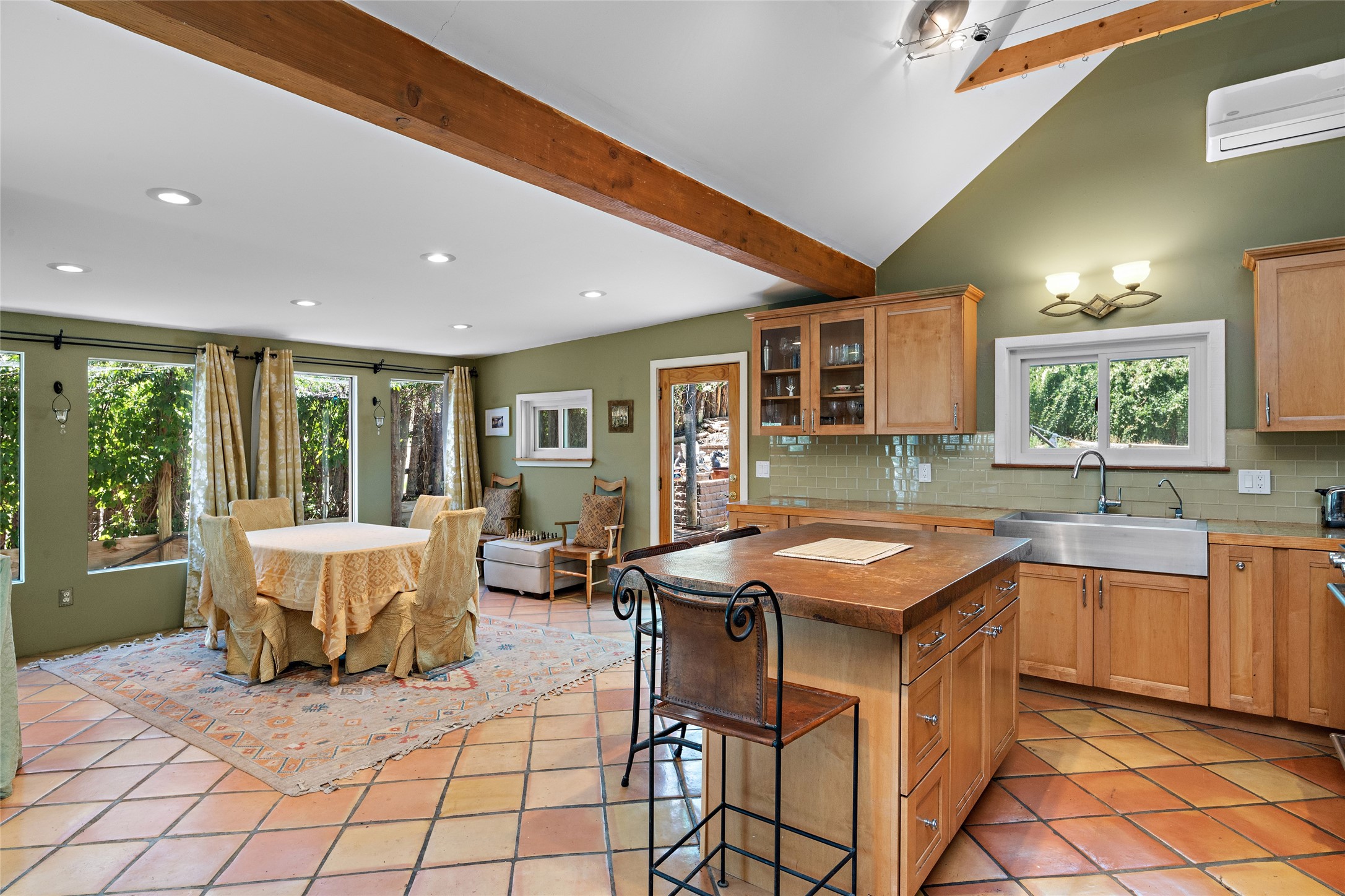 Sitting above the vibrant and historic village of Madrid, this newer home is full of natural light with multiple covered patios, beautifully updated kitchen, and soaring ceilings. Enter through the covered porch with views to the Sangre de Cristos to the open great room with engineered hardwood and Saltillo tile floors, all recently installed. Newer wood stove adds to the warmth of this room open to the kitchen and dining area with access to the two, covered back patios. The kitchen is a cook's dream with amply counter and storage space, stainless steel farm sink, and stunning copper-topped eat-in island. Anderson high-quality windows installed throughout in 2020 all with custom wood blinds. Two back bedrooms, one with office area and walk-in closet and access to the back deck. The yard is fully-fenced with mature landscaping. Fully air conditioned and whole house water filtration system. Furnishings package negotiable. Owner/Broker.