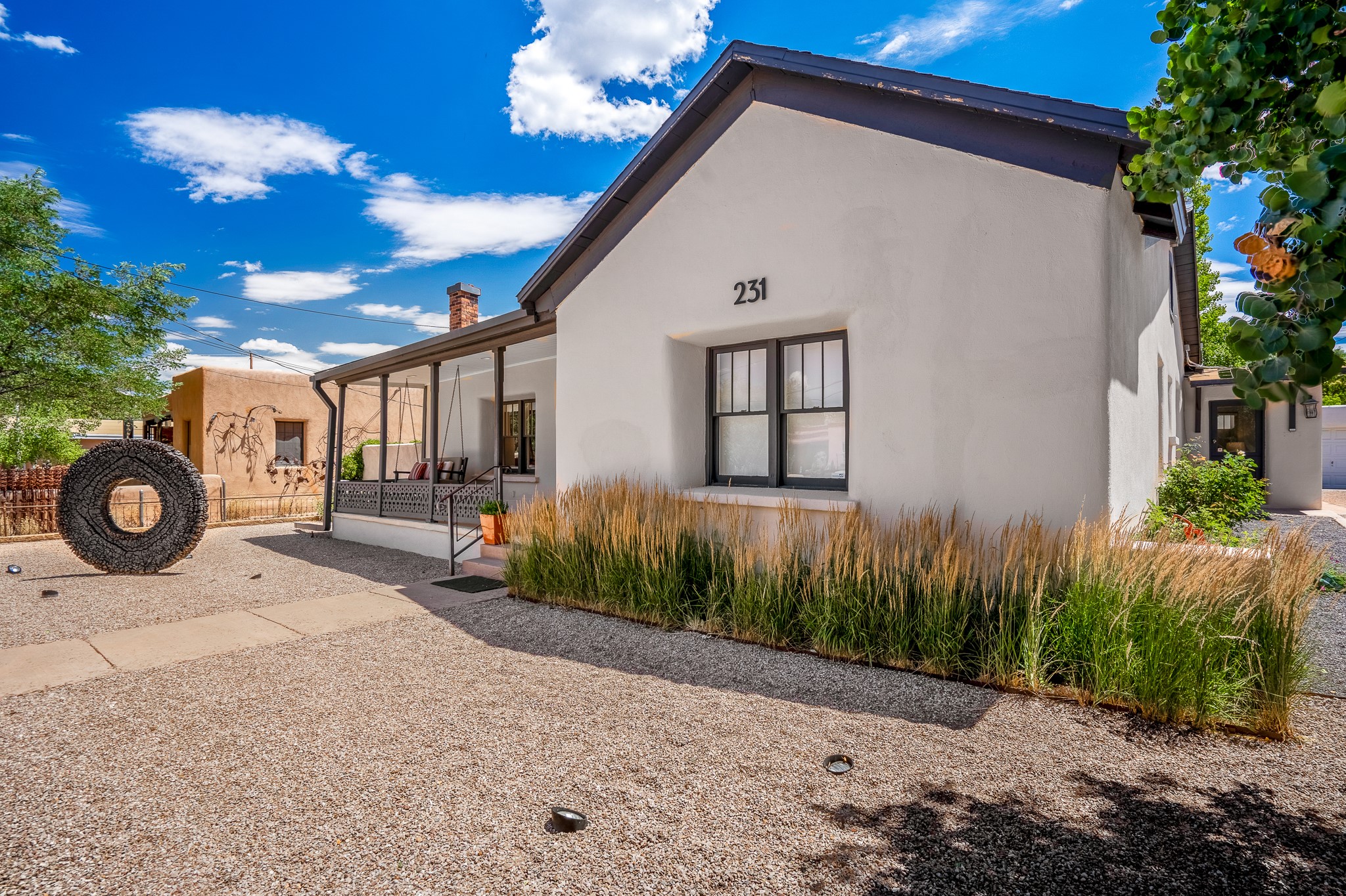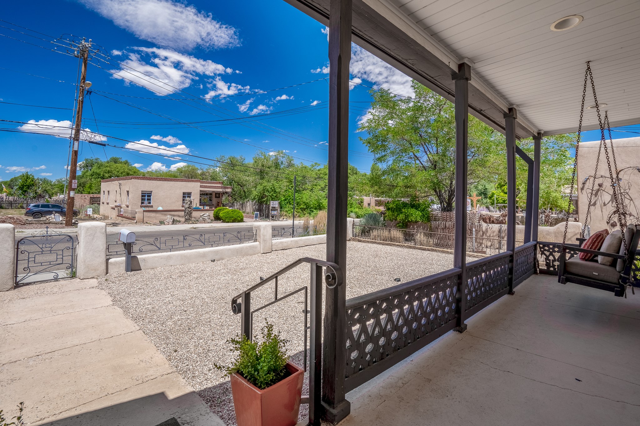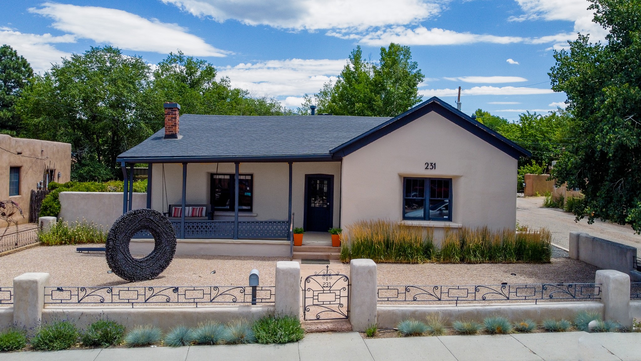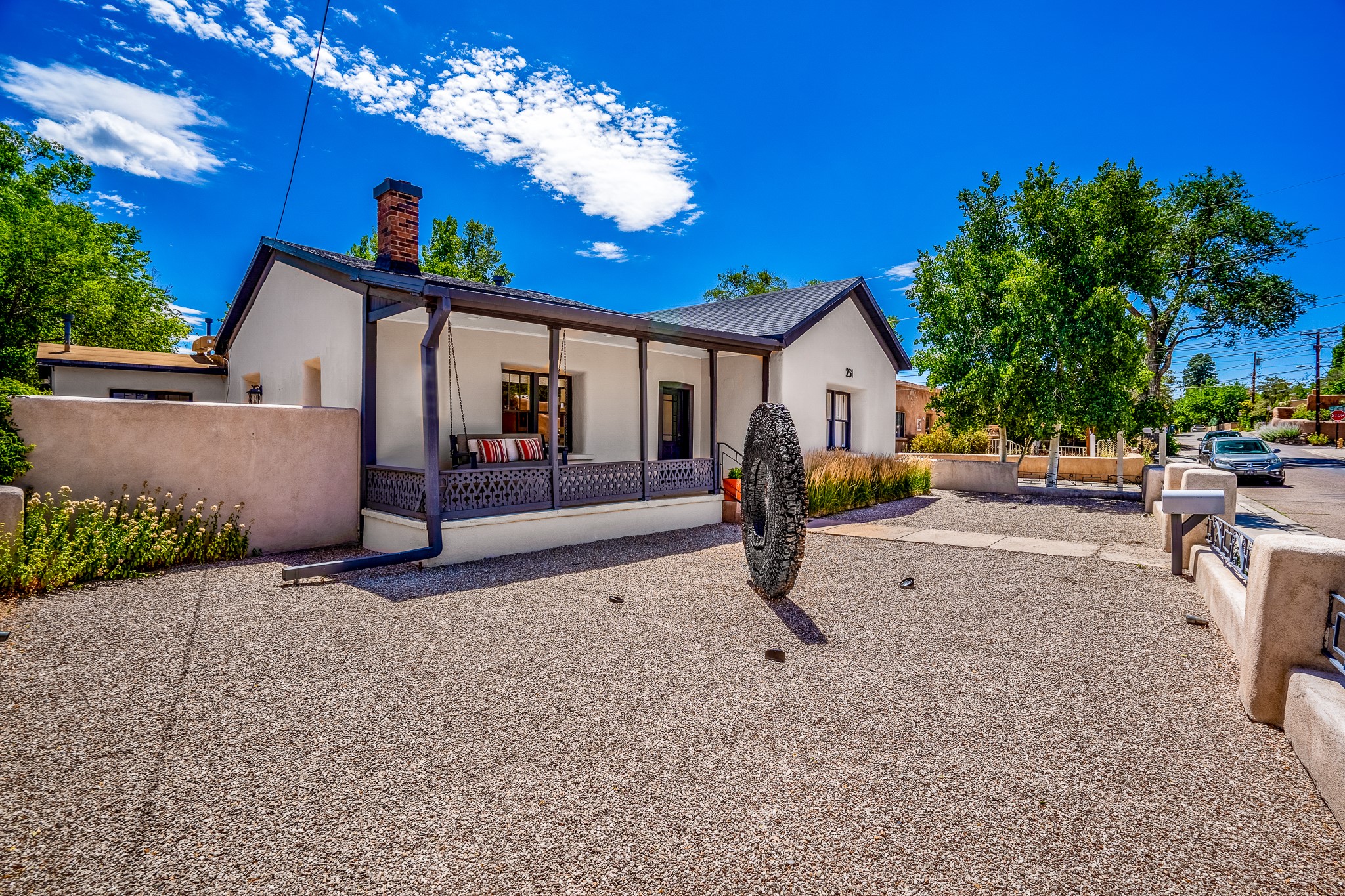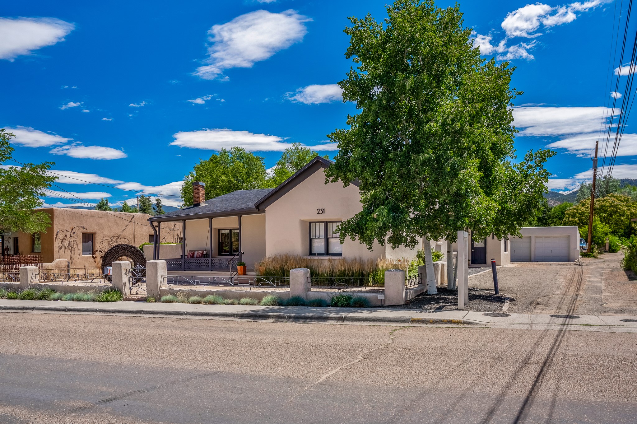 Welcome to 231 Delgado Street, a captivating piece of Santa Fe's rich history. As you step into this charming home, you'll instantly feel its warm embrace and imagine the endless possibilities it offers. Located within 200' of Canyon but without the busy traffic of Canyon Road. Adobe walls, multiple fireplaces, hardwood and slate tile flooring bring out the old-world charm. High ceilings and an entry foyer welcome you into the +/-2,389 square foot floor plan. The three bedrooms and one and a half bathrooms give a sense of space and comfort. The main rooms include the living room, dining room, kitchen and two additional rooms to be modified into bedrooms or flex/office spaces providing the opportunity for you to unleash your creative spirit and showcase your collections. Step outside to experience the tranquility of the outdoor spaces. Imagine cozying up to the wood-burning kiva in the rear portal, or sitting on the porch swing enjoying the sunset. The rear courtyard is accessible through three sets of French doors, adorned with mature aspen trees, giving you a private hideaway. Parking includes a two-car garage, driveway parking, and city on-street parking. A hidden gem lies in the 6,000+/- square foot residential lot just behind the garage, presenting an opportunity to add another home, or a guest house.** It's worth noting that this property is recognized as a contributing structure within the Santa Fe historic district, a testament to its timeless appeal and significance. Imagine being at the heart of the city, close to downtown, the Santa Fe River, and the renowned Canyon Road. Embrace the vibrant art community, and walk to the finest art galleries and dining experiences in town. Embrace the Santa Fe lifestyle and make this abode your own or design the next stunning gallery and let it be a testament to exceptional taste and appreciation for Santa Fe's beauty and culture. **Subject to city approval for development and/or lot split