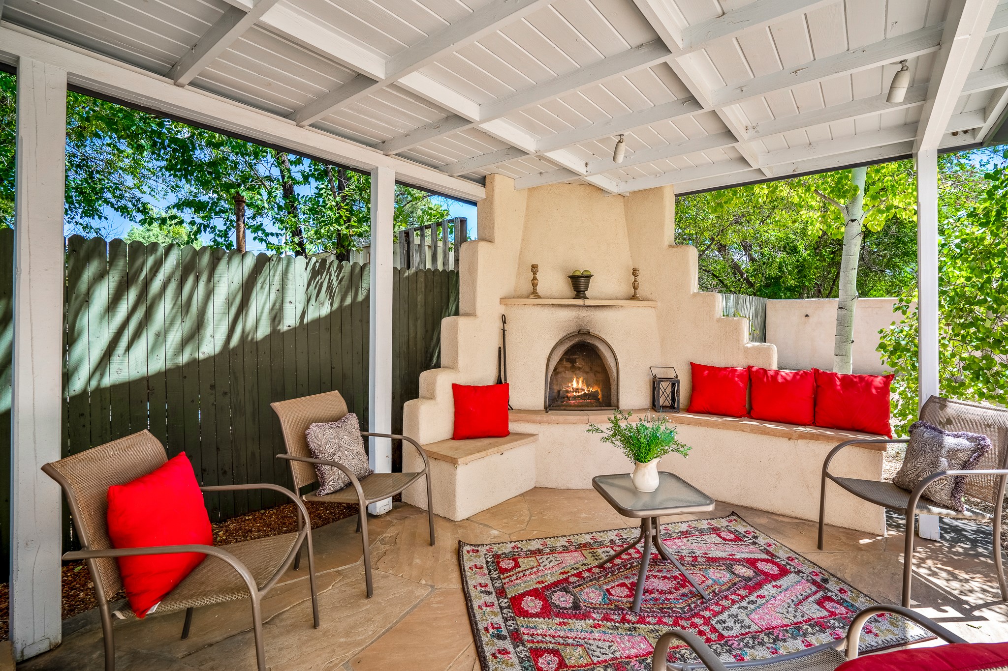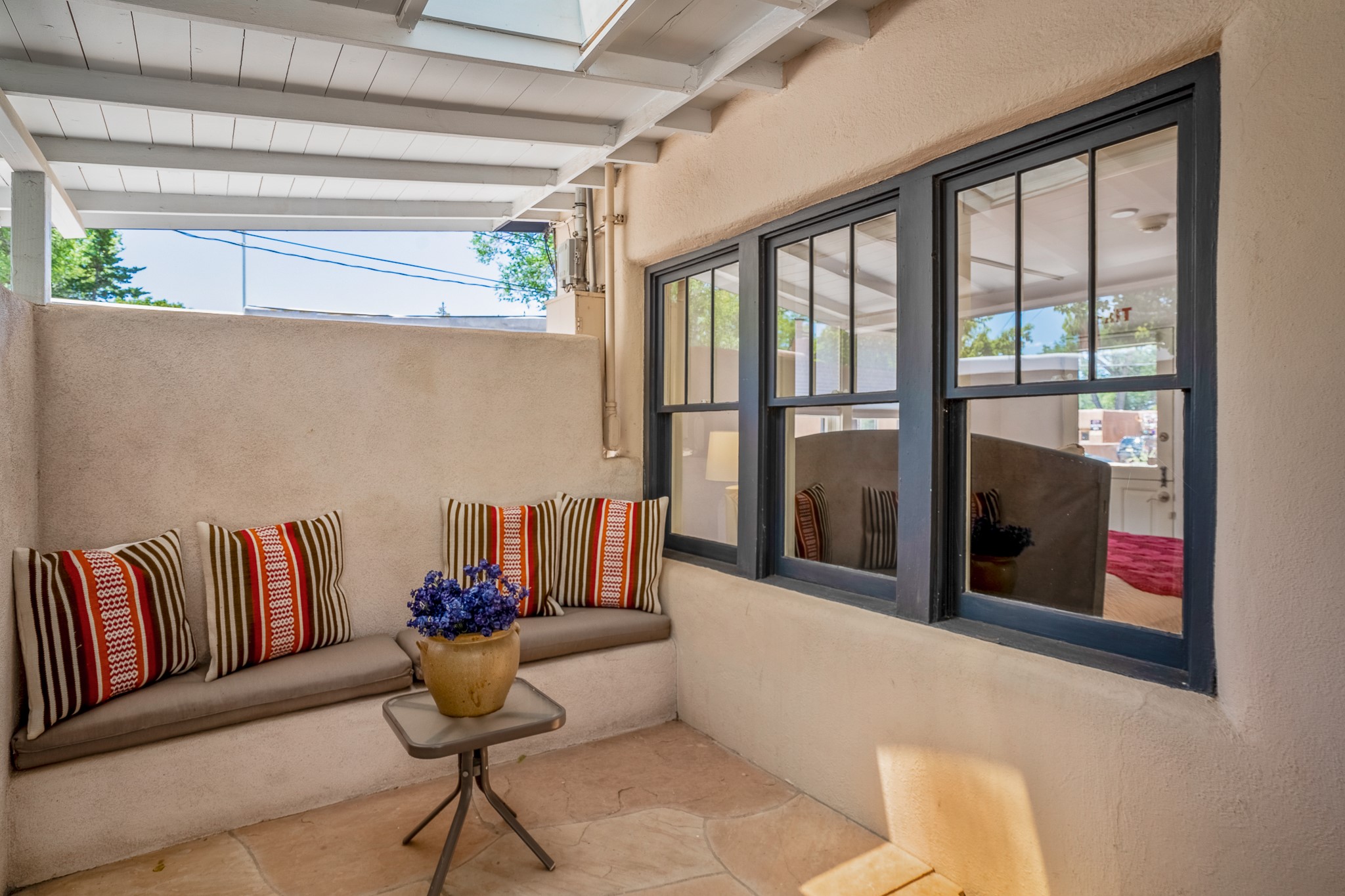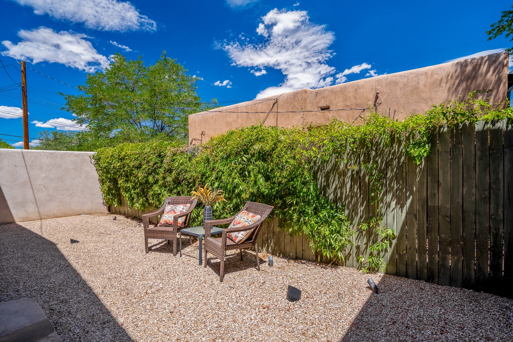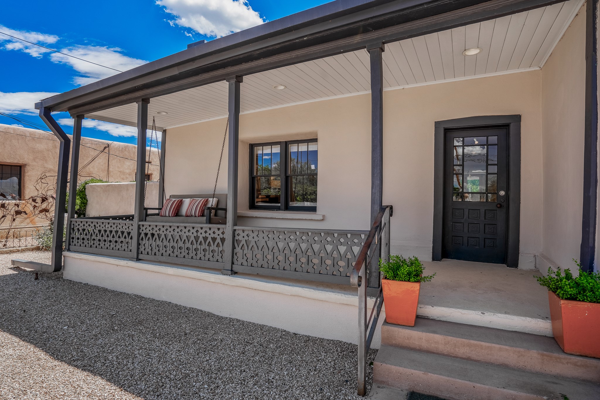 Welcome to 231 Delgado Street, a captivating piece of Santa Fe's rich history. As you step into this charming home, you'll instantly feel its warm embrace and imagine the endless possibilities it offers. Located within 200' of Canyon but without the busy traffic of Canyon Road. Adobe walls, multiple fireplaces, hardwood and slate tile flooring bring out the old-world charm. High ceilings and an entry foyer welcome you into the +/-2,389 square foot floor plan. The three bedrooms and one and a half bathrooms give a sense of space and comfort. The main rooms include the living room, dining room, kitchen and two additional rooms to be modified into bedrooms or flex/office spaces providing the opportunity for you to unleash your creative spirit and showcase your collections. Step outside to experience the tranquility of the outdoor spaces. Imagine cozying up to the wood-burning kiva in the rear portal, or sitting on the porch swing enjoying the sunset. The rear courtyard is accessible through three sets of French doors, adorned with mature aspen trees, giving you a private hideaway. Parking includes a two-car garage, driveway parking, and city on-street parking. A hidden gem lies in the 6,000+/- square foot residential lot just behind the garage, presenting an opportunity to add another home, or a guest house.** It's worth noting that this property is recognized as a contributing structure within the Santa Fe historic district, a testament to its timeless appeal and significance. Imagine being at the heart of the city, close to downtown, the Santa Fe River, and the renowned Canyon Road. Embrace the vibrant art community, and walk to the finest art galleries and dining experiences in town. Embrace the Santa Fe lifestyle and make this abode your own or design the next stunning gallery and let it be a testament to exceptional taste and appreciation for Santa Fe's beauty and culture. **Subject to city approval for development and/or lot split