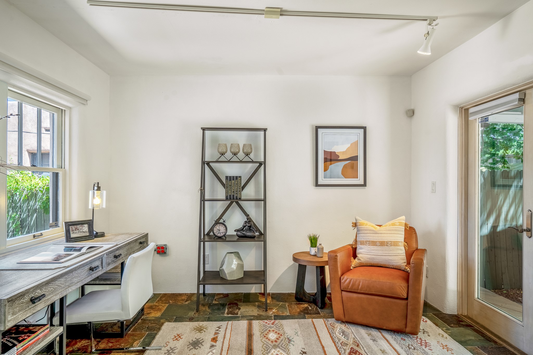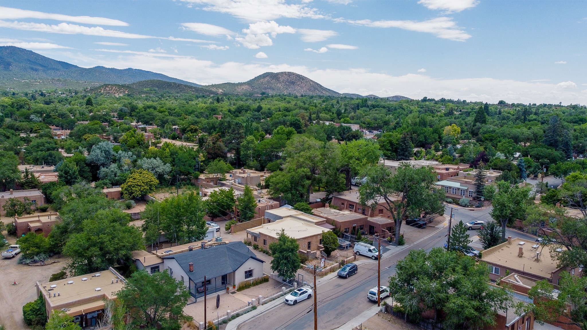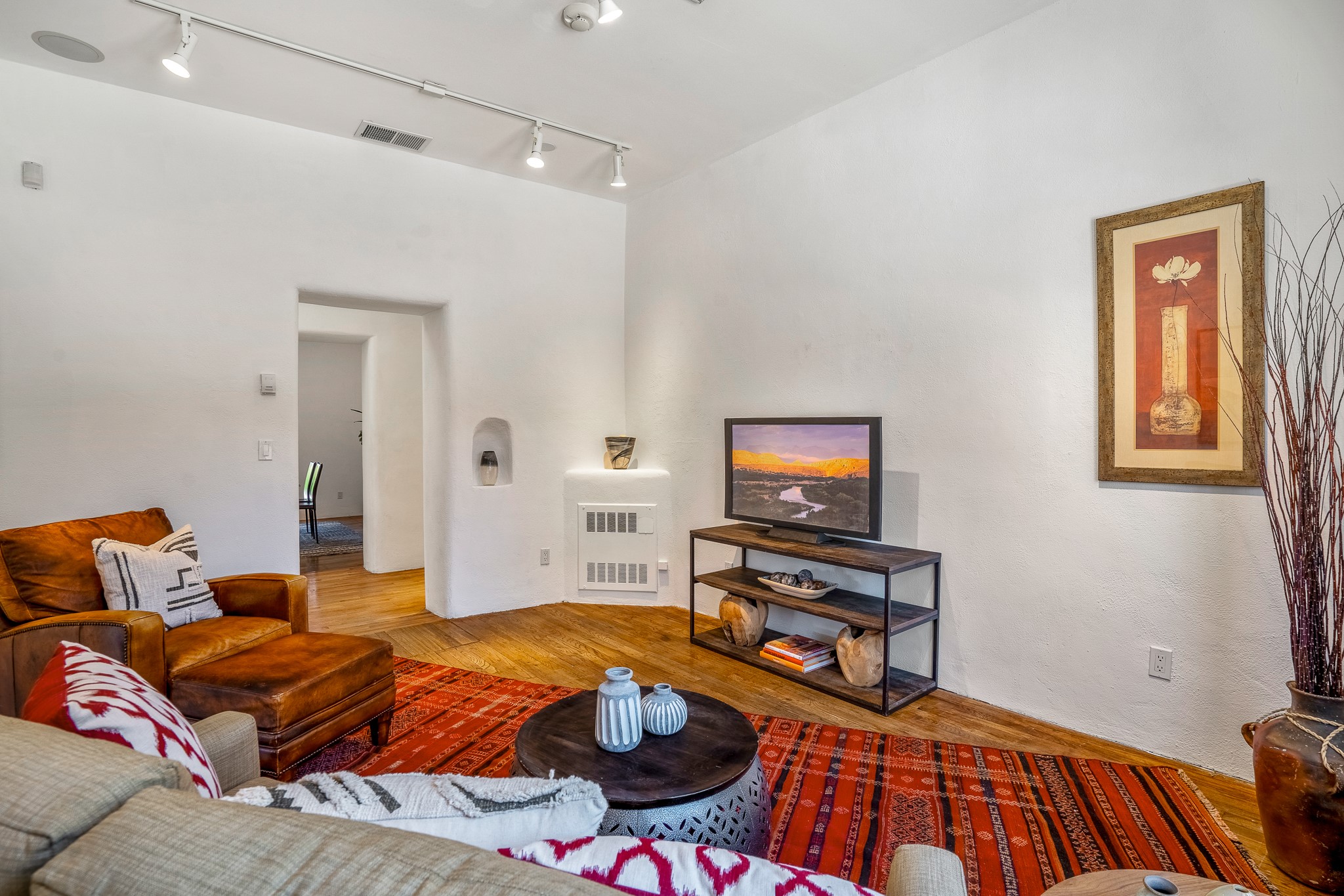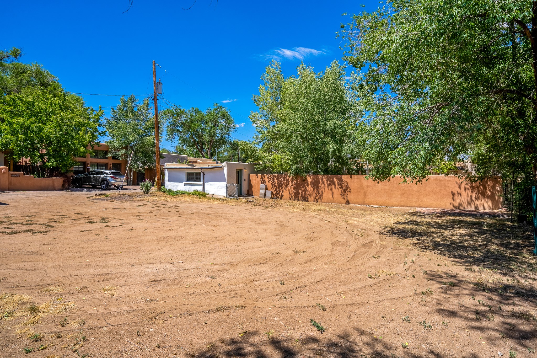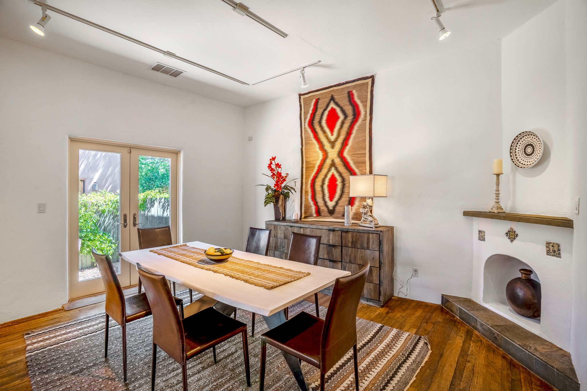 Welcome to 231 Delgado Street, a captivating piece of Santa Fe's rich history. As you step into this charming home, you'll instantly feel its warm embrace and imagine the endless possibilities it offers. Located within 200' of Canyon but without the busy traffic of Canyon Road. Adobe walls, multiple fireplaces, hardwood and slate tile flooring bring out the old-world charm. High ceilings and an entry foyer welcome you into the +/-2,389 square foot floor plan. The three bedrooms and one and a half bathrooms give a sense of space and comfort. The main rooms include the living room, dining room, kitchen and two additional rooms to be modified into bedrooms or flex/office spaces providing the opportunity for you to unleash your creative spirit and showcase your collections. Step outside to experience the tranquility of the outdoor spaces. Imagine cozying up to the wood-burning kiva in the rear portal, or sitting on the porch swing enjoying the sunset. The rear courtyard is accessible through three sets of French doors, adorned with mature aspen trees, giving you a private hideaway. Parking includes a two-car garage, driveway parking, and city on-street parking. A hidden gem lies in the 6,000+/- square foot residential lot just behind the garage, presenting an opportunity to add another home, or a guest house.** It's worth noting that this property is recognized as a contributing structure within the Santa Fe historic district, a testament to its timeless appeal and significance. Imagine being at the heart of the city, close to downtown, the Santa Fe River, and the renowned Canyon Road. Embrace the vibrant art community, and walk to the finest art galleries and dining experiences in town. Embrace the Santa Fe lifestyle and make this abode your own or design the next stunning gallery and let it be a testament to exceptional taste and appreciation for Santa Fe's beauty and culture. **Subject to city approval for development and/or lot split