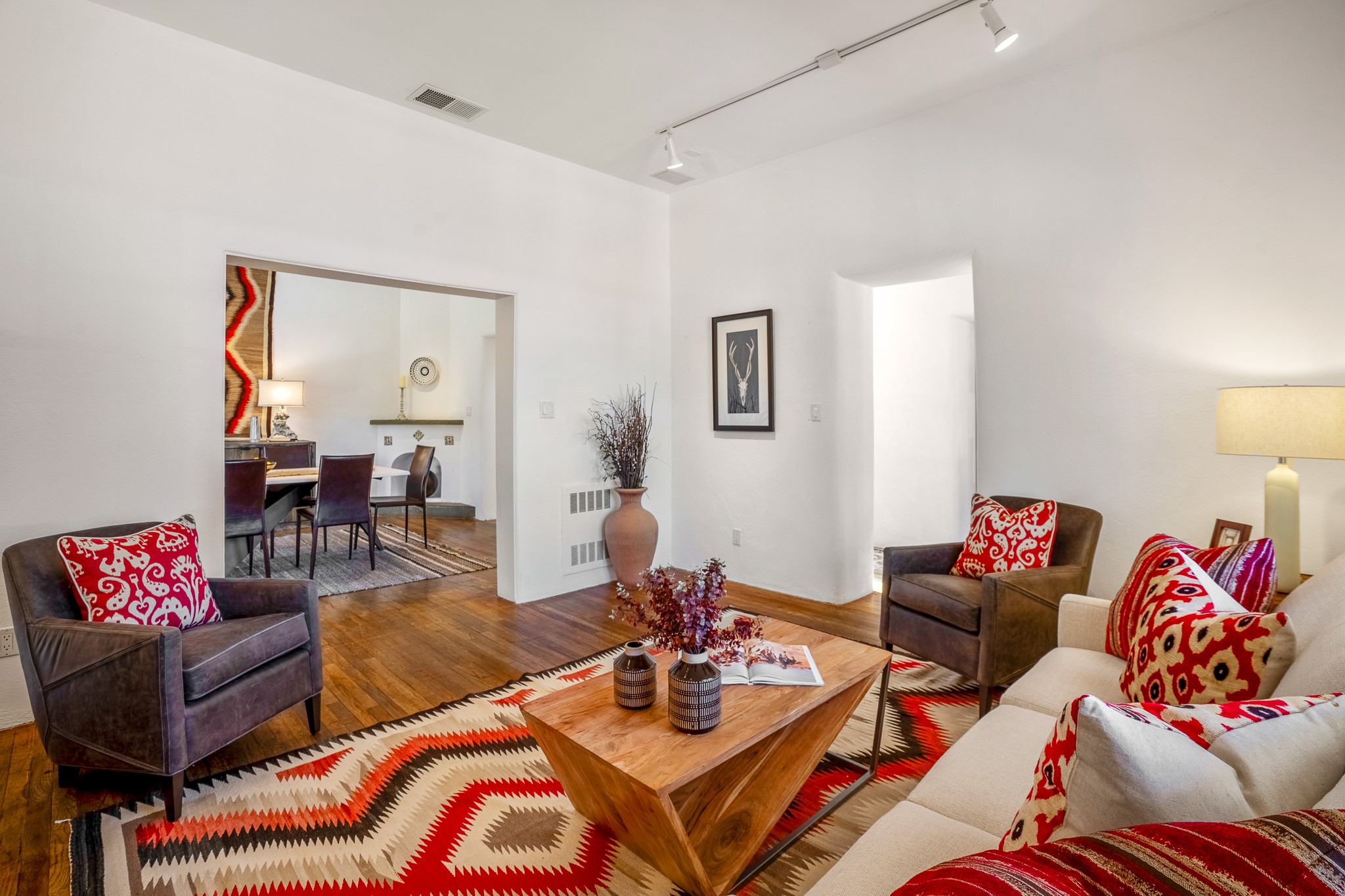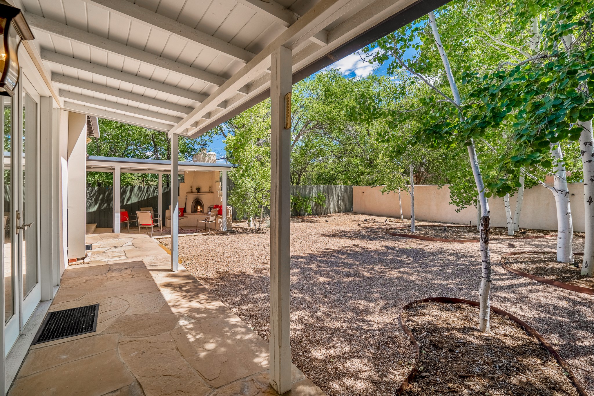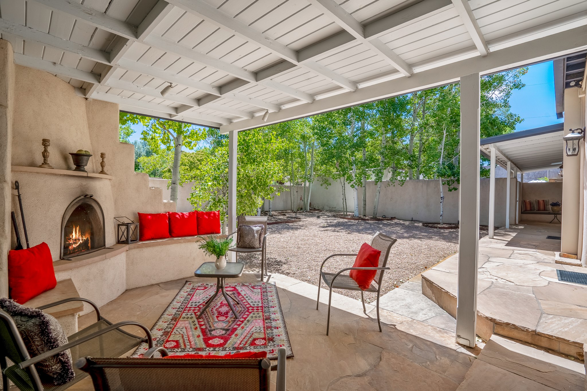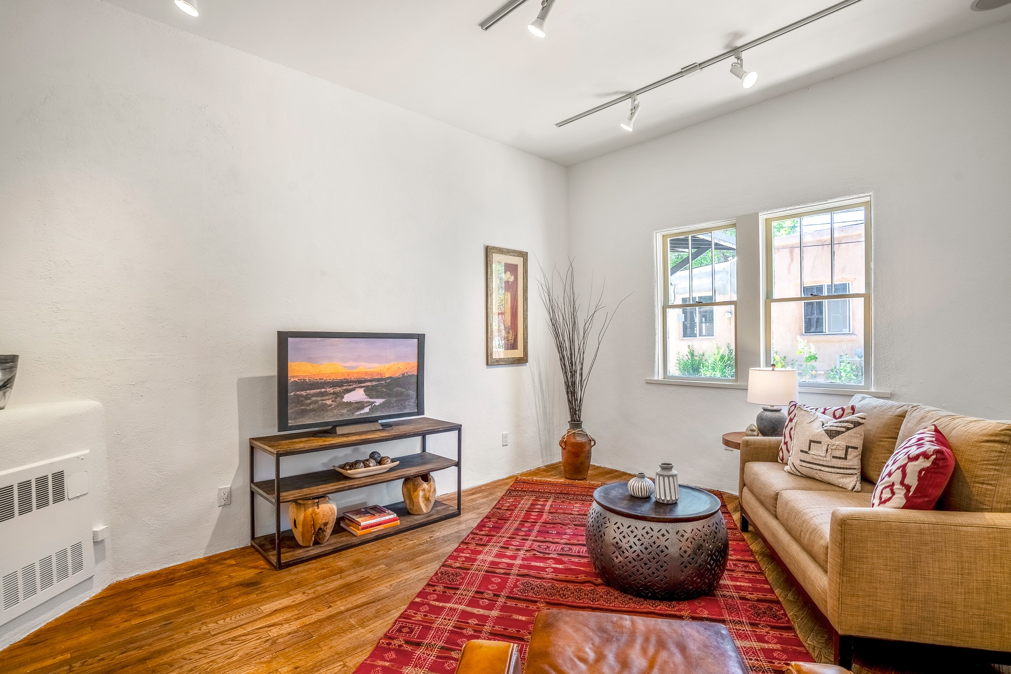 Welcome to 231 Delgado Street, a captivating piece of Santa Fe's rich history. As you step into this charming home, you'll instantly feel its warm embrace and imagine the endless possibilities it offers. Located within 200' of Canyon but without the busy traffic of Canyon Road. Adobe walls, multiple fireplaces, hardwood and slate tile flooring bring out the old-world charm. High ceilings and an entry foyer welcome you into the +/-2,389 square foot floor plan. The three bedrooms and one and a half bathrooms give a sense of space and comfort. The main rooms include the living room, dining room, kitchen and two additional rooms to be modified into bedrooms or flex/office spaces providing the opportunity for you to unleash your creative spirit and showcase your collections. Step outside to experience the tranquility of the outdoor spaces. Imagine cozying up to the wood-burning kiva in the rear portal, or sitting on the porch swing enjoying the sunset. The rear courtyard is accessible through three sets of French doors, adorned with mature aspen trees, giving you a private hideaway. Parking includes a two-car garage, driveway parking, and city on-street parking. A hidden gem lies in the 6,000+/- square foot residential lot just behind the garage, presenting an opportunity to add another home, or a guest house.** It's worth noting that this property is recognized as a contributing structure within the Santa Fe historic district, a testament to its timeless appeal and significance. Imagine being at the heart of the city, close to downtown, the Santa Fe River, and the renowned Canyon Road. Embrace the vibrant art community, and walk to the finest art galleries and dining experiences in town. Embrace the Santa Fe lifestyle and make this abode your own or design the next stunning gallery and let it be a testament to exceptional taste and appreciation for Santa Fe's beauty and culture. **Subject to city approval for development and/or lot split
