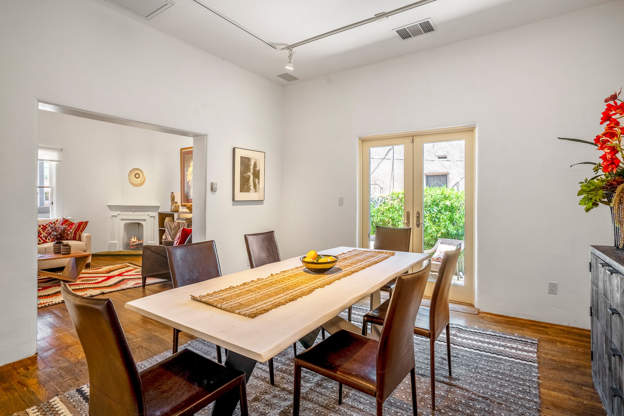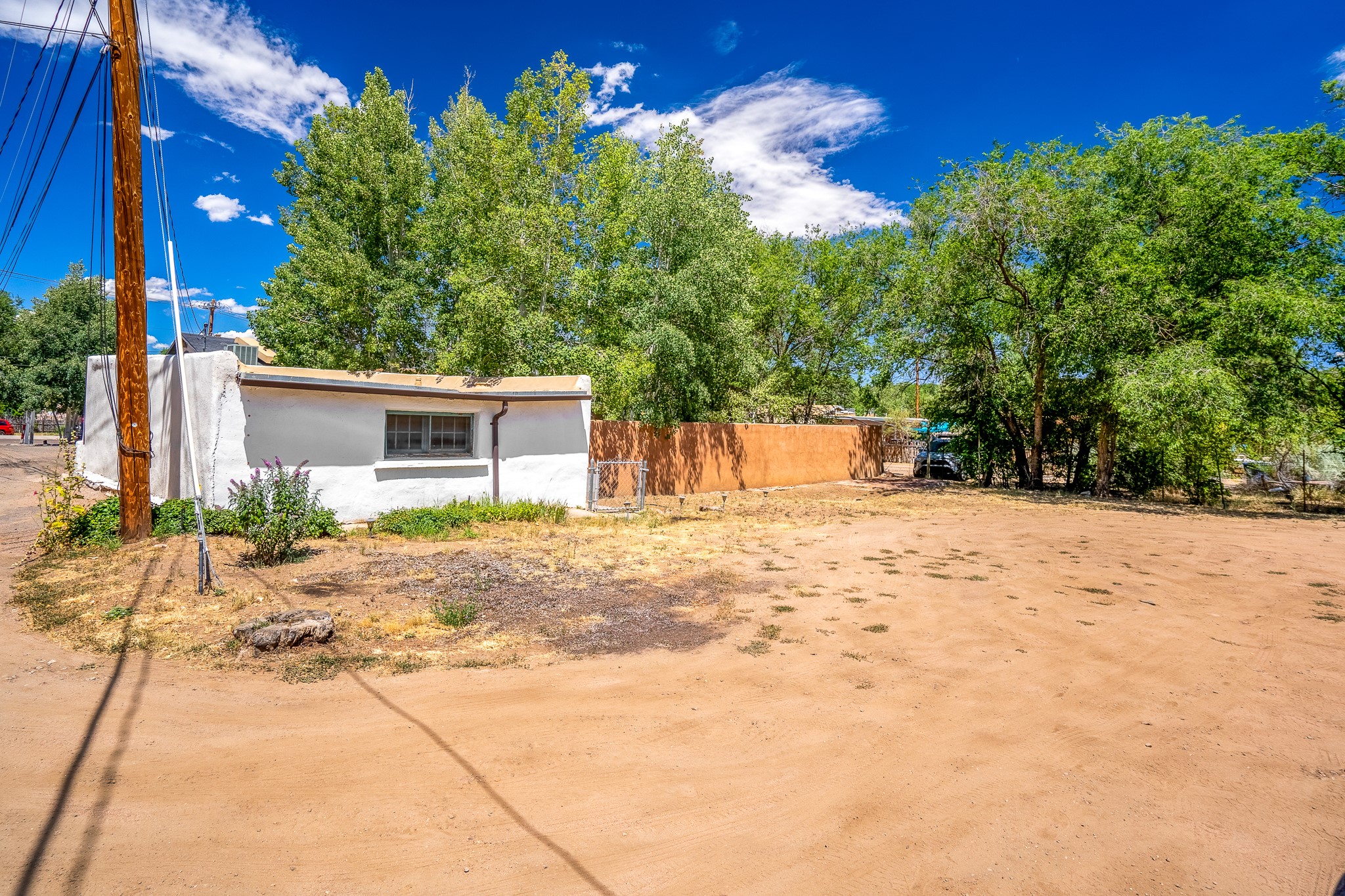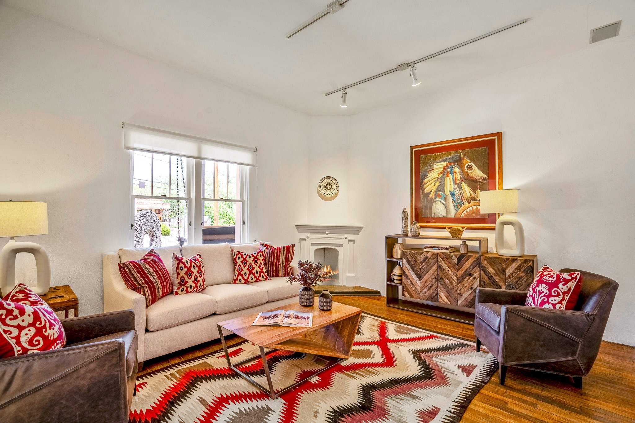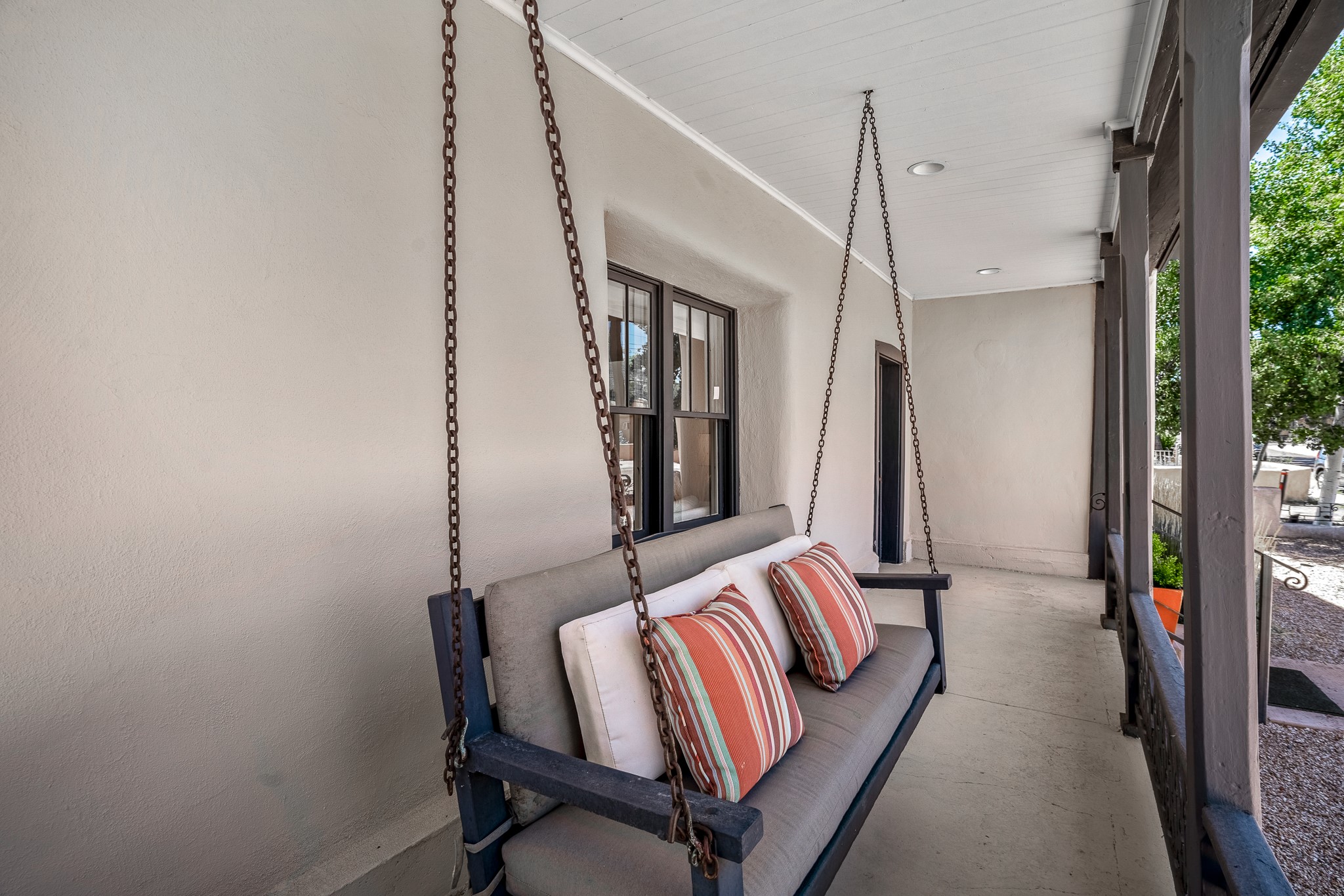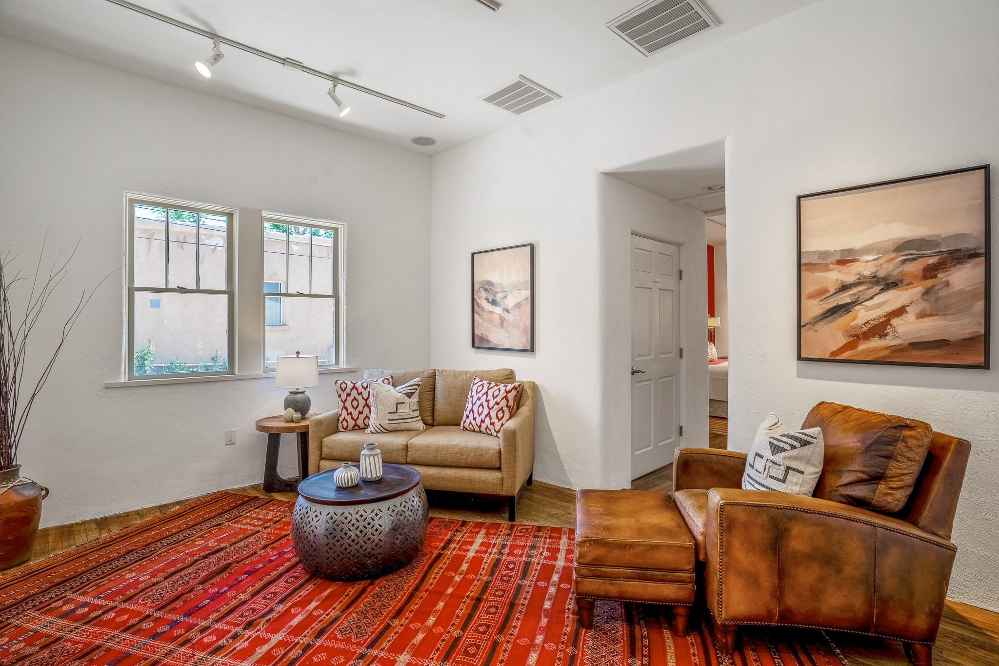 Welcome to 231 Delgado Street, a captivating piece of Santa Fe's rich history. As you step into this charming home, you'll instantly feel its warm embrace and imagine the endless possibilities it offers. Located within 200' of Canyon but without the busy traffic of Canyon Road. Adobe walls, multiple fireplaces, hardwood and slate tile flooring bring out the old-world charm. High ceilings and an entry foyer welcome you into the +/-2,389 square foot floor plan. The three bedrooms and one and a half bathrooms give a sense of space and comfort. The main rooms include the living room, dining room, kitchen and two additional rooms to be modified into bedrooms or flex/office spaces providing the opportunity for you to unleash your creative spirit and showcase your collections. Step outside to experience the tranquility of the outdoor spaces. Imagine cozying up to the wood-burning kiva in the rear portal, or sitting on the porch swing enjoying the sunset. The rear courtyard is accessible through three sets of French doors, adorned with mature aspen trees, giving you a private hideaway. Parking includes a two-car garage, driveway parking, and city on-street parking. A hidden gem lies in the 6,000+/- square foot residential lot just behind the garage, presenting an opportunity to add another home, or a guest house.** It's worth noting that this property is recognized as a contributing structure within the Santa Fe historic district, a testament to its timeless appeal and significance. Imagine being at the heart of the city, close to downtown, the Santa Fe River, and the renowned Canyon Road. Embrace the vibrant art community, and walk to the finest art galleries and dining experiences in town. Embrace the Santa Fe lifestyle and make this abode your own or design the next stunning gallery and let it be a testament to exceptional taste and appreciation for Santa Fe's beauty and culture. **Subject to city approval for development and/or lot split