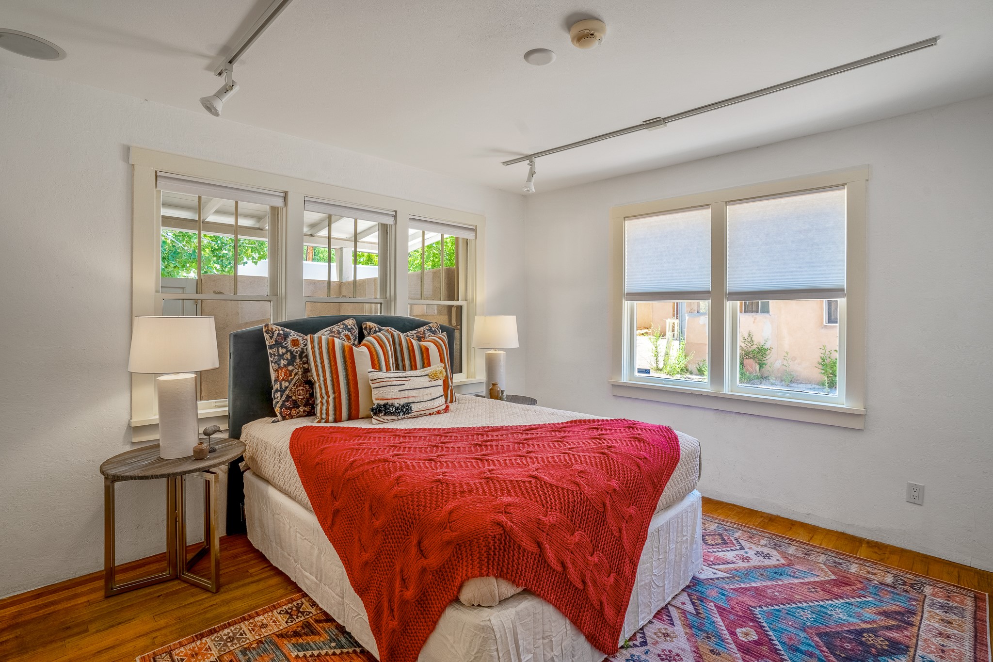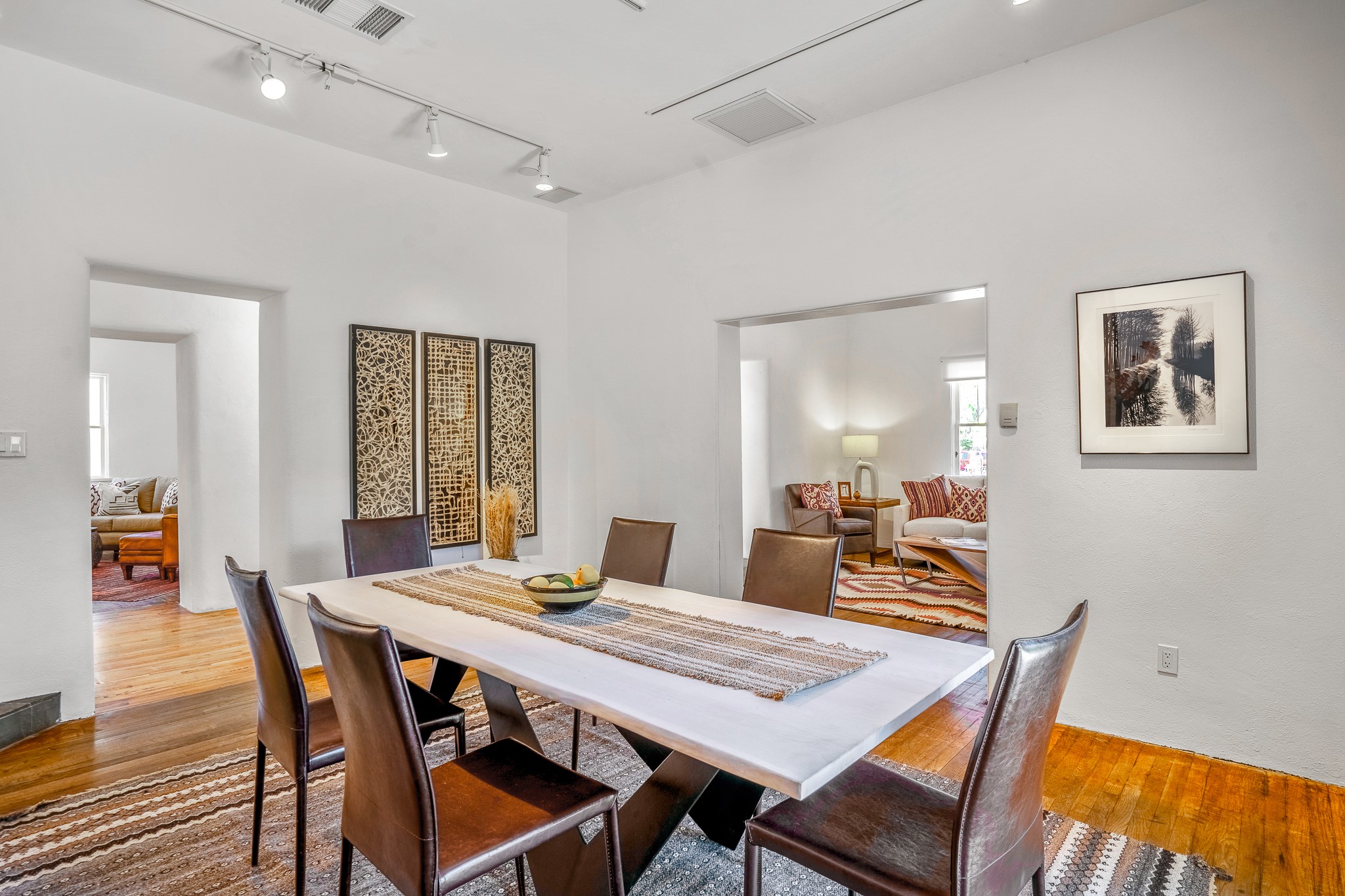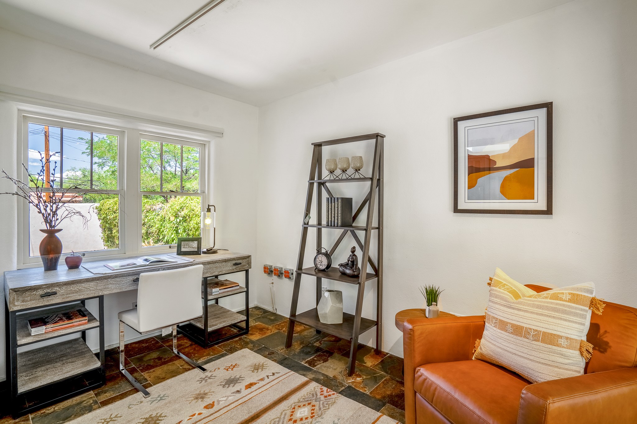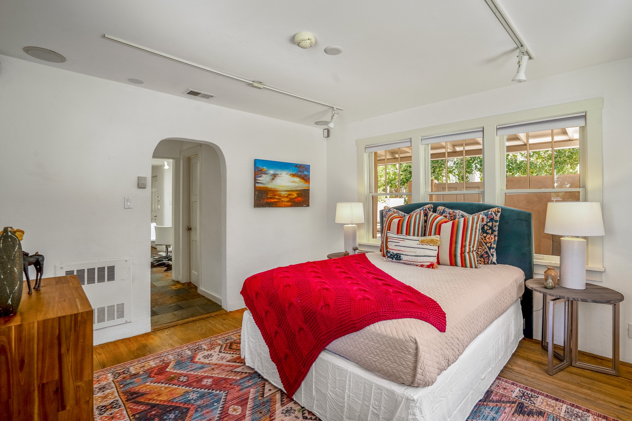 Welcome to 231 Delgado Street, a captivating piece of Santa Fe's rich history. As you step into this charming home, you'll instantly feel its warm embrace and imagine the endless possibilities it offers. Located within 200' of Canyon but without the busy traffic of Canyon Road. Adobe walls, multiple fireplaces, hardwood and slate tile flooring bring out the old-world charm. High ceilings and an entry foyer welcome you into the +/-2,389 square foot floor plan. The three bedrooms and one and a half bathrooms give a sense of space and comfort. The main rooms include the living room, dining room, kitchen and two additional rooms to be modified into bedrooms or flex/office spaces providing the opportunity for you to unleash your creative spirit and showcase your collections. Step outside to experience the tranquility of the outdoor spaces. Imagine cozying up to the wood-burning kiva in the rear portal, or sitting on the porch swing enjoying the sunset. The rear courtyard is accessible through three sets of French doors, adorned with mature aspen trees, giving you a private hideaway. Parking includes a two-car garage, driveway parking, and city on-street parking. A hidden gem lies in the 6,000+/- square foot residential lot just behind the garage, presenting an opportunity to add another home, or a guest house.** It's worth noting that this property is recognized as a contributing structure within the Santa Fe historic district, a testament to its timeless appeal and significance. Imagine being at the heart of the city, close to downtown, the Santa Fe River, and the renowned Canyon Road. Embrace the vibrant art community, and walk to the finest art galleries and dining experiences in town. Embrace the Santa Fe lifestyle and make this abode your own or design the next stunning gallery and let it be a testament to exceptional taste and appreciation for Santa Fe's beauty and culture. **Subject to city approval for development and/or lot split