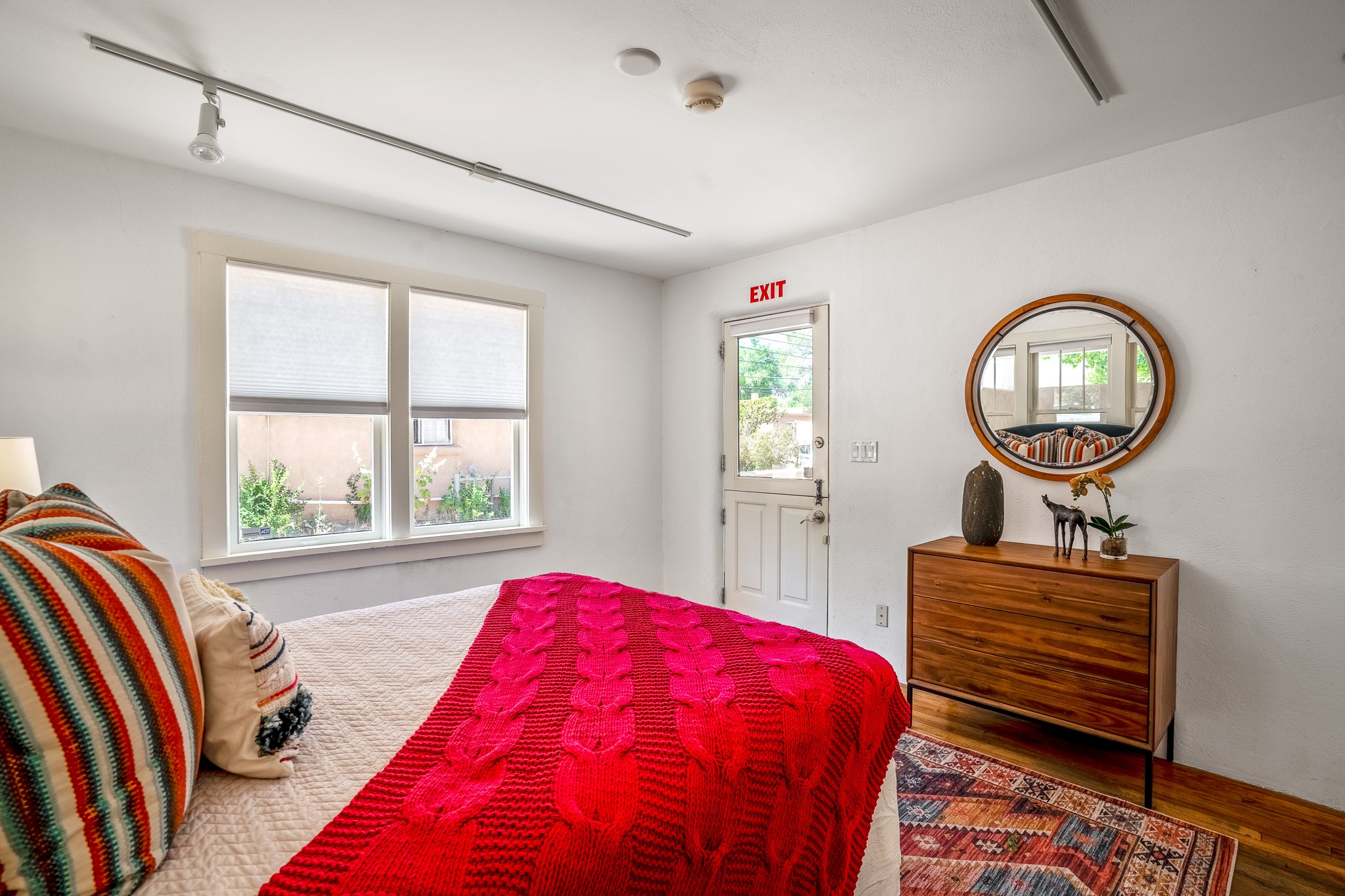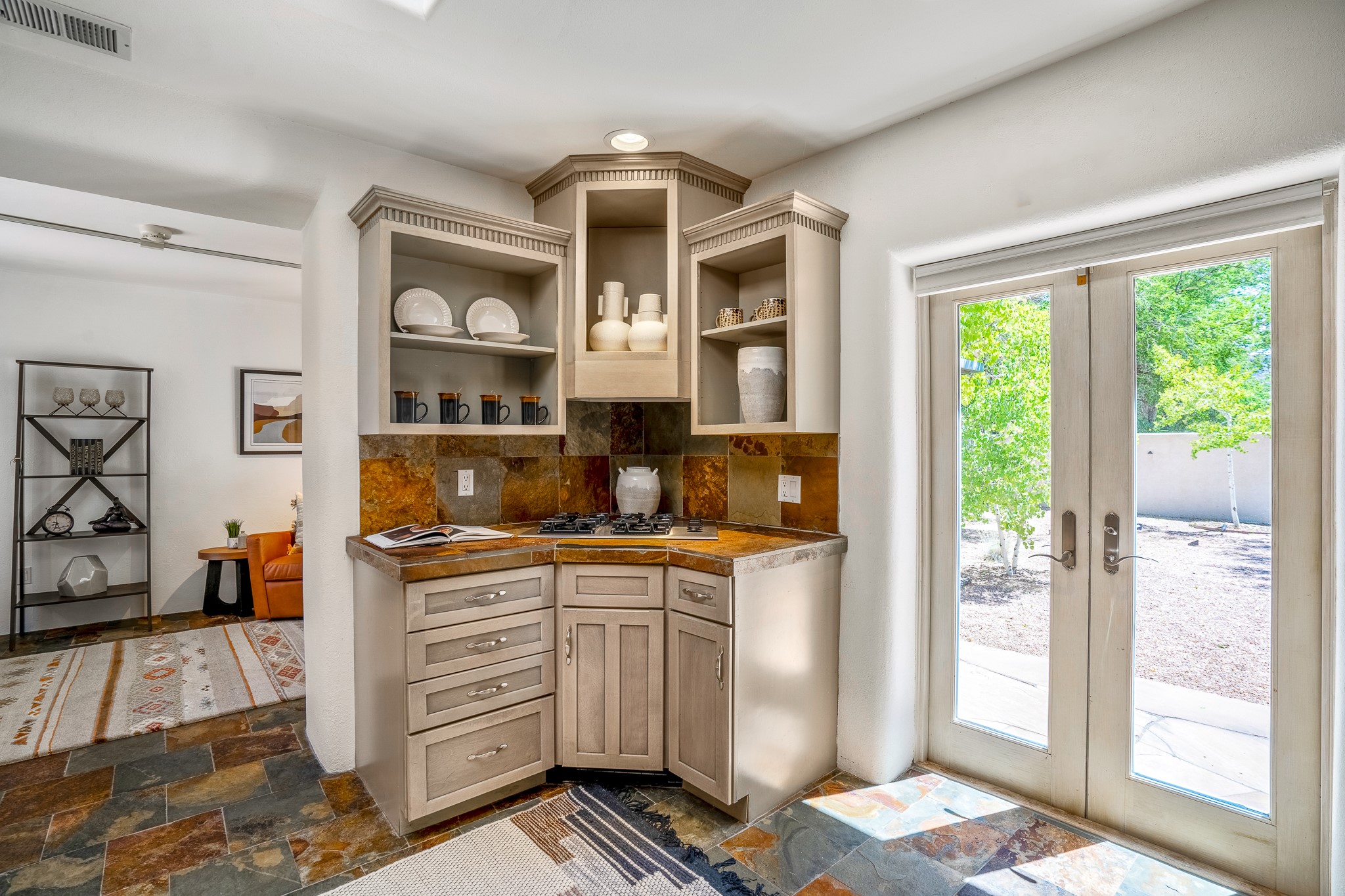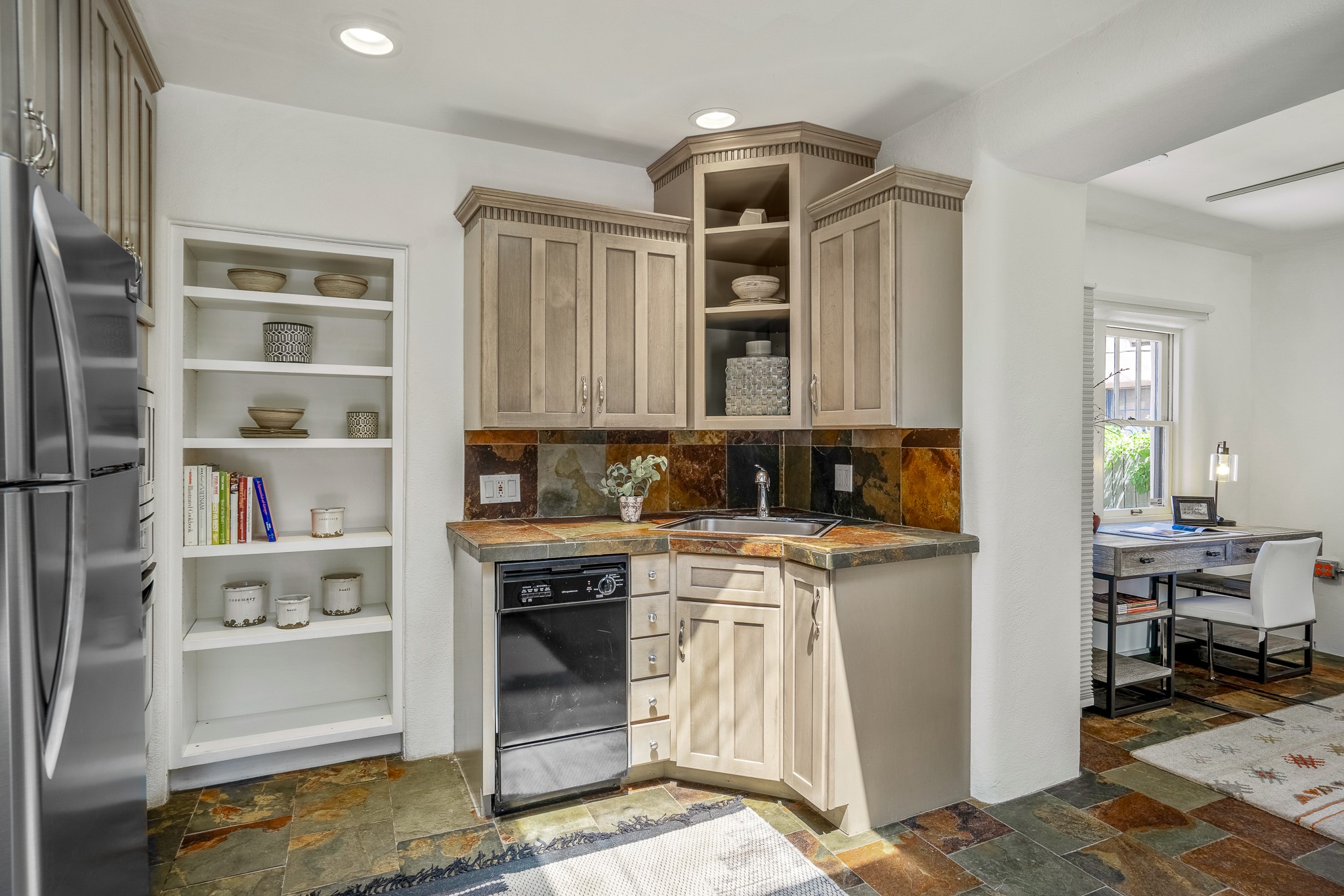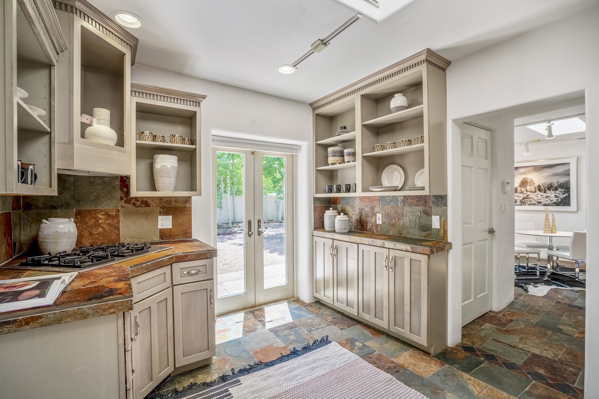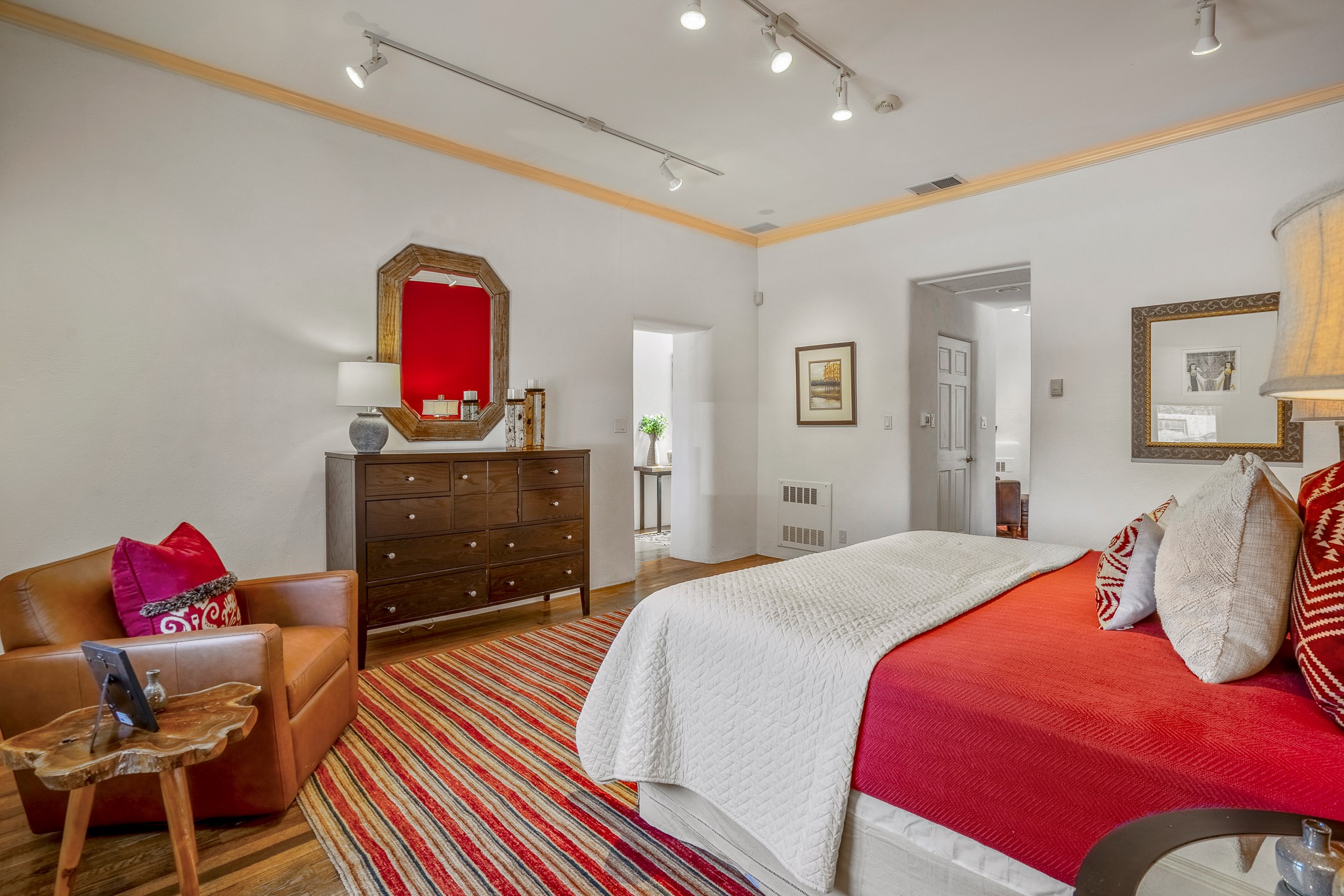 Welcome to 231 Delgado Street, a captivating piece of Santa Fe's rich history. As you step into this charming home, you'll instantly feel its warm embrace and imagine the endless possibilities it offers. Located within 200' of Canyon but without the busy traffic of Canyon Road. Adobe walls, multiple fireplaces, hardwood and slate tile flooring bring out the old-world charm. High ceilings and an entry foyer welcome you into the +/-2,389 square foot floor plan. The three bedrooms and one and a half bathrooms give a sense of space and comfort. The main rooms include the living room, dining room, kitchen and two additional rooms to be modified into bedrooms or flex/office spaces providing the opportunity for you to unleash your creative spirit and showcase your collections. Step outside to experience the tranquility of the outdoor spaces. Imagine cozying up to the wood-burning kiva in the rear portal, or sitting on the porch swing enjoying the sunset. The rear courtyard is accessible through three sets of French doors, adorned with mature aspen trees, giving you a private hideaway. Parking includes a two-car garage, driveway parking, and city on-street parking. A hidden gem lies in the 6,000+/- square foot residential lot just behind the garage, presenting an opportunity to add another home, or a guest house.** It's worth noting that this property is recognized as a contributing structure within the Santa Fe historic district, a testament to its timeless appeal and significance. Imagine being at the heart of the city, close to downtown, the Santa Fe River, and the renowned Canyon Road. Embrace the vibrant art community, and walk to the finest art galleries and dining experiences in town. Embrace the Santa Fe lifestyle and make this abode your own or design the next stunning gallery and let it be a testament to exceptional taste and appreciation for Santa Fe's beauty and culture. **Subject to city approval for development and/or lot split