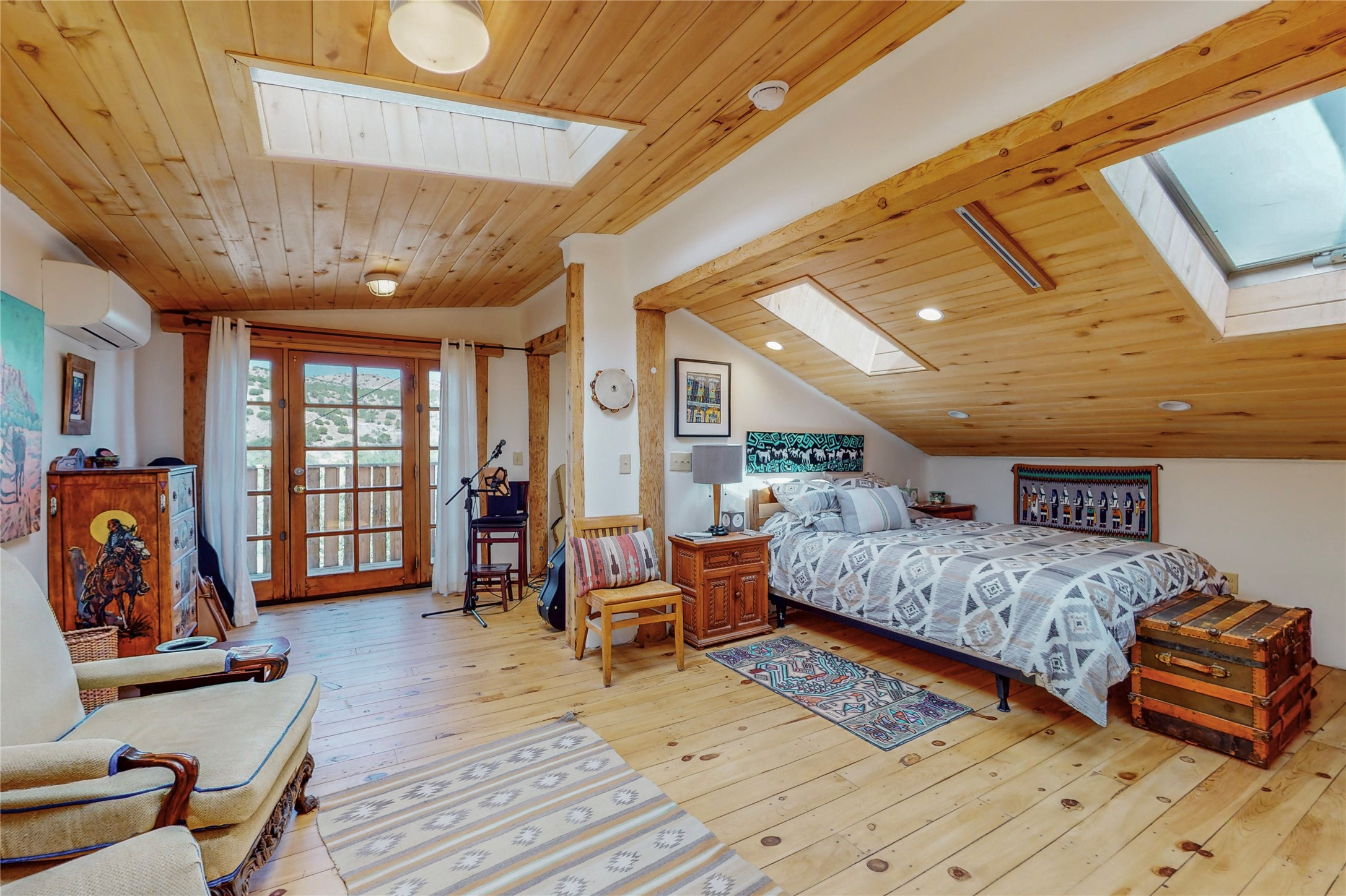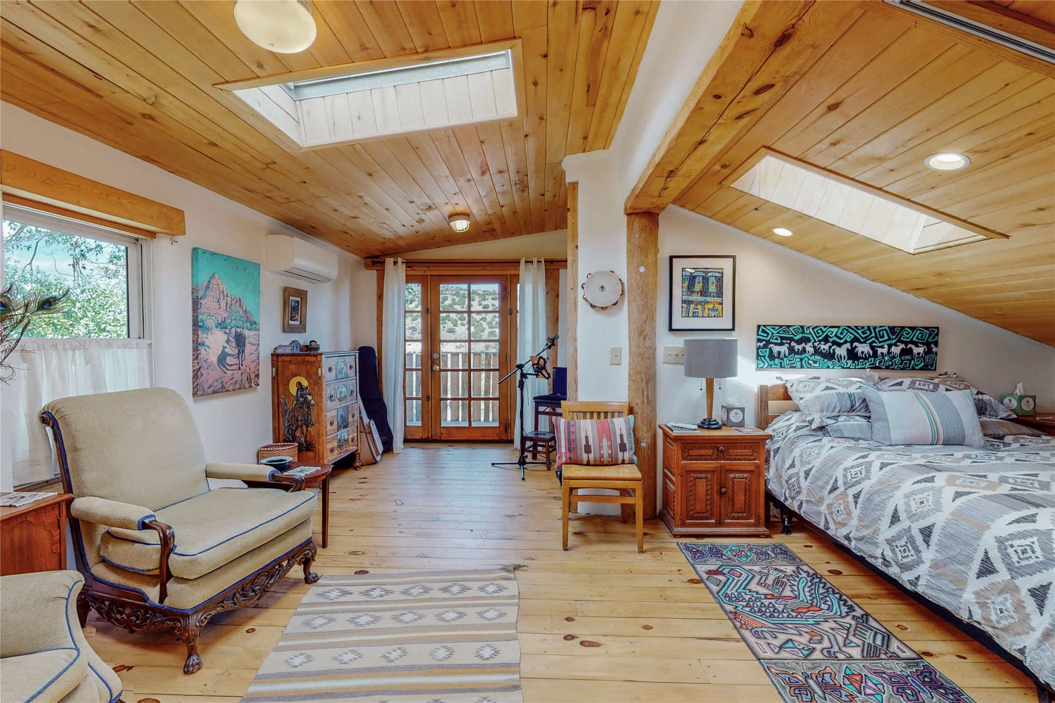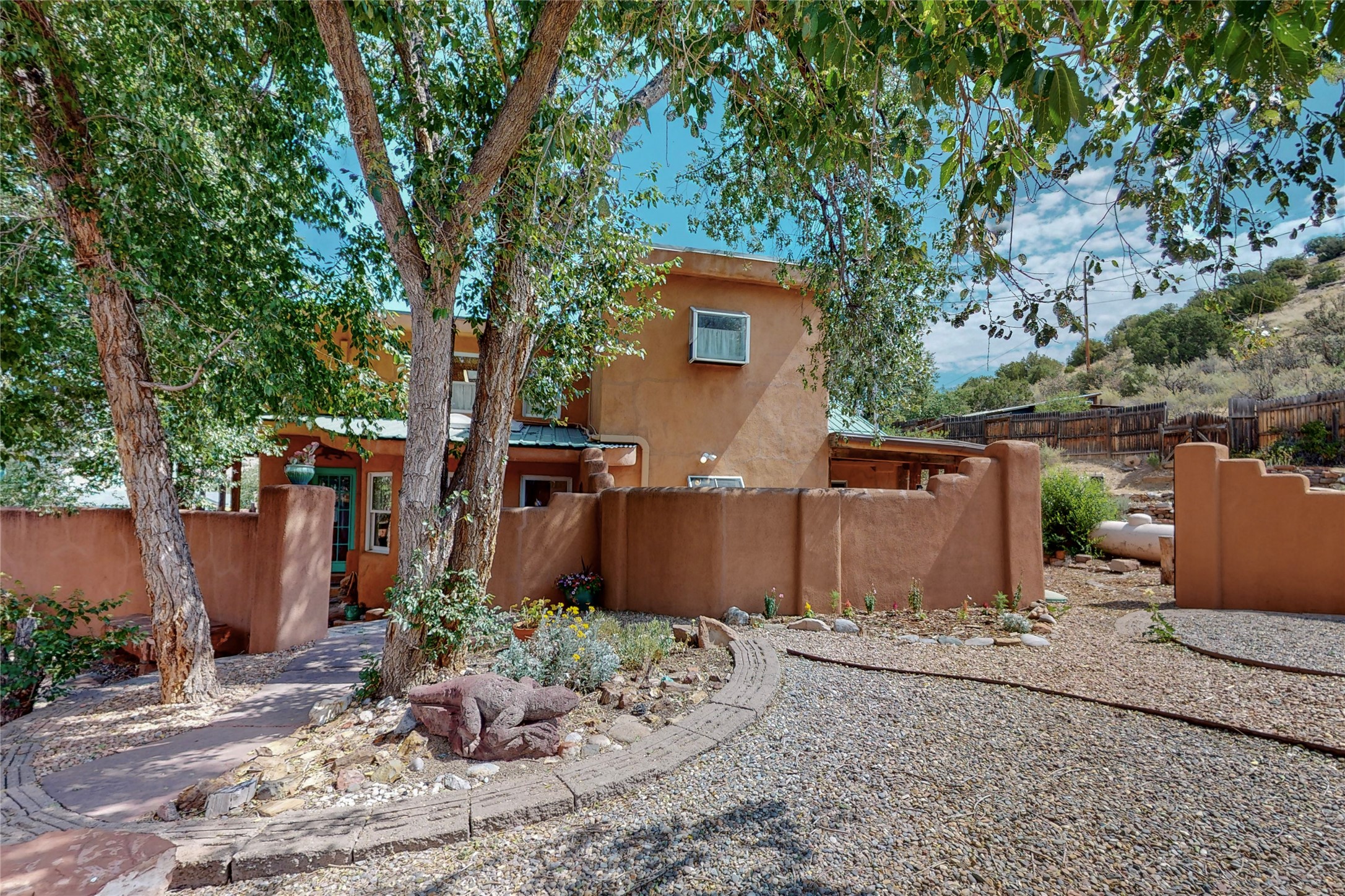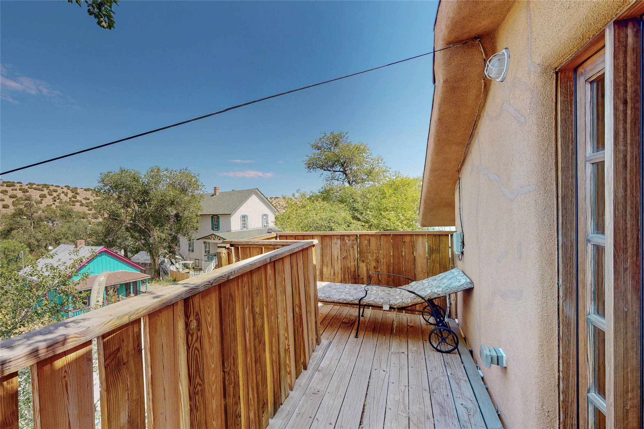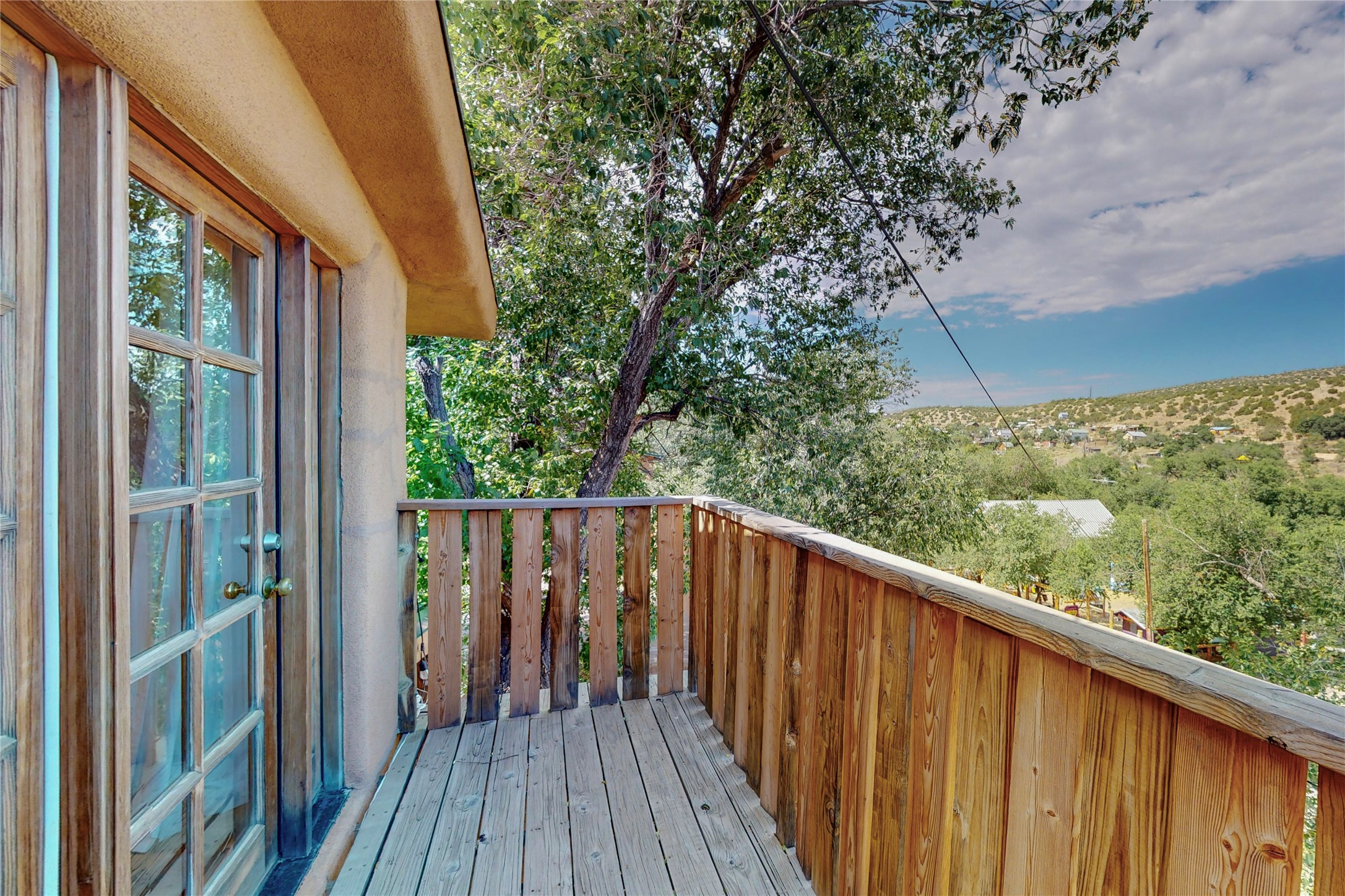 What an incredible find! This beautiful Madrid home is an artist's dream, offering both residential and commercial potential on two side by side lots. The charming home sits up high, right on the Turquoise Trail. The large deck out front offers great entertainment potential with wonderful views and lots of privacy. This home offers an open floorplan, including a large kitchen, a bedroom and office downstairs, and a large master suite with a walk in closet upstairs. There is plenty of natural light, as well as a whole home water filtration system, including reverse osmosis under the kitchen sink. The large side yard is tastefully landscaped and has a small outbuilding, perfect for an artist studio or gallery. Access and offstreet parking is available off of Ice House Rd.