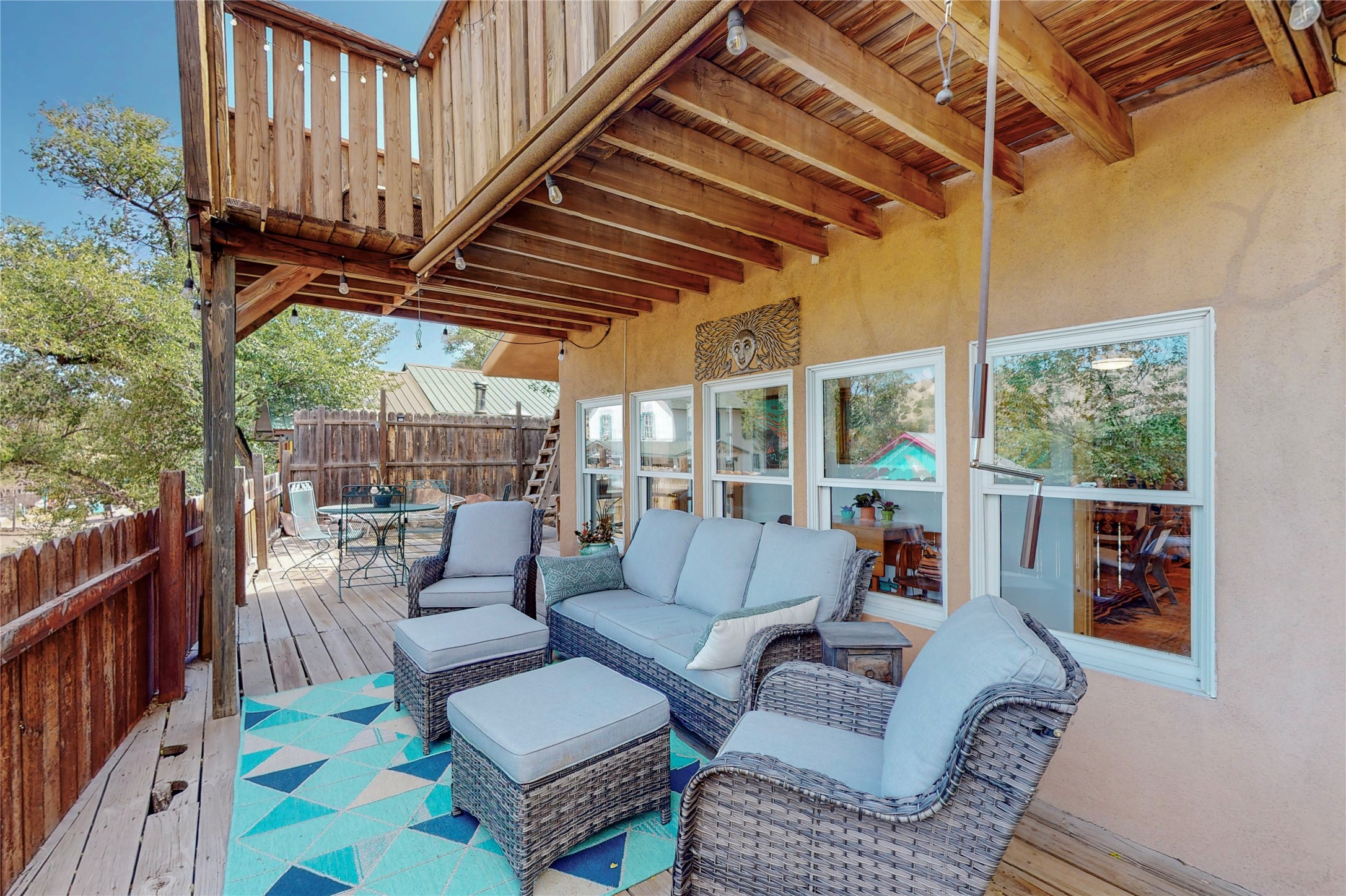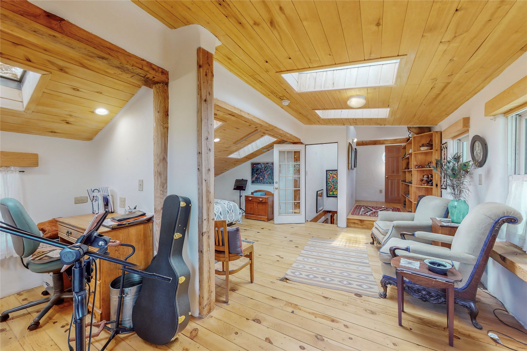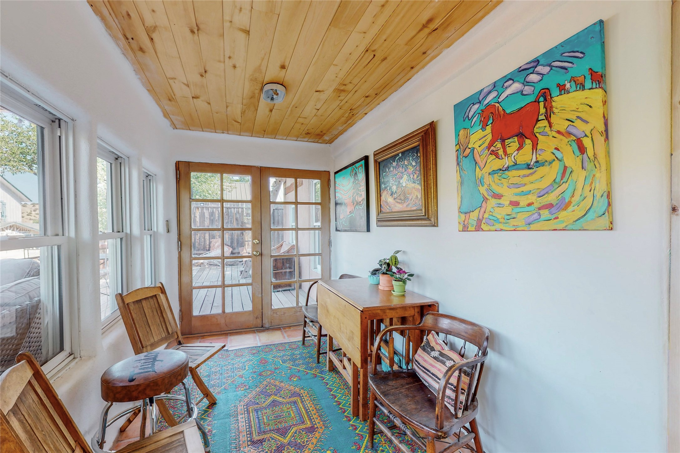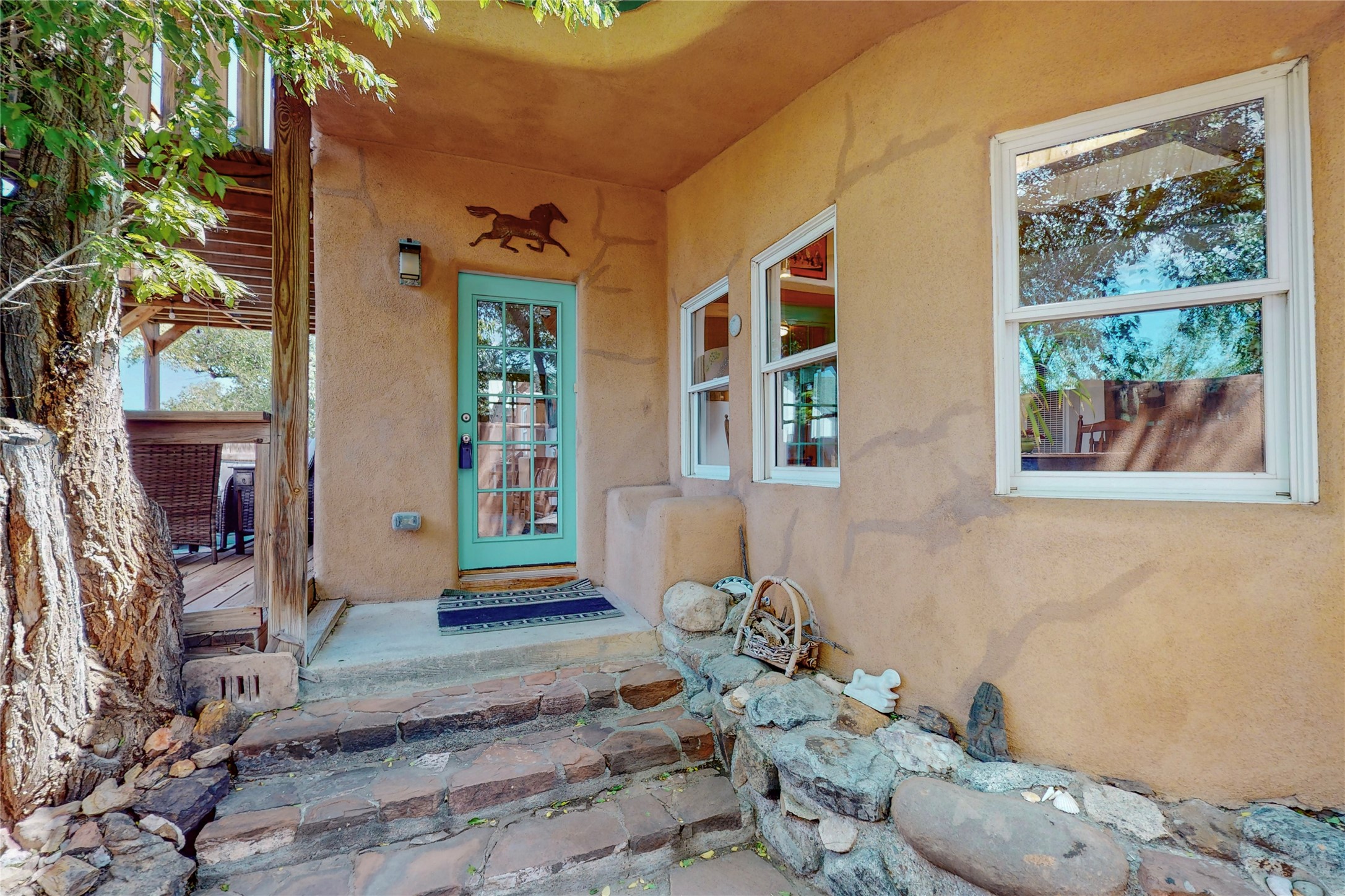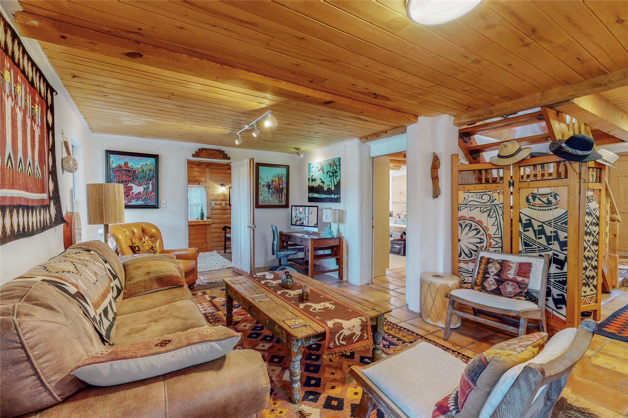 What an incredible find! This beautiful Madrid home is an artist's dream, offering both residential and commercial potential on two side by side lots. The charming home sits up high, right on the Turquoise Trail. The large deck out front offers great entertainment potential with wonderful views and lots of privacy. This home offers an open floorplan, including a large kitchen, a bedroom and office downstairs, and a large master suite with a walk in closet upstairs. There is plenty of natural light, as well as a whole home water filtration system, including reverse osmosis under the kitchen sink. The large side yard is tastefully landscaped and has a small outbuilding, perfect for an artist studio or gallery. Access and offstreet parking is available off of Ice House Rd.