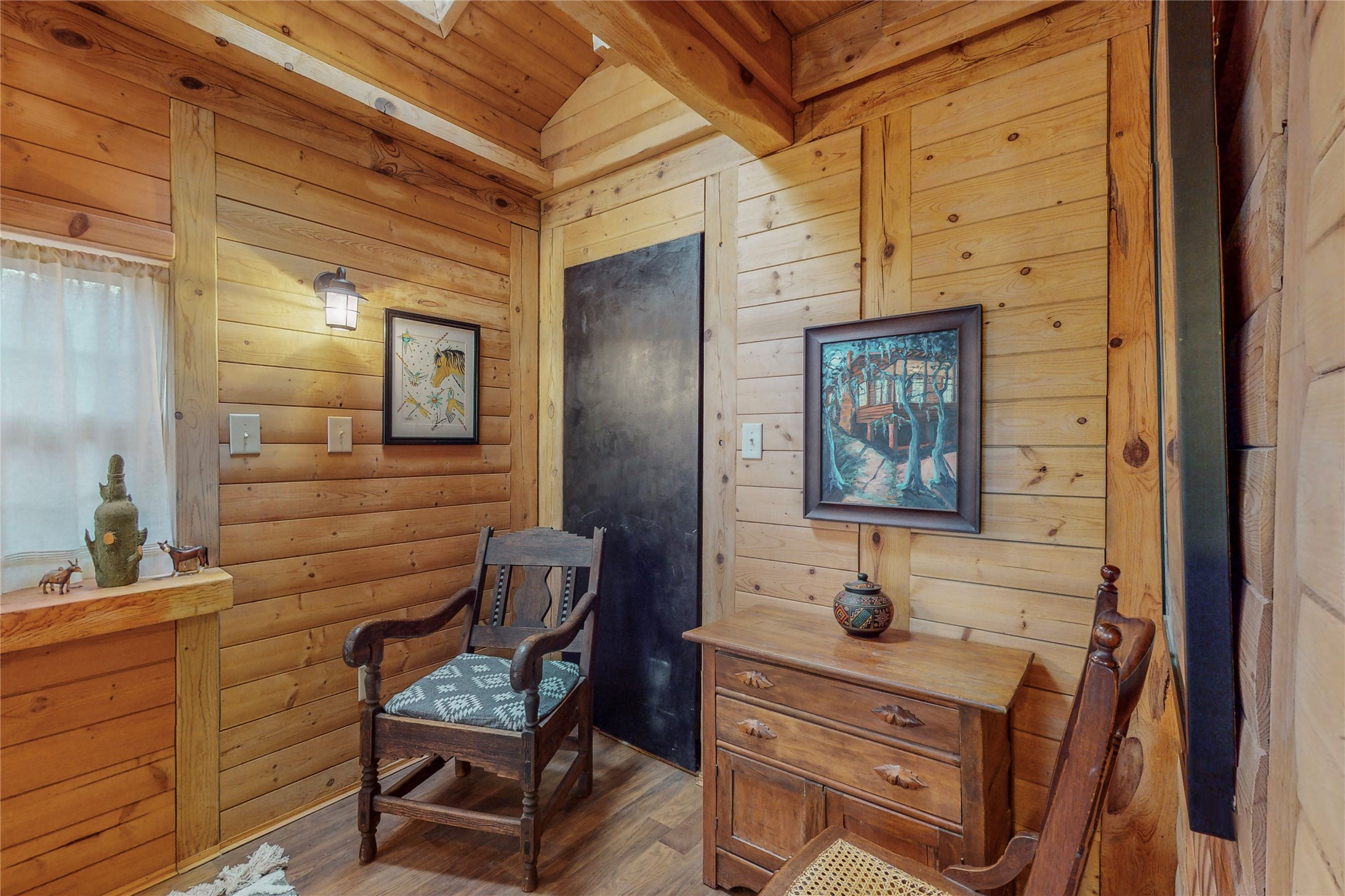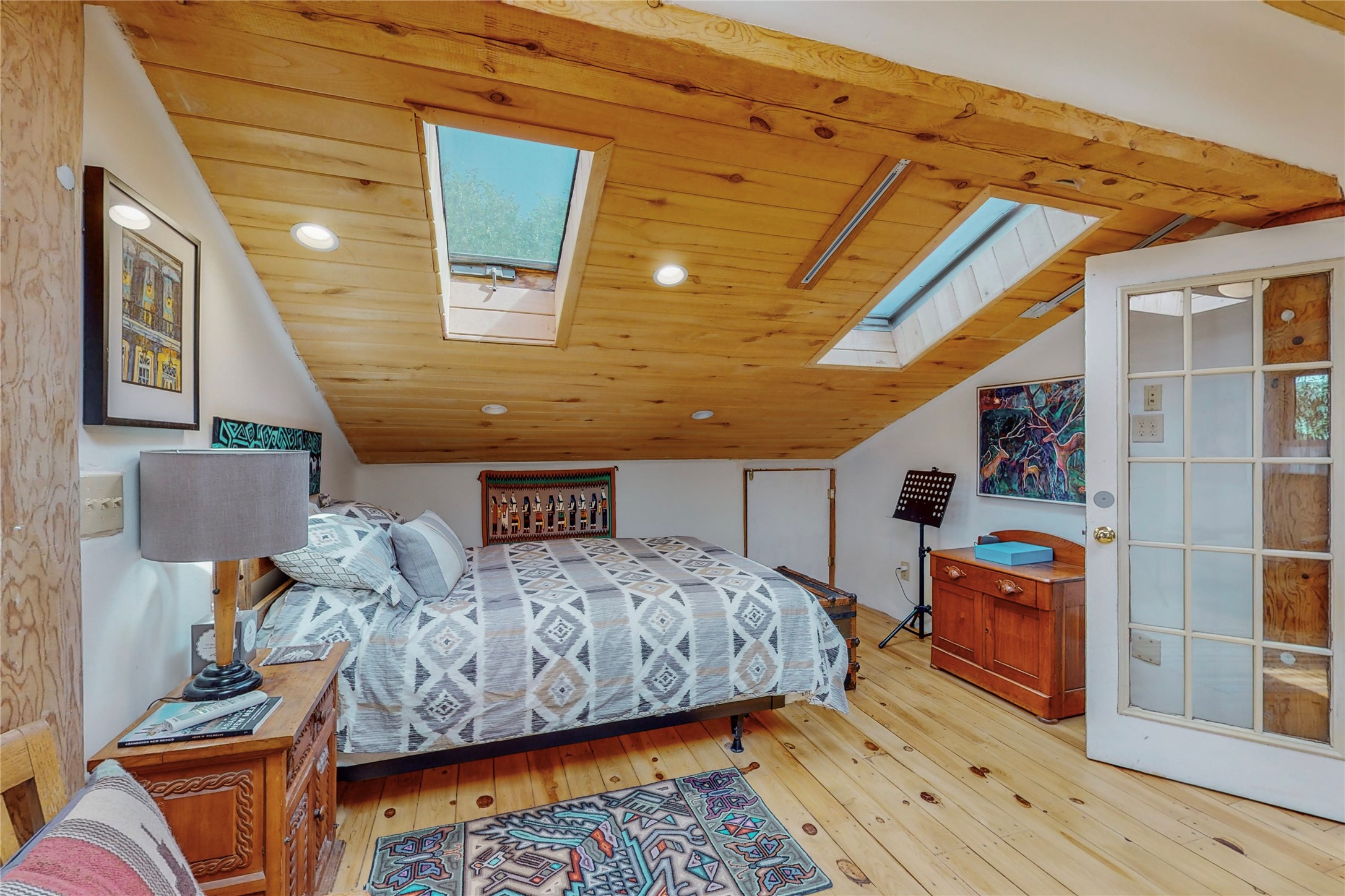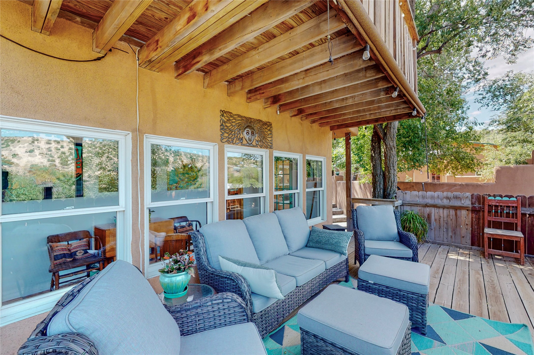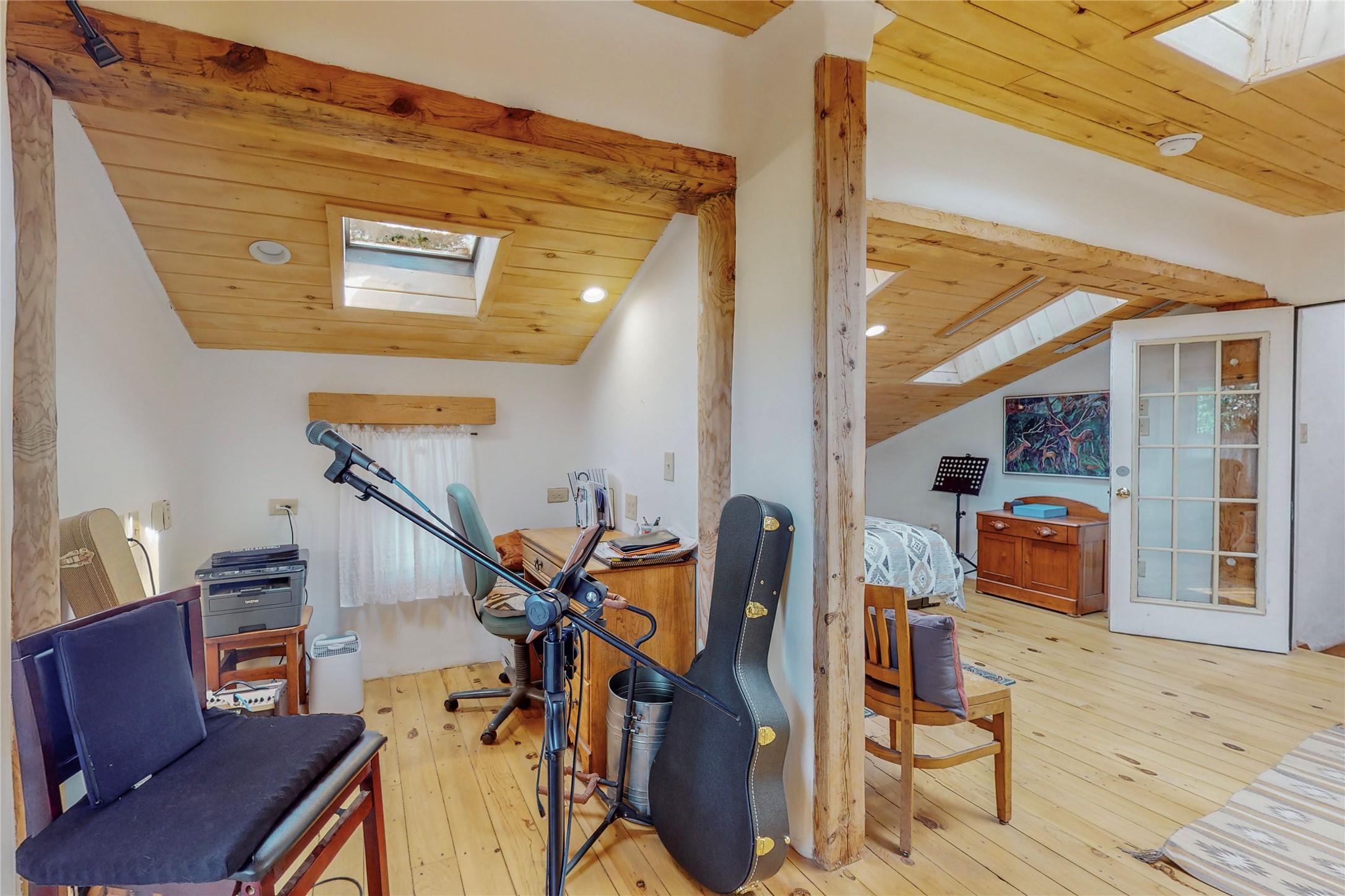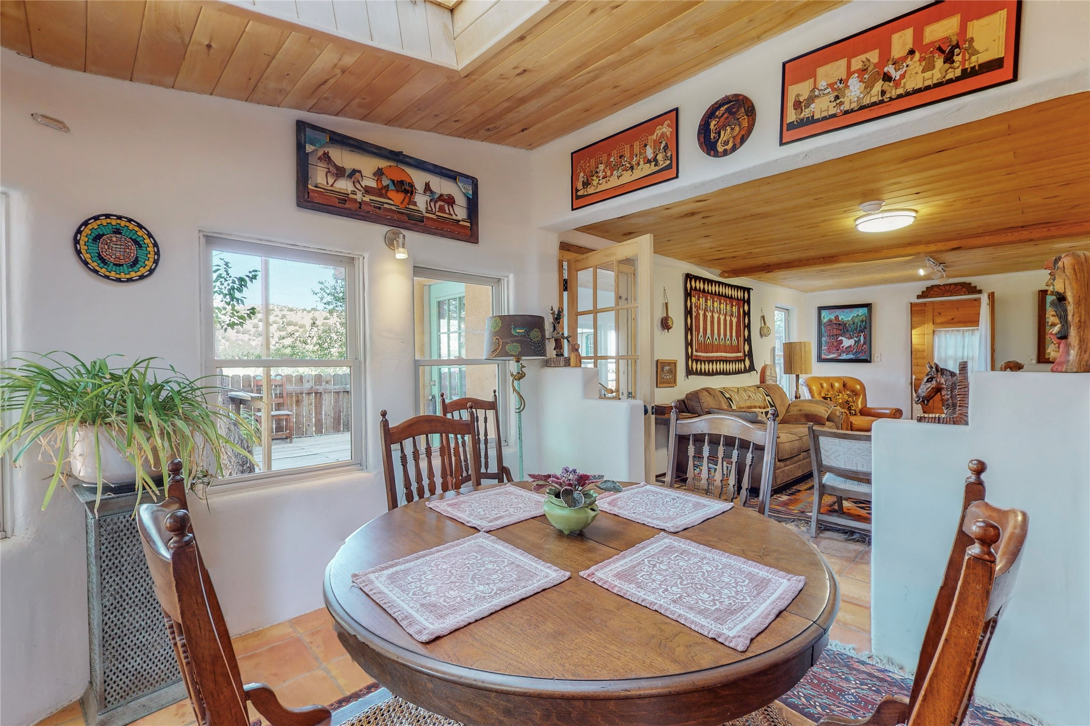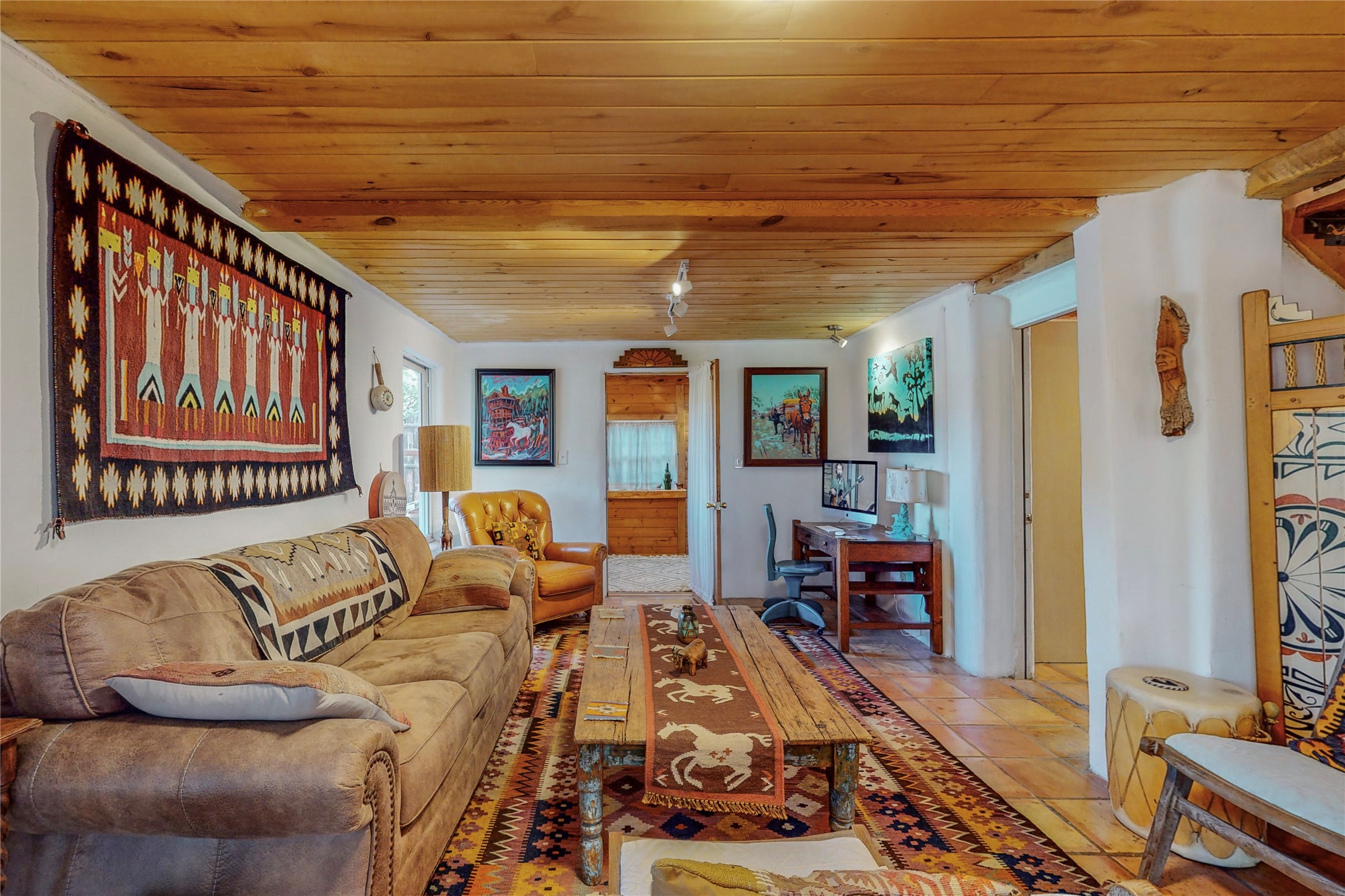 What an incredible find! This beautiful Madrid home is an artist's dream, offering both residential and commercial potential on two side by side lots. The charming home sits up high, right on the Turquoise Trail. The large deck out front offers great entertainment potential with wonderful views and lots of privacy. This home offers an open floorplan, including a large kitchen, a bedroom and office downstairs, and a large master suite with a walk in closet upstairs. There is plenty of natural light, as well as a whole home water filtration system, including reverse osmosis under the kitchen sink. The large side yard is tastefully landscaped and has a small outbuilding, perfect for an artist studio or gallery. Access and offstreet parking is available off of Ice House Rd.
