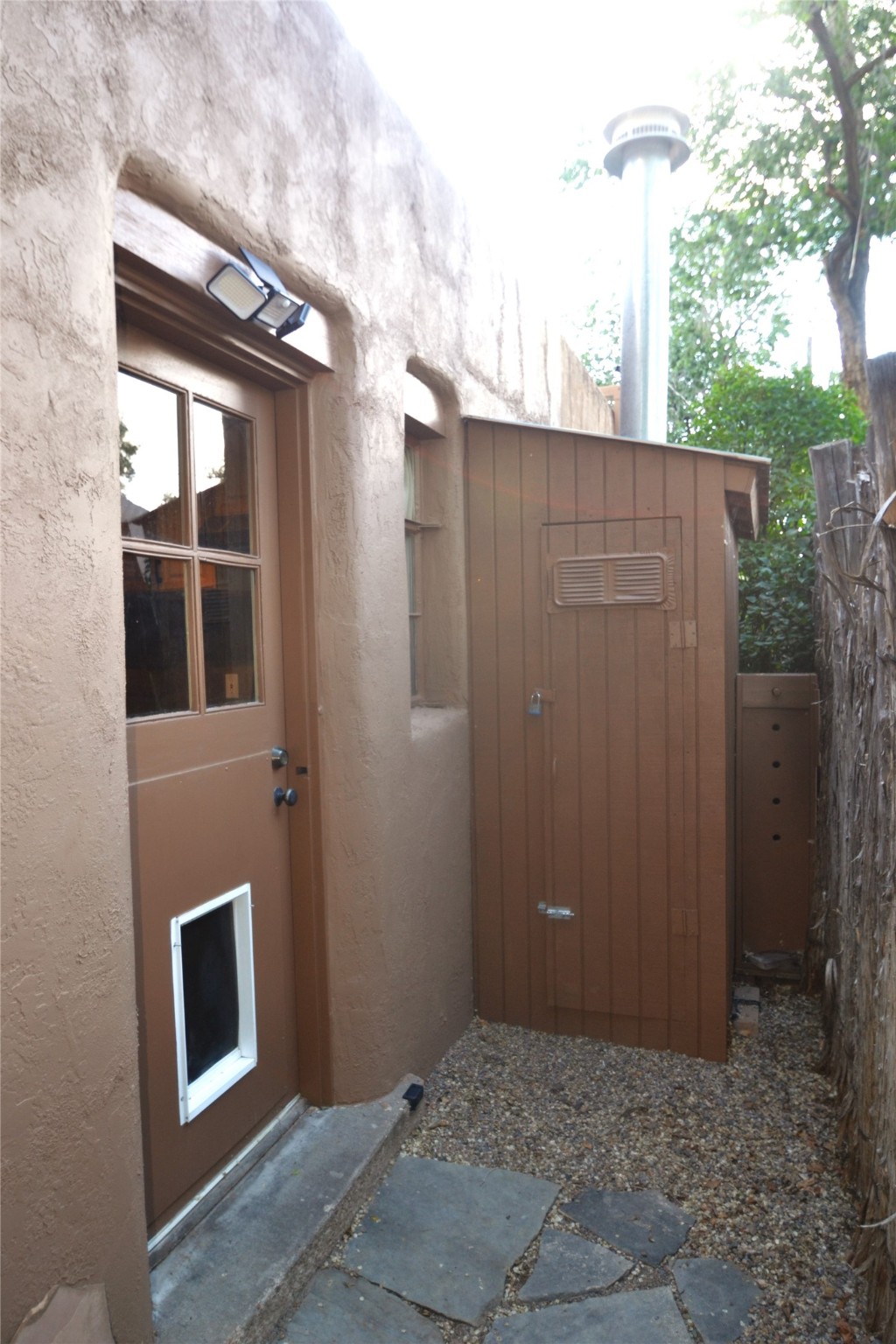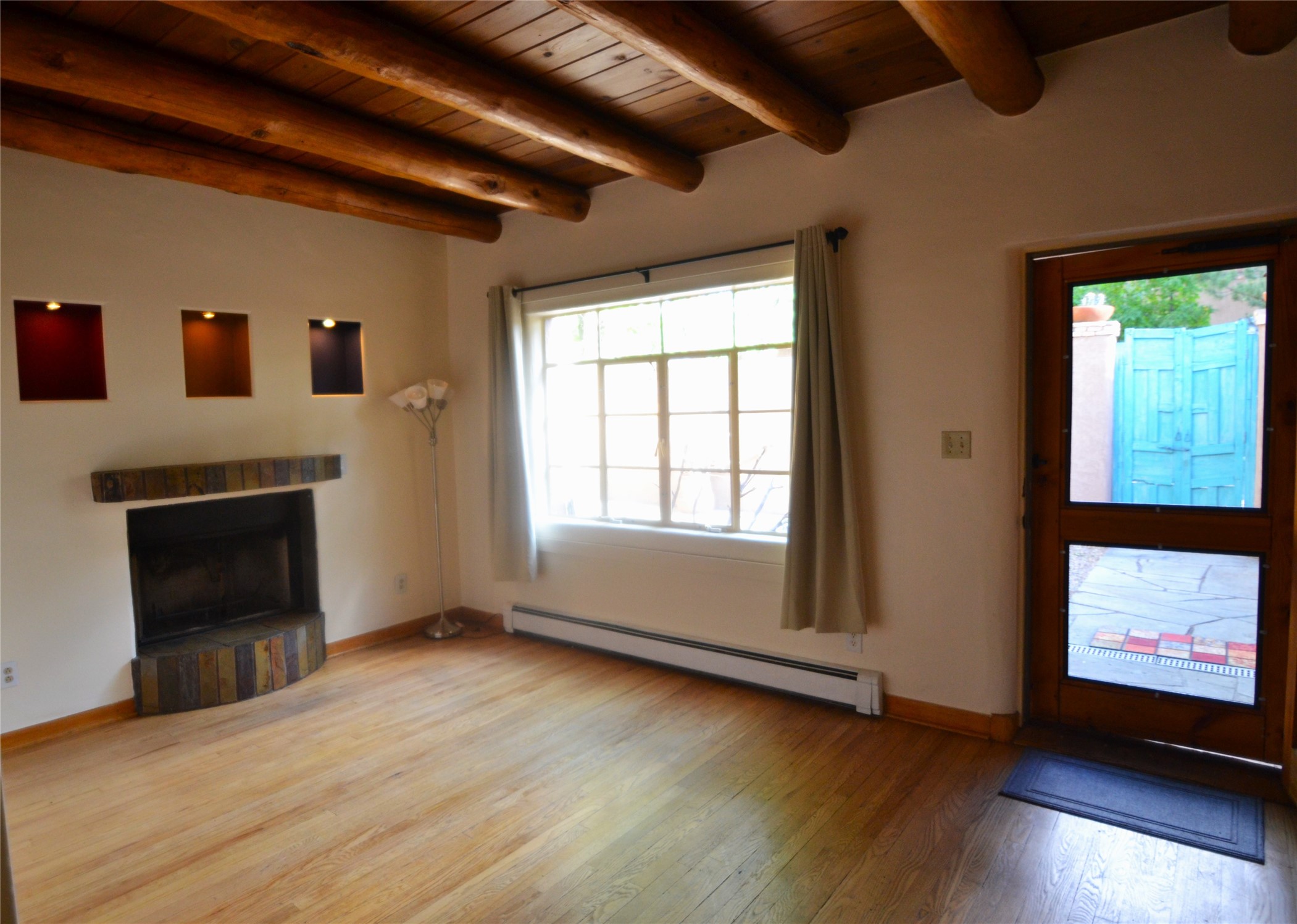 Listed $5K below appraisal on 10-6-23, Walk-to-the Plaza South Capital one bed/one bath single level 473 sqf condo, .013 acres in 14-unit quiet professional compound. Walled private courtyard ideal for entertaining and expanded living space. Single space reserved off-street parking. Santa Fe charm with vigas throughout. Wood burning fireplace complements 2 zoned, hot water baseboard heating. New stainless steel gas range, and refrigerator. Stackable washer and dryer. Hardwood floors with tile in kitchen and full bath accessible from hallway with jetted tub. Water meter shared with 4 units (averages $25/mo), gas and electric on separate meters. Exterior boiler and hot water heater; single shared wall. Outside storage closet and crawl space. The low $76.45/mo HOA fee covers ground maintenance, insurance, and the compounds private outdoor furnished pergola. Wood Gormley School District. Subject to Historical Society guidelines. No short-term rental. Move in ready! Platinum Care Select Home Warranty policy provided by seller