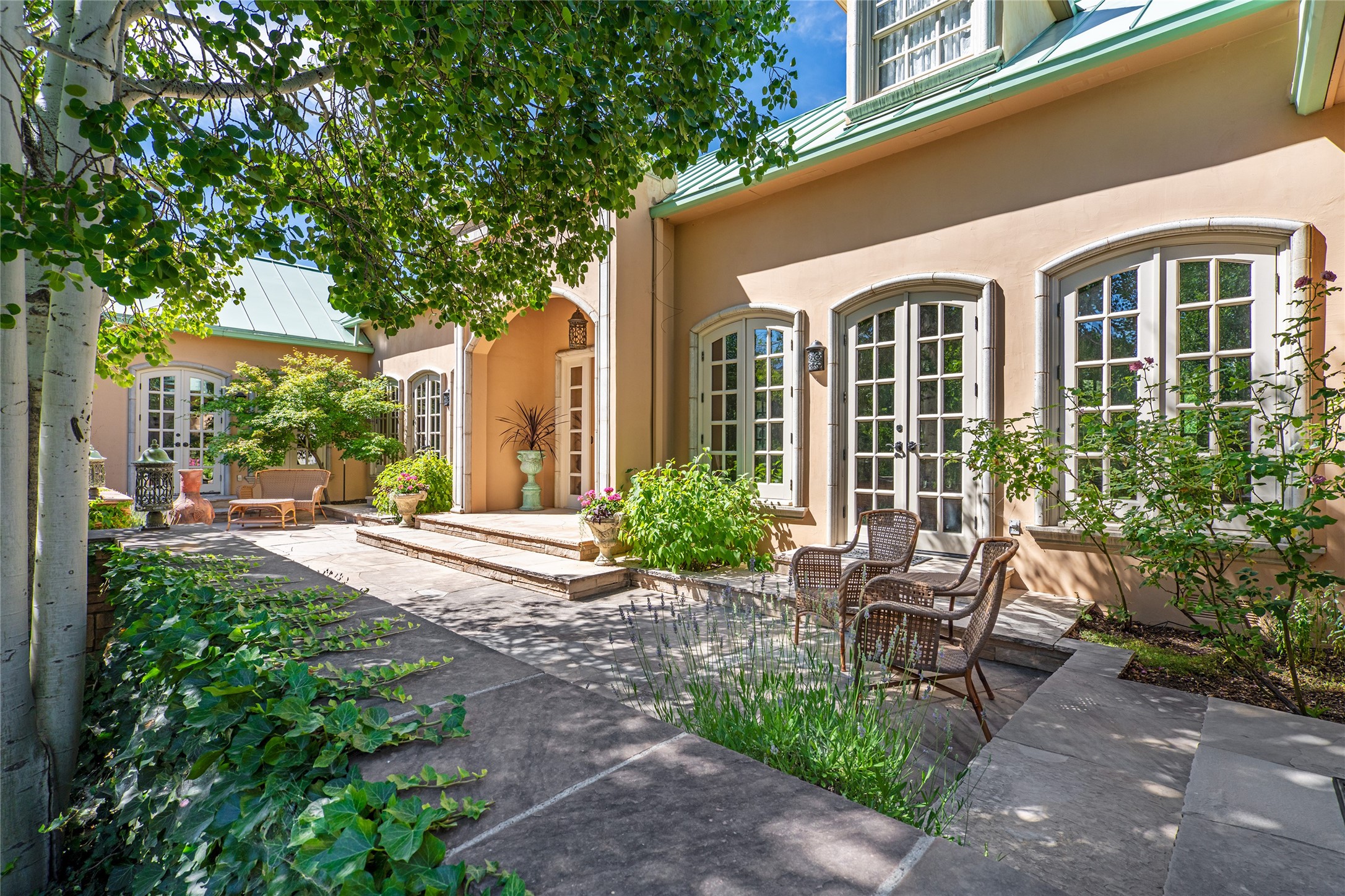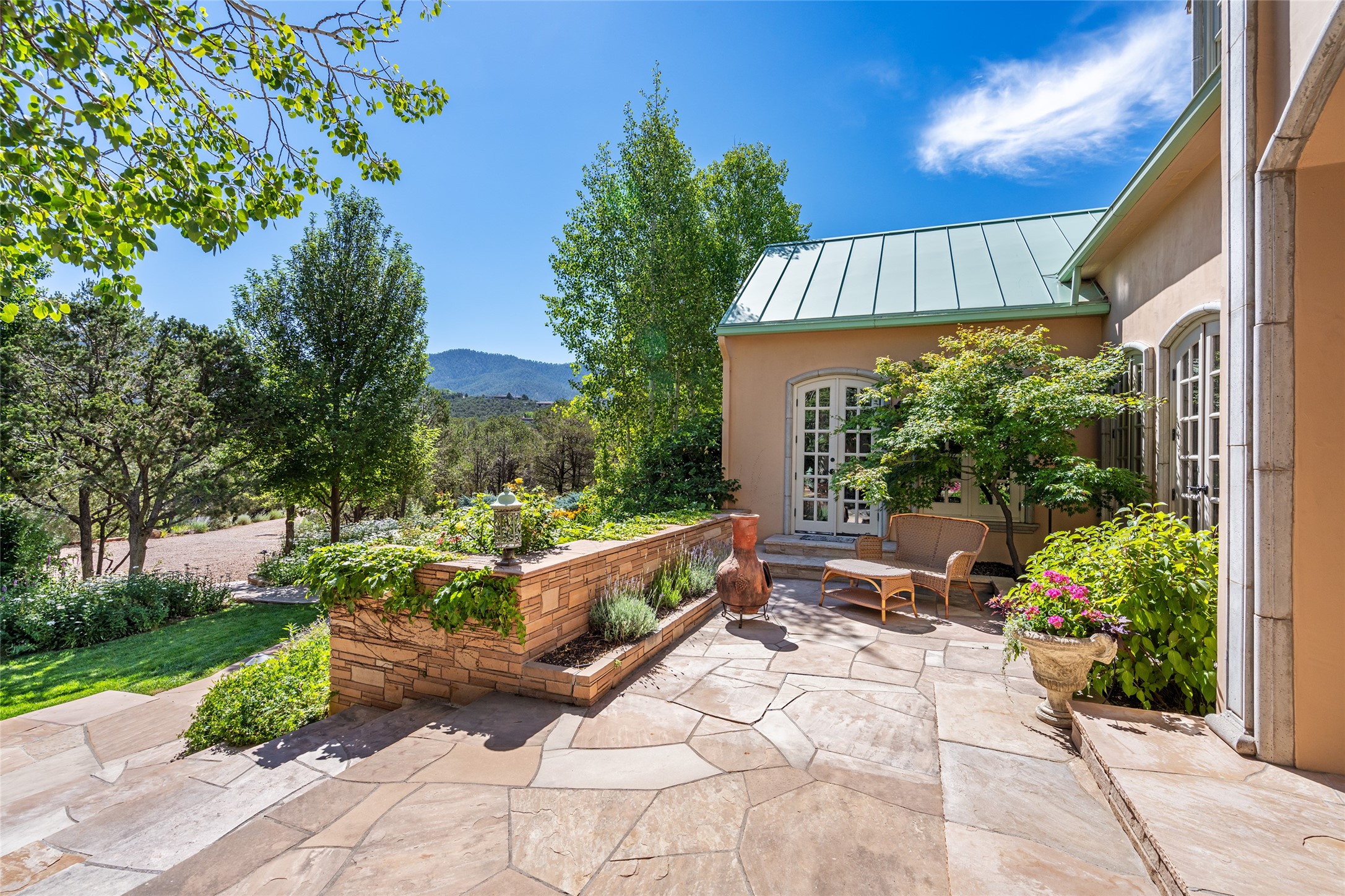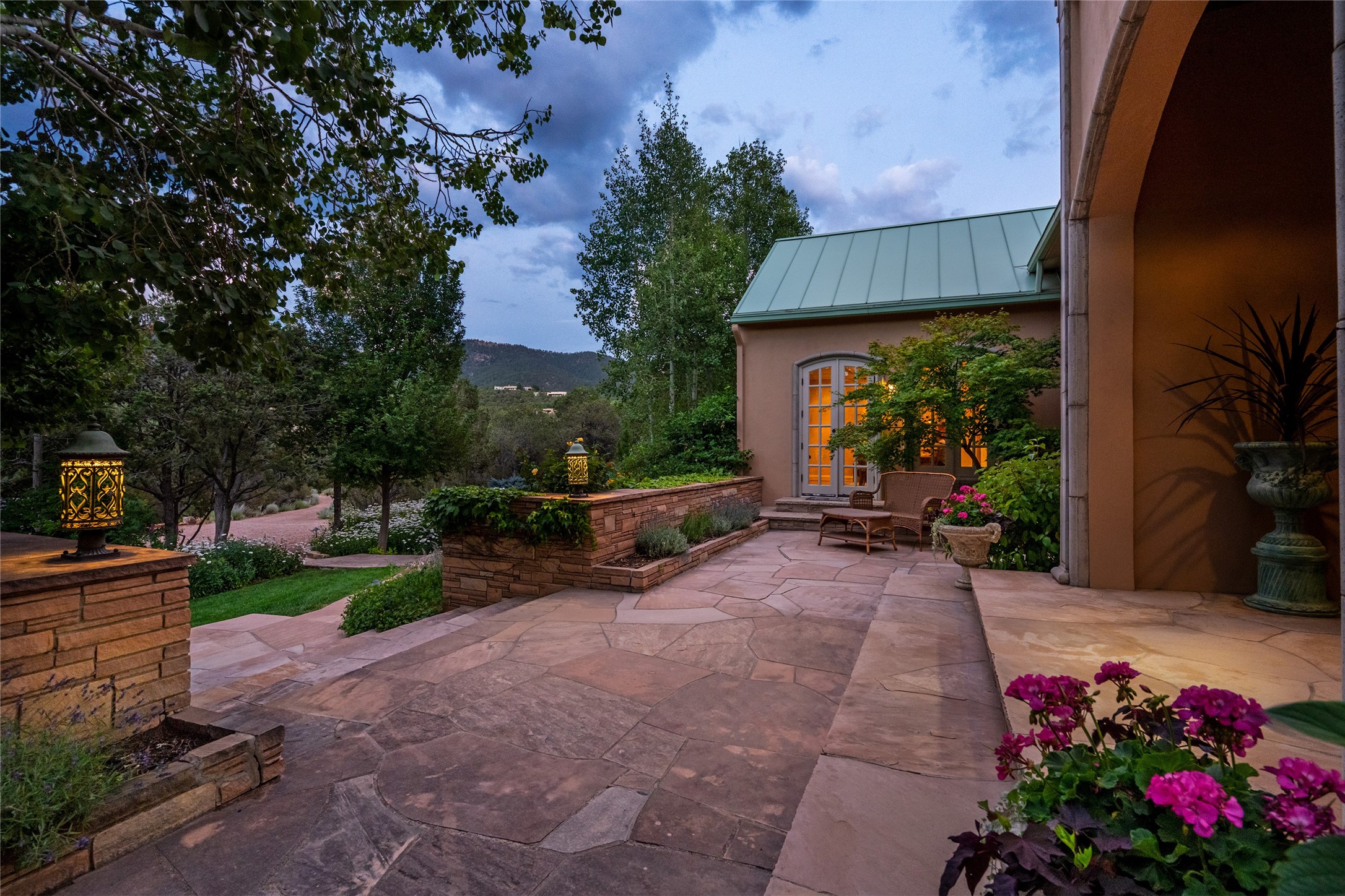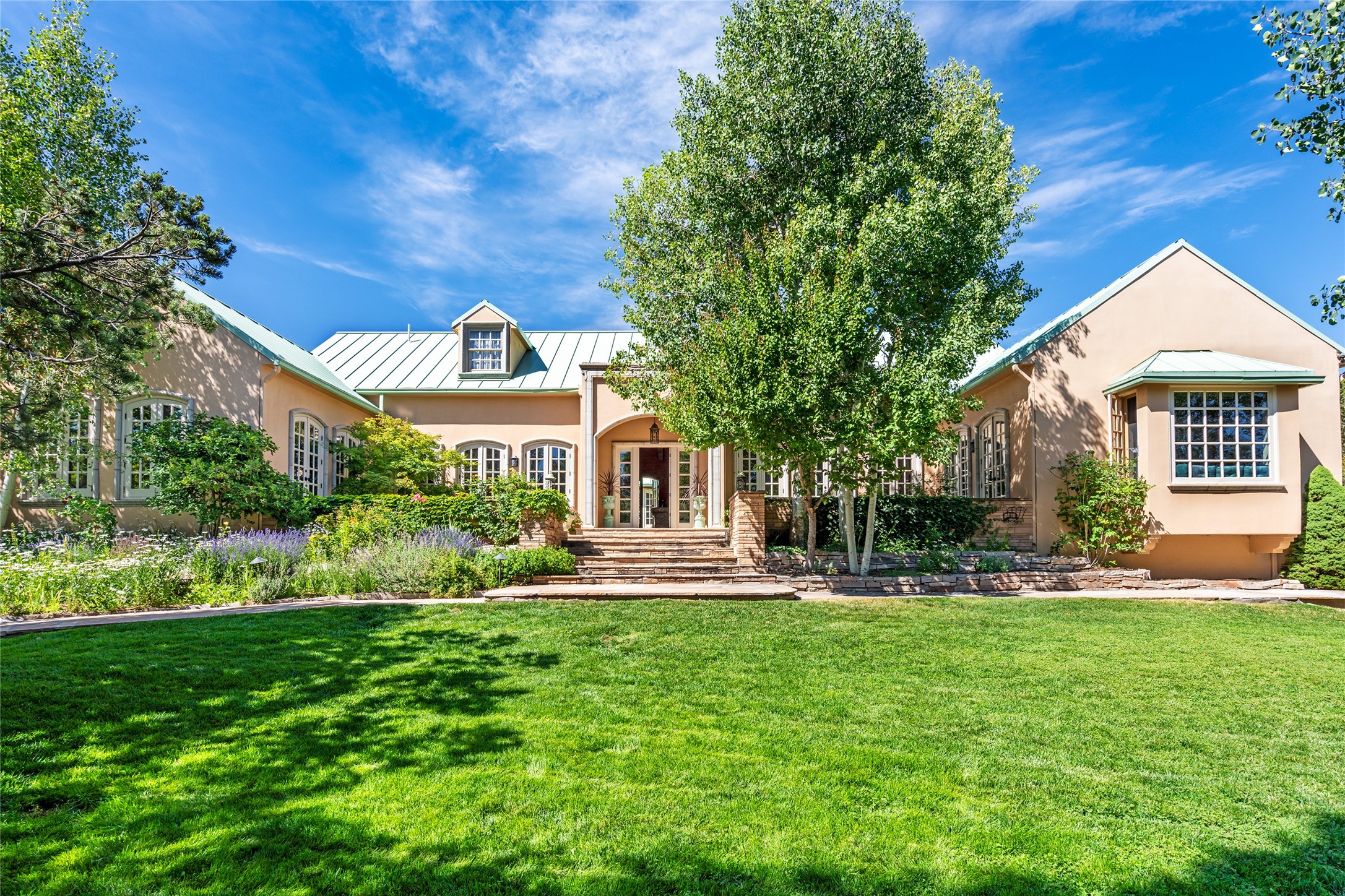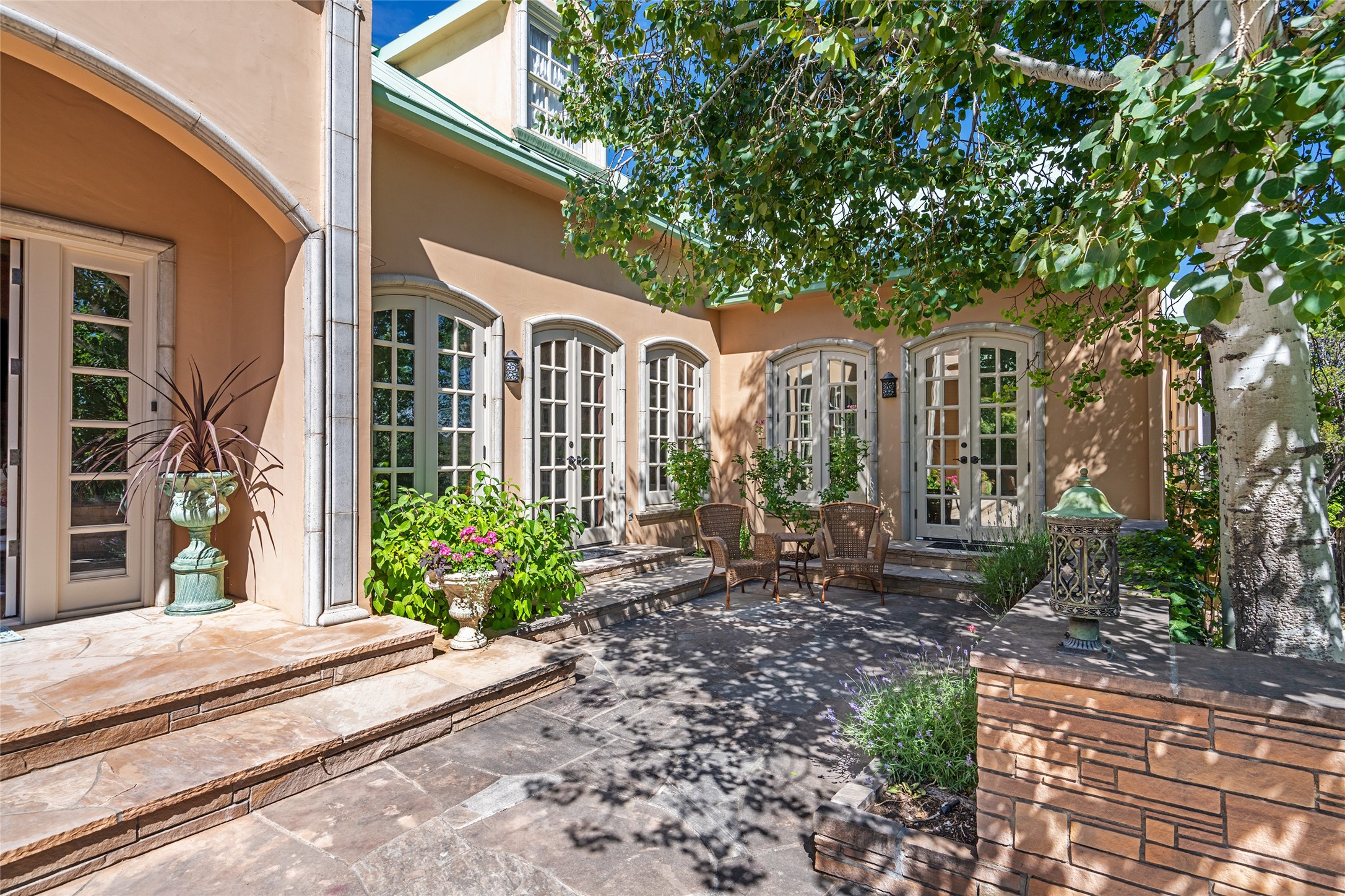 Elegant gated Eastside estate, situated on just over 1.8 acres of mature lush gardens, with a main house and separate guest house over the 3-car garage. European style features include extensive use of stone, hand-troweled pigmented plaster walls, hand-made tiles, custom stenciling, beamed ceilings, custom windows and hardware, hardwood hickory floors, and grand fireplaces. The gracious living room is enhanced by French doors and windows, and is located directly across the private central courtyard from the family room. An inviting formal dining room is the perfect place to share a lovely meal. Informal dining is available in the breakfast room just off the spacious well-equipped kitchen. The luxurious primary suite offers a sitting room or office with a large fireplace, two well-appointed custom-designed walk-in closets, and a spa-inspired bath with separate soaking tub and tiled steam shower. Two guest rooms, each with outdoor access, are set apart down a private hallway. The al fresco dining area, with fantastic mountain views, connects the primary residence with the garage spaces and guest house. The guest house provides the flexibility for a private home office. Captivating grounds with flagstone pathways, terraces and multiple courtyards are irrigated by the private well, which also serves the residences. The property is enveloped by views of the Sangre de Cristo Mountains and foothills. Close to recreation and schools; less than a mile from Canyon Road.