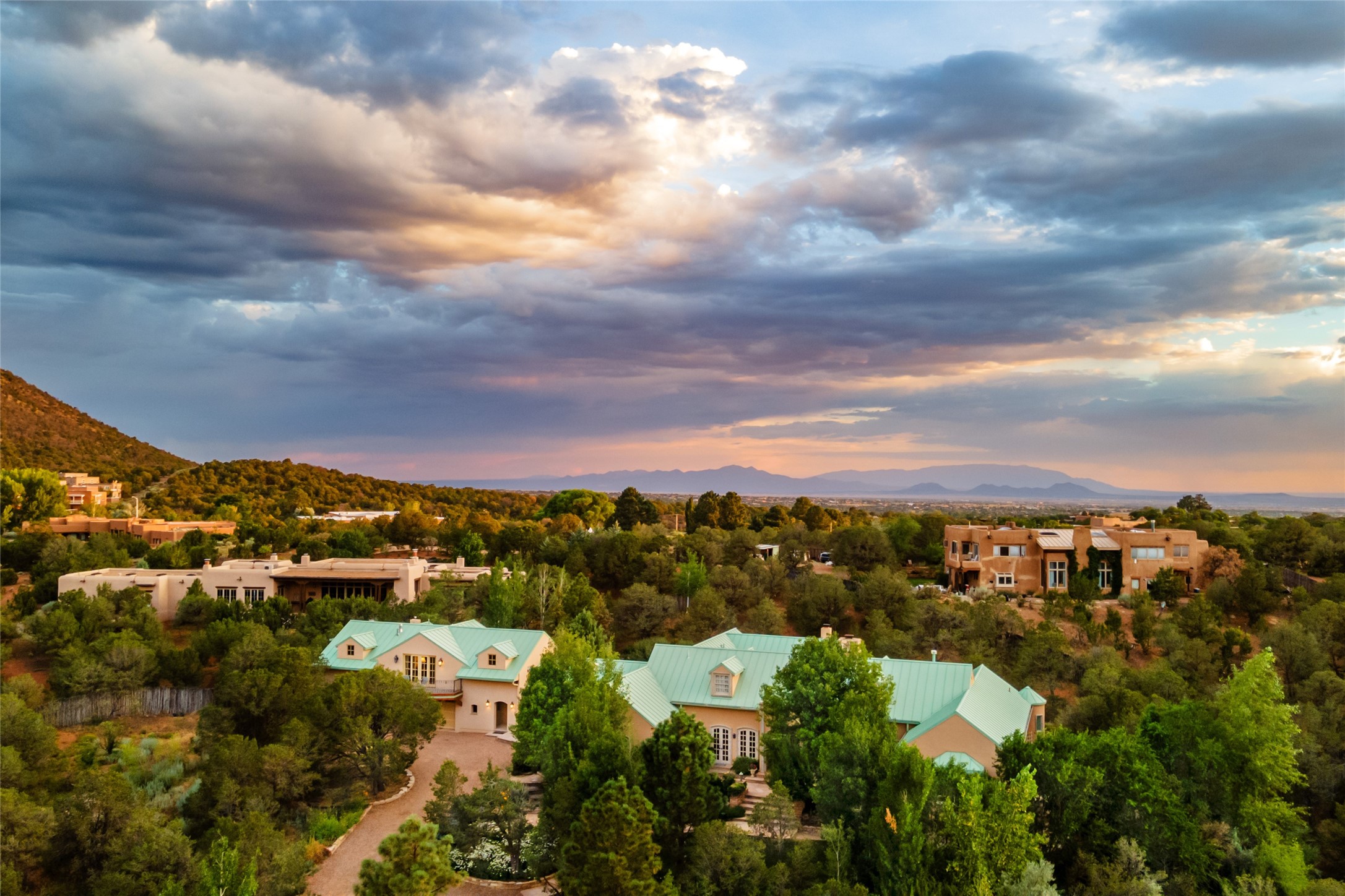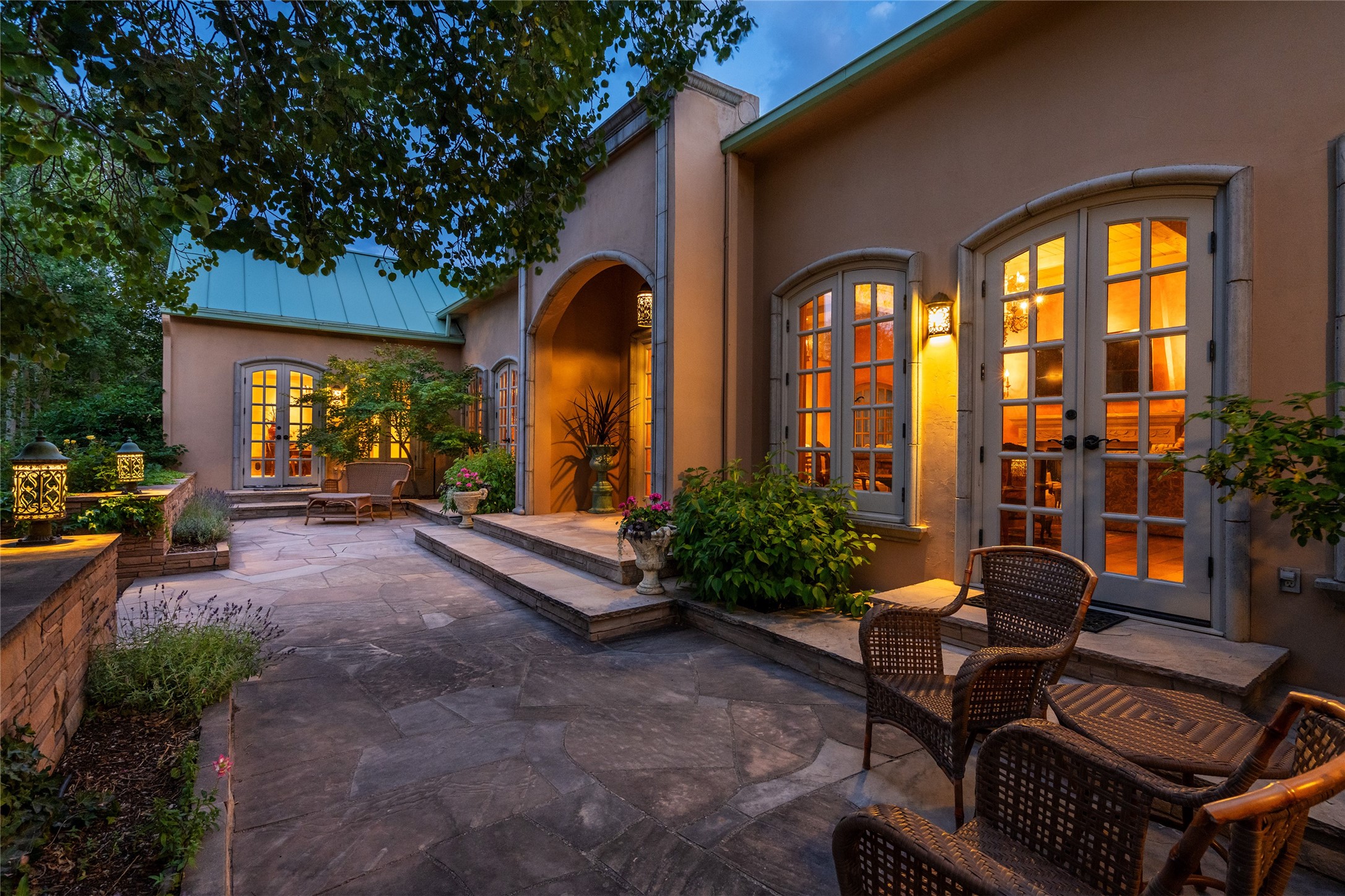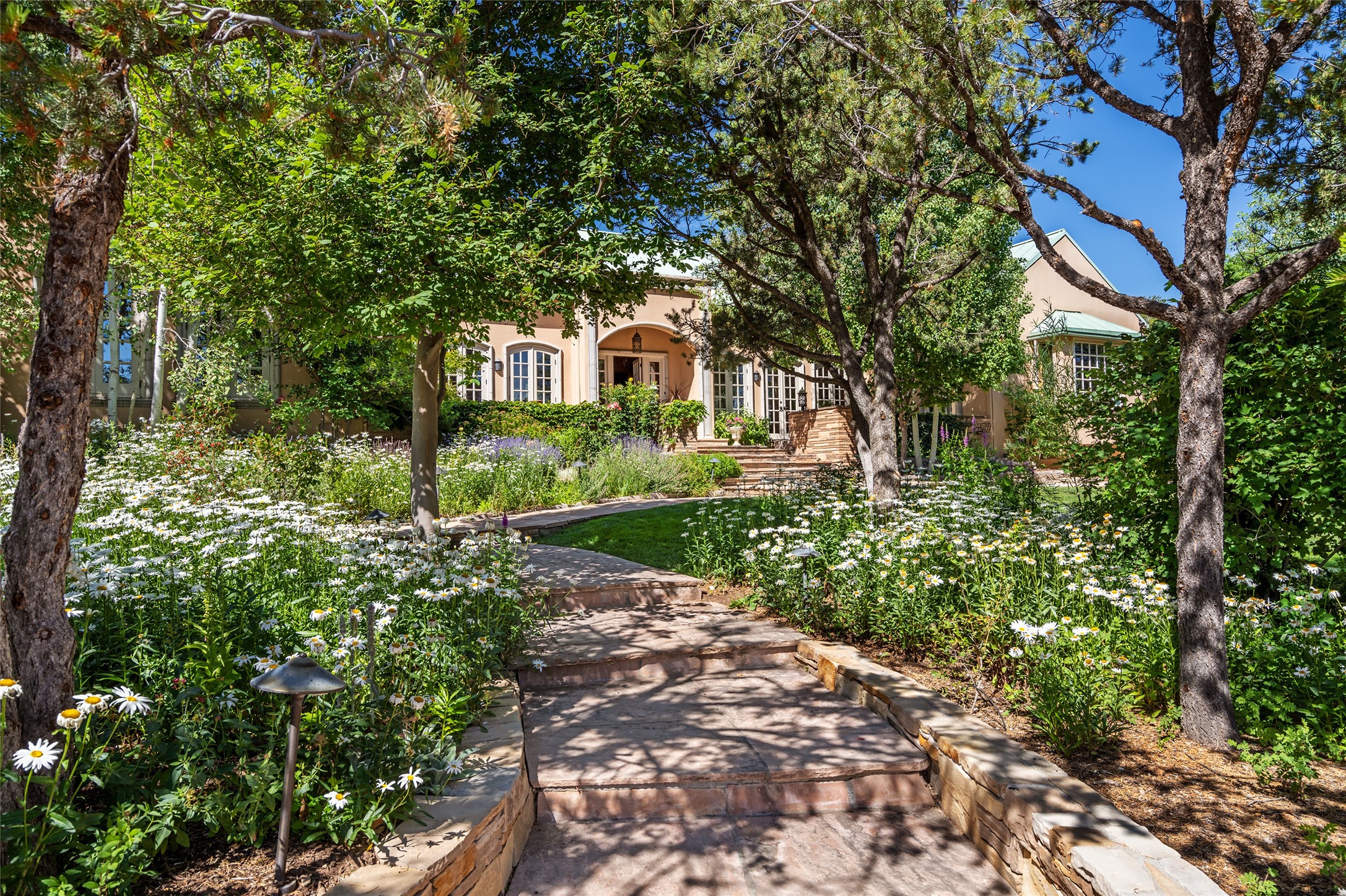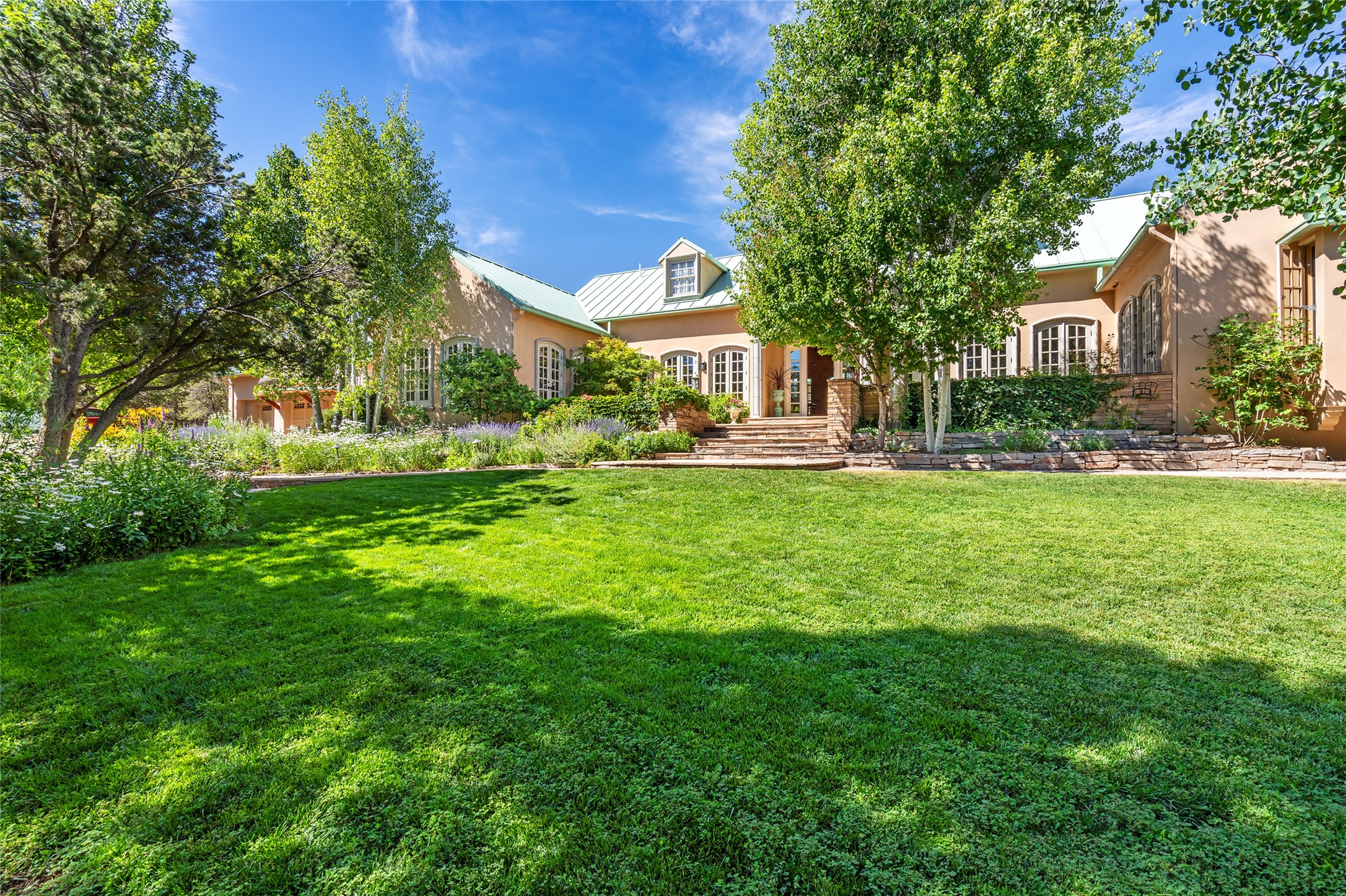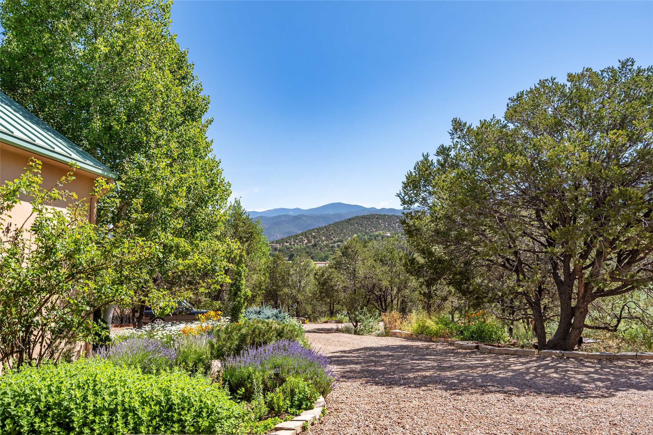 Elegant gated Eastside estate, situated on just over 1.8 acres of mature lush gardens, with a main house and separate guest house over the 3-car garage. European style features include extensive use of stone, hand-troweled pigmented plaster walls, hand-made tiles, custom stenciling, beamed ceilings, custom windows and hardware, hardwood hickory floors, and grand fireplaces. The gracious living room is enhanced by French doors and windows, and is located directly across the private central courtyard from the family room. An inviting formal dining room is the perfect place to share a lovely meal. Informal dining is available in the breakfast room just off the spacious well-equipped kitchen. The luxurious primary suite offers a sitting room or office with a large fireplace, two well-appointed custom-designed walk-in closets, and a spa-inspired bath with separate soaking tub and tiled steam shower. Two guest rooms, each with outdoor access, are set apart down a private hallway. The al fresco dining area, with fantastic mountain views, connects the primary residence with the garage spaces and guest house. The guest house provides the flexibility for a private home office. Captivating grounds with flagstone pathways, terraces and multiple courtyards are irrigated by the private well, which also serves the residences. The property is enveloped by views of the Sangre de Cristo Mountains and foothills. Close to recreation and schools; less than a mile from Canyon Road.