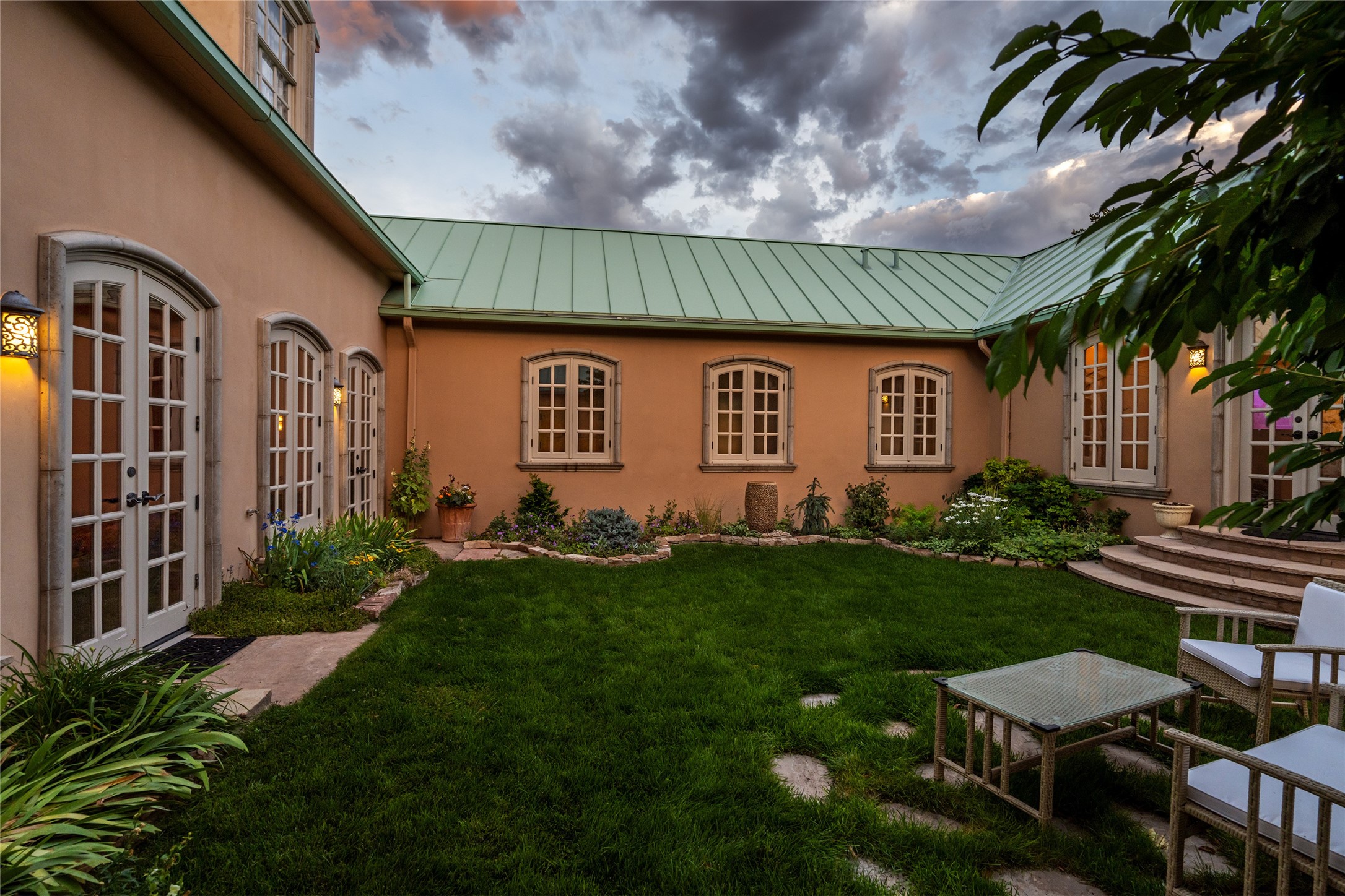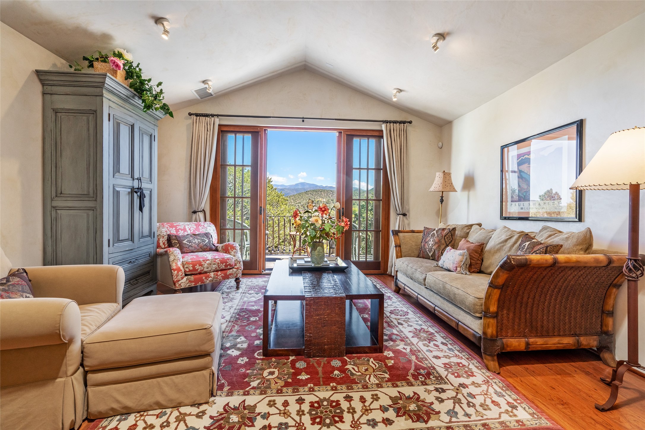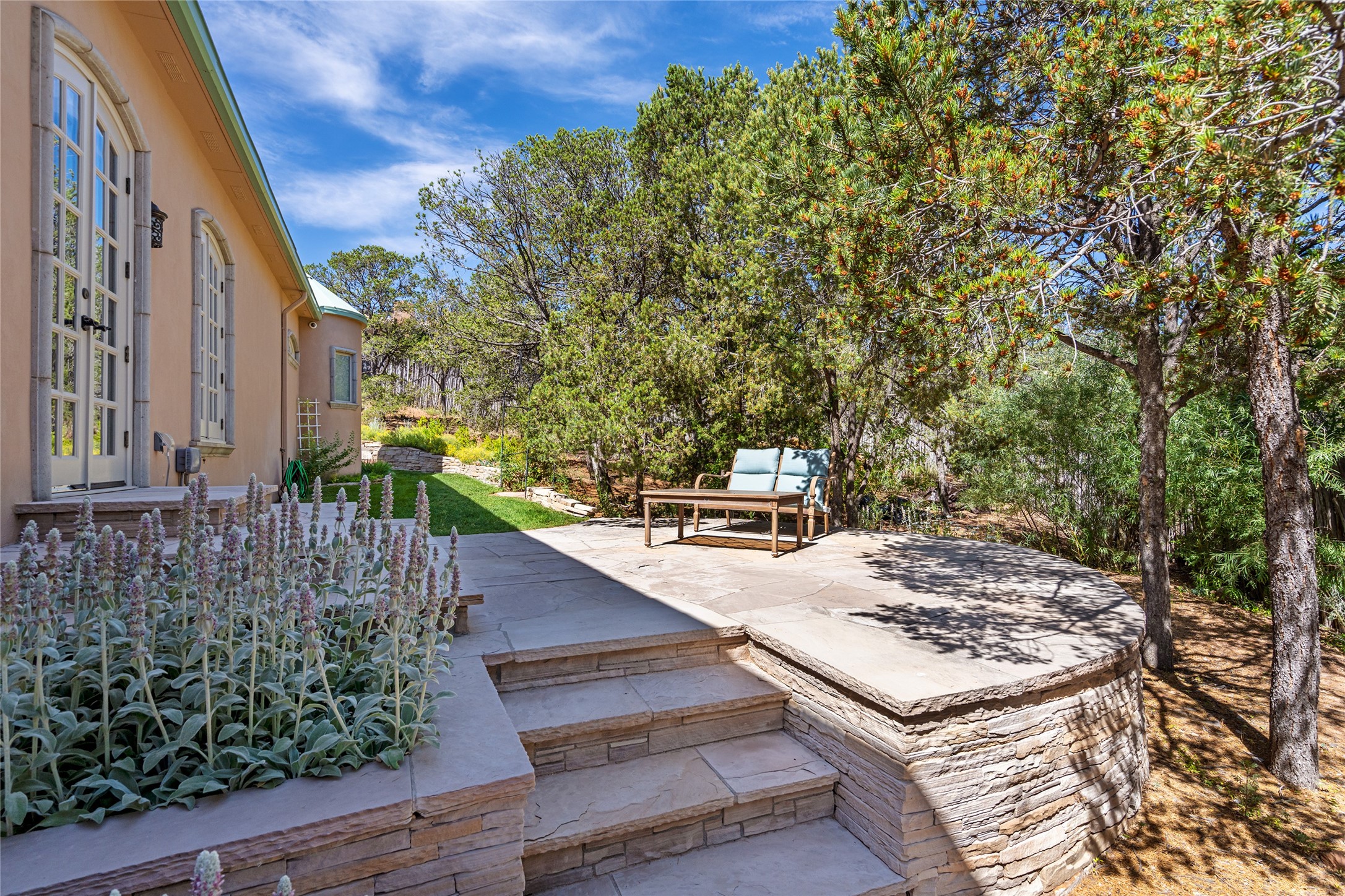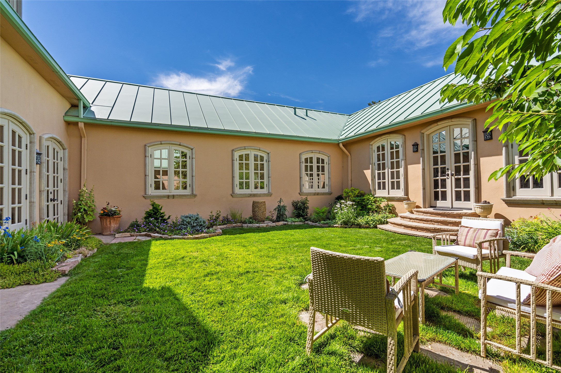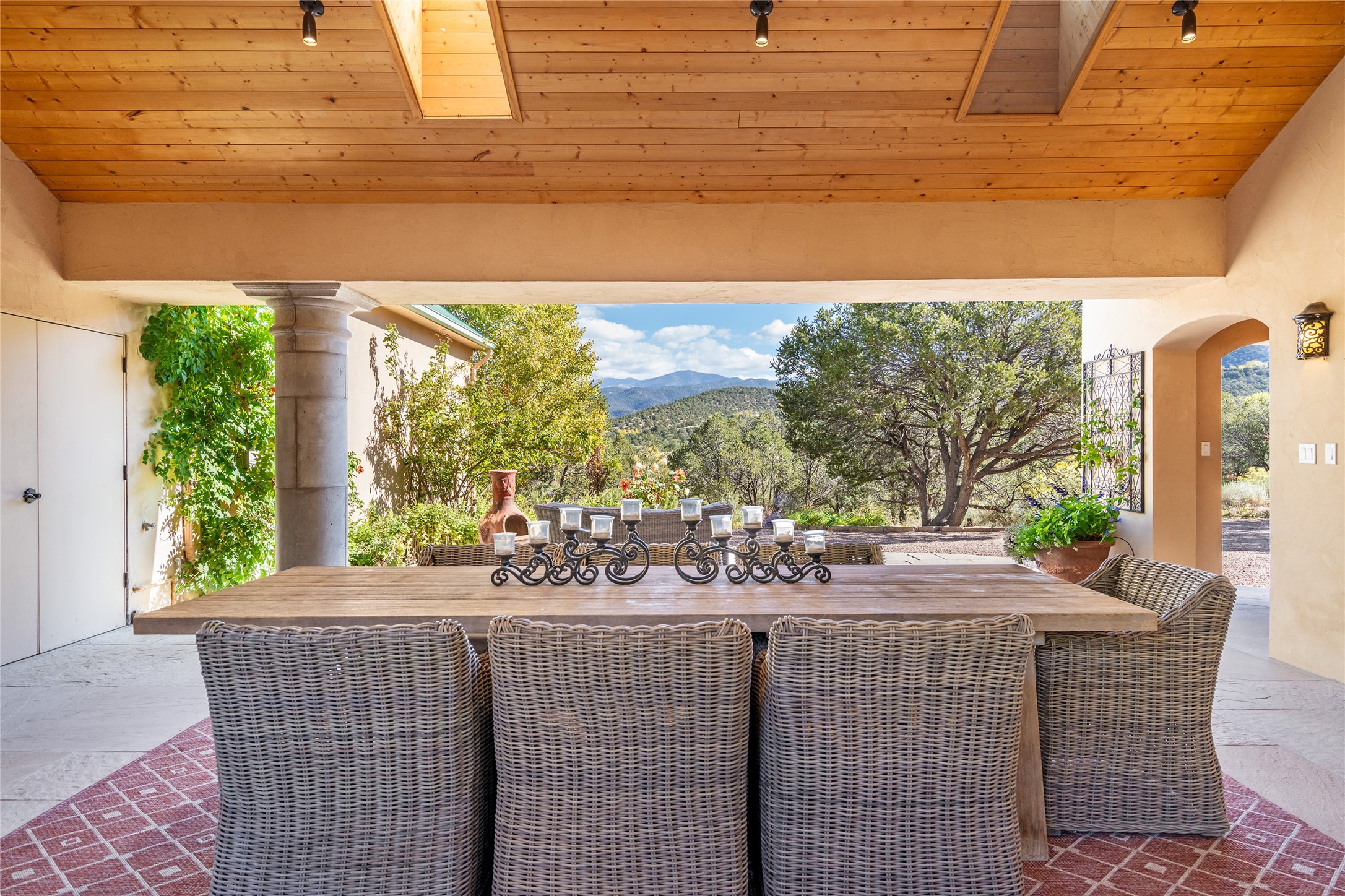 Elegant gated Eastside estate, situated on just over 1.8 acres of mature lush gardens, with a main house and separate guest house over the 3-car garage. European style features include extensive use of stone, hand-troweled pigmented plaster walls, hand-made tiles, custom stenciling, beamed ceilings, custom windows and hardware, hardwood hickory floors, and grand fireplaces. The gracious living room is enhanced by French doors and windows, and is located directly across the private central courtyard from the family room. An inviting formal dining room is the perfect place to share a lovely meal. Informal dining is available in the breakfast room just off the spacious well-equipped kitchen. The luxurious primary suite offers a sitting room or office with a large fireplace, two well-appointed custom-designed walk-in closets, and a spa-inspired bath with separate soaking tub and tiled steam shower. Two guest rooms, each with outdoor access, are set apart down a private hallway. The al fresco dining area, with fantastic mountain views, connects the primary residence with the garage spaces and guest house. The guest house provides the flexibility for a private home office. Captivating grounds with flagstone pathways, terraces and multiple courtyards are irrigated by the private well, which also serves the residences. The property is enveloped by views of the Sangre de Cristo Mountains and foothills. Close to recreation and schools; less than a mile from Canyon Road.