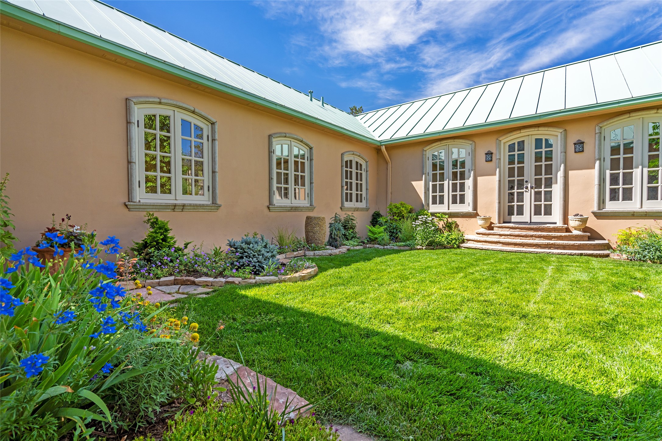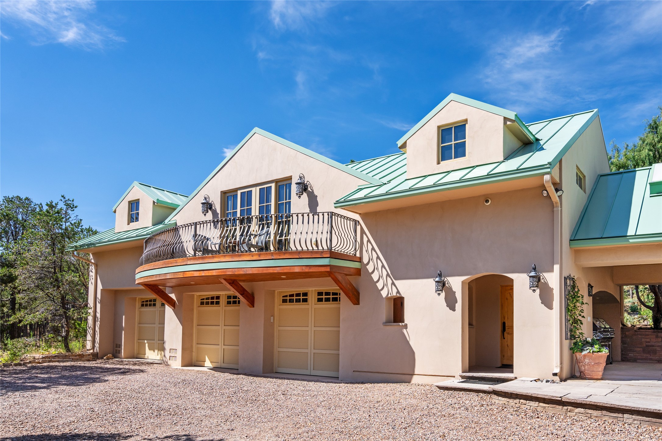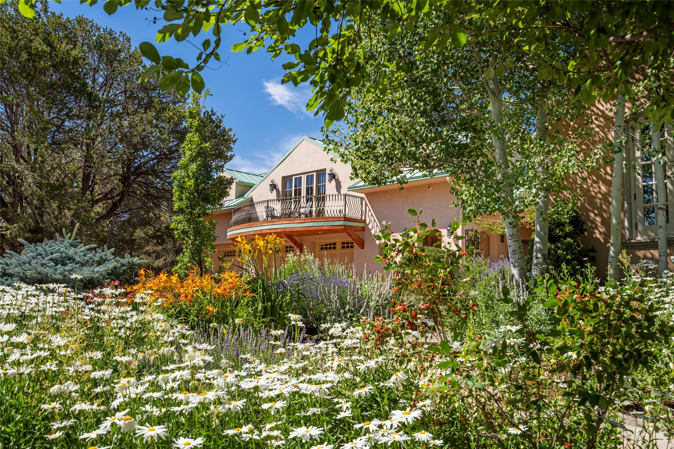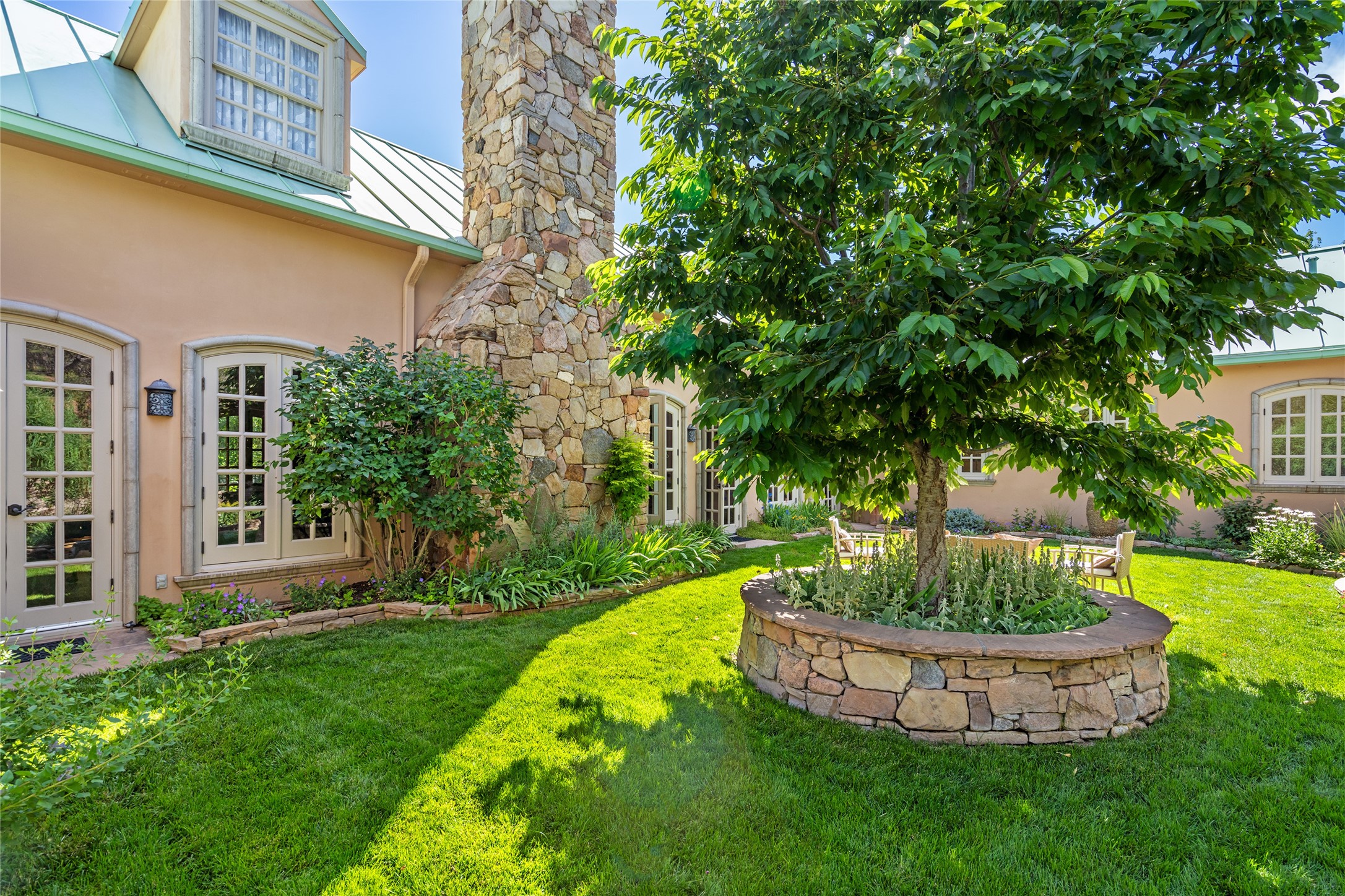 Elegant gated Eastside estate, situated on just over 1.8 acres of mature lush gardens, with a main house and separate guest house over the 3-car garage. European style features include extensive use of stone, hand-troweled pigmented plaster walls, hand-made tiles, custom stenciling, beamed ceilings, custom windows and hardware, hardwood hickory floors, and grand fireplaces. The gracious living room is enhanced by French doors and windows, and is located directly across the private central courtyard from the family room. An inviting formal dining room is the perfect place to share a lovely meal. Informal dining is available in the breakfast room just off the spacious well-equipped kitchen. The luxurious primary suite offers a sitting room or office with a large fireplace, two well-appointed custom-designed walk-in closets, and a spa-inspired bath with separate soaking tub and tiled steam shower. Two guest rooms, each with outdoor access, are set apart down a private hallway. The al fresco dining area, with fantastic mountain views, connects the primary residence with the garage spaces and guest house. The guest house provides the flexibility for a private home office. Captivating grounds with flagstone pathways, terraces and multiple courtyards are irrigated by the private well, which also serves the residences. The property is enveloped by views of the Sangre de Cristo Mountains and foothills. Close to recreation and schools; less than a mile from Canyon Road.