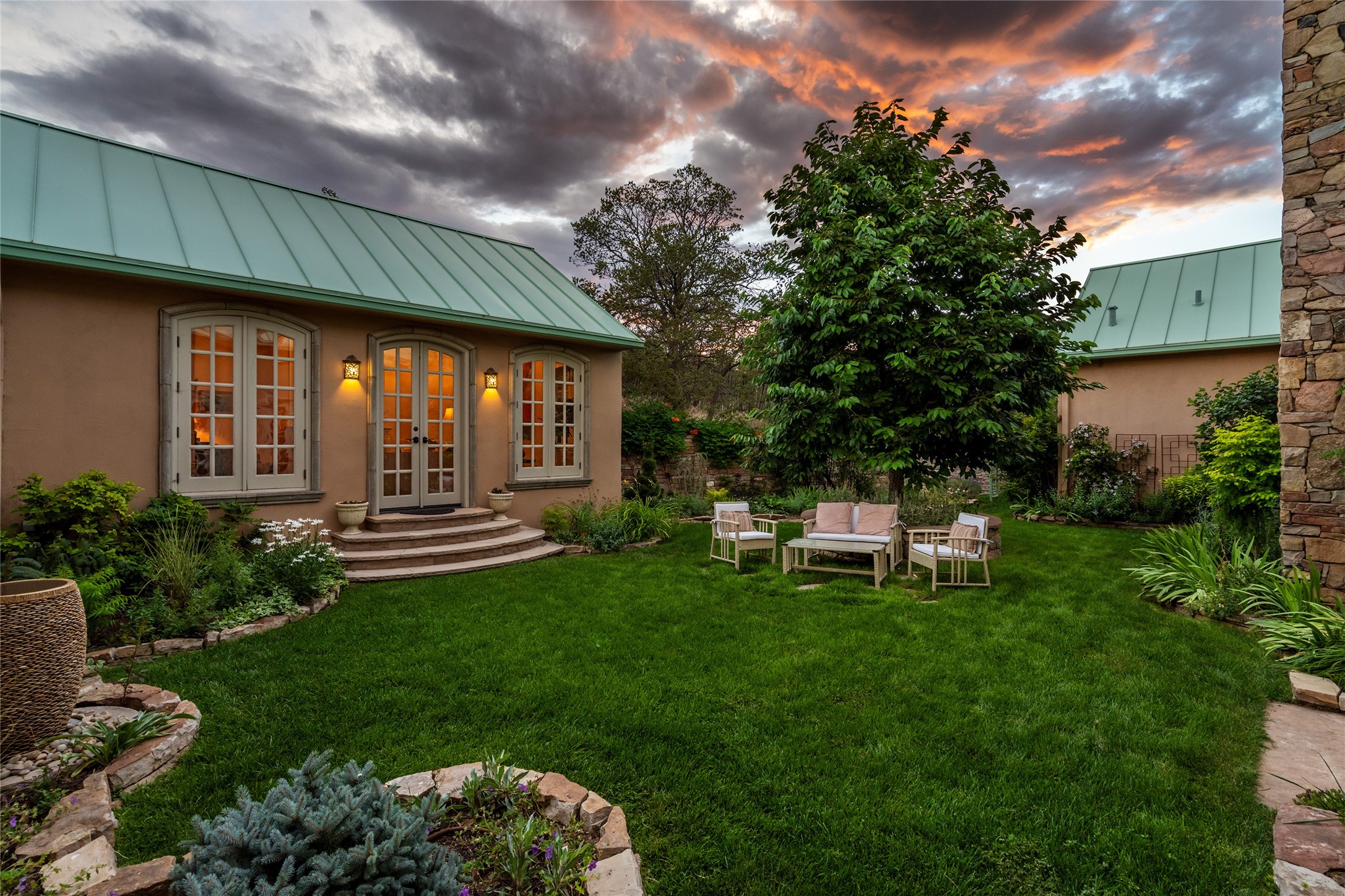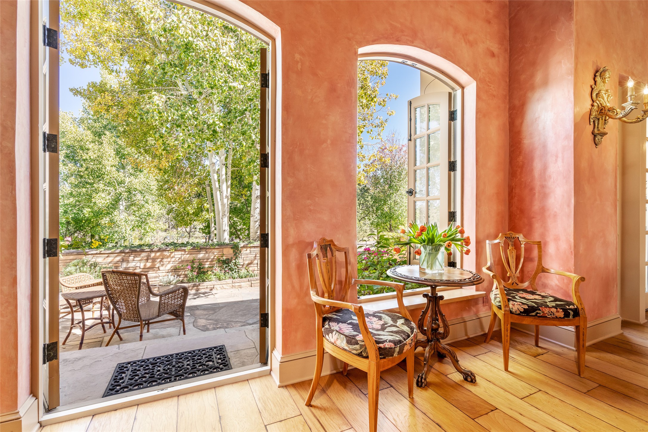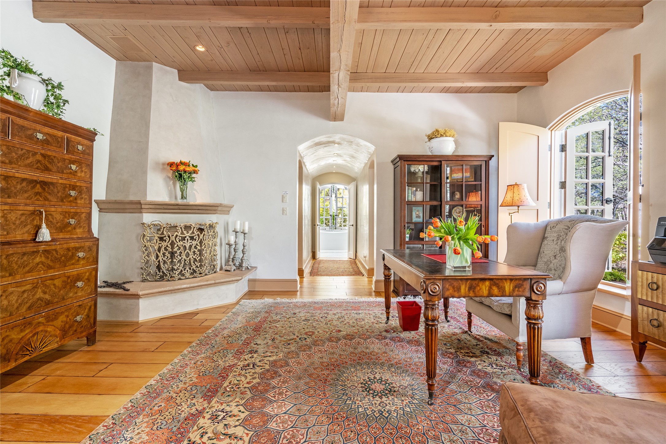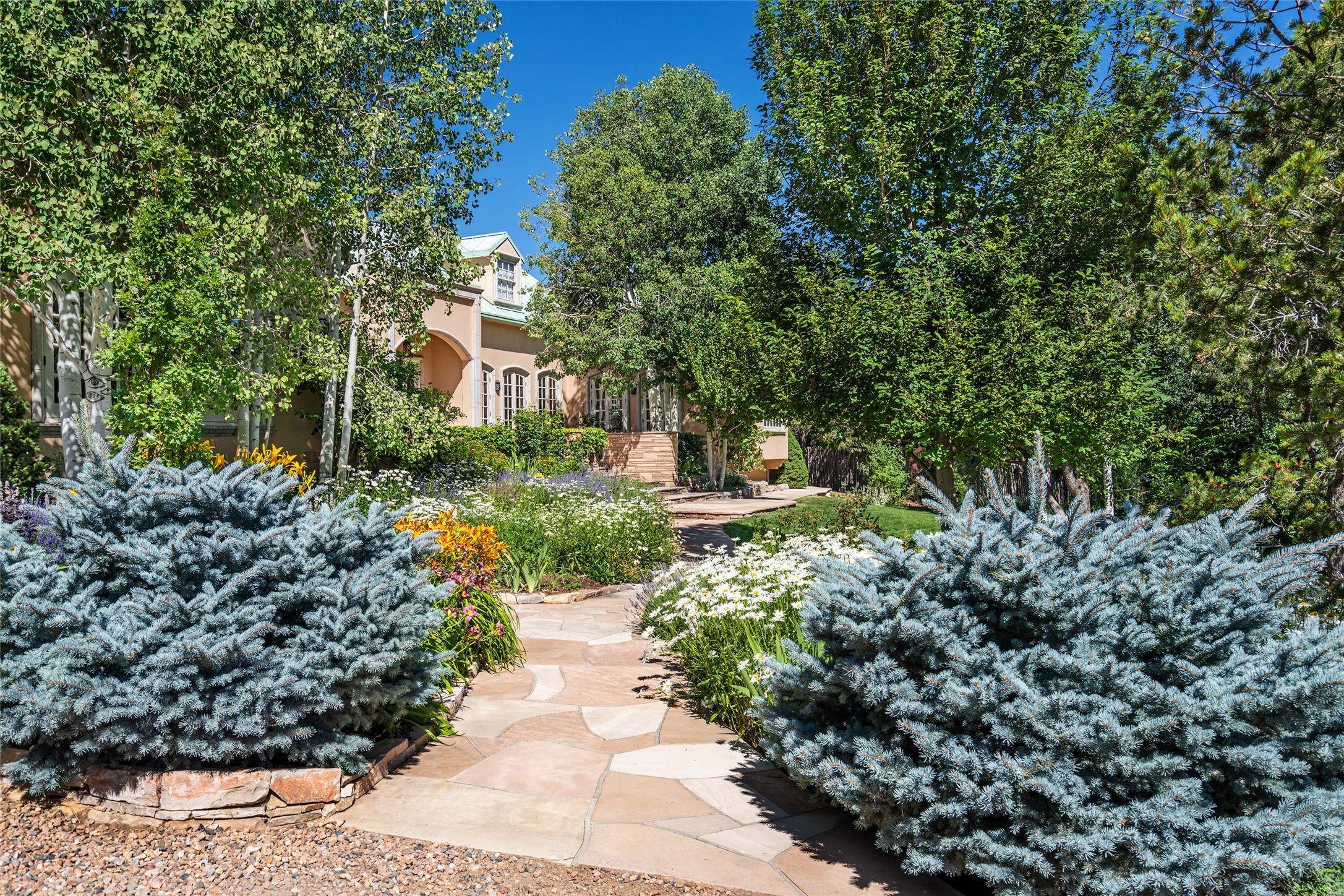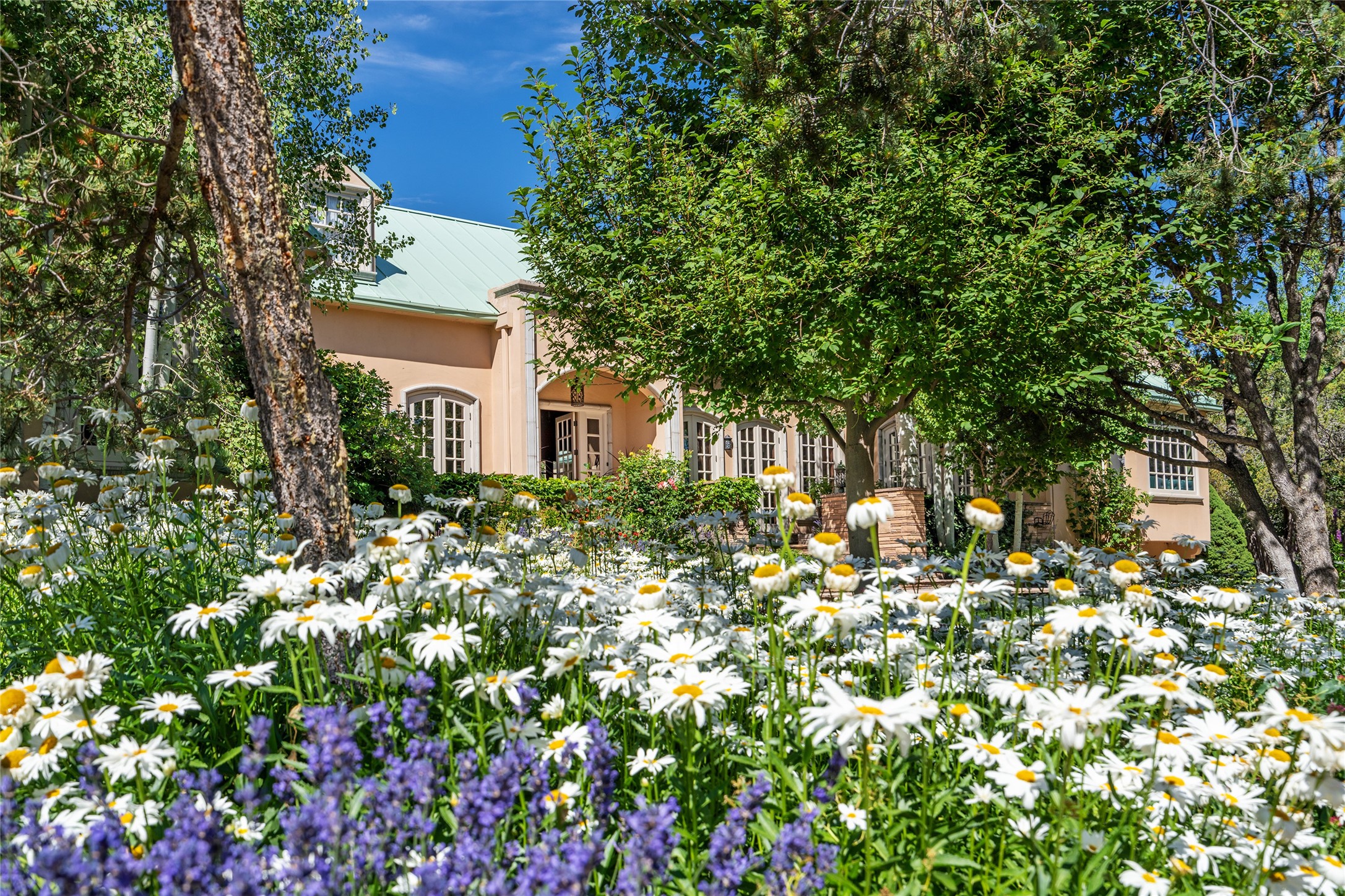 Elegant gated Eastside estate, situated on just over 1.8 acres of mature lush gardens, with a main house and separate guest house over the 3-car garage. European style features include extensive use of stone, hand-troweled pigmented plaster walls, hand-made tiles, custom stenciling, beamed ceilings, custom windows and hardware, hardwood hickory floors, and grand fireplaces. The gracious living room is enhanced by French doors and windows, and is located directly across the private central courtyard from the family room. An inviting formal dining room is the perfect place to share a lovely meal. Informal dining is available in the breakfast room just off the spacious well-equipped kitchen. The luxurious primary suite offers a sitting room or office with a large fireplace, two well-appointed custom-designed walk-in closets, and a spa-inspired bath with separate soaking tub and tiled steam shower. Two guest rooms, each with outdoor access, are set apart down a private hallway. The al fresco dining area, with fantastic mountain views, connects the primary residence with the garage spaces and guest house. The guest house provides the flexibility for a private home office. Captivating grounds with flagstone pathways, terraces and multiple courtyards are irrigated by the private well, which also serves the residences. The property is enveloped by views of the Sangre de Cristo Mountains and foothills. Close to recreation and schools; less than a mile from Canyon Road.