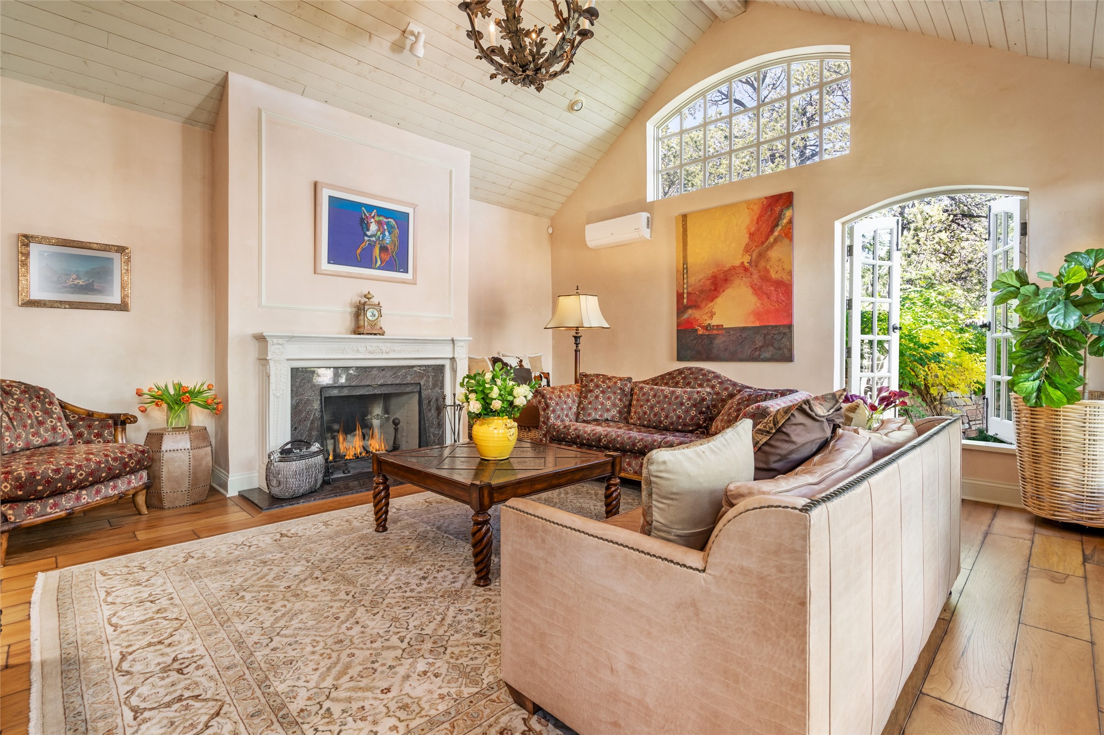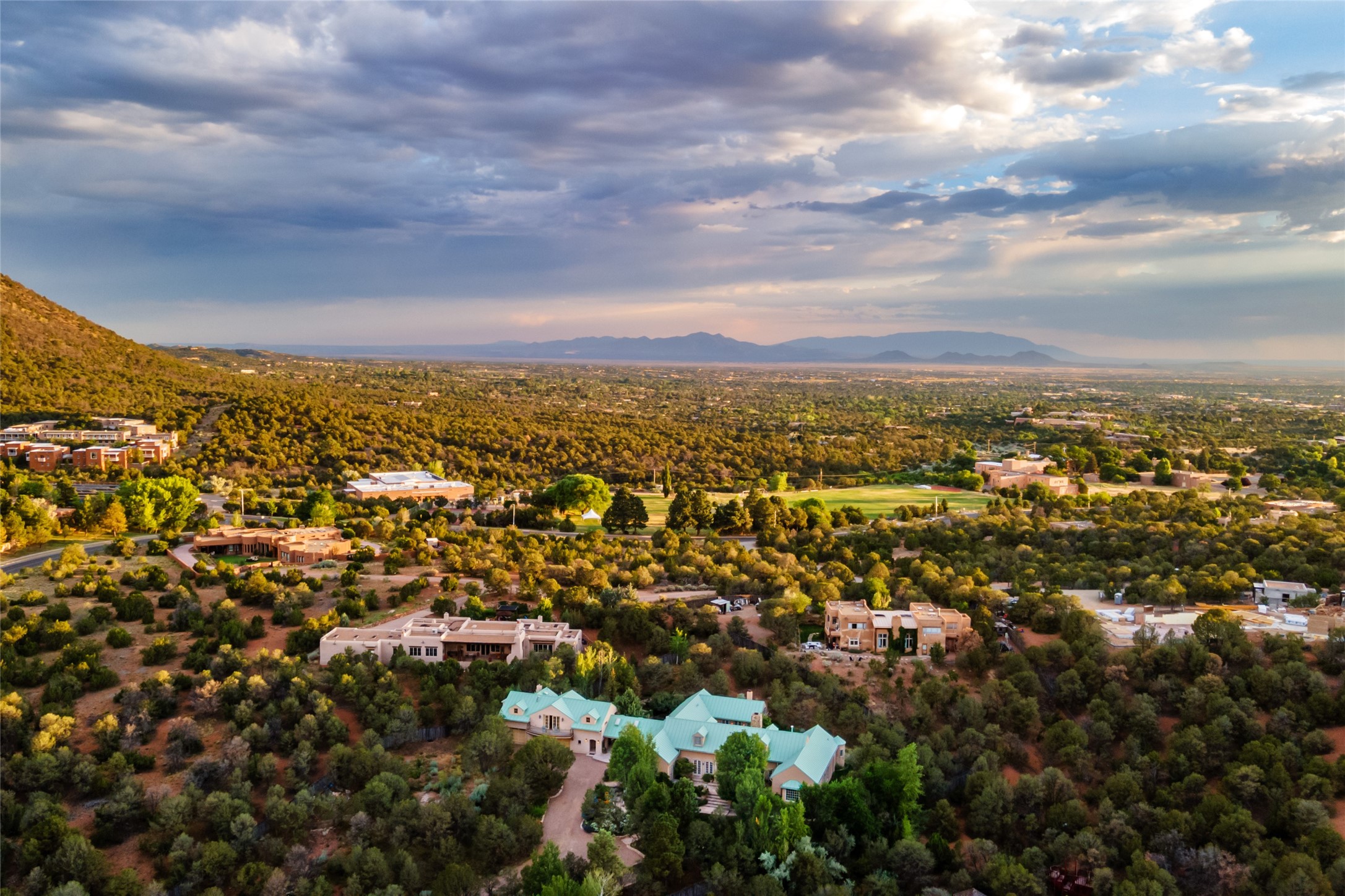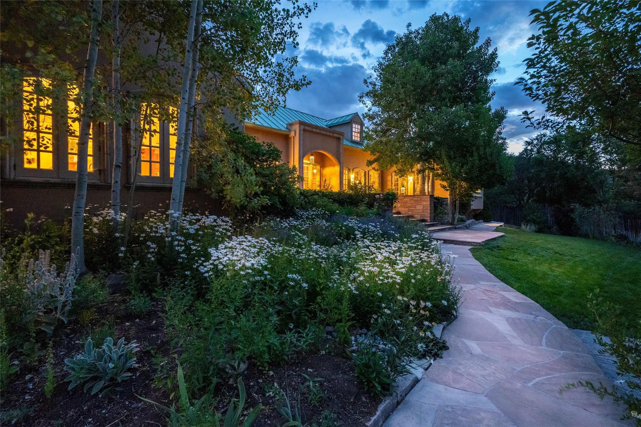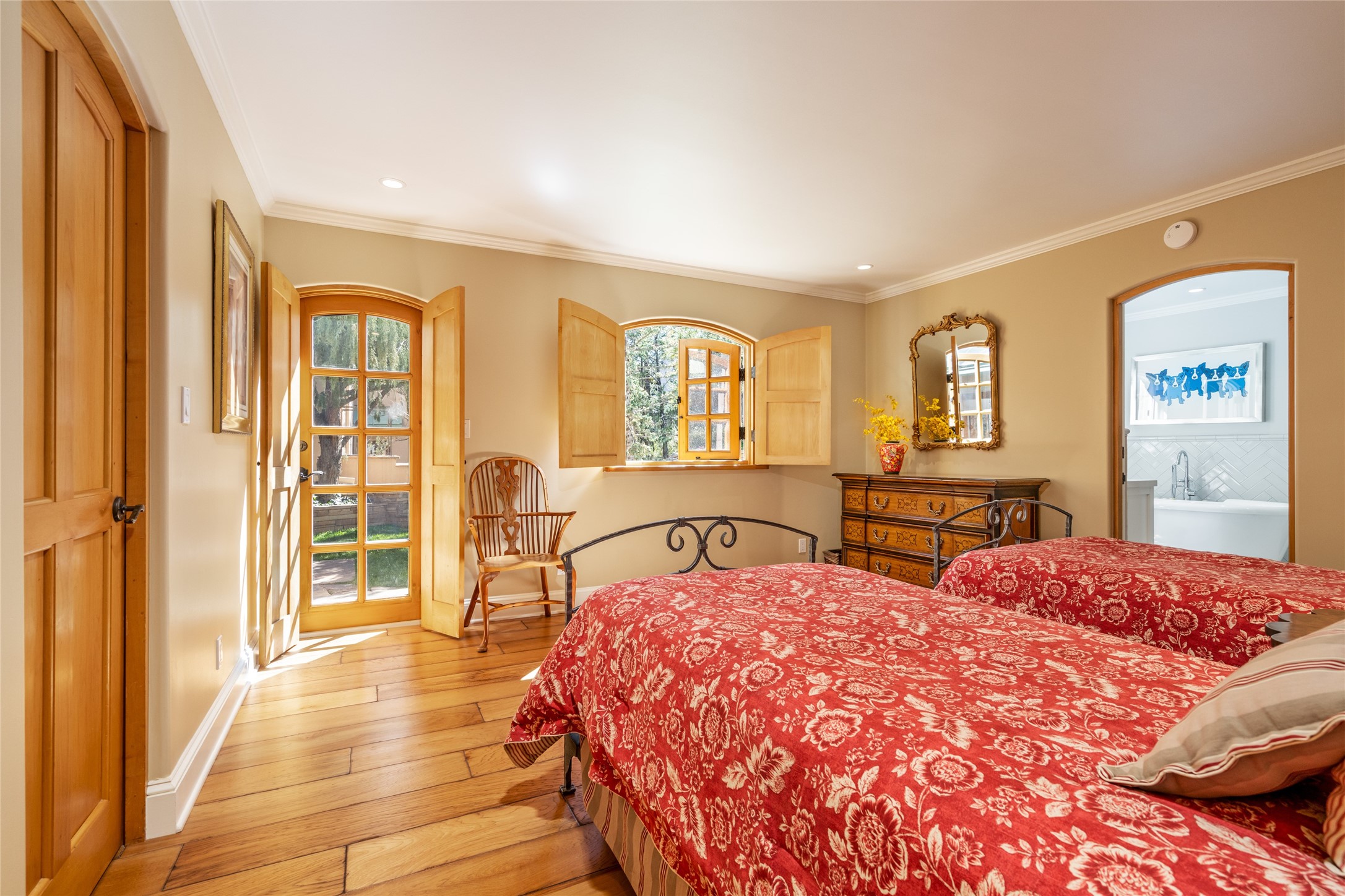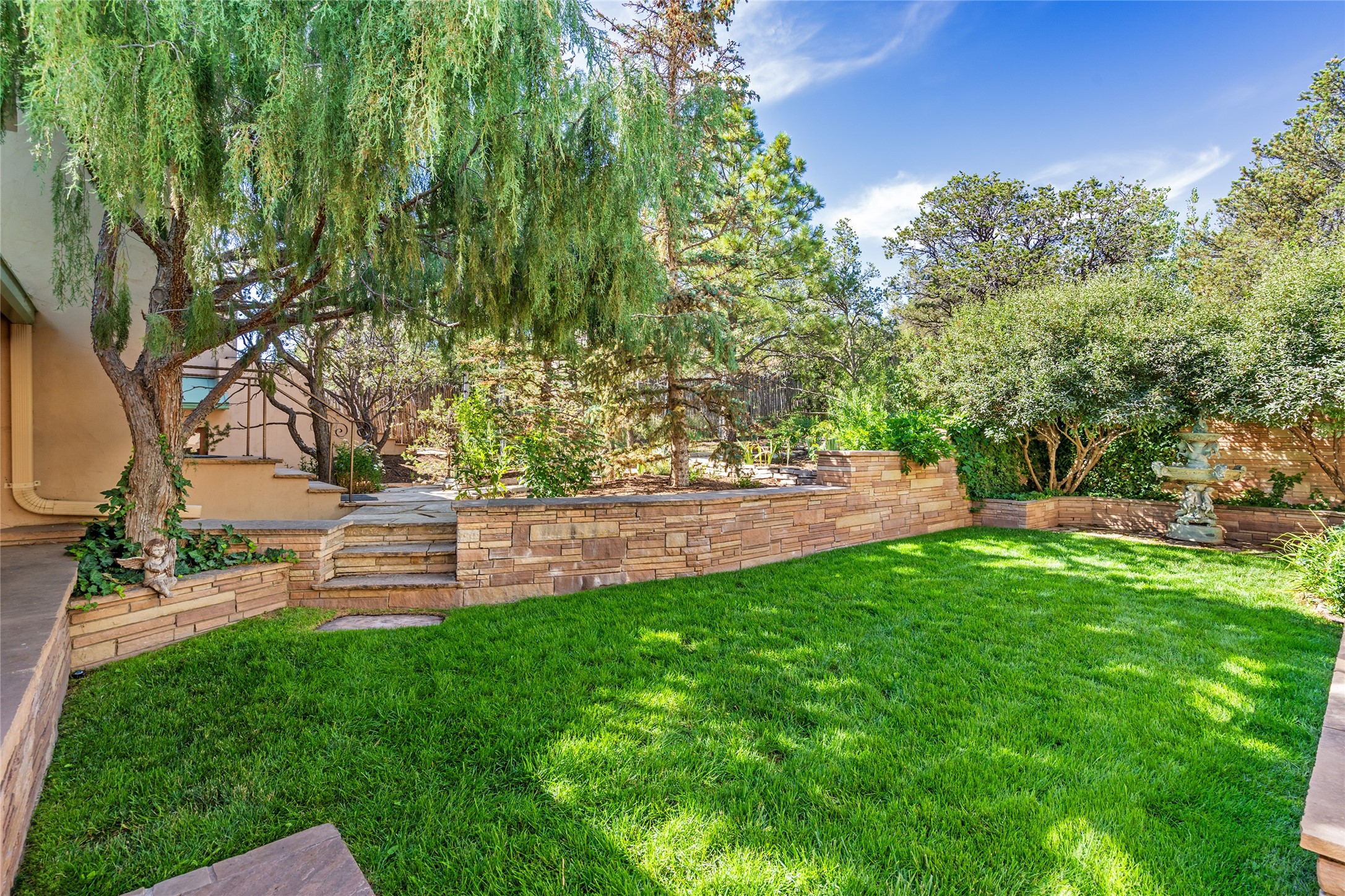 Elegant gated Eastside estate, situated on just over 1.8 acres of mature lush gardens, with a main house and separate guest house over the 3-car garage. European style features include extensive use of stone, hand-troweled pigmented plaster walls, hand-made tiles, custom stenciling, beamed ceilings, custom windows and hardware, hardwood hickory floors, and grand fireplaces. The gracious living room is enhanced by French doors and windows, and is located directly across the private central courtyard from the family room. An inviting formal dining room is the perfect place to share a lovely meal. Informal dining is available in the breakfast room just off the spacious well-equipped kitchen. The luxurious primary suite offers a sitting room or office with a large fireplace, two well-appointed custom-designed walk-in closets, and a spa-inspired bath with separate soaking tub and tiled steam shower. Two guest rooms, each with outdoor access, are set apart down a private hallway. The al fresco dining area, with fantastic mountain views, connects the primary residence with the garage spaces and guest house. The guest house provides the flexibility for a private home office. Captivating grounds with flagstone pathways, terraces and multiple courtyards are irrigated by the private well, which also serves the residences. The property is enveloped by views of the Sangre de Cristo Mountains and foothills. Close to recreation and schools; less than a mile from Canyon Road.