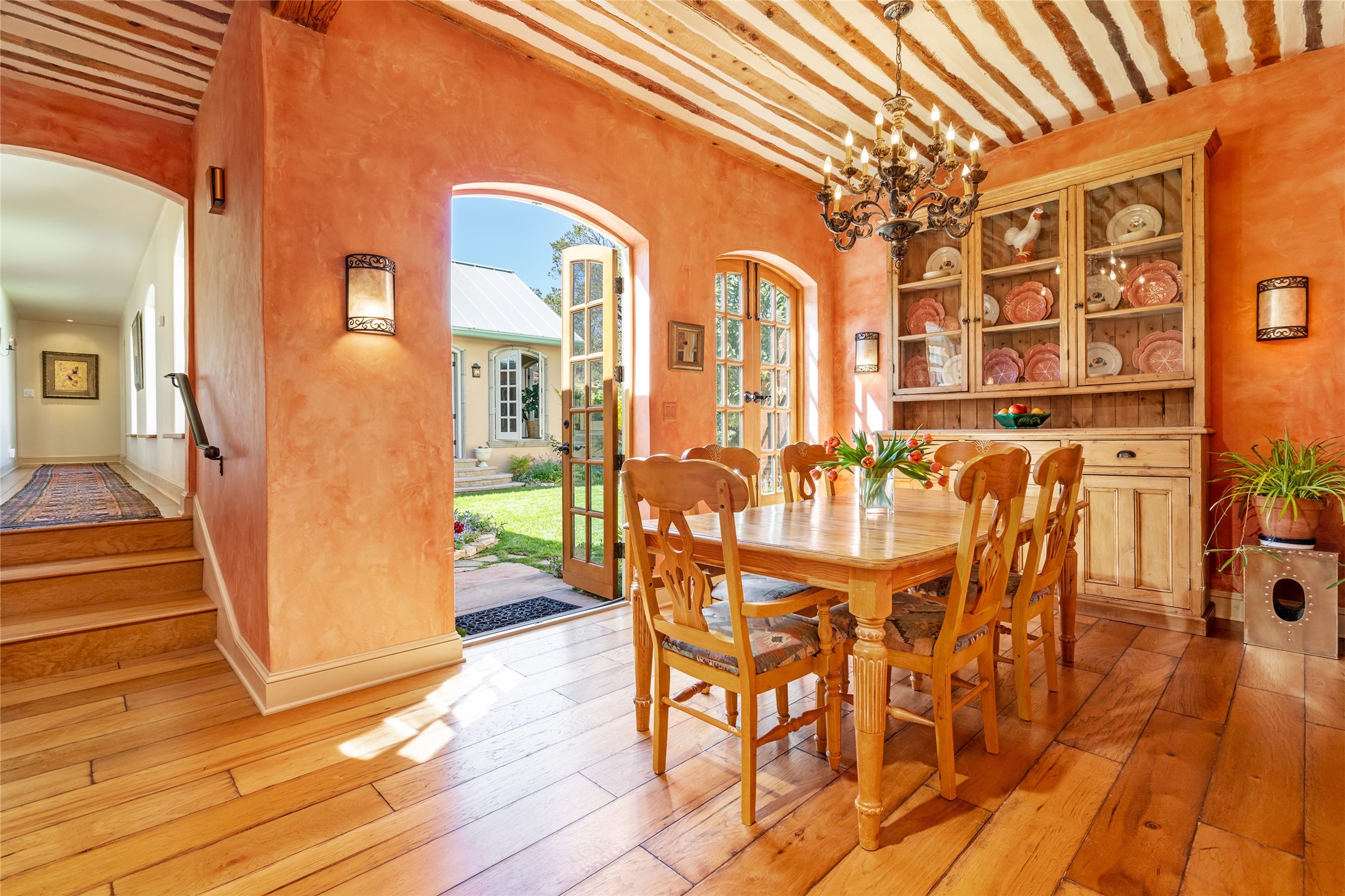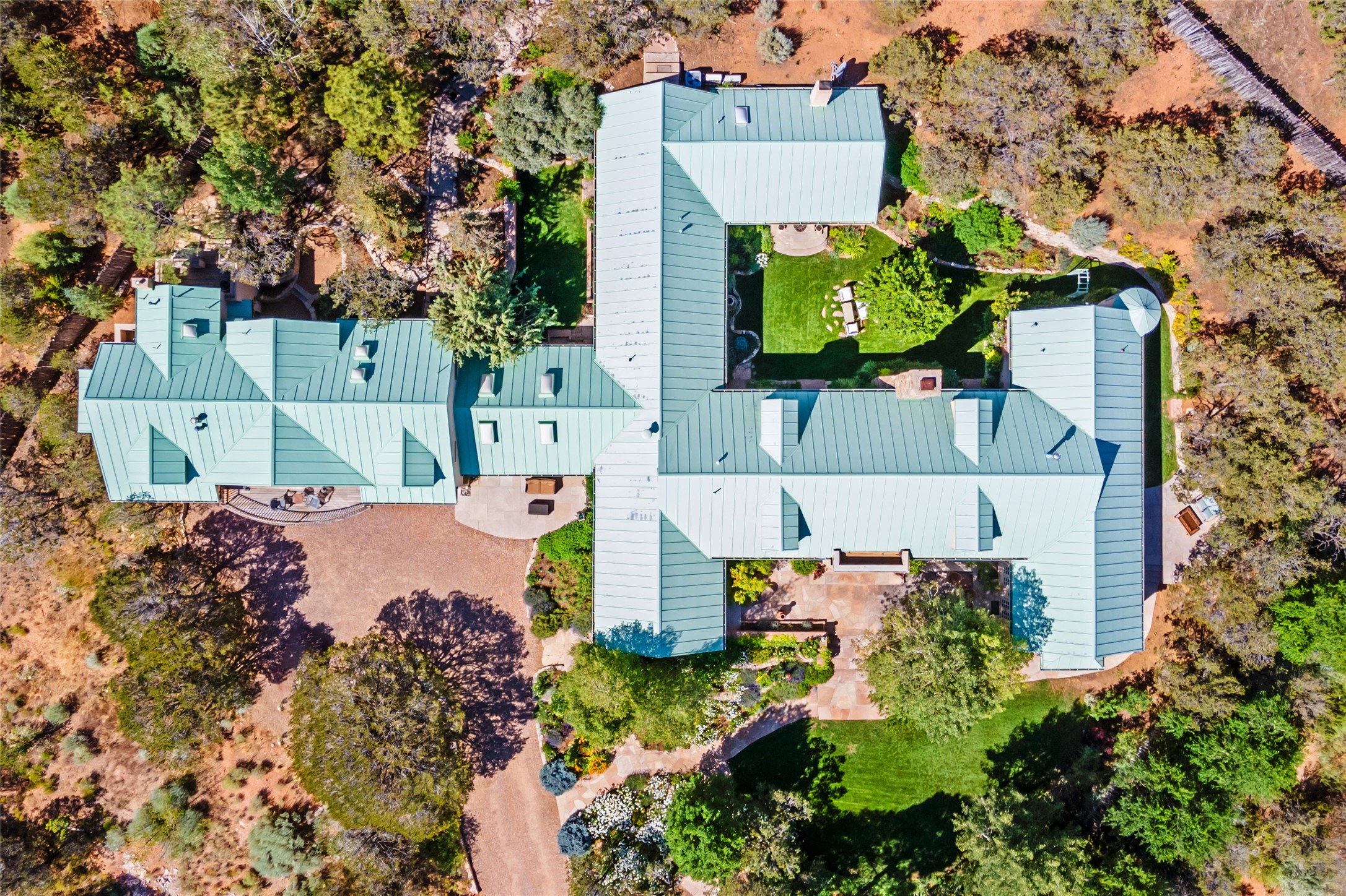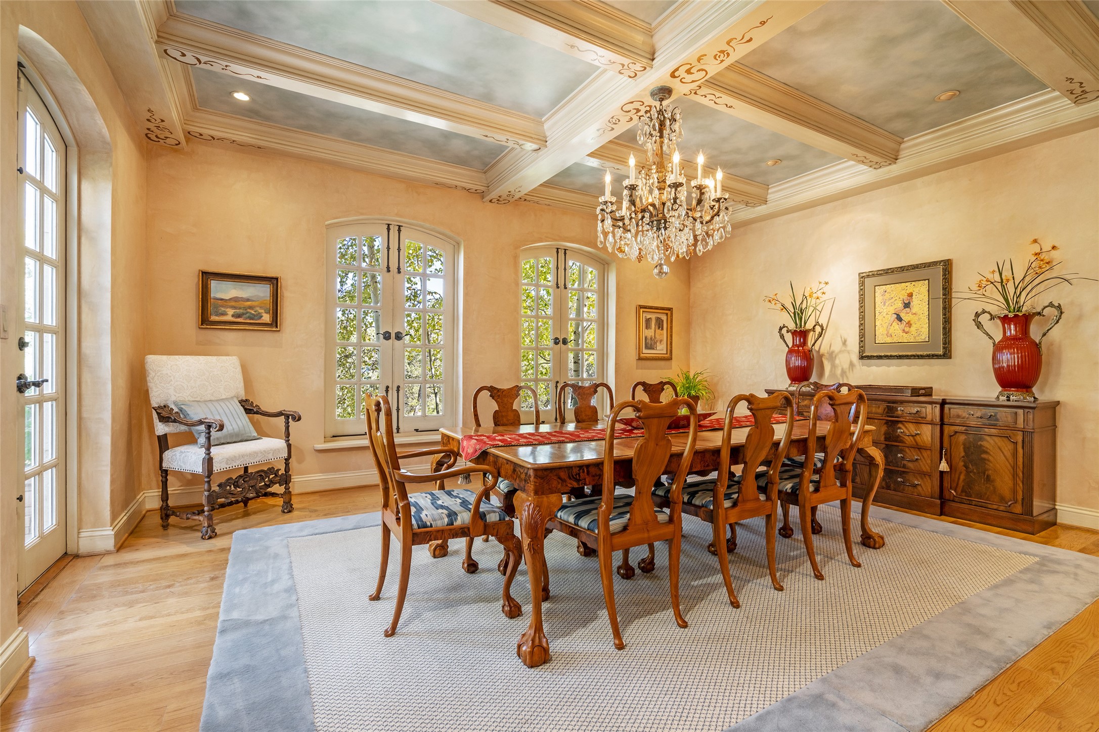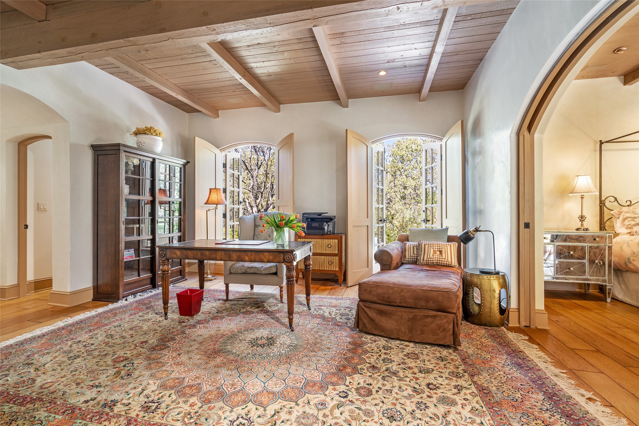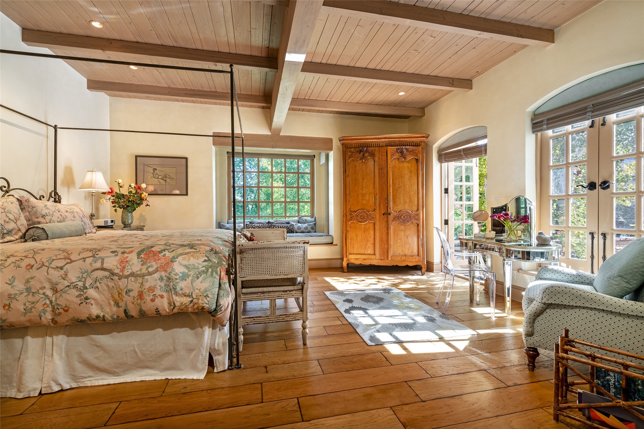 Elegant gated Eastside estate, situated on just over 1.8 acres of mature lush gardens, with a main house and separate guest house over the 3-car garage. European style features include extensive use of stone, hand-troweled pigmented plaster walls, hand-made tiles, custom stenciling, beamed ceilings, custom windows and hardware, hardwood hickory floors, and grand fireplaces. The gracious living room is enhanced by French doors and windows, and is located directly across the private central courtyard from the family room. An inviting formal dining room is the perfect place to share a lovely meal. Informal dining is available in the breakfast room just off the spacious well-equipped kitchen. The luxurious primary suite offers a sitting room or office with a large fireplace, two well-appointed custom-designed walk-in closets, and a spa-inspired bath with separate soaking tub and tiled steam shower. Two guest rooms, each with outdoor access, are set apart down a private hallway. The al fresco dining area, with fantastic mountain views, connects the primary residence with the garage spaces and guest house. The guest house provides the flexibility for a private home office. Captivating grounds with flagstone pathways, terraces and multiple courtyards are irrigated by the private well, which also serves the residences. The property is enveloped by views of the Sangre de Cristo Mountains and foothills. Close to recreation and schools; less than a mile from Canyon Road.