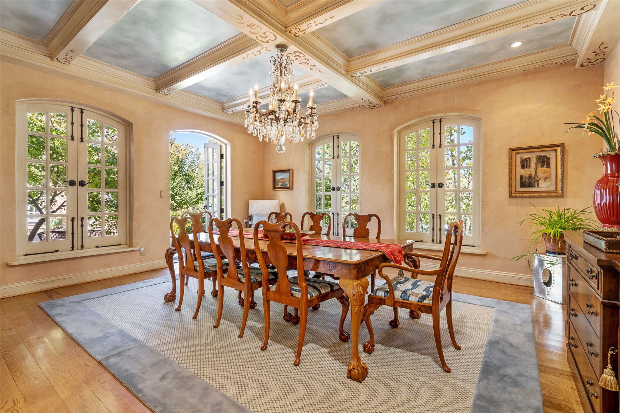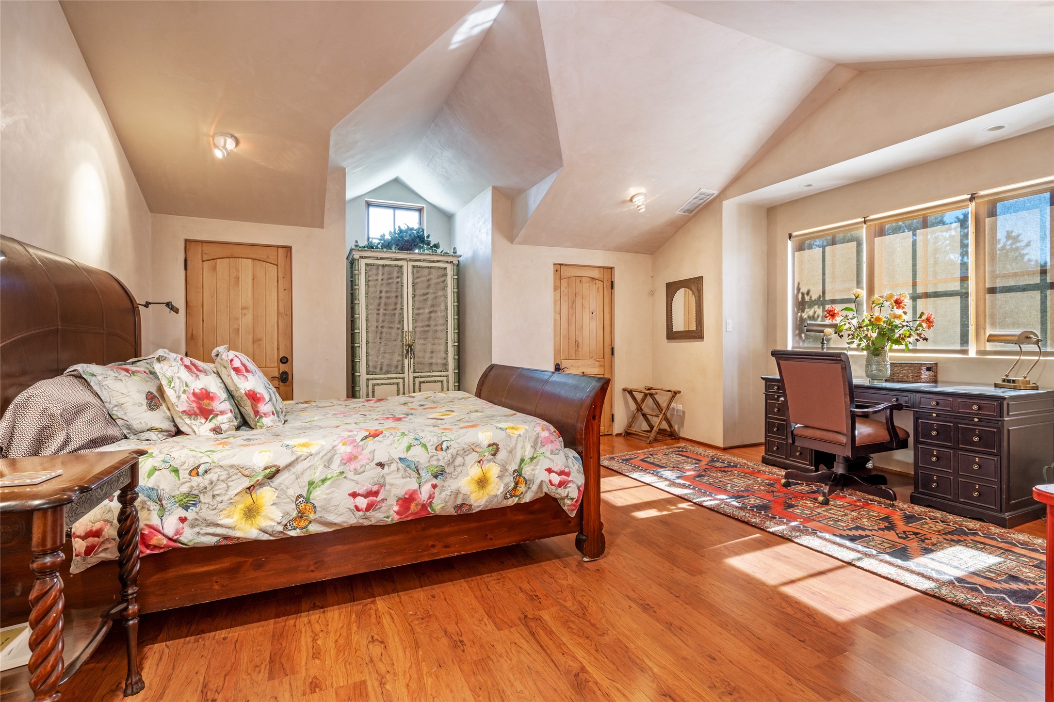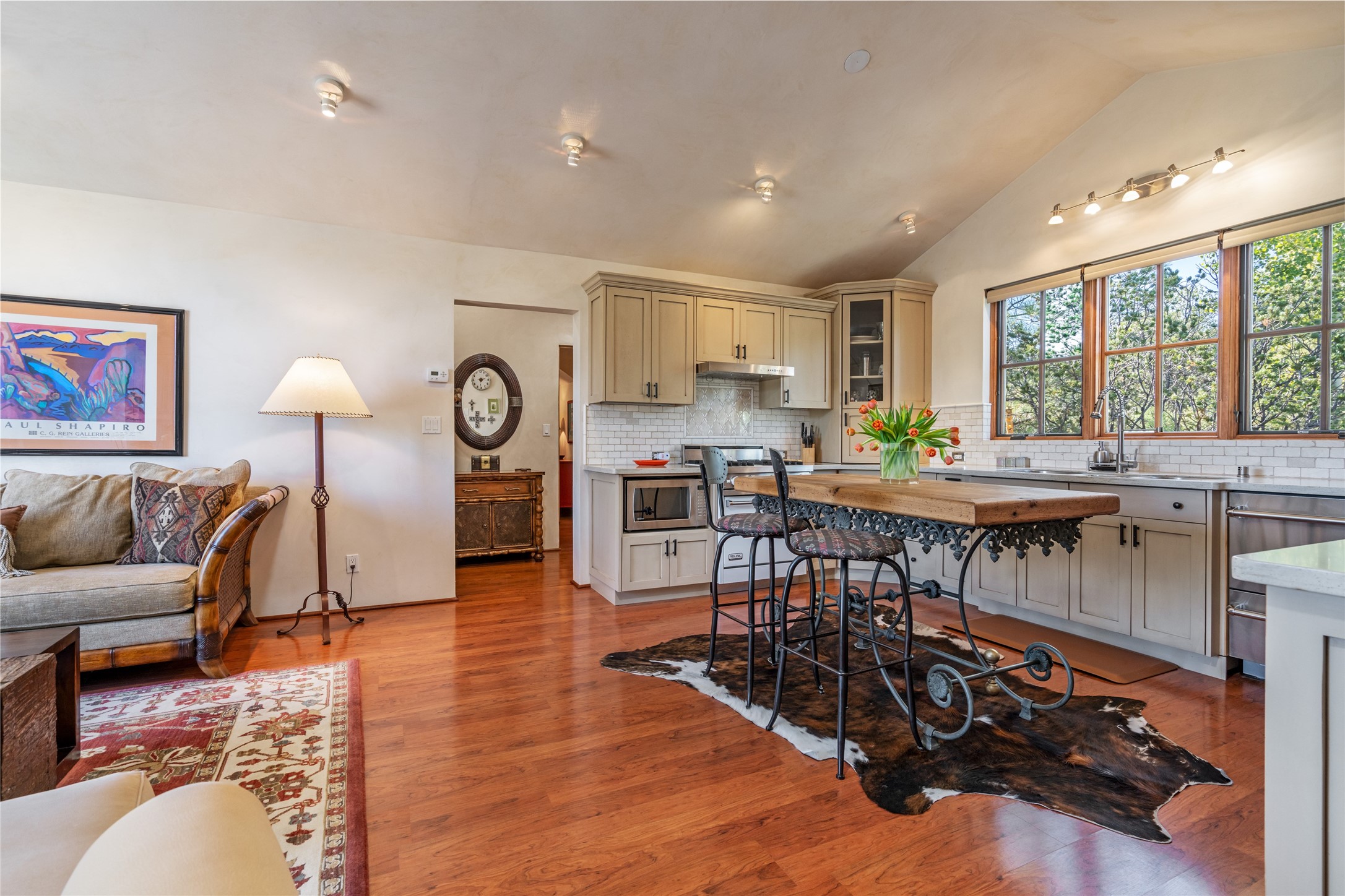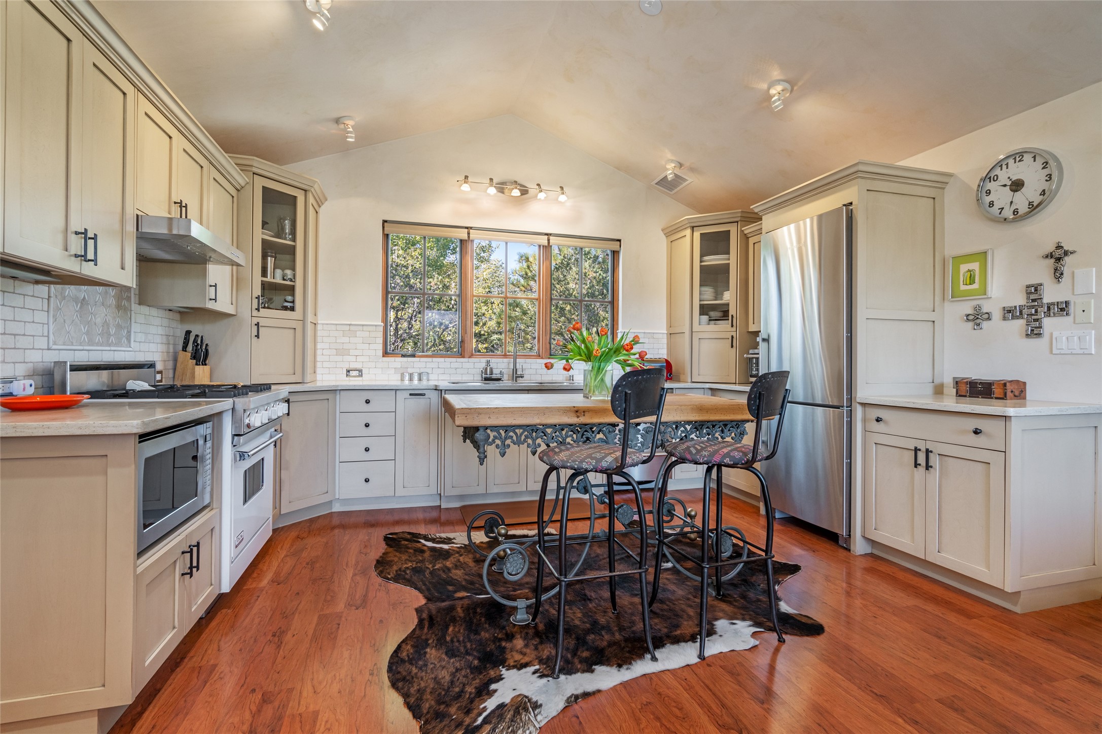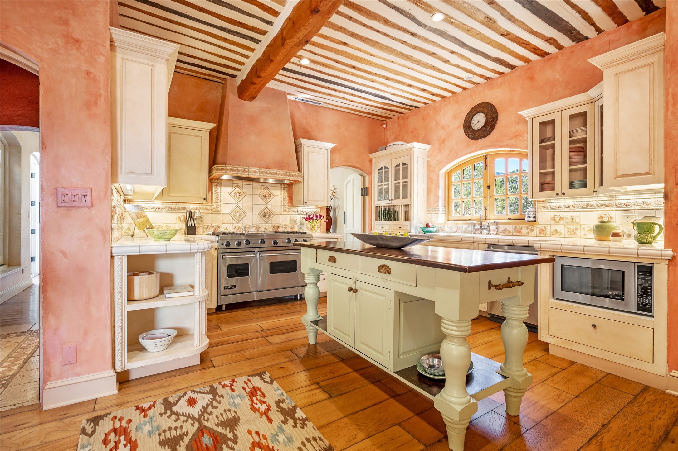 Elegant gated Eastside estate, situated on just over 1.8 acres of mature lush gardens, with a main house and separate guest house over the 3-car garage. European style features include extensive use of stone, hand-troweled pigmented plaster walls, hand-made tiles, custom stenciling, beamed ceilings, custom windows and hardware, hardwood hickory floors, and grand fireplaces. The gracious living room is enhanced by French doors and windows, and is located directly across the private central courtyard from the family room. An inviting formal dining room is the perfect place to share a lovely meal. Informal dining is available in the breakfast room just off the spacious well-equipped kitchen. The luxurious primary suite offers a sitting room or office with a large fireplace, two well-appointed custom-designed walk-in closets, and a spa-inspired bath with separate soaking tub and tiled steam shower. Two guest rooms, each with outdoor access, are set apart down a private hallway. The al fresco dining area, with fantastic mountain views, connects the primary residence with the garage spaces and guest house. The guest house provides the flexibility for a private home office. Captivating grounds with flagstone pathways, terraces and multiple courtyards are irrigated by the private well, which also serves the residences. The property is enveloped by views of the Sangre de Cristo Mountains and foothills. Close to recreation and schools; less than a mile from Canyon Road.