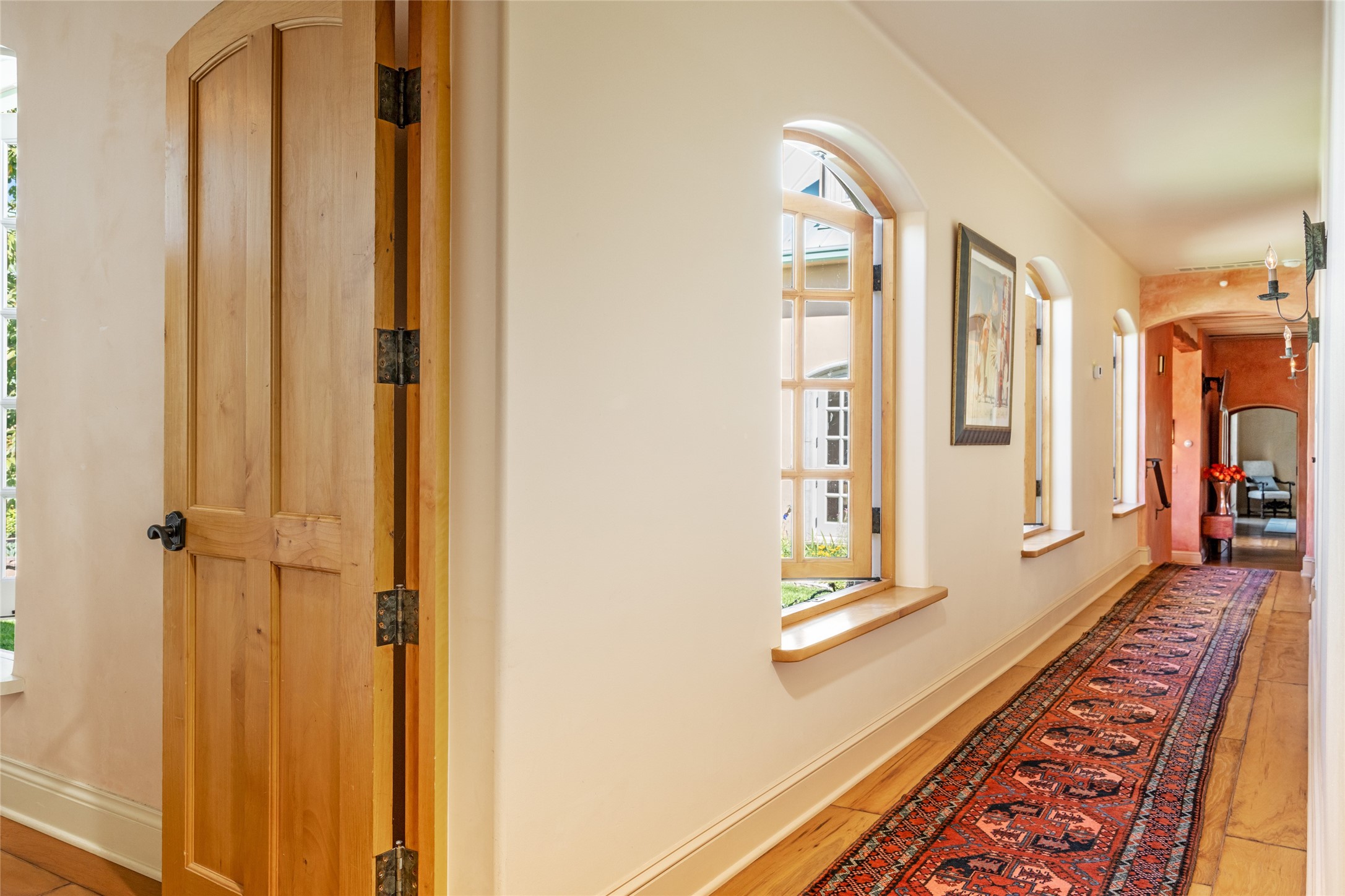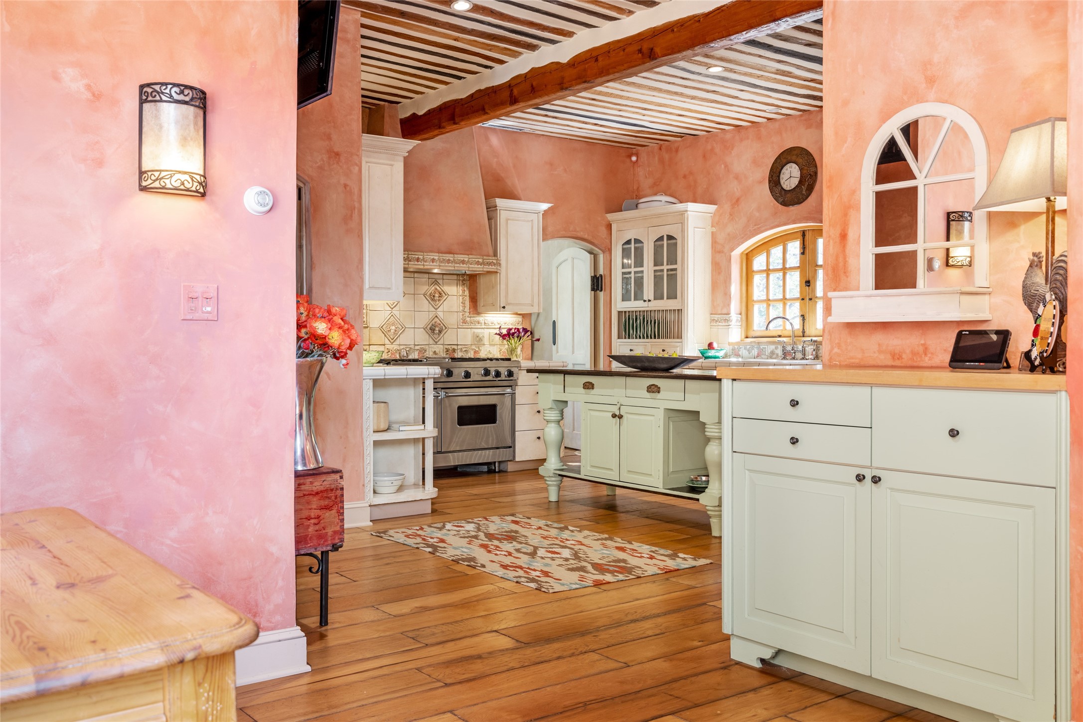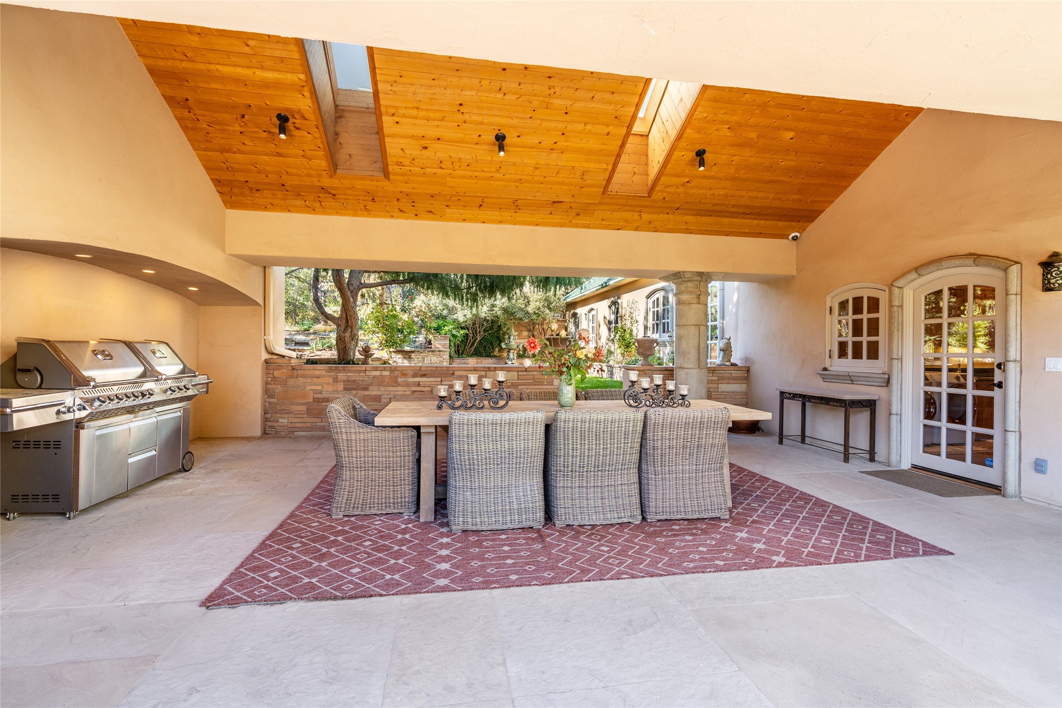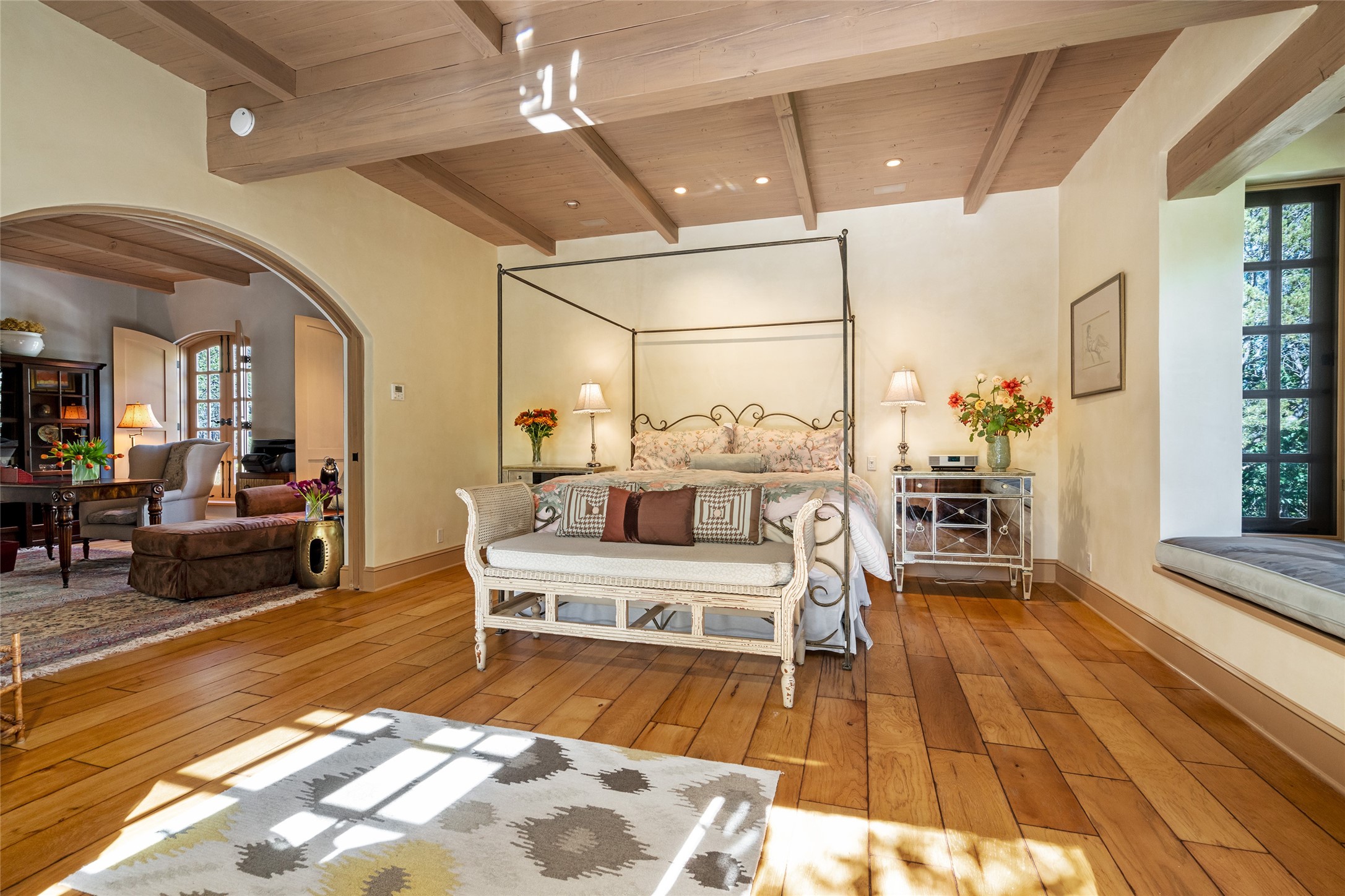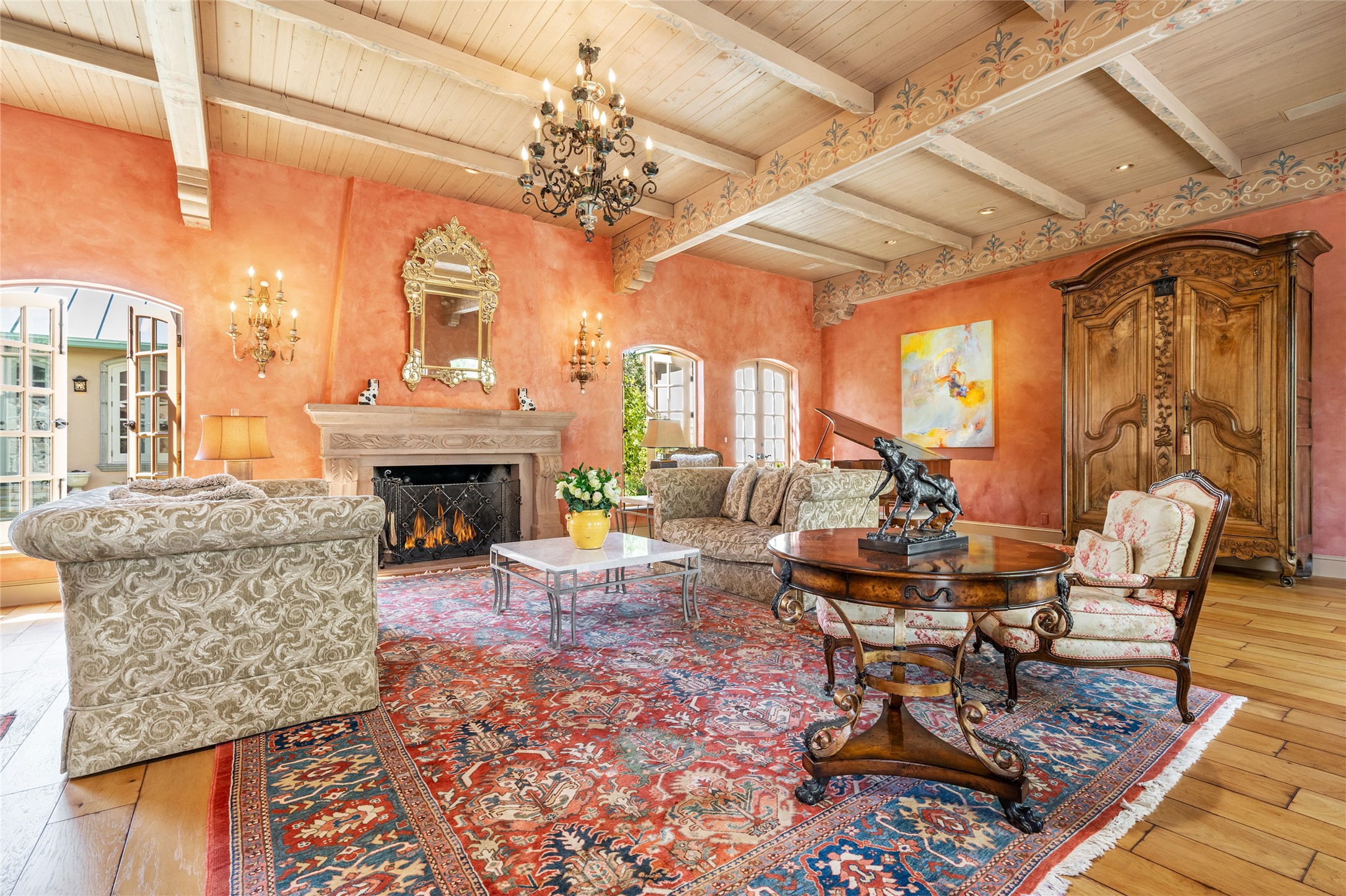 Elegant gated Eastside estate, situated on just over 1.8 acres of mature lush gardens, with a main house and separate guest house over the 3-car garage. European style features include extensive use of stone, hand-troweled pigmented plaster walls, hand-made tiles, custom stenciling, beamed ceilings, custom windows and hardware, hardwood hickory floors, and grand fireplaces. The gracious living room is enhanced by French doors and windows, and is located directly across the private central courtyard from the family room. An inviting formal dining room is the perfect place to share a lovely meal. Informal dining is available in the breakfast room just off the spacious well-equipped kitchen. The luxurious primary suite offers a sitting room or office with a large fireplace, two well-appointed custom-designed walk-in closets, and a spa-inspired bath with separate soaking tub and tiled steam shower. Two guest rooms, each with outdoor access, are set apart down a private hallway. The al fresco dining area, with fantastic mountain views, connects the primary residence with the garage spaces and guest house. The guest house provides the flexibility for a private home office. Captivating grounds with flagstone pathways, terraces and multiple courtyards are irrigated by the private well, which also serves the residences. The property is enveloped by views of the Sangre de Cristo Mountains and foothills. Close to recreation and schools; less than a mile from Canyon Road.