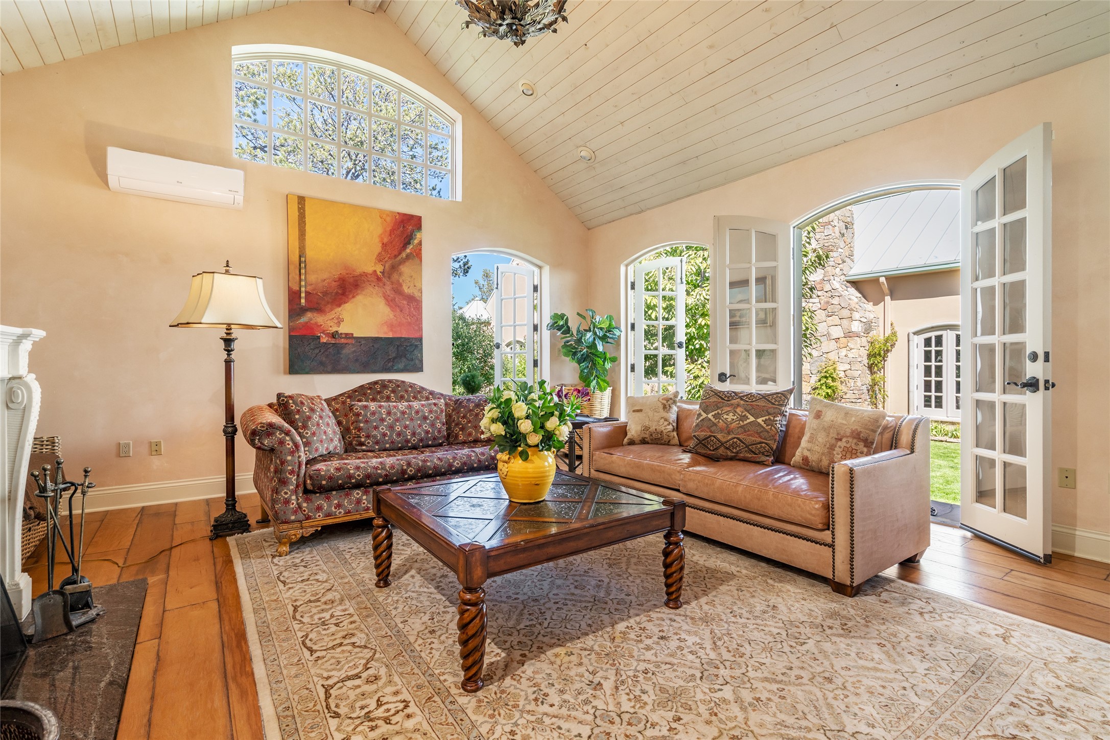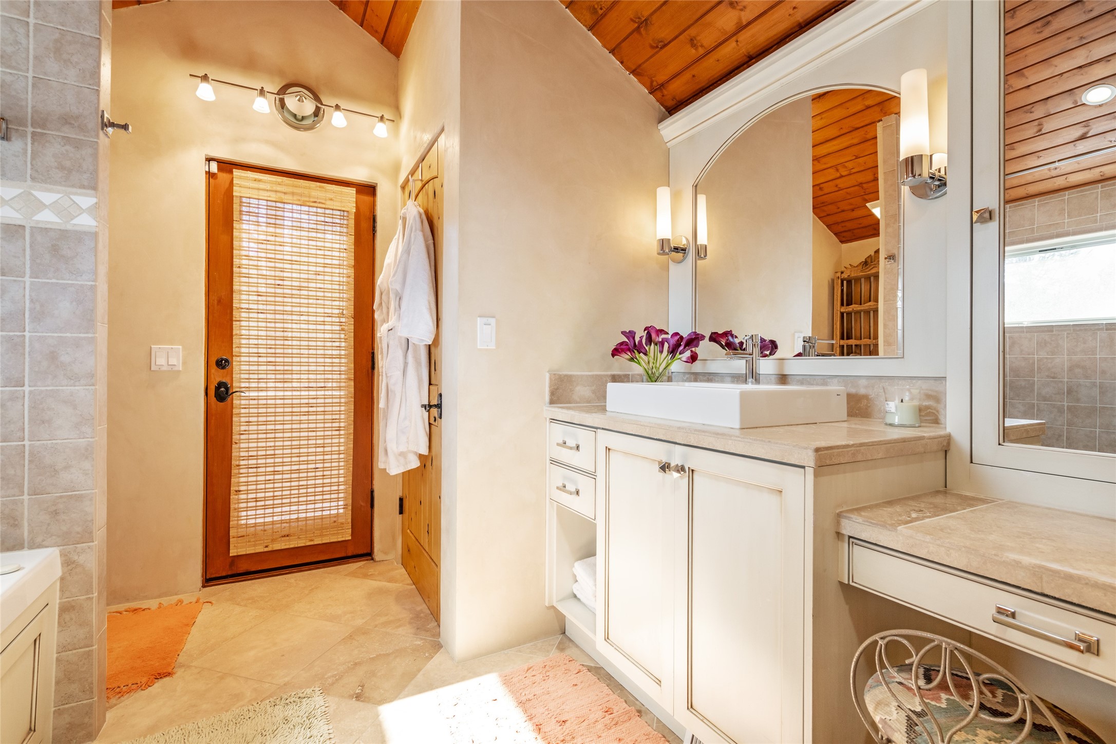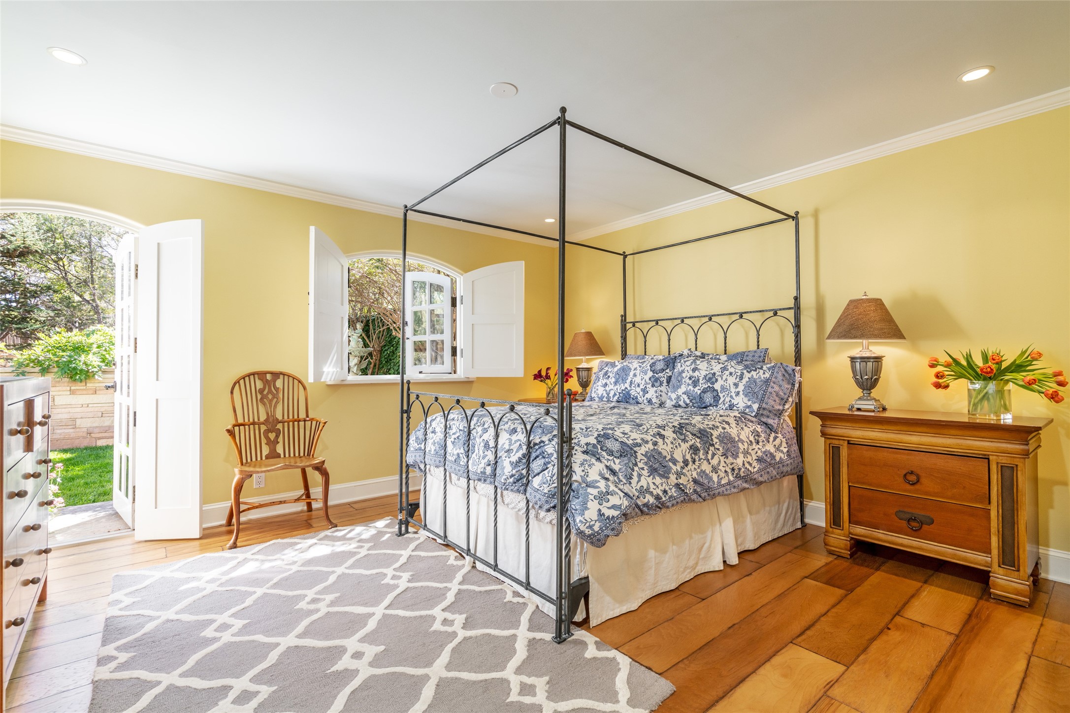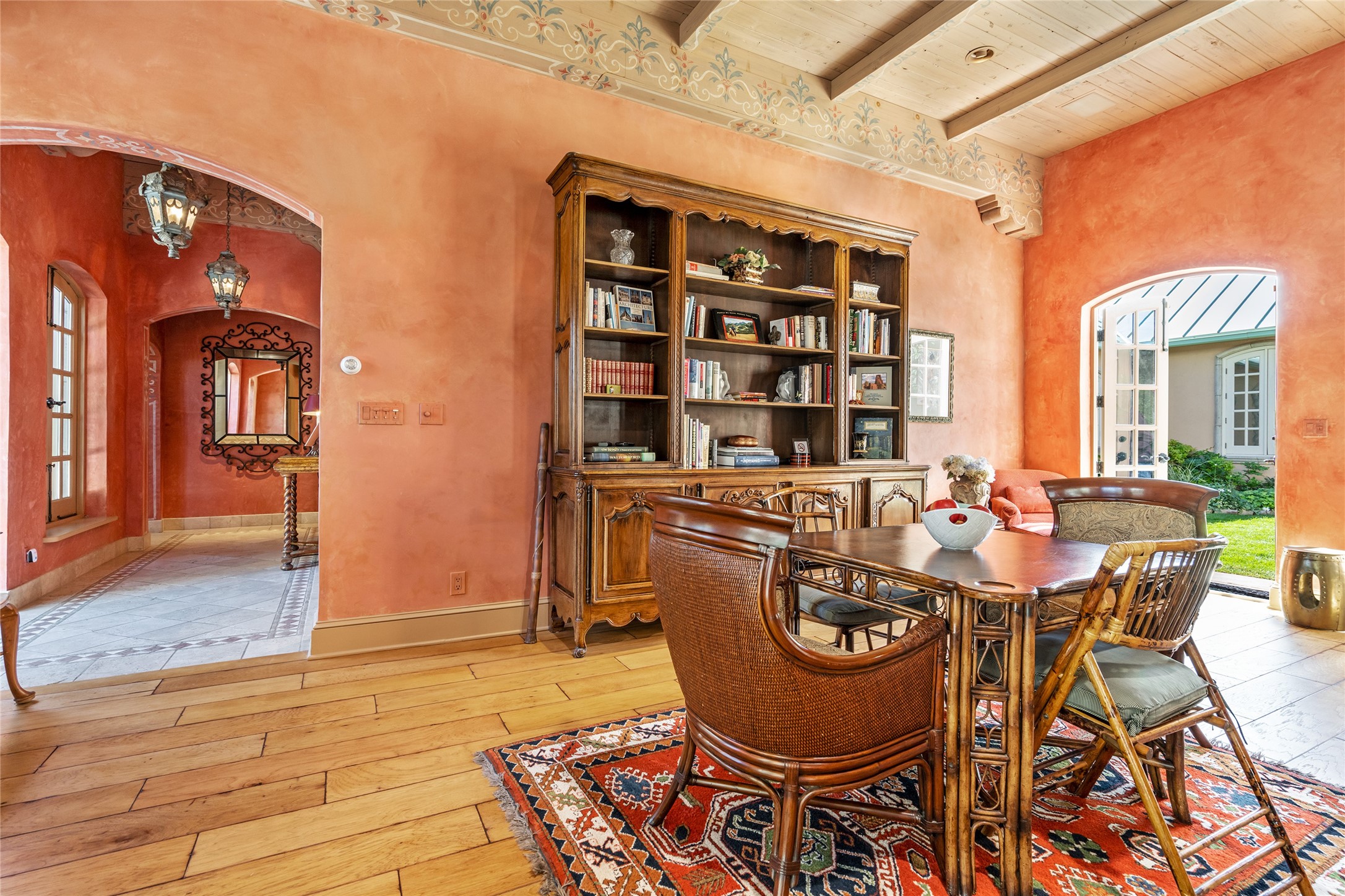 Elegant gated Eastside estate, situated on just over 1.8 acres of mature lush gardens, with a main house and separate guest house over the 3-car garage. European style features include extensive use of stone, hand-troweled pigmented plaster walls, hand-made tiles, custom stenciling, beamed ceilings, custom windows and hardware, hardwood hickory floors, and grand fireplaces. The gracious living room is enhanced by French doors and windows, and is located directly across the private central courtyard from the family room. An inviting formal dining room is the perfect place to share a lovely meal. Informal dining is available in the breakfast room just off the spacious well-equipped kitchen. The luxurious primary suite offers a sitting room or office with a large fireplace, two well-appointed custom-designed walk-in closets, and a spa-inspired bath with separate soaking tub and tiled steam shower. Two guest rooms, each with outdoor access, are set apart down a private hallway. The al fresco dining area, with fantastic mountain views, connects the primary residence with the garage spaces and guest house. The guest house provides the flexibility for a private home office. Captivating grounds with flagstone pathways, terraces and multiple courtyards are irrigated by the private well, which also serves the residences. The property is enveloped by views of the Sangre de Cristo Mountains and foothills. Close to recreation and schools; less than a mile from Canyon Road.
