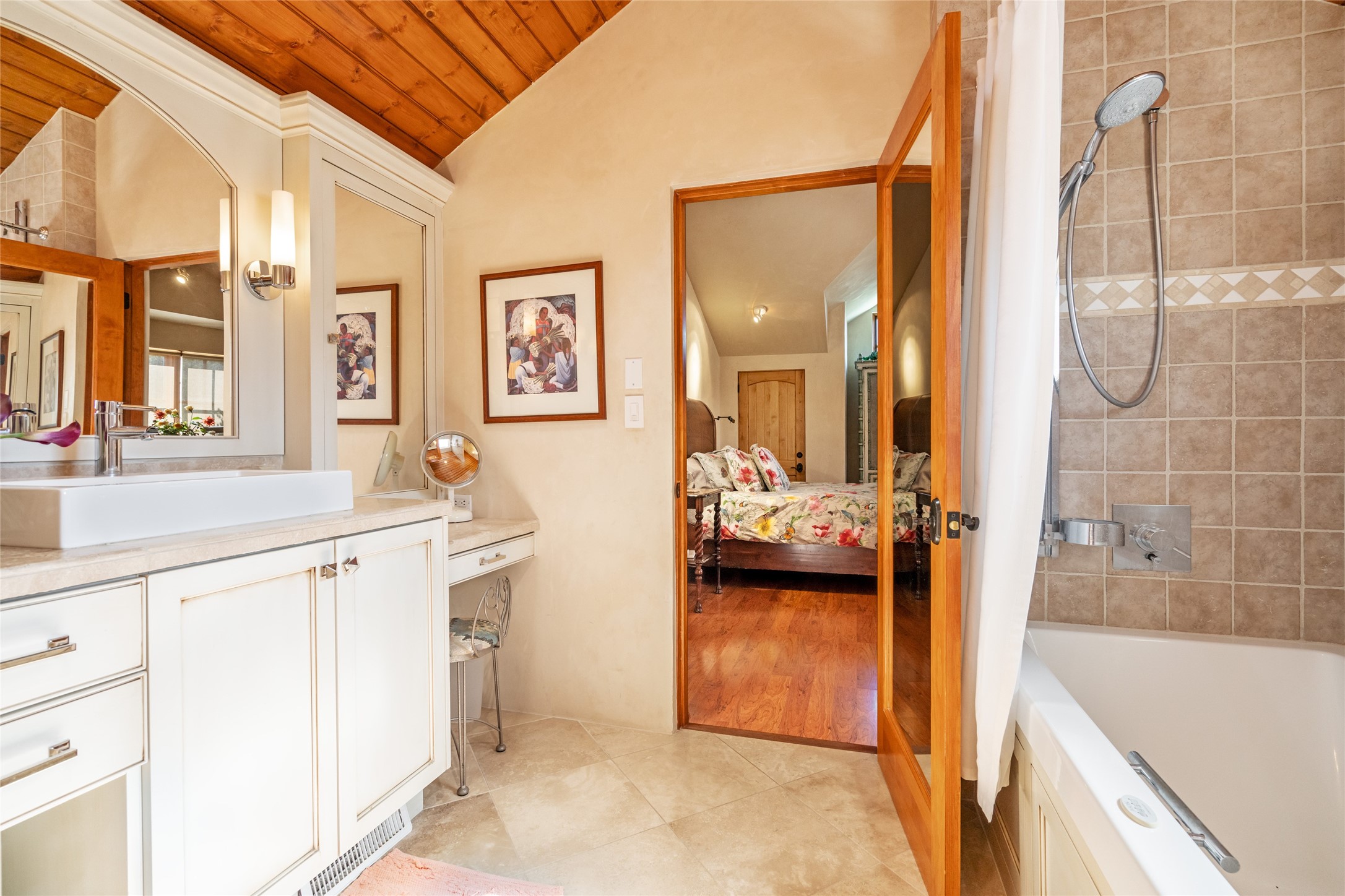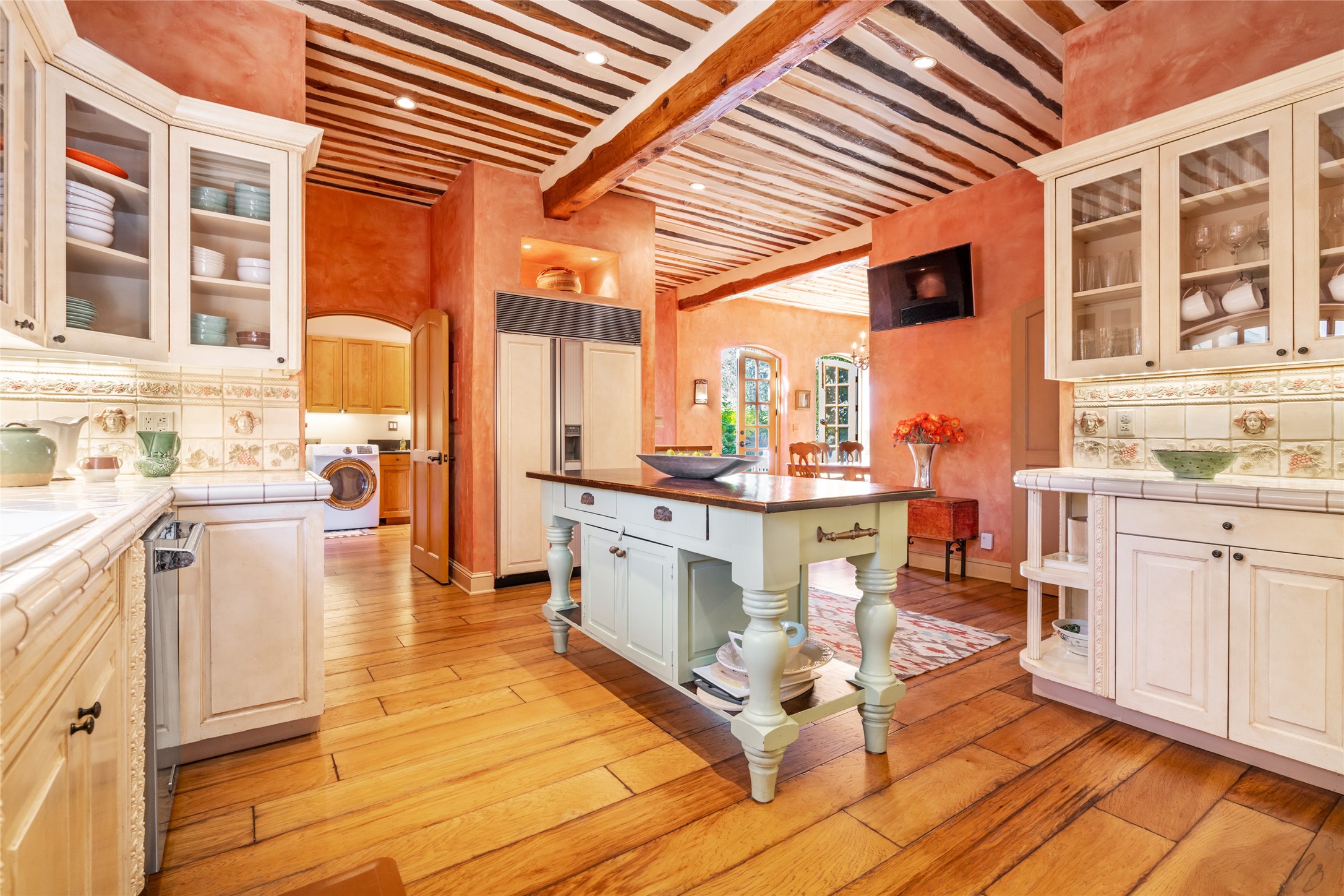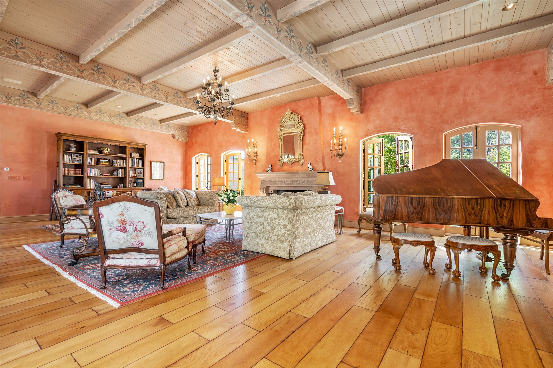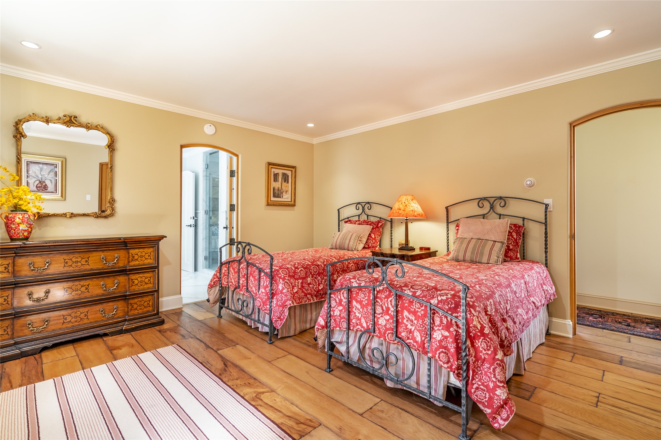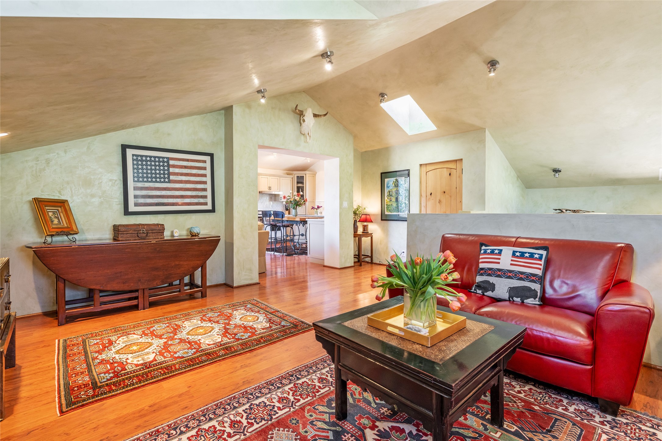 Elegant gated Eastside estate, situated on just over 1.8 acres of mature lush gardens, with a main house and separate guest house over the 3-car garage. European style features include extensive use of stone, hand-troweled pigmented plaster walls, hand-made tiles, custom stenciling, beamed ceilings, custom windows and hardware, hardwood hickory floors, and grand fireplaces. The gracious living room is enhanced by French doors and windows, and is located directly across the private central courtyard from the family room. An inviting formal dining room is the perfect place to share a lovely meal. Informal dining is available in the breakfast room just off the spacious well-equipped kitchen. The luxurious primary suite offers a sitting room or office with a large fireplace, two well-appointed custom-designed walk-in closets, and a spa-inspired bath with separate soaking tub and tiled steam shower. Two guest rooms, each with outdoor access, are set apart down a private hallway. The al fresco dining area, with fantastic mountain views, connects the primary residence with the garage spaces and guest house. The guest house provides the flexibility for a private home office. Captivating grounds with flagstone pathways, terraces and multiple courtyards are irrigated by the private well, which also serves the residences. The property is enveloped by views of the Sangre de Cristo Mountains and foothills. Close to recreation and schools; less than a mile from Canyon Road.