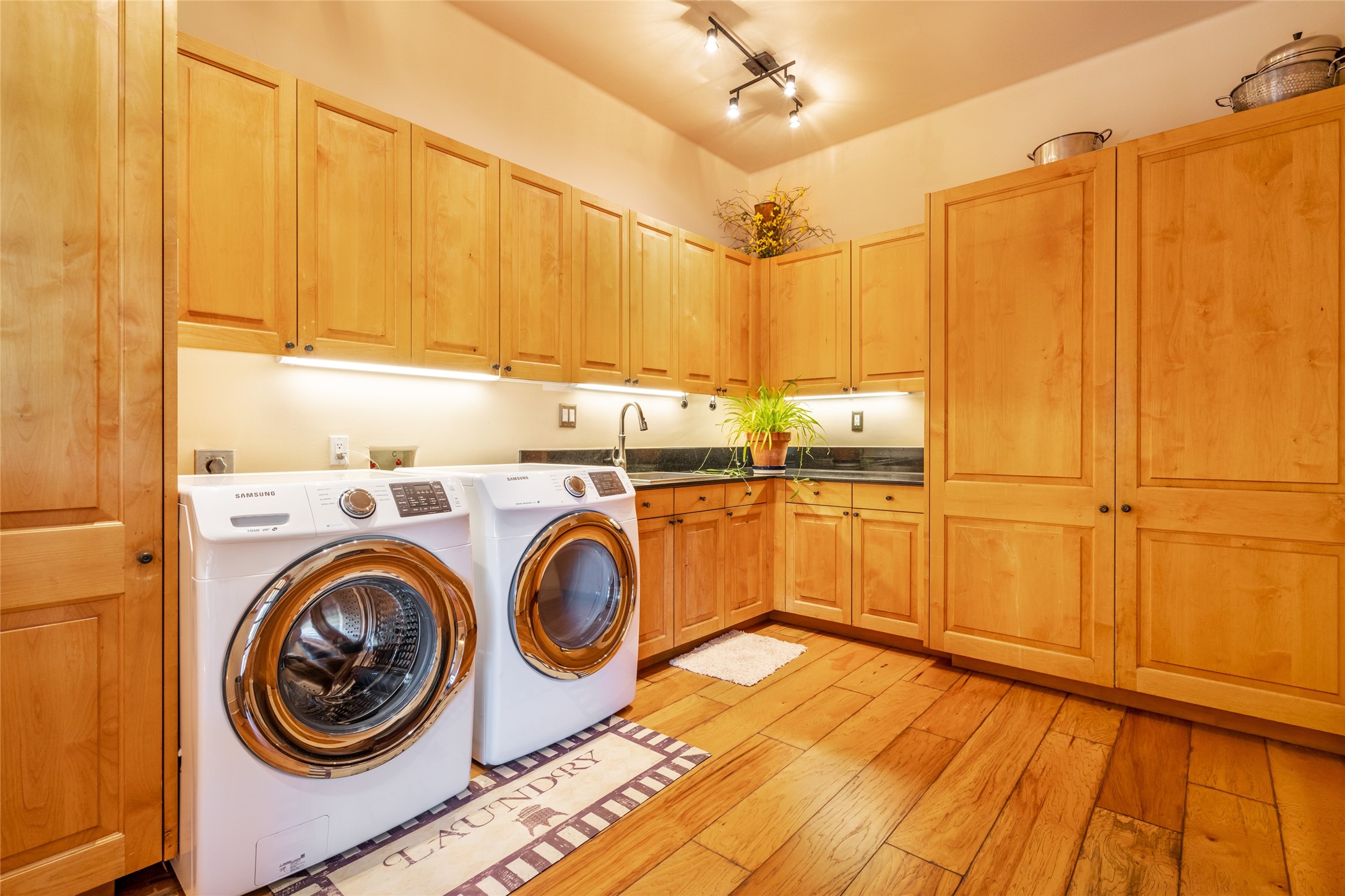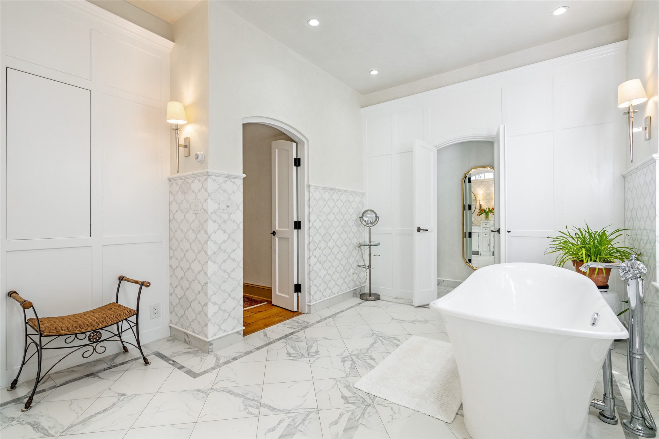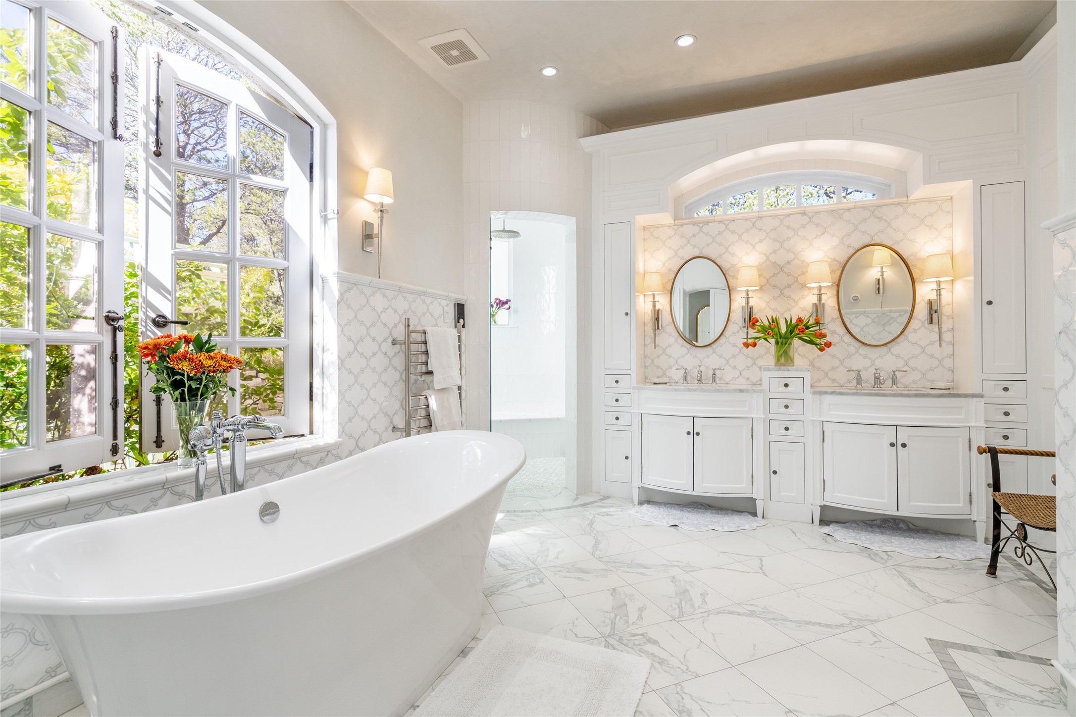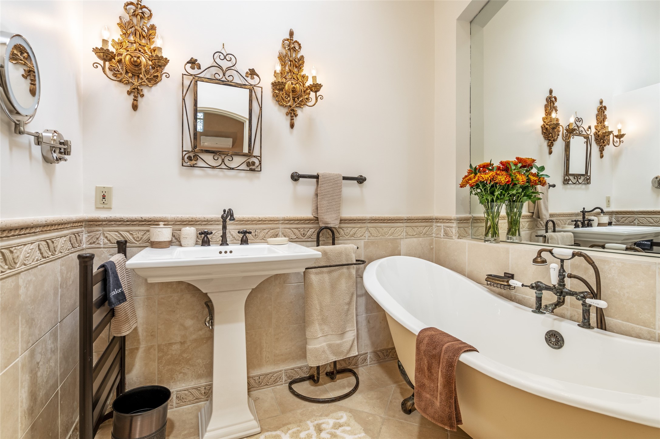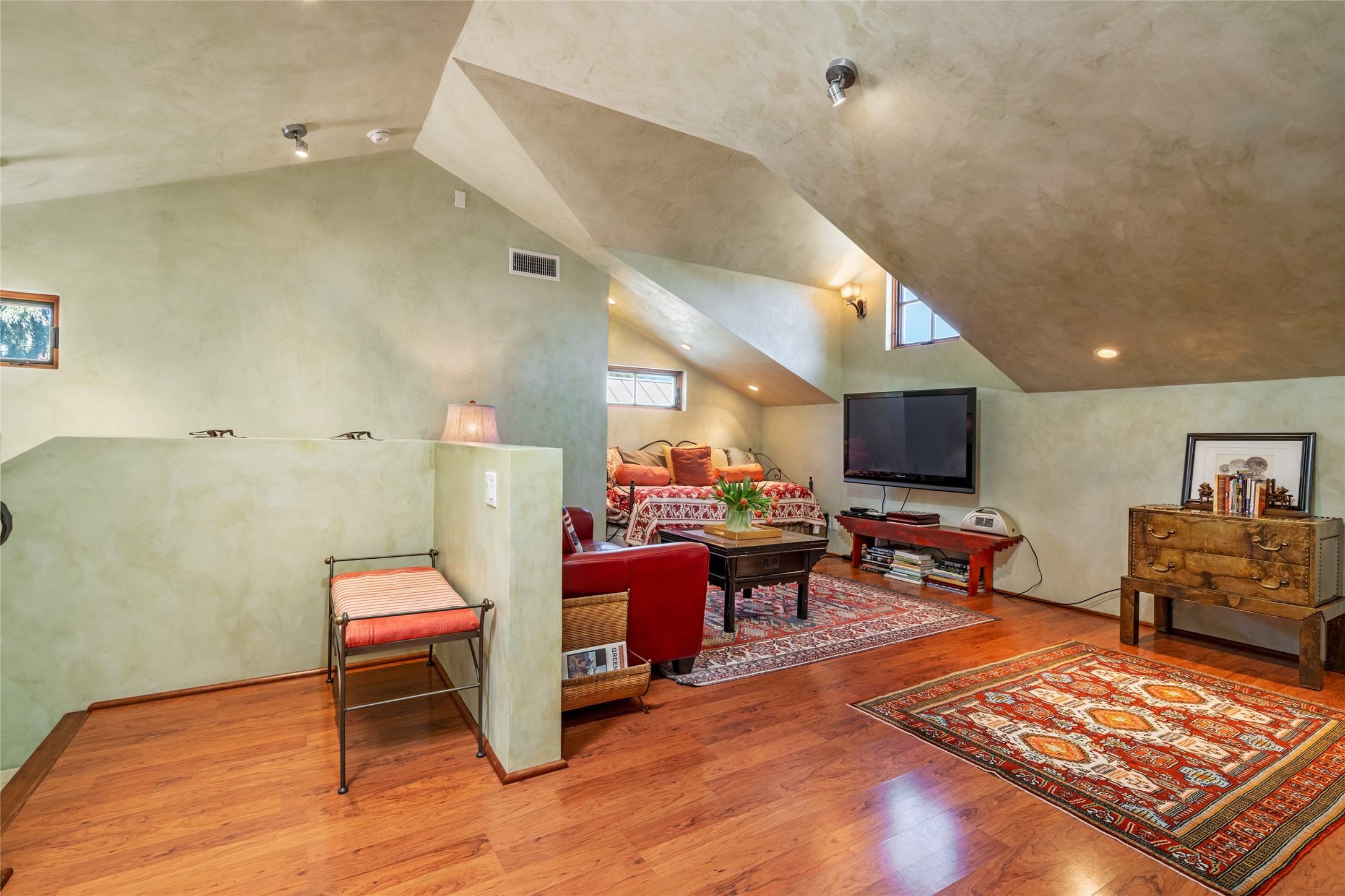 Elegant gated Eastside estate, situated on just over 1.8 acres of mature lush gardens, with a main house and separate guest house over the 3-car garage. European style features include extensive use of stone, hand-troweled pigmented plaster walls, hand-made tiles, custom stenciling, beamed ceilings, custom windows and hardware, hardwood hickory floors, and grand fireplaces. The gracious living room is enhanced by French doors and windows, and is located directly across the private central courtyard from the family room. An inviting formal dining room is the perfect place to share a lovely meal. Informal dining is available in the breakfast room just off the spacious well-equipped kitchen. The luxurious primary suite offers a sitting room or office with a large fireplace, two well-appointed custom-designed walk-in closets, and a spa-inspired bath with separate soaking tub and tiled steam shower. Two guest rooms, each with outdoor access, are set apart down a private hallway. The al fresco dining area, with fantastic mountain views, connects the primary residence with the garage spaces and guest house. The guest house provides the flexibility for a private home office. Captivating grounds with flagstone pathways, terraces and multiple courtyards are irrigated by the private well, which also serves the residences. The property is enveloped by views of the Sangre de Cristo Mountains and foothills. Close to recreation and schools; less than a mile from Canyon Road.