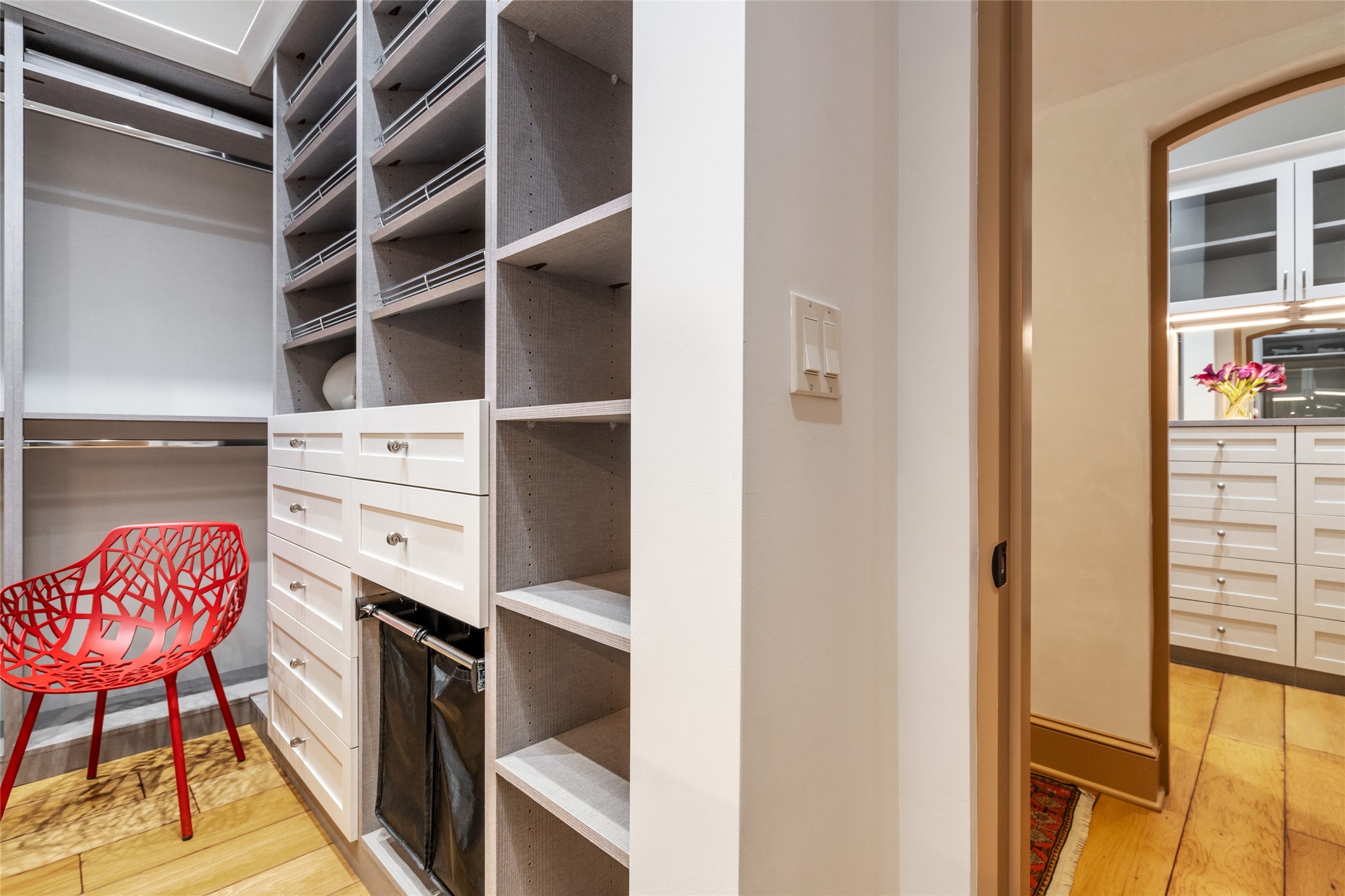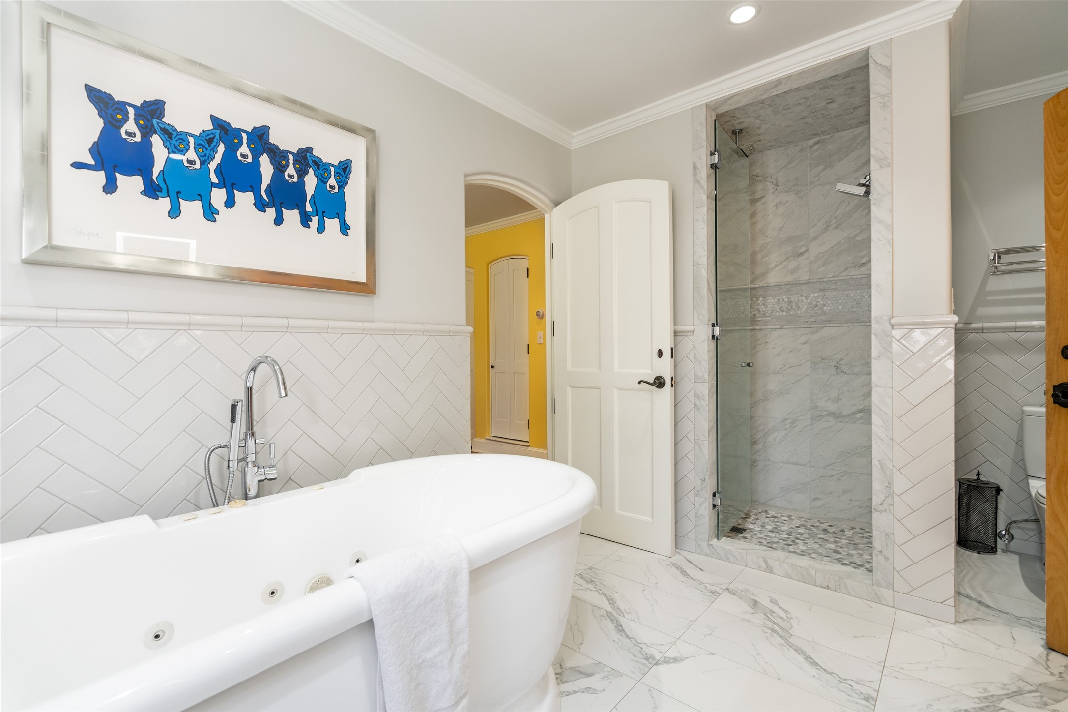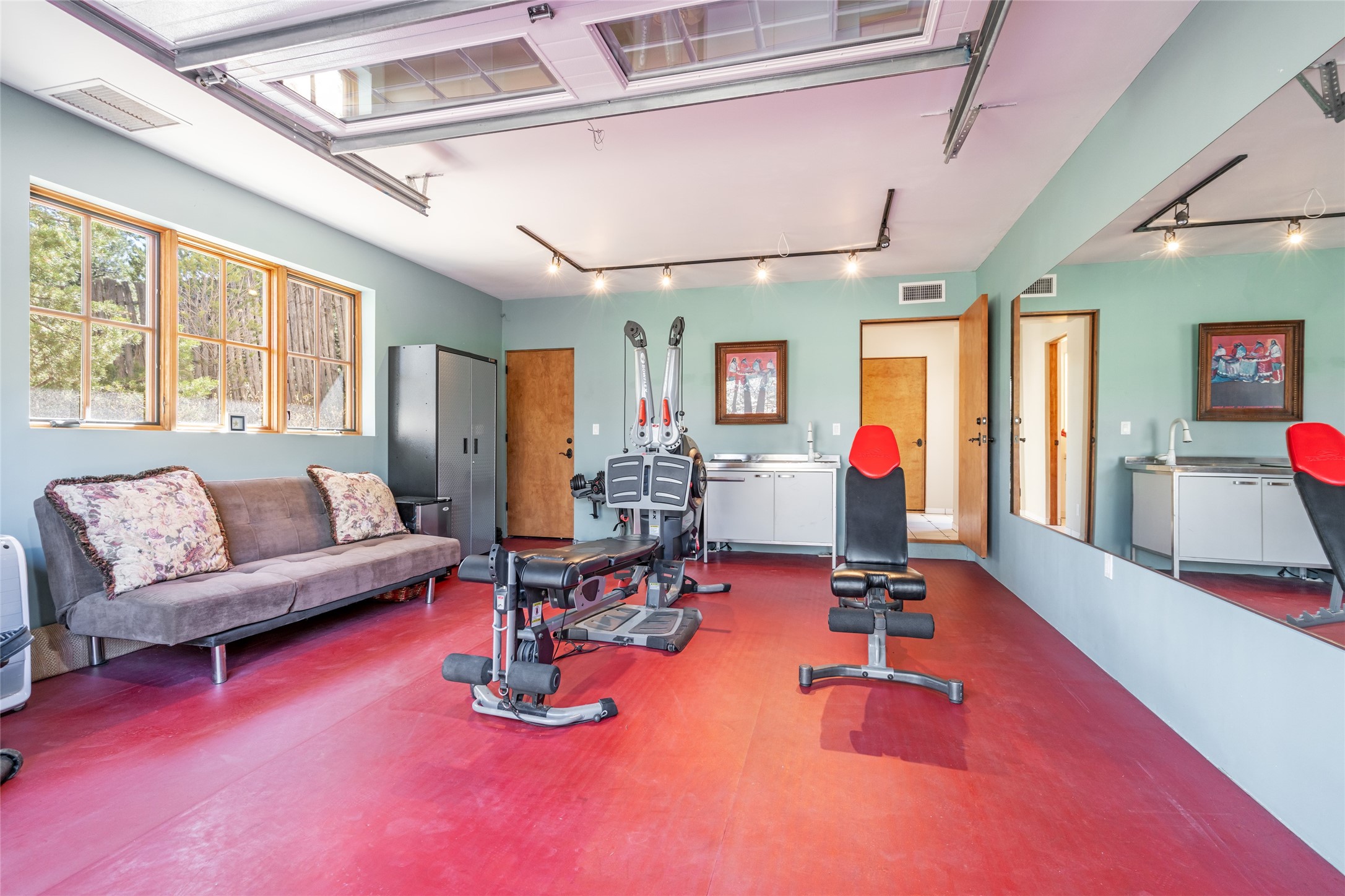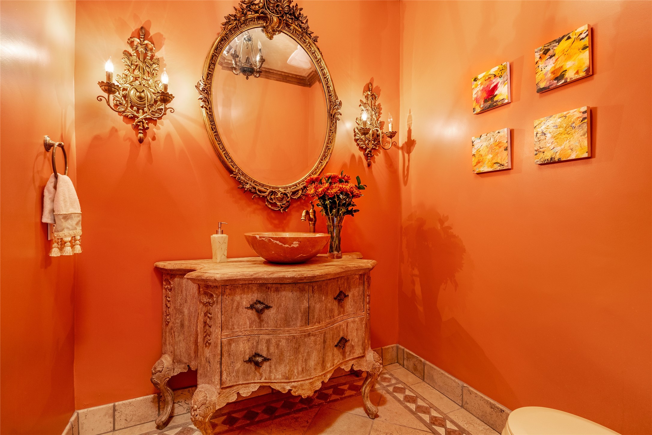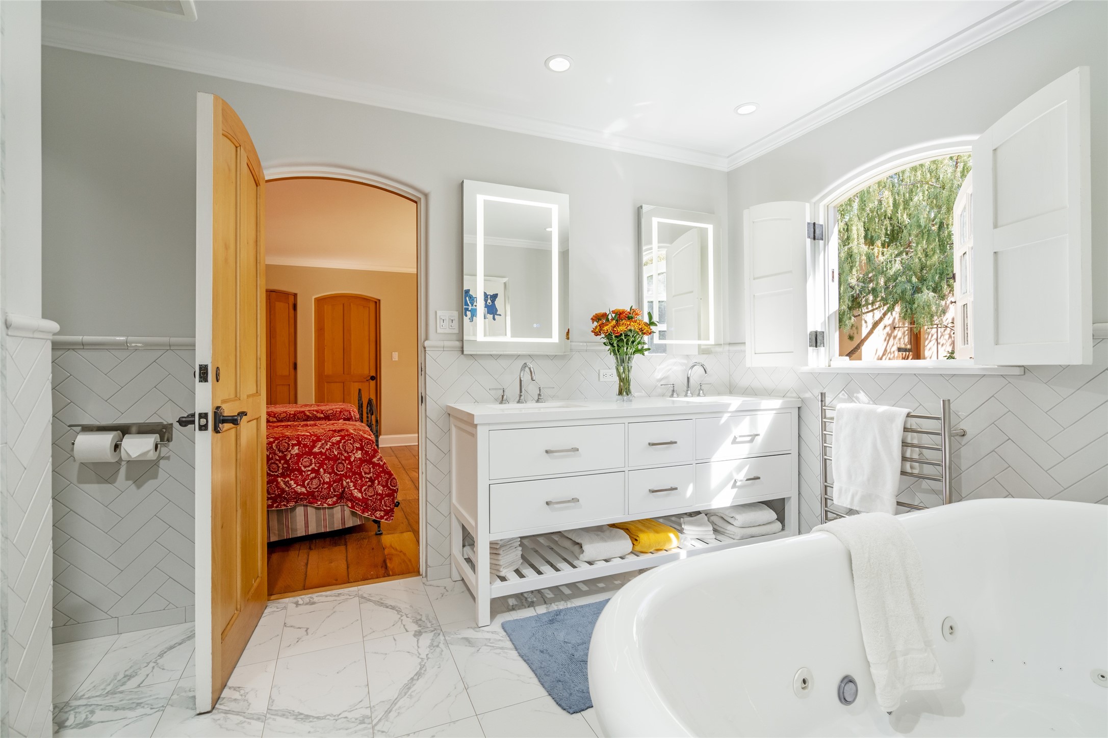 Elegant gated Eastside estate, situated on just over 1.8 acres of mature lush gardens, with a main house and separate guest house over the 3-car garage. European style features include extensive use of stone, hand-troweled pigmented plaster walls, hand-made tiles, custom stenciling, beamed ceilings, custom windows and hardware, hardwood hickory floors, and grand fireplaces. The gracious living room is enhanced by French doors and windows, and is located directly across the private central courtyard from the family room. An inviting formal dining room is the perfect place to share a lovely meal. Informal dining is available in the breakfast room just off the spacious well-equipped kitchen. The luxurious primary suite offers a sitting room or office with a large fireplace, two well-appointed custom-designed walk-in closets, and a spa-inspired bath with separate soaking tub and tiled steam shower. Two guest rooms, each with outdoor access, are set apart down a private hallway. The al fresco dining area, with fantastic mountain views, connects the primary residence with the garage spaces and guest house. The guest house provides the flexibility for a private home office. Captivating grounds with flagstone pathways, terraces and multiple courtyards are irrigated by the private well, which also serves the residences. The property is enveloped by views of the Sangre de Cristo Mountains and foothills. Close to recreation and schools; less than a mile from Canyon Road.