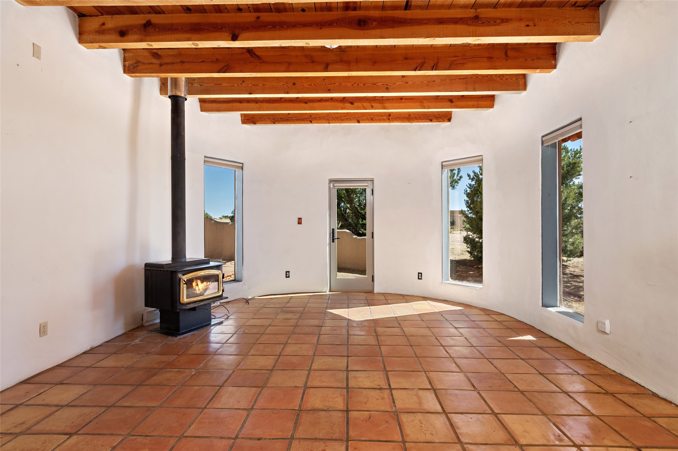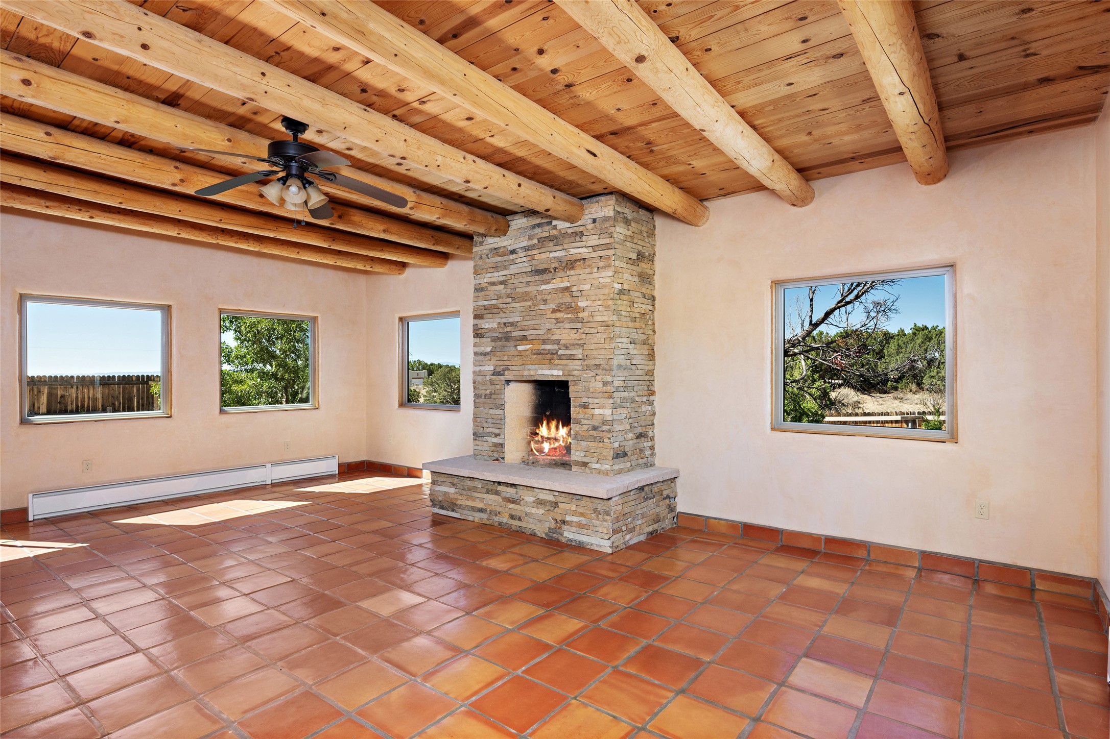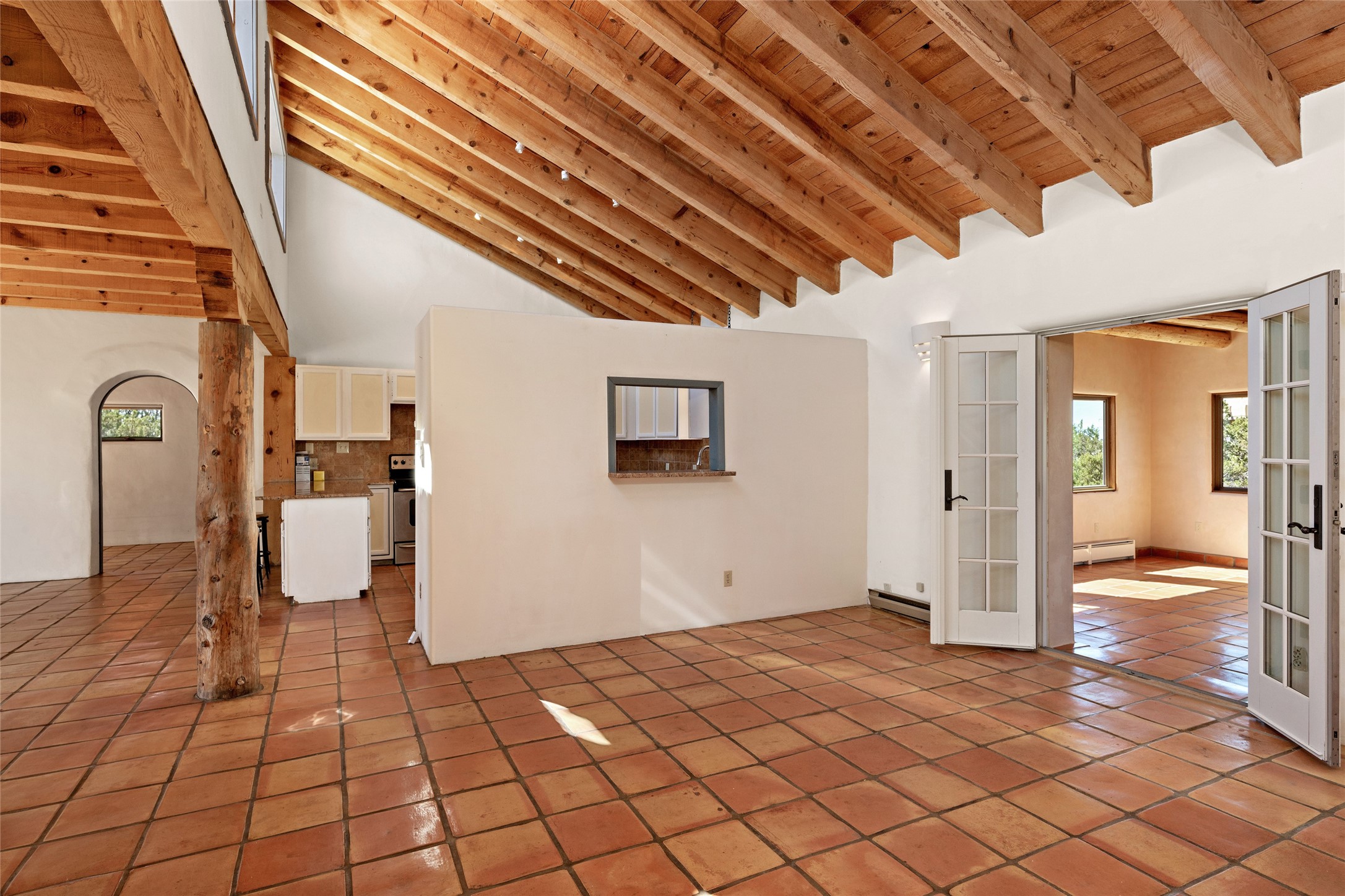 GRAB THIS DEAL! SINGLE OWNER - "As Is" passive solar charmer with views, privacy, wide open floorplan all located on a cul-de-sac and near a greenbelt. Spacious kitchen with great storage and two generous living areas, one opens to living and dining rooms and the other behind french doors with a stacked stone wood-burning fireplace. Beautiful beamed ceilings and Saltillo tile throughout. Nice bedroom separation. Primary bedroom has large walk-in closet. Updated guest bath. Walled front courtyard with Kiva fireplace and large fully fenced backyard. Lot corners have been flagged. Septic inspection in supplements. Two steps down to primary bedroom, one step down to den. Two woodstoves - one in primary bedroom and one in great room. New water heater in 2017. There is an evaporative cooler - seller does not guarantee functionality. Most exterior walls and some interior walls are Adobe or block. If of material interest, buyer is encouraged to determine. Super clean and ready to go!