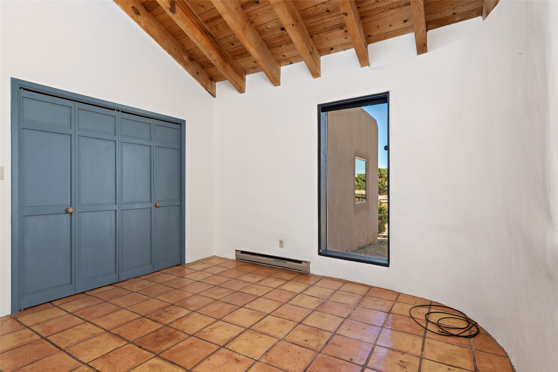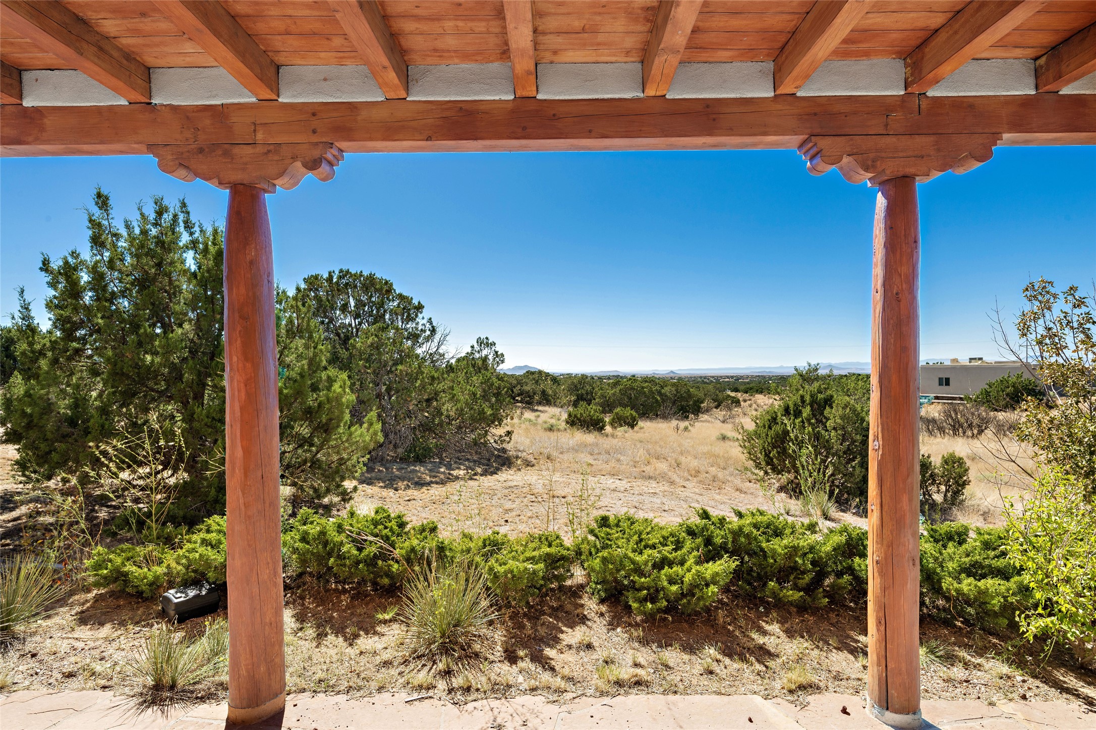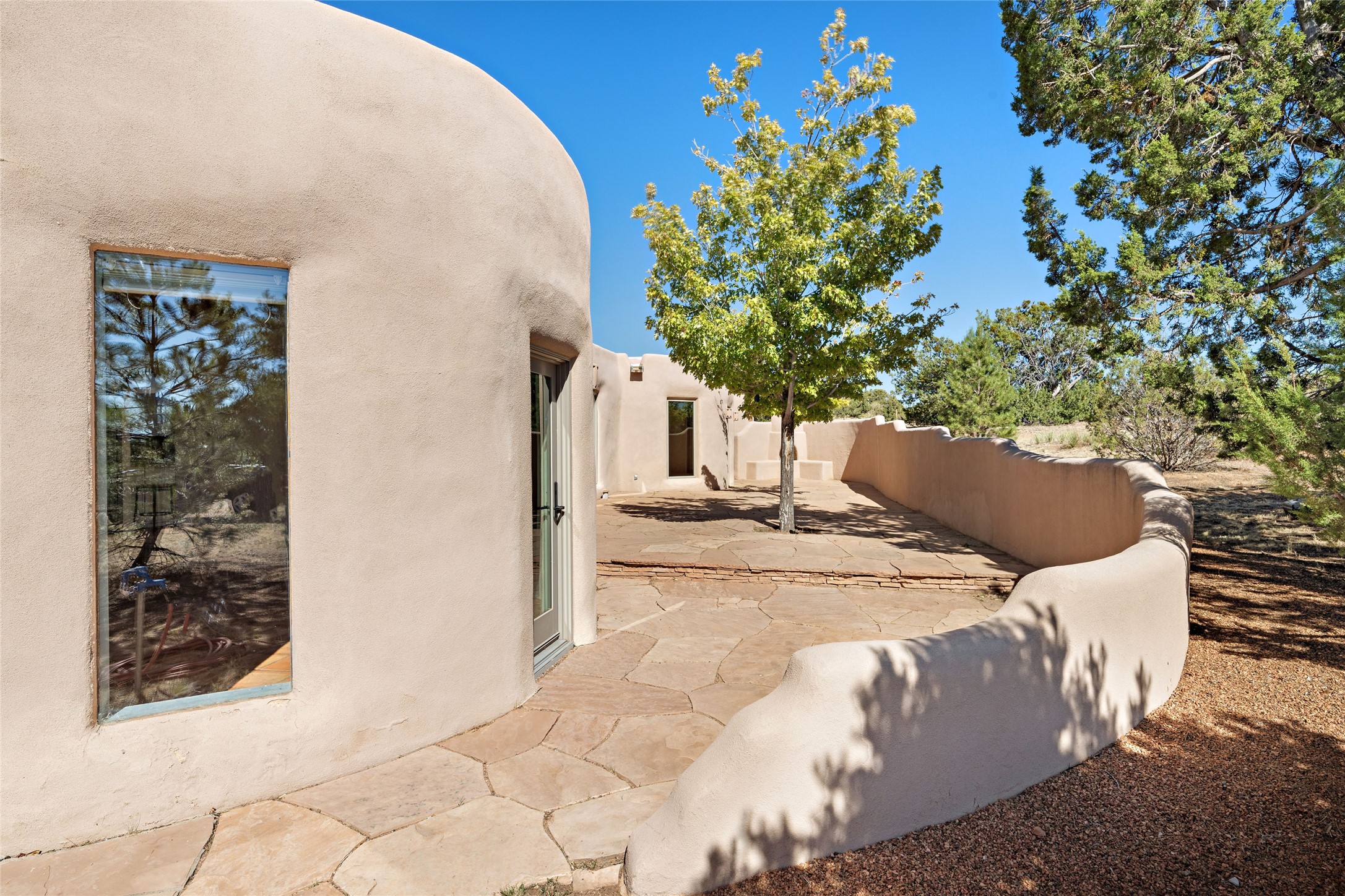 GRAB THIS DEAL! SINGLE OWNER - "As Is" passive solar charmer with views, privacy, wide open floorplan all located on a cul-de-sac and near a greenbelt. Spacious kitchen with great storage and two generous living areas, one opens to living and dining rooms and the other behind french doors with a stacked stone wood-burning fireplace. Beautiful beamed ceilings and Saltillo tile throughout. Nice bedroom separation. Primary bedroom has large walk-in closet. Updated guest bath. Walled front courtyard with Kiva fireplace and large fully fenced backyard. Lot corners have been flagged. Septic inspection in supplements. Two steps down to primary bedroom, one step down to den. Two woodstoves - one in primary bedroom and one in great room. New water heater in 2017. There is an evaporative cooler - seller does not guarantee functionality. Most exterior walls and some interior walls are Adobe or block. If of material interest, buyer is encouraged to determine. Super clean and ready to go!