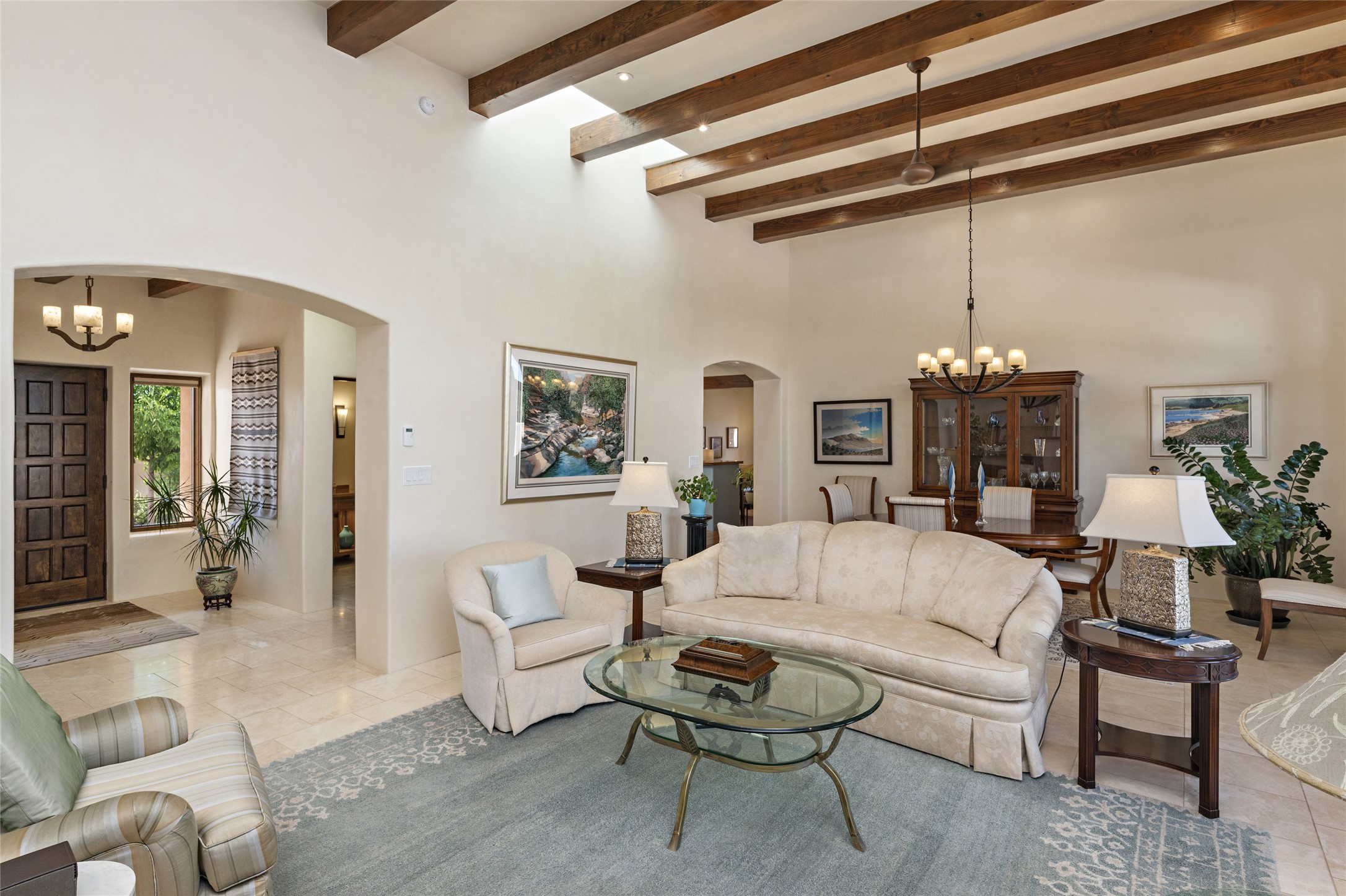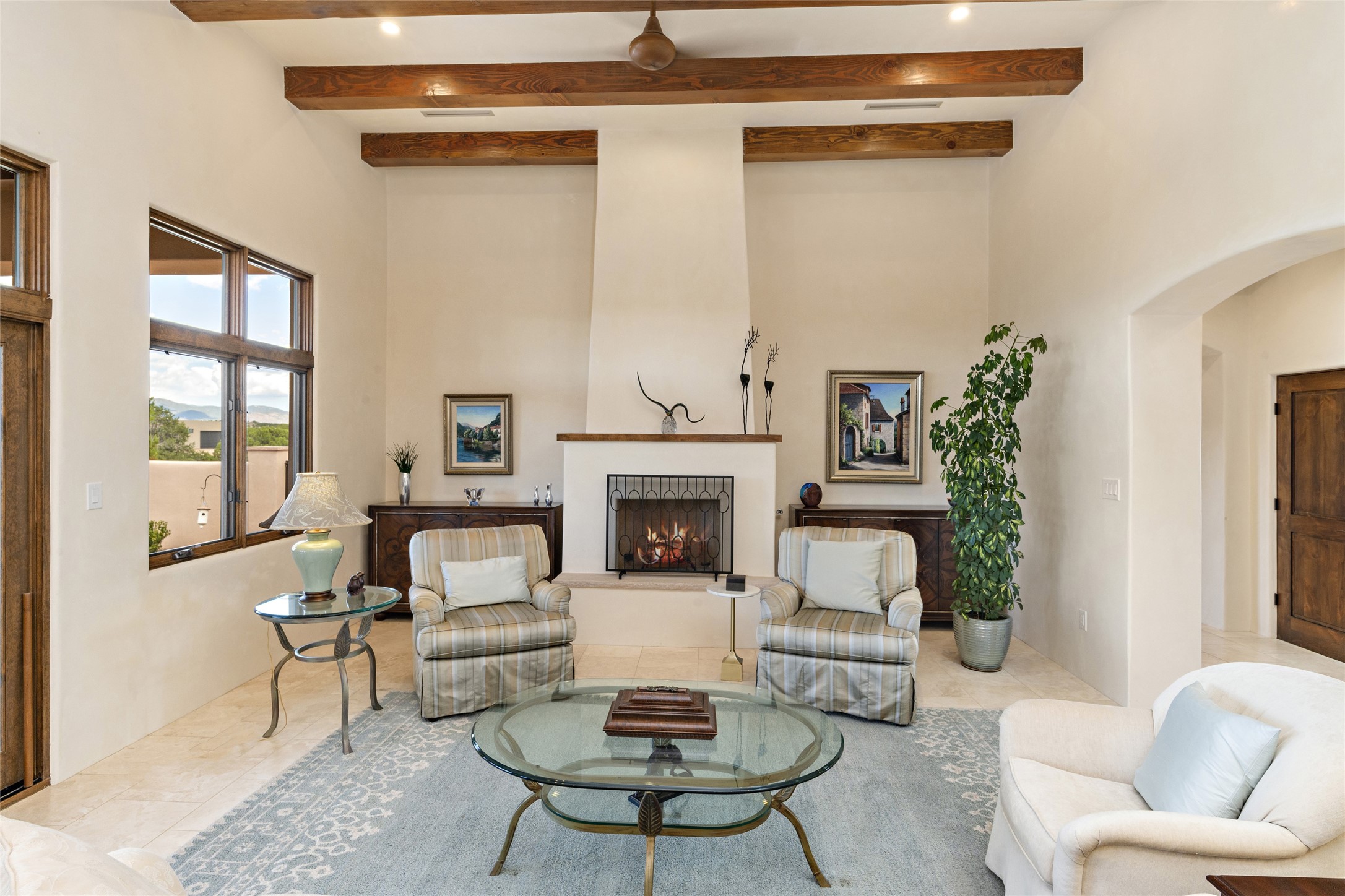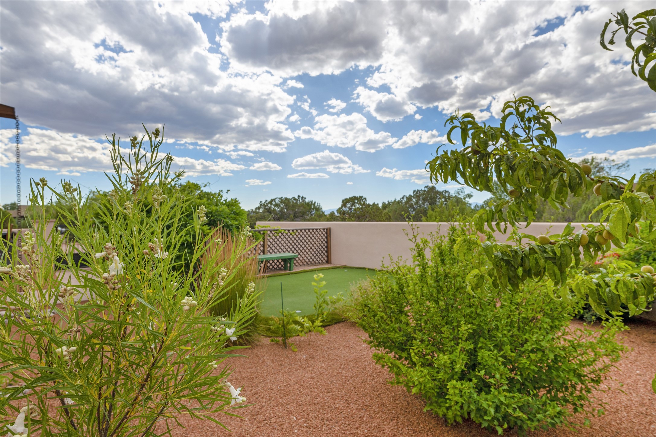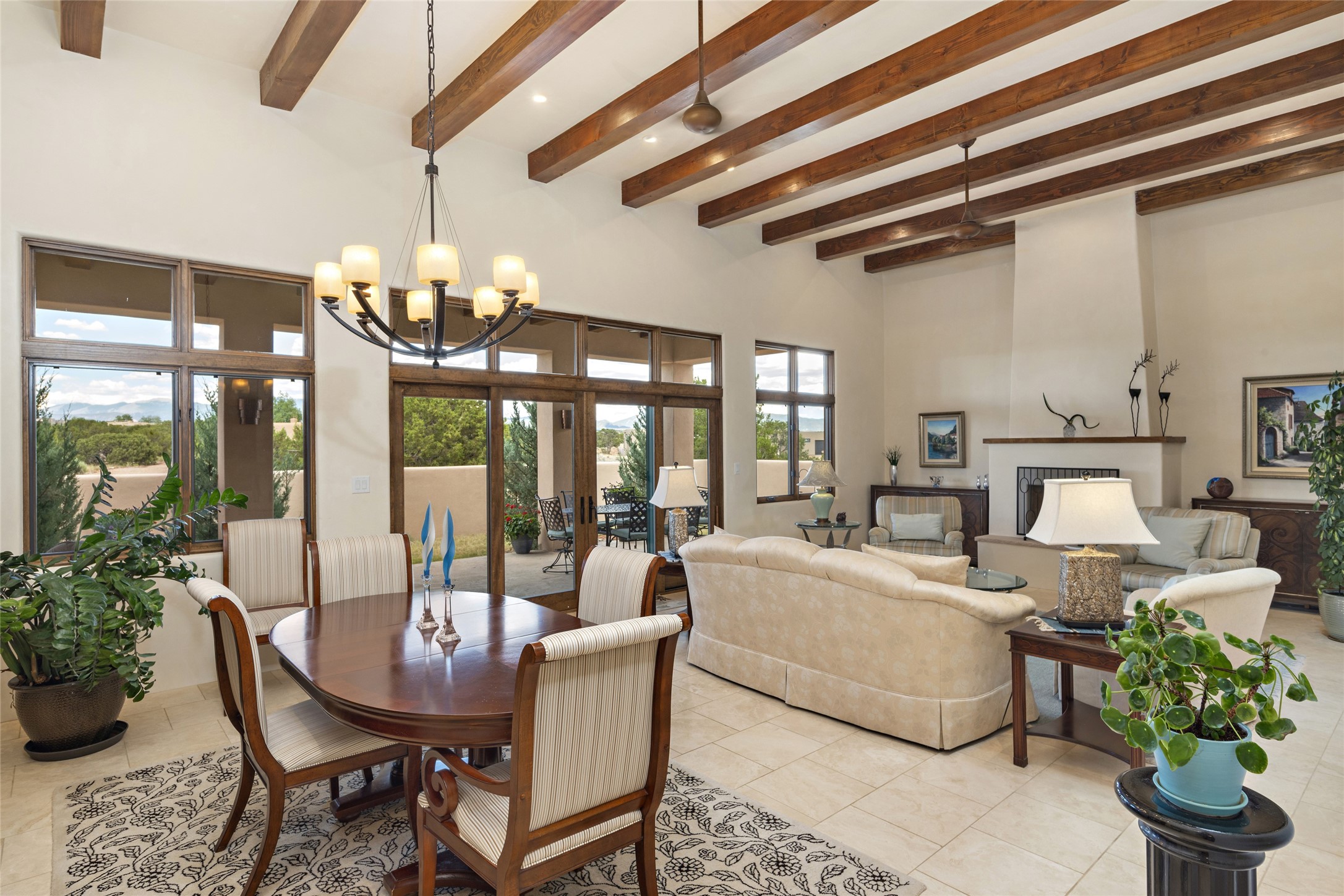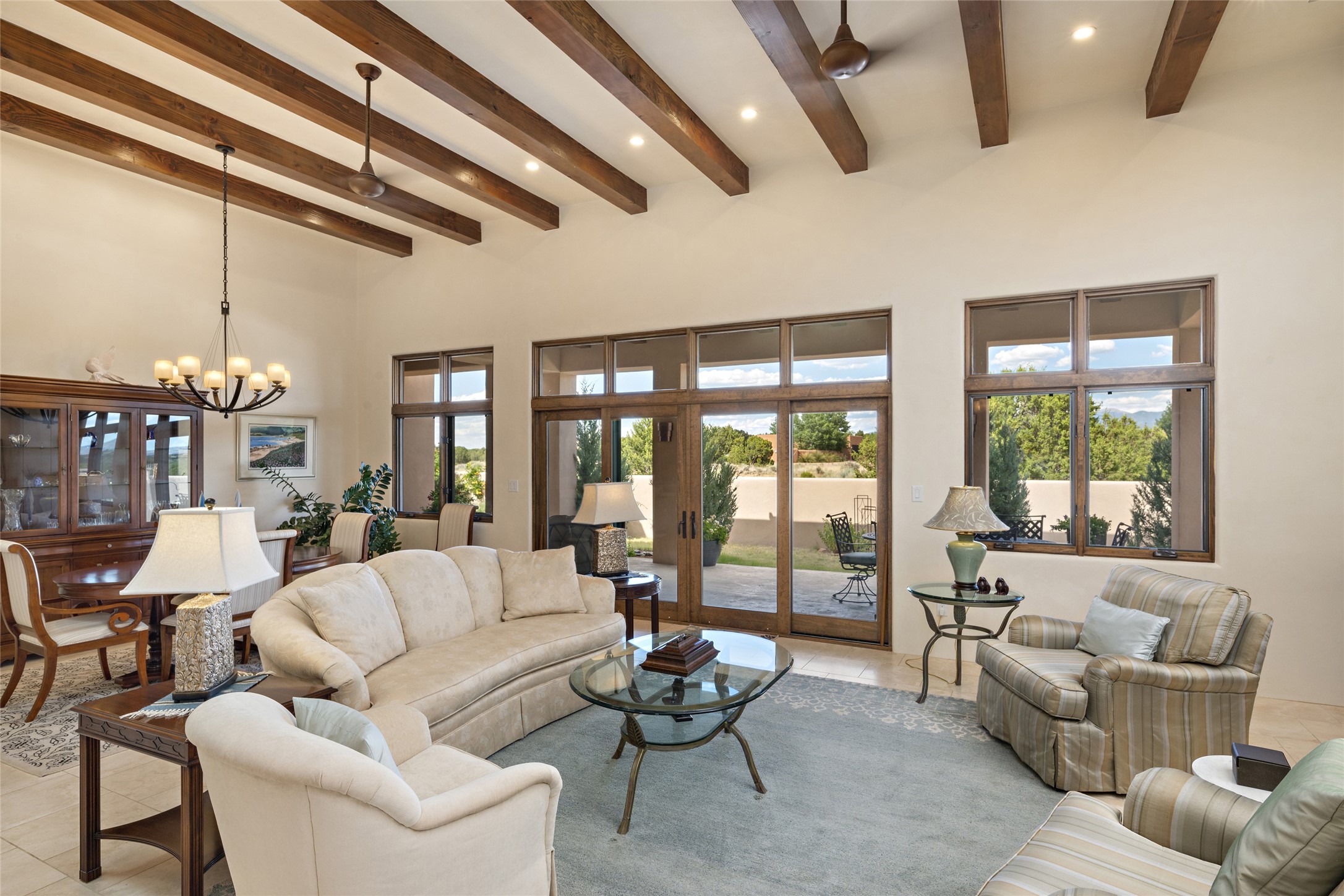 This thoughtfully designed, custom-built home with beautiful views of the Sangre de Cristo Mountains is located in the Sierra Rosa Loop enclave on a private cul-de-sac in Las Campanas. Owner-built and lightly lived-in, the property has been meticulously maintained. A lovely landscaped entrance entrance welcomes visitors to a front vestibule and beckons entry to the open living/dining area with high ceilings and access to the outdoor east facing portal. The large gourmet kitchen is complete with high-end appliances and a large center island, ideal for entertaining, and opens to the family area and north-facing portal with a miniature practice putting green. The separation of the primary bedroom and guest bedroom wings is ideal. Located off the family area is an office and the generous primary bedroom/spa bath with a large walk-in closet and convenient to the laundry room. The guest wing is on the opposite side of the home and each guest bedroom is ensuite with a shared breakfast bar area. Outdoor spaces are irrigated with manicured landscaping and there are partial views to the Jemez Mountains. 15 minutes to the Sante Fe Plaza and the Santa Fe Airport. Memberships to the Club at Las Campanas are optional and available for purchase upon approval.