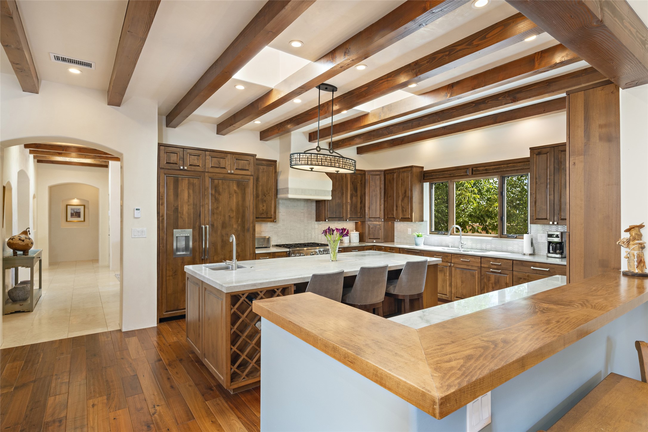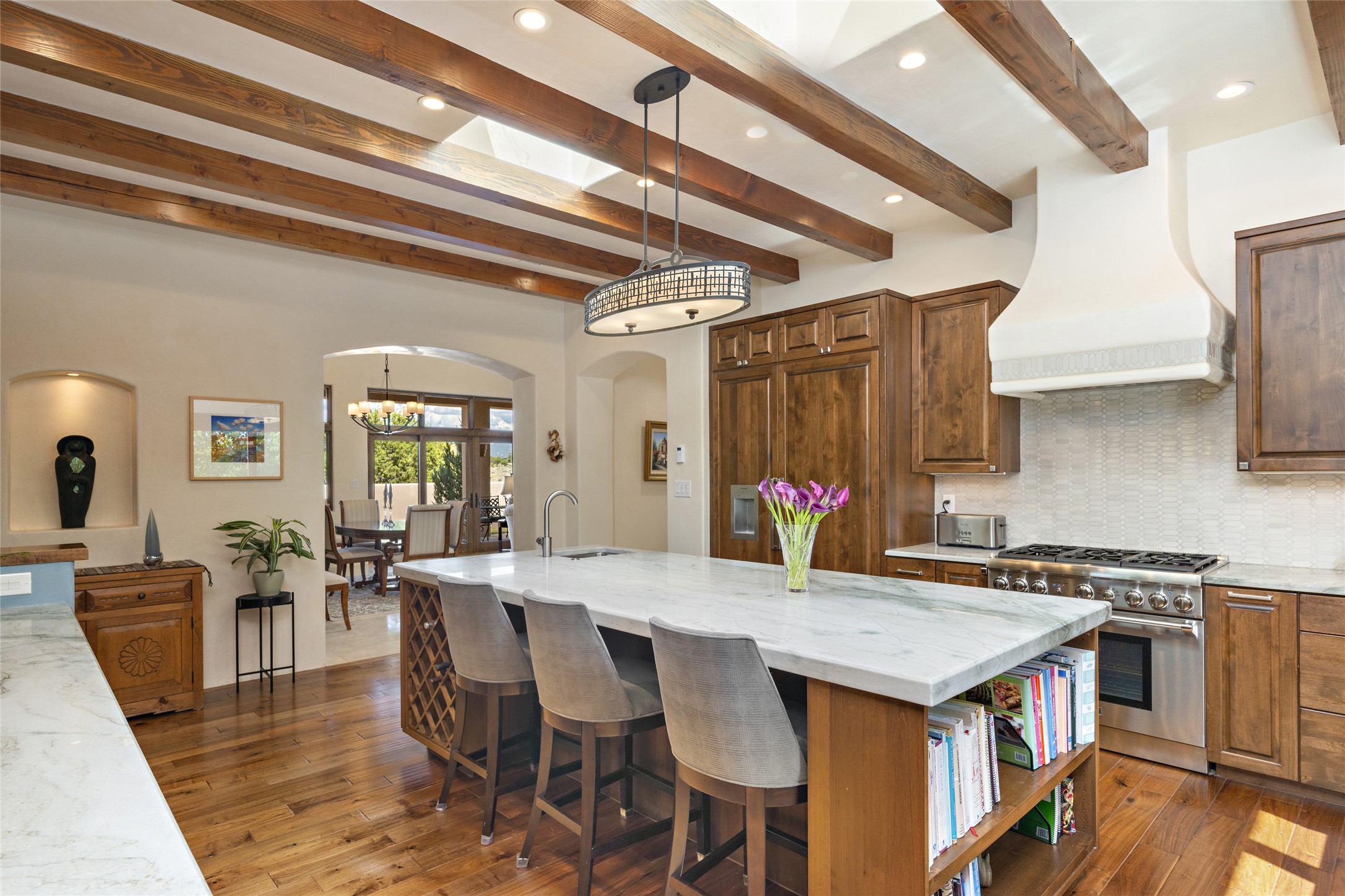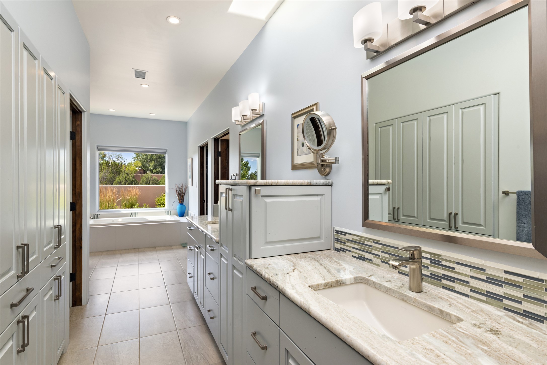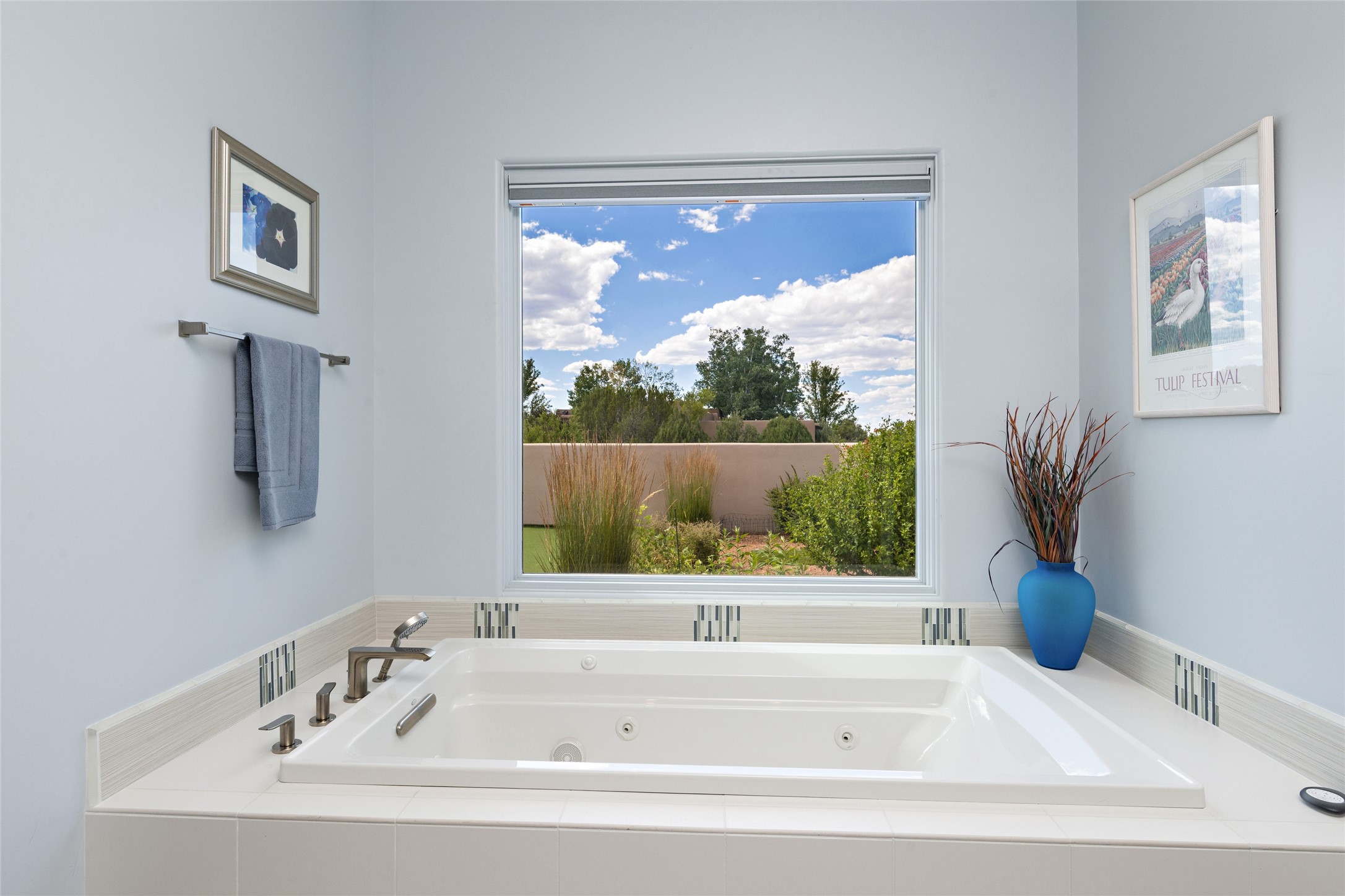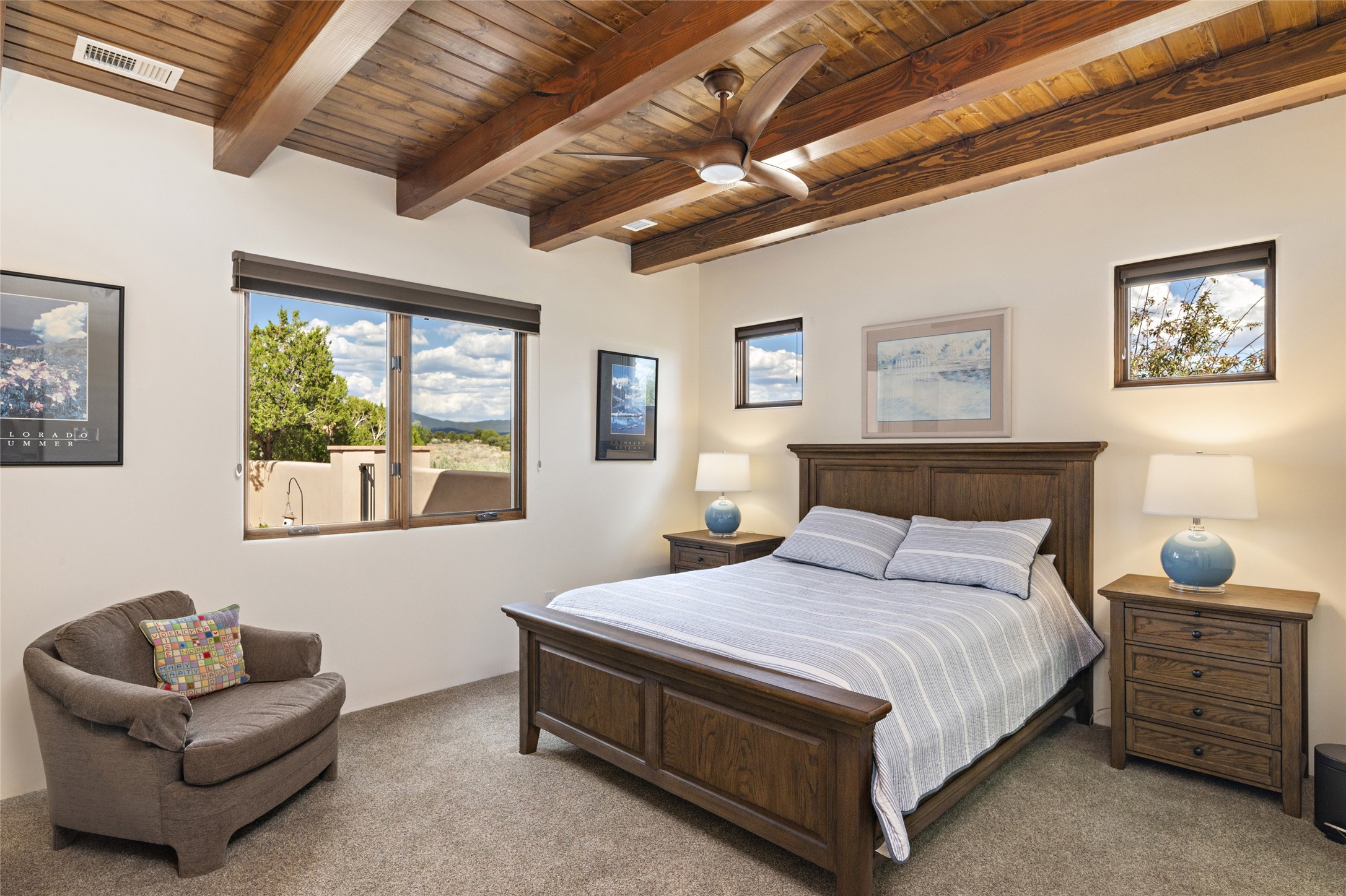This thoughtfully designed, custom-built home with beautiful views of the Sangre de Cristo Mountains is located in the Sierra Rosa Loop enclave on a private cul-de-sac in Las Campanas. Owner-built and lightly lived-in, the property has been meticulously maintained. A lovely landscaped entrance entrance welcomes visitors to a front vestibule and beckons entry to the open living/dining area with high ceilings and access to the outdoor east facing portal. The large gourmet kitchen is complete with high-end appliances and a large center island, ideal for entertaining, and opens to the family area and north-facing portal with a miniature practice putting green. The separation of the primary bedroom and guest bedroom wings is ideal. Located off the family area is an office and the generous primary bedroom/spa bath with a large walk-in closet and convenient to the laundry room. The guest wing is on the opposite side of the home and each guest bedroom is ensuite with a shared breakfast bar area. Outdoor spaces are irrigated with manicured landscaping and there are partial views to the Jemez Mountains. 15 minutes to the Sante Fe Plaza and the Santa Fe Airport. Memberships to the Club at Las Campanas are optional and available for purchase upon approval.