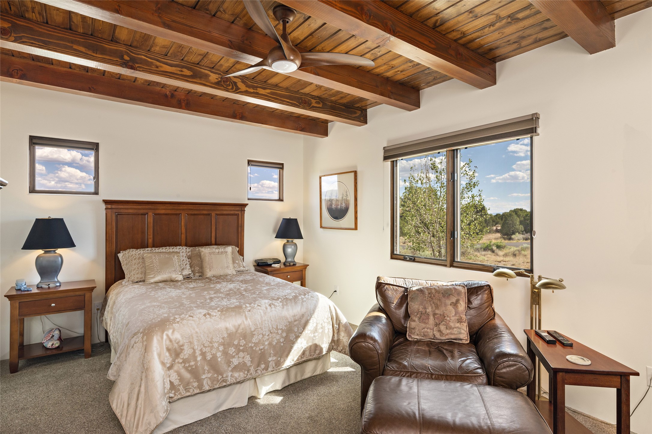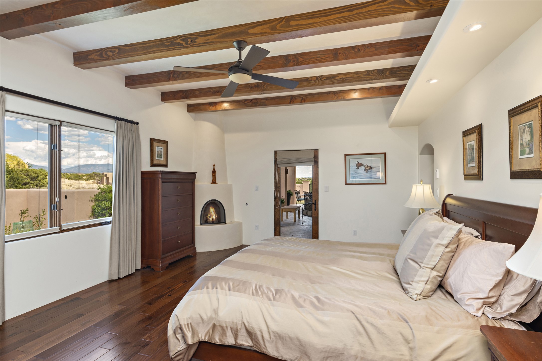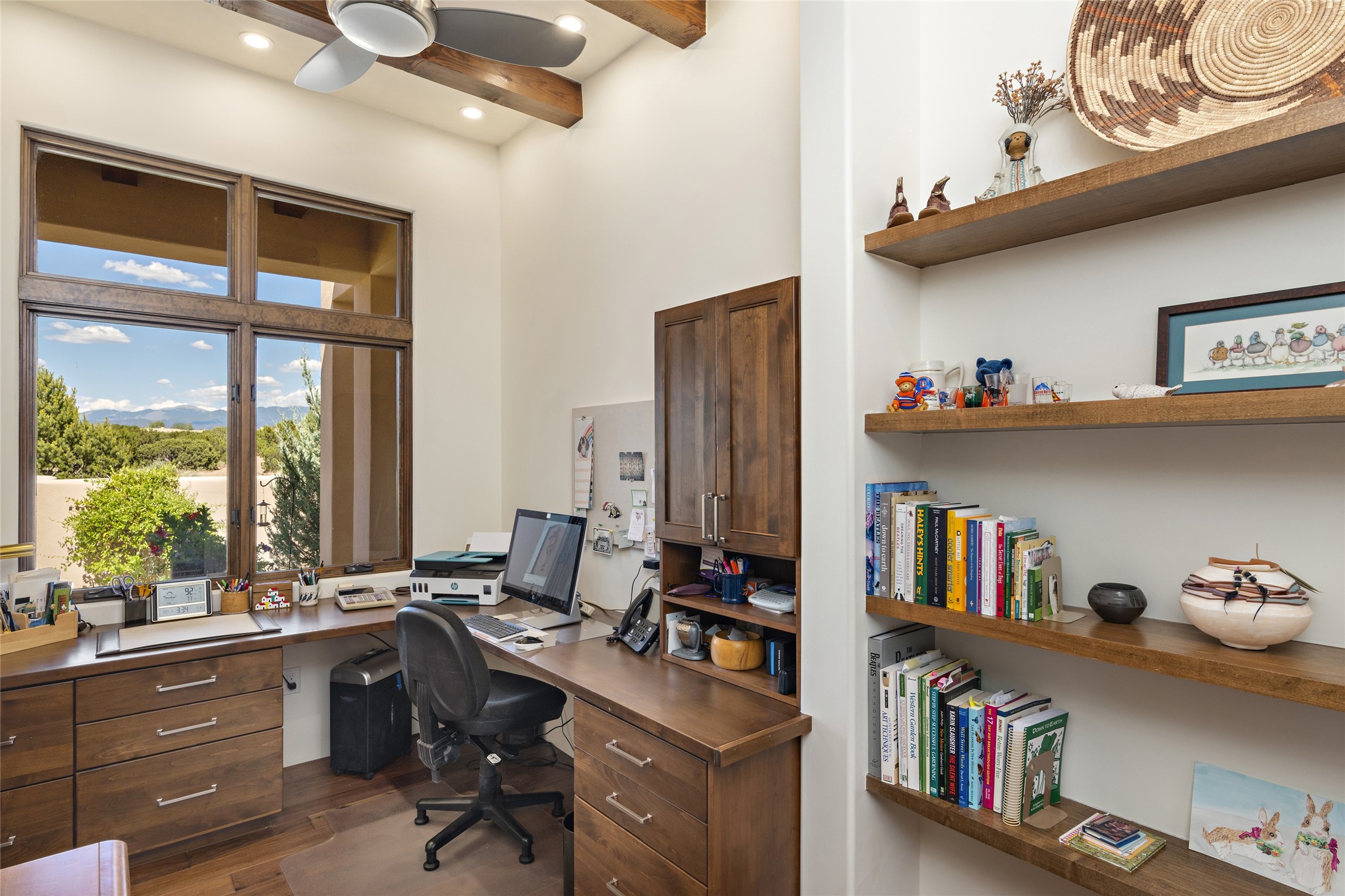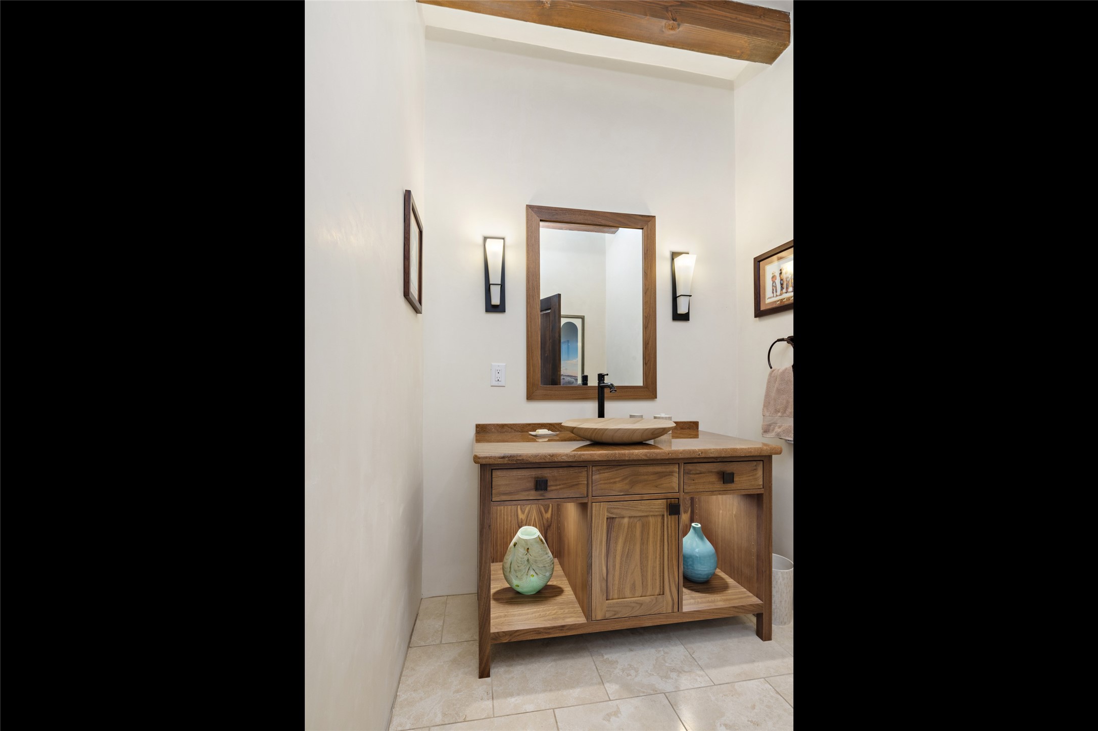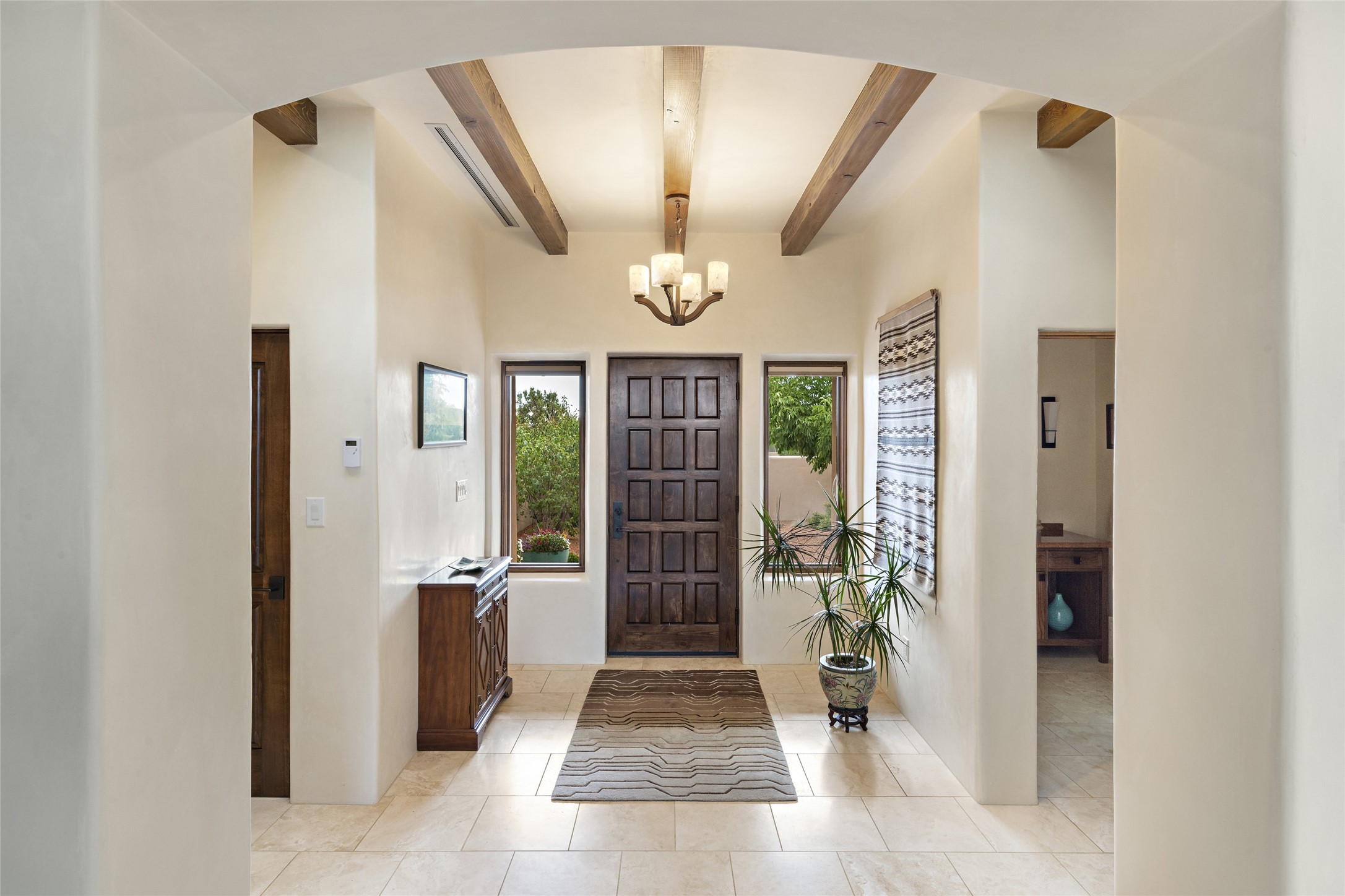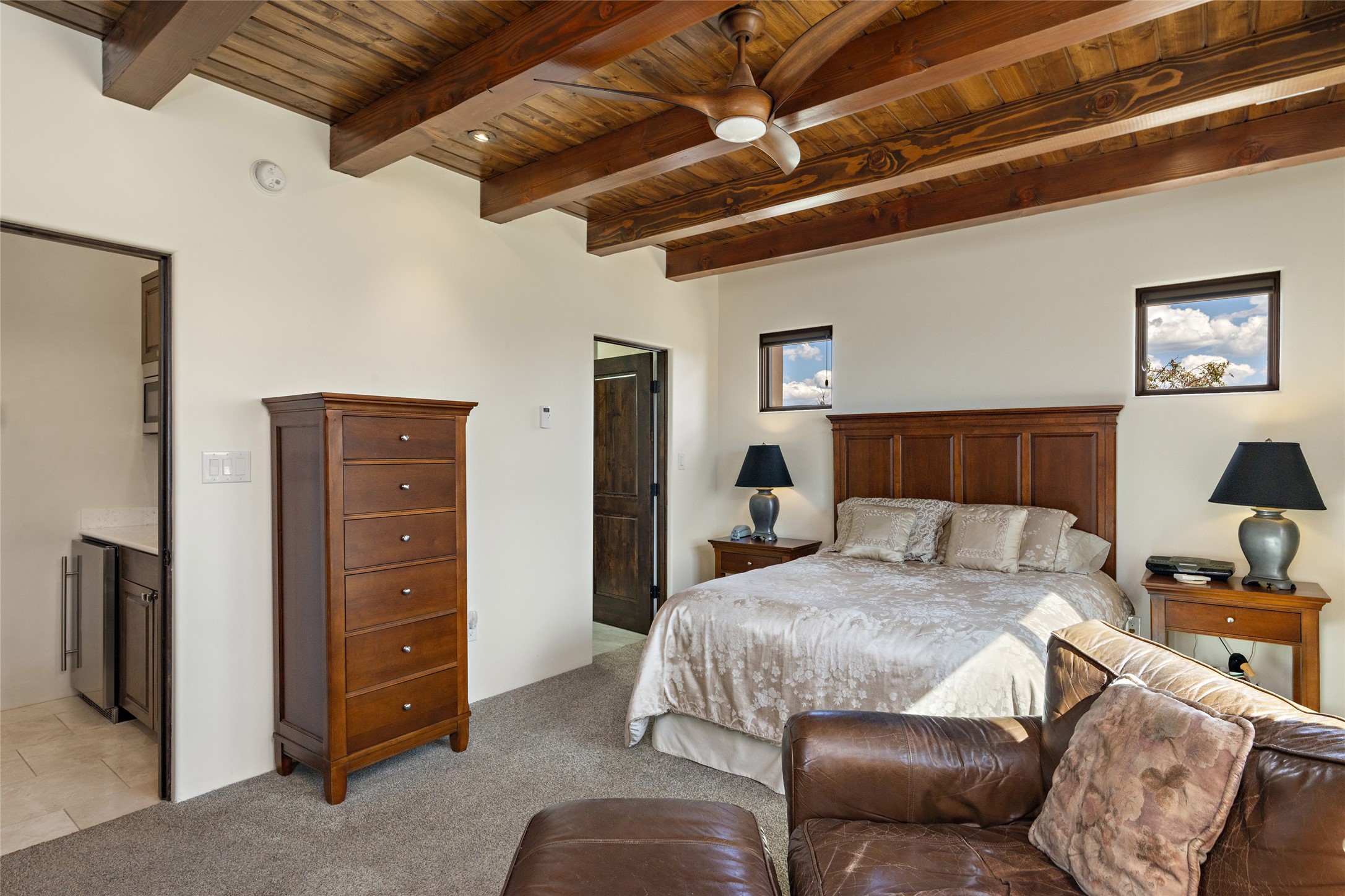 This thoughtfully designed, custom-built home with beautiful views of the Sangre de Cristo Mountains is located in the Sierra Rosa Loop enclave on a private cul-de-sac in Las Campanas. Owner-built and lightly lived-in, the property has been meticulously maintained. A lovely landscaped entrance entrance welcomes visitors to a front vestibule and beckons entry to the open living/dining area with high ceilings and access to the outdoor east facing portal. The large gourmet kitchen is complete with high-end appliances and a large center island, ideal for entertaining, and opens to the family area and north-facing portal with a miniature practice putting green. The separation of the primary bedroom and guest bedroom wings is ideal. Located off the family area is an office and the generous primary bedroom/spa bath with a large walk-in closet and convenient to the laundry room. The guest wing is on the opposite side of the home and each guest bedroom is ensuite with a shared breakfast bar area. Outdoor spaces are irrigated with manicured landscaping and there are partial views to the Jemez Mountains. 15 minutes to the Sante Fe Plaza and the Santa Fe Airport. Memberships to the Club at Las Campanas are optional and available for purchase upon approval.