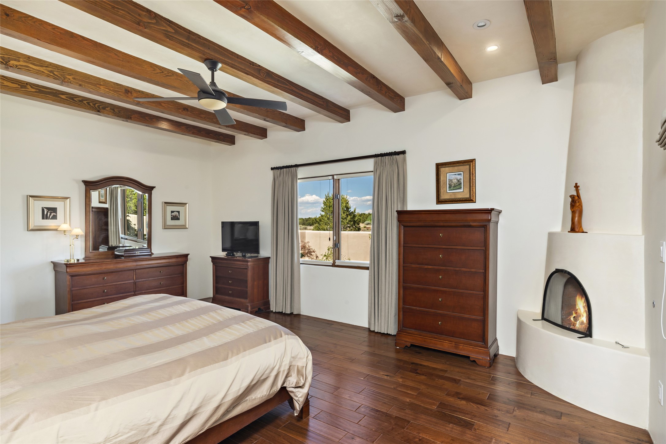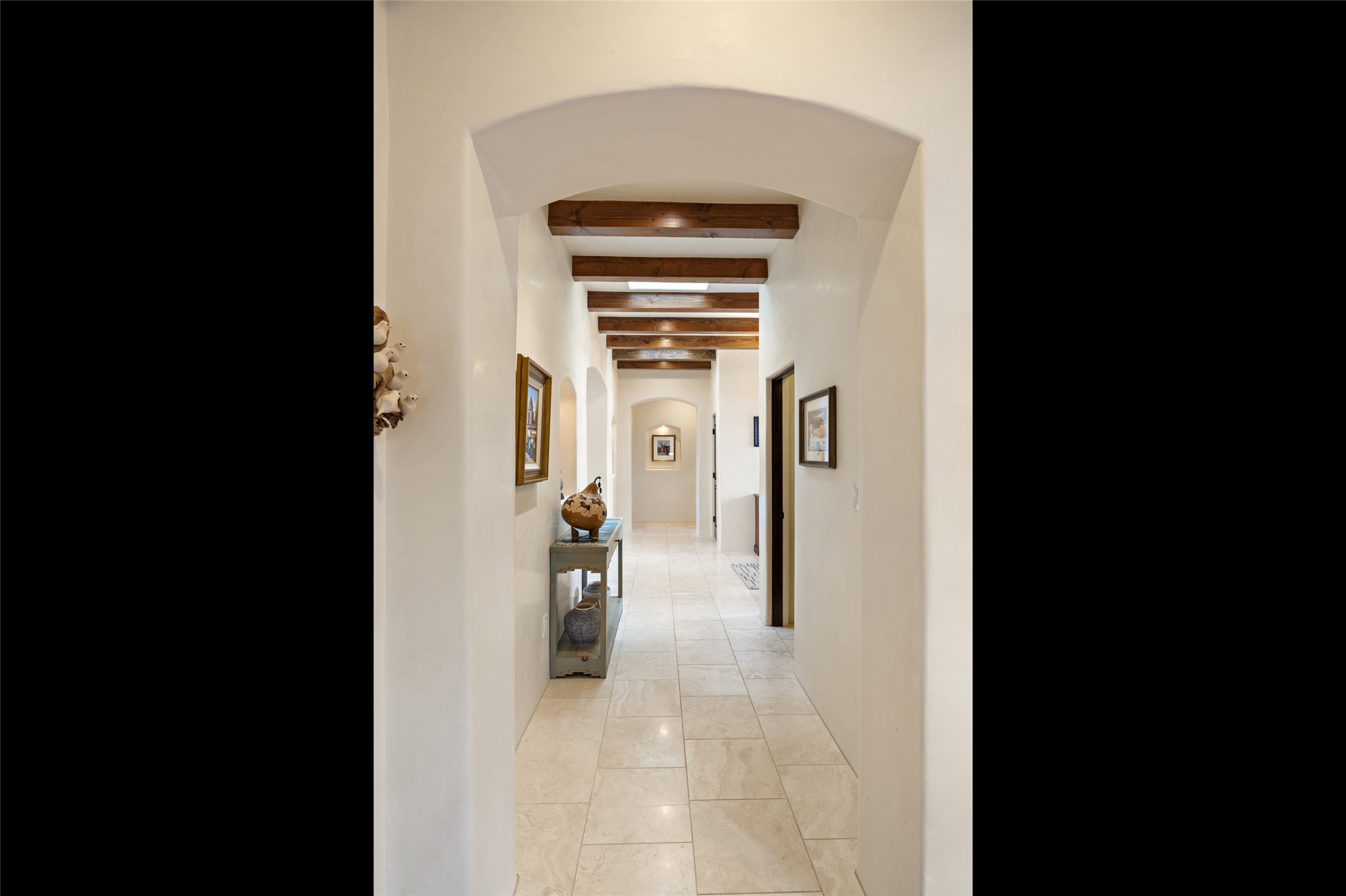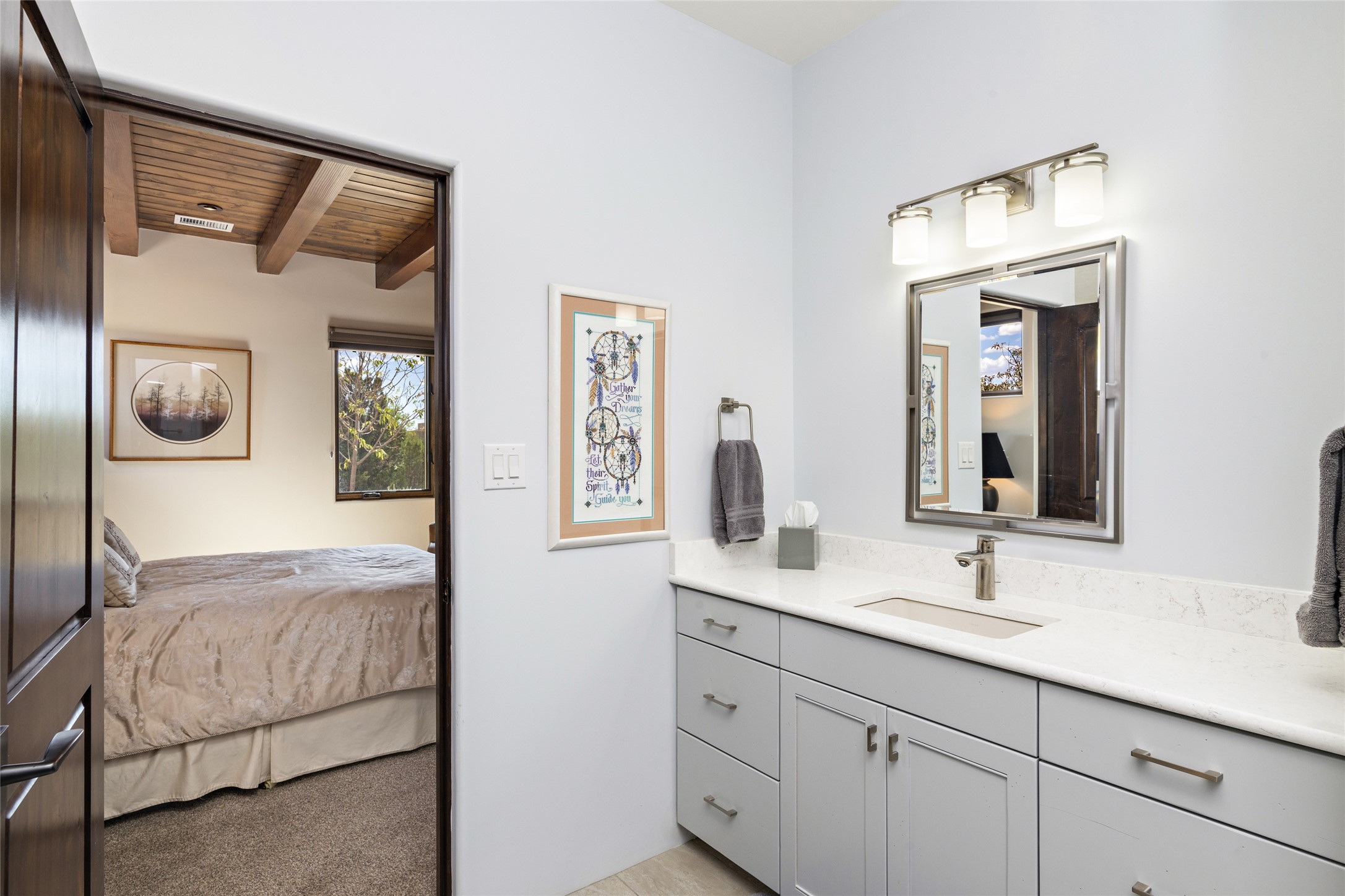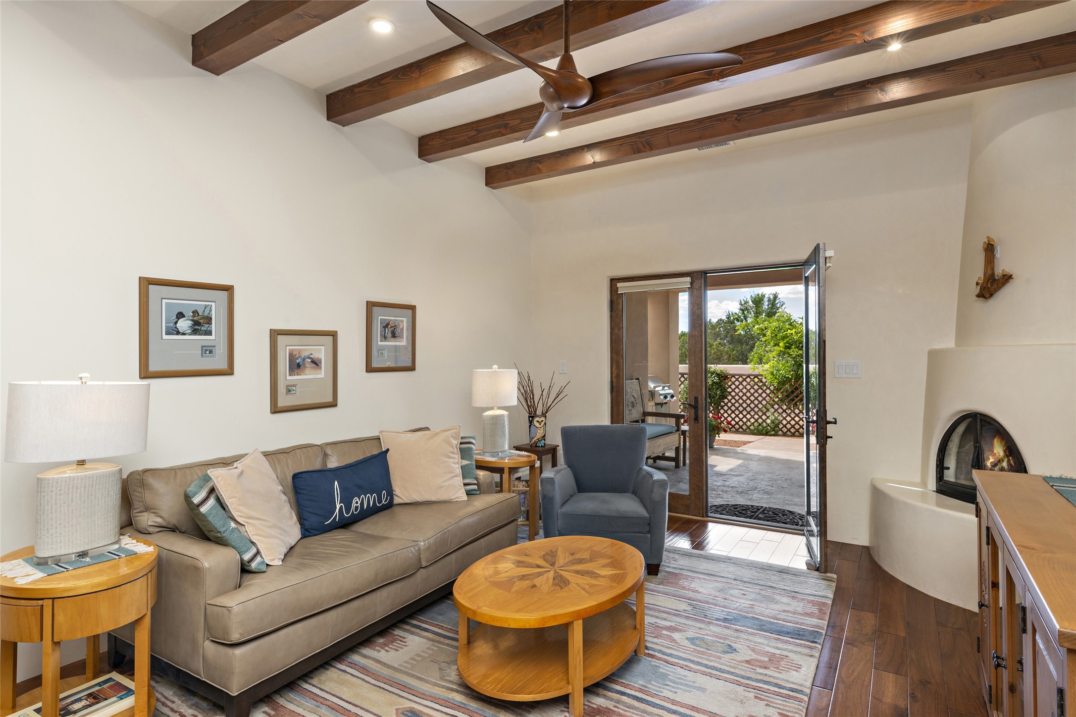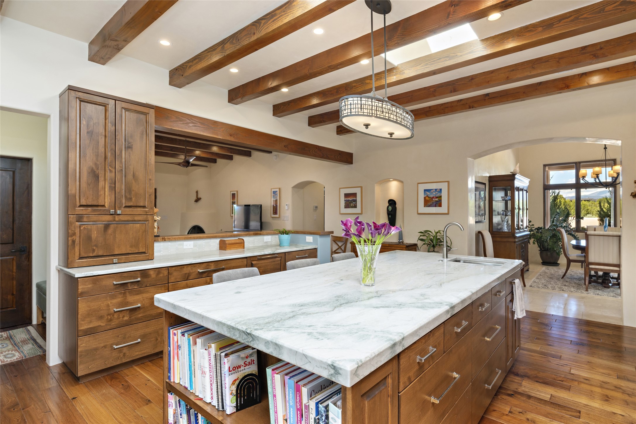 This thoughtfully designed, custom-built home with beautiful views of the Sangre de Cristo Mountains is located in the Sierra Rosa Loop enclave on a private cul-de-sac in Las Campanas. Owner-built and lightly lived-in, the property has been meticulously maintained. A lovely landscaped entrance entrance welcomes visitors to a front vestibule and beckons entry to the open living/dining area with high ceilings and access to the outdoor east facing portal. The large gourmet kitchen is complete with high-end appliances and a large center island, ideal for entertaining, and opens to the family area and north-facing portal with a miniature practice putting green. The separation of the primary bedroom and guest bedroom wings is ideal. Located off the family area is an office and the generous primary bedroom/spa bath with a large walk-in closet and convenient to the laundry room. The guest wing is on the opposite side of the home and each guest bedroom is ensuite with a shared breakfast bar area. Outdoor spaces are irrigated with manicured landscaping and there are partial views to the Jemez Mountains. 15 minutes to the Sante Fe Plaza and the Santa Fe Airport. Memberships to the Club at Las Campanas are optional and available for purchase upon approval.