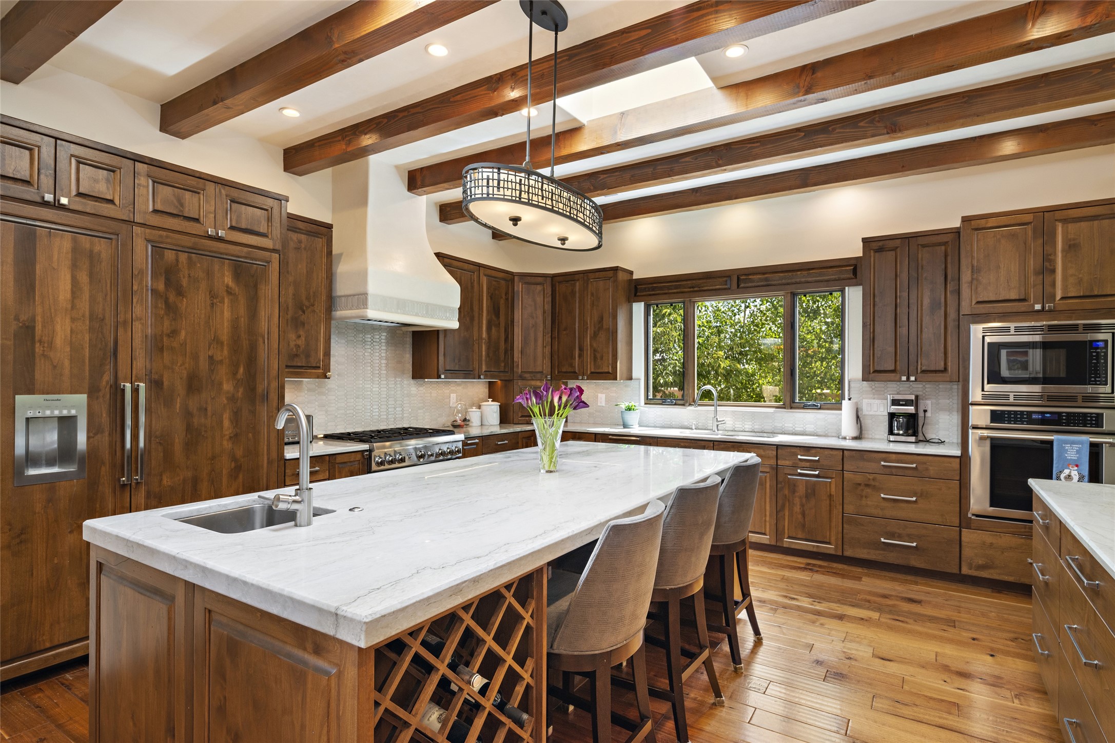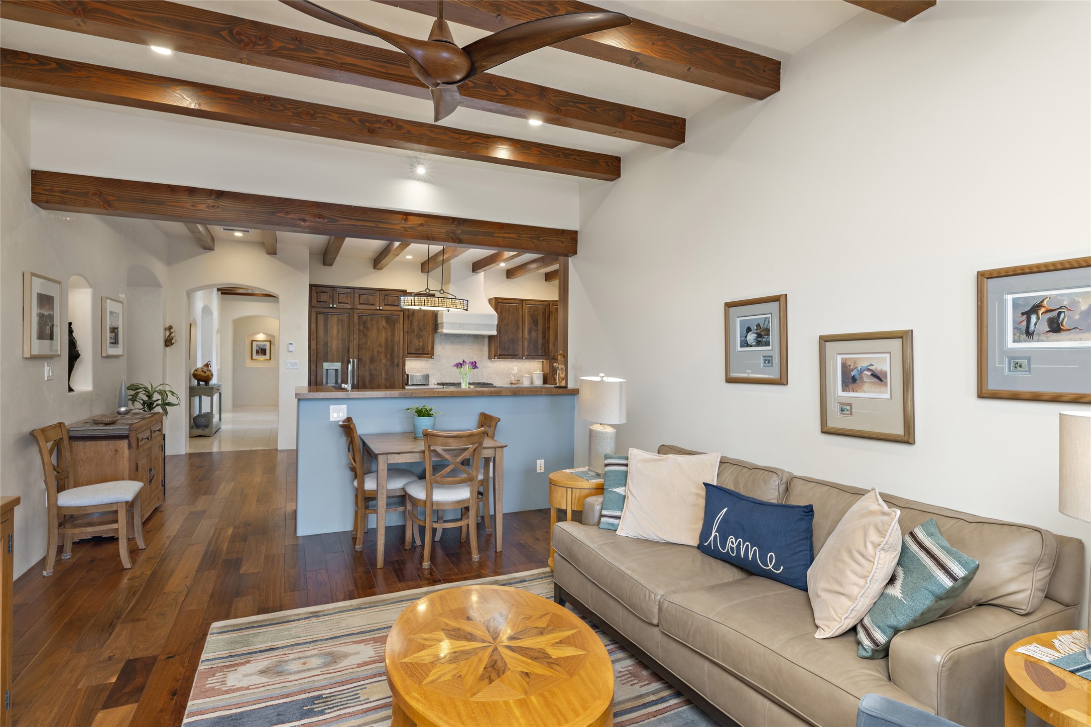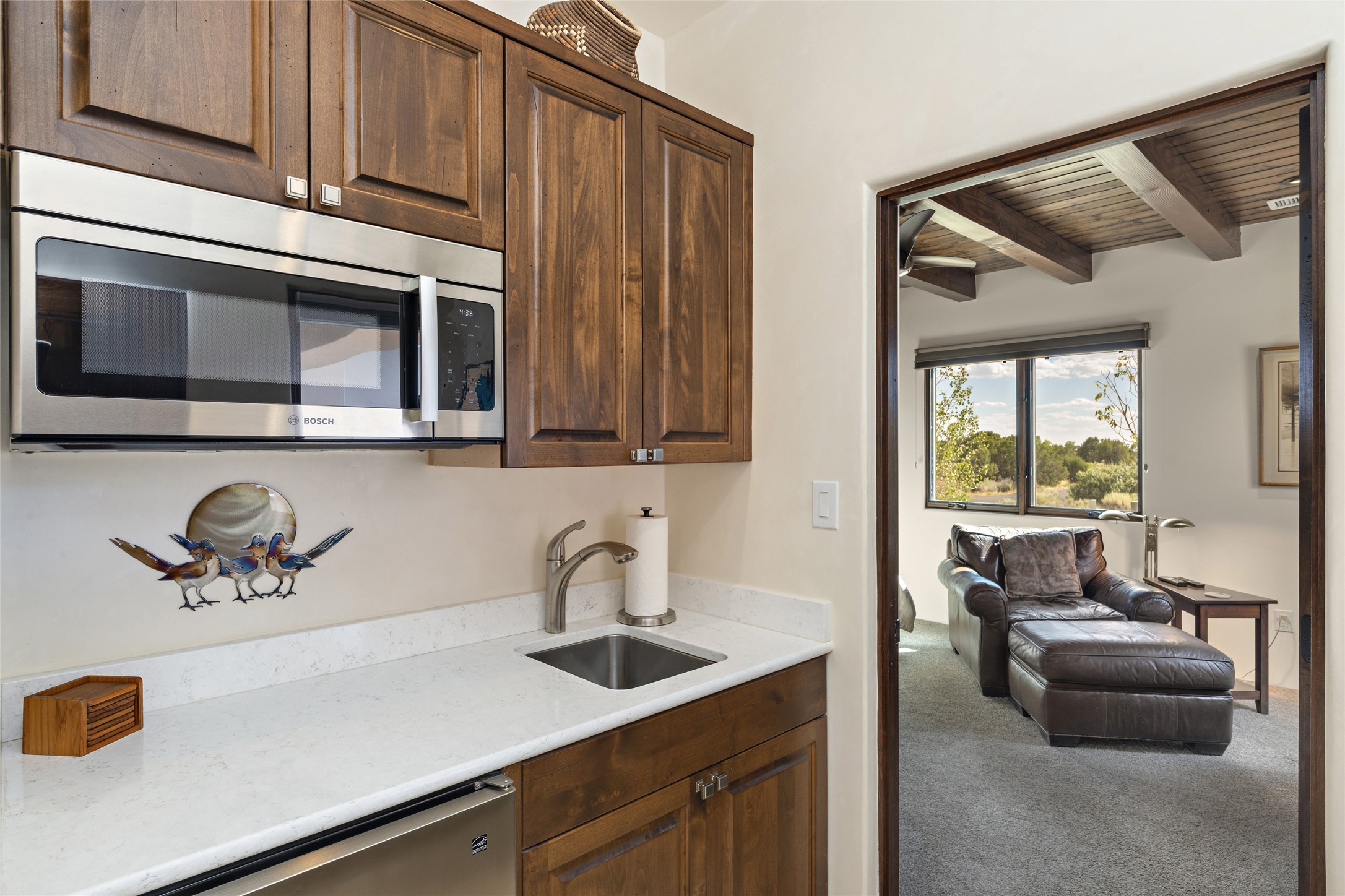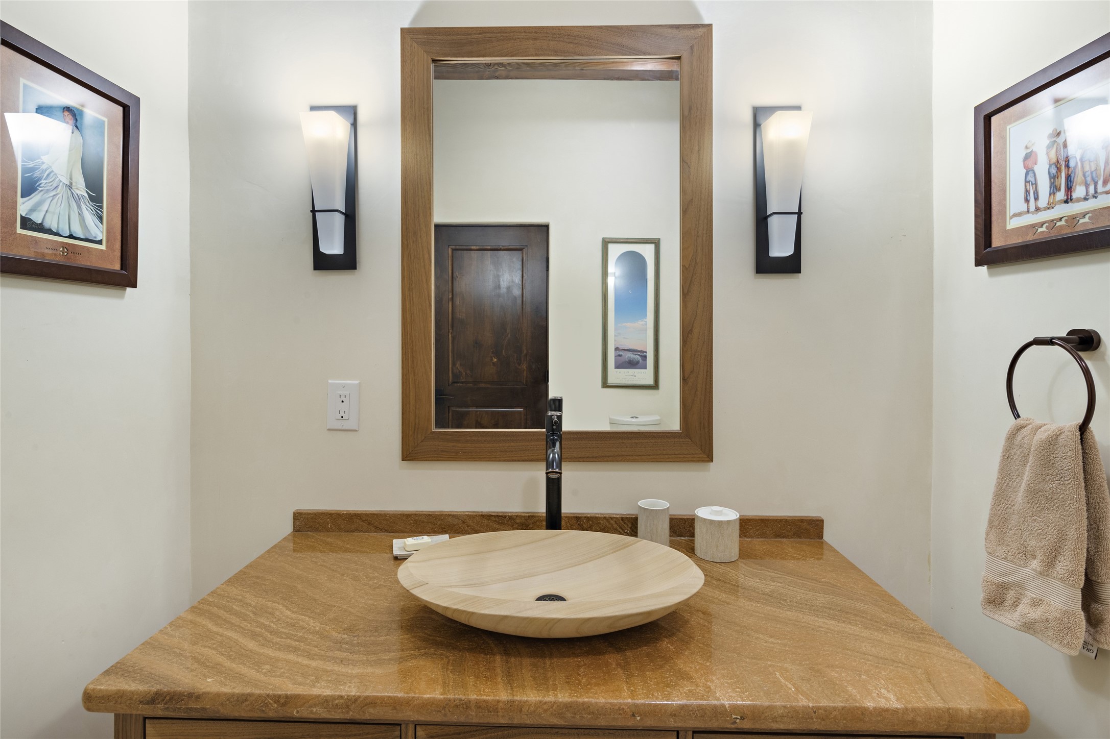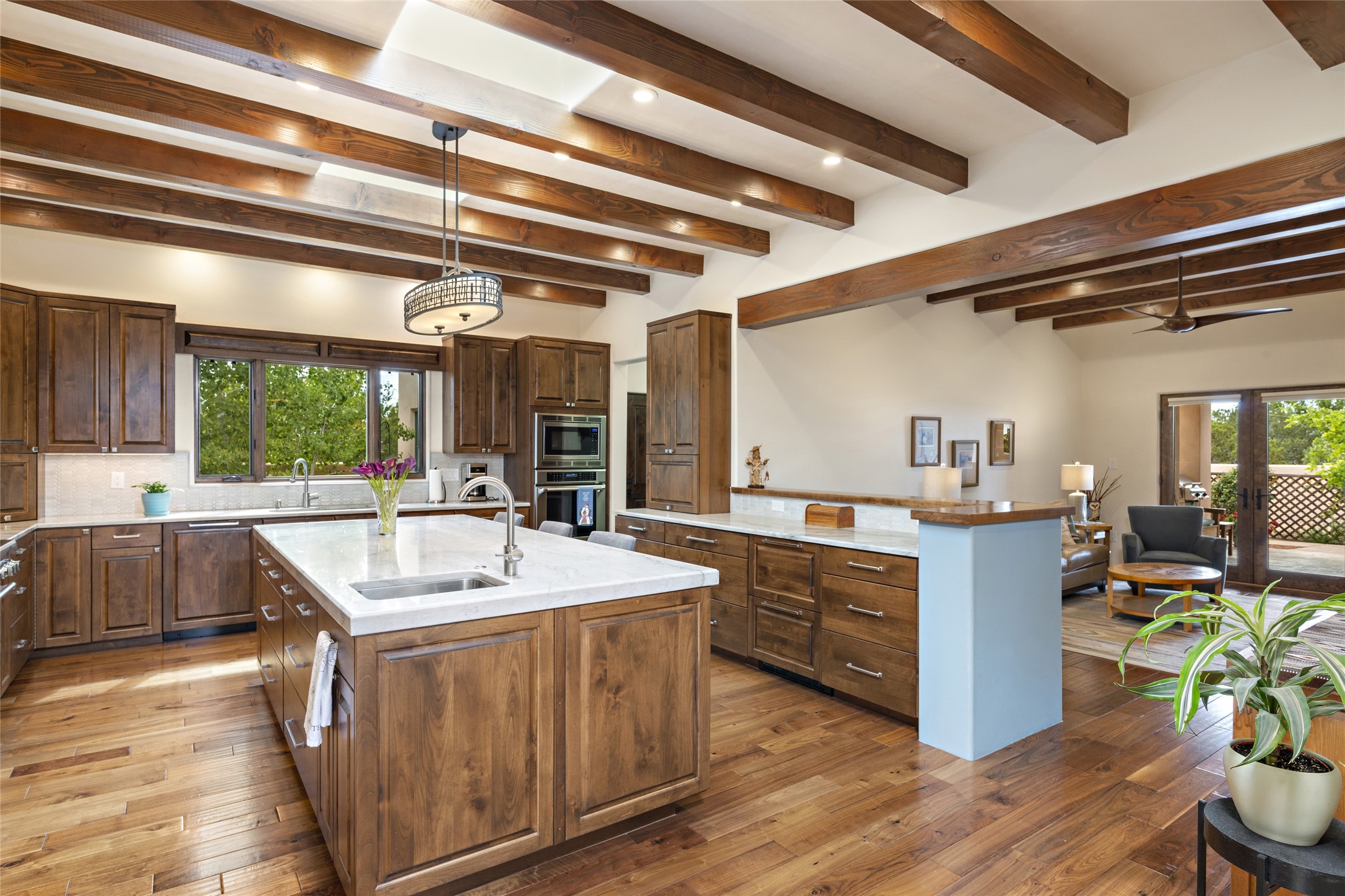 This thoughtfully designed, custom-built home with beautiful views of the Sangre de Cristo Mountains is located in the Sierra Rosa Loop enclave on a private cul-de-sac in Las Campanas. Owner-built and lightly lived-in, the property has been meticulously maintained. A lovely landscaped entrance entrance welcomes visitors to a front vestibule and beckons entry to the open living/dining area with high ceilings and access to the outdoor east facing portal. The large gourmet kitchen is complete with high-end appliances and a large center island, ideal for entertaining, and opens to the family area and north-facing portal with a miniature practice putting green. The separation of the primary bedroom and guest bedroom wings is ideal. Located off the family area is an office and the generous primary bedroom/spa bath with a large walk-in closet and convenient to the laundry room. The guest wing is on the opposite side of the home and each guest bedroom is ensuite with a shared breakfast bar area. Outdoor spaces are irrigated with manicured landscaping and there are partial views to the Jemez Mountains. 15 minutes to the Sante Fe Plaza and the Santa Fe Airport. Memberships to the Club at Las Campanas are optional and available for purchase upon approval.