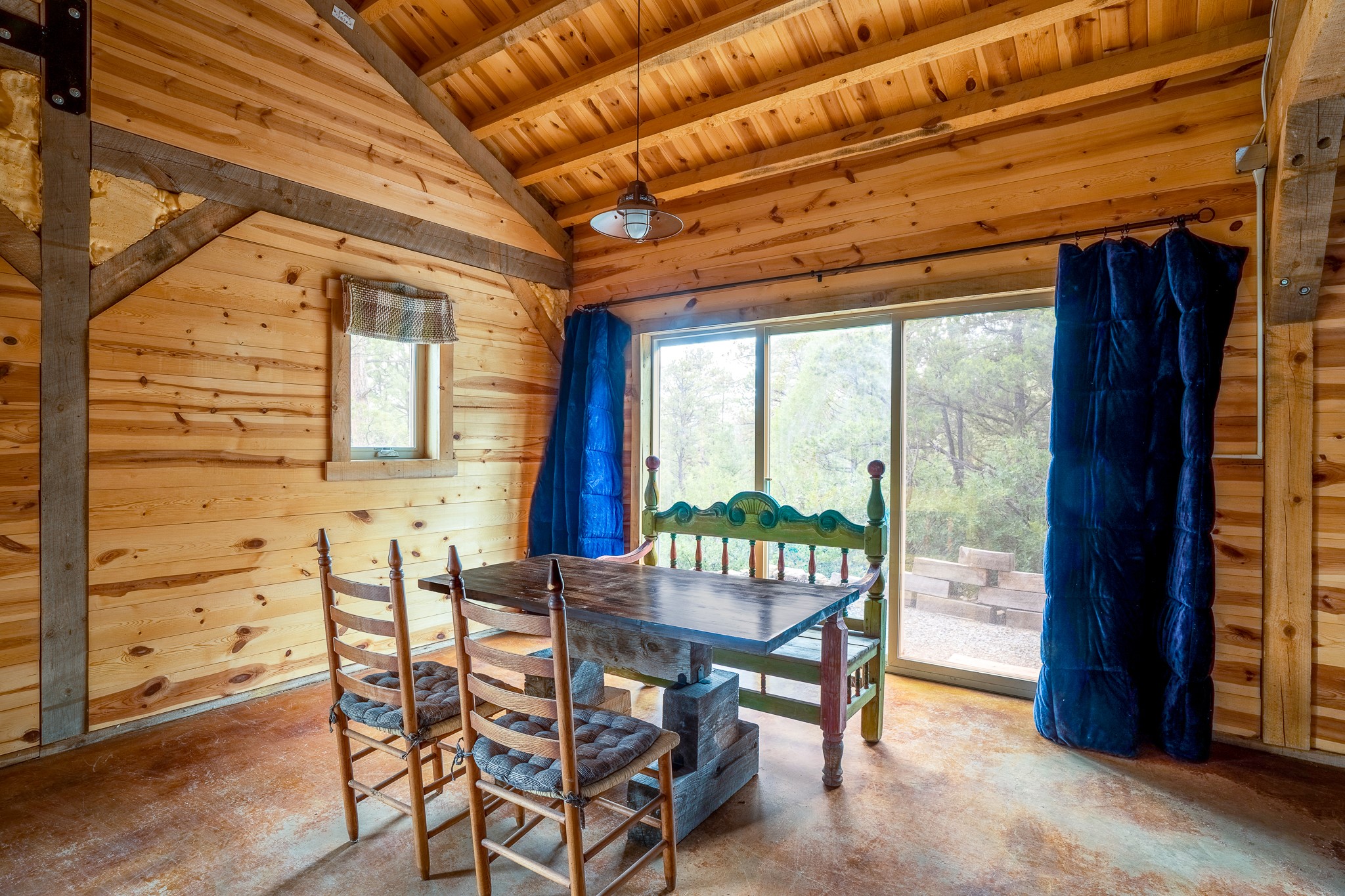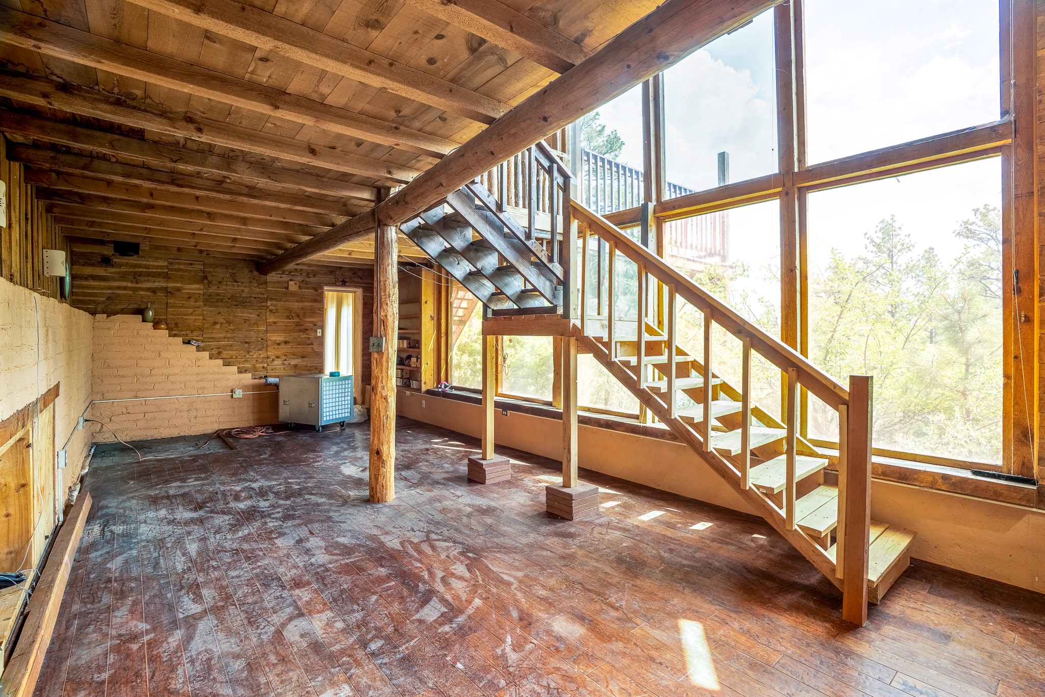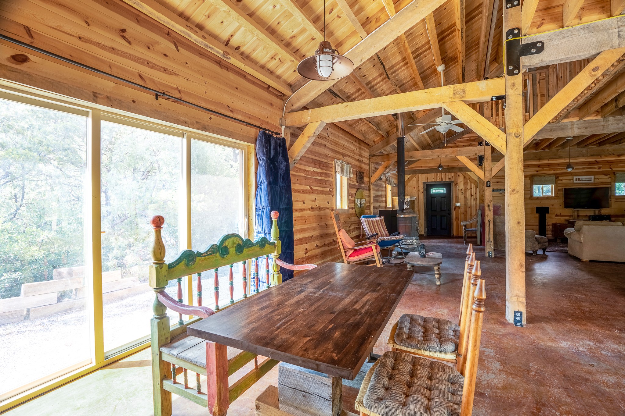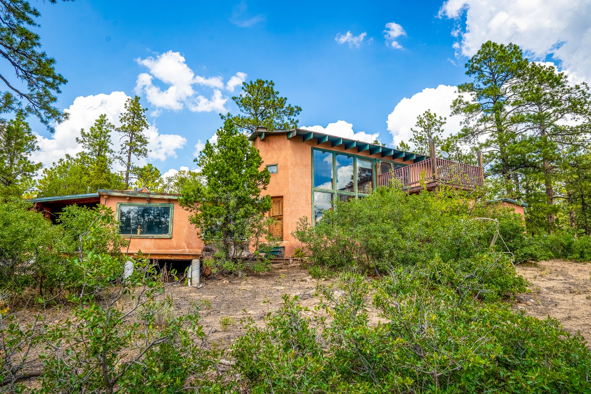 Discover serenity in this beautiful property, nine plus acres on La Cueva Road, in Glorieta. Embrace the rural setting with mature pine trees and captivating rock outcroppings. "The Barn," a spacious cabin-style home on the property, offers off-grid living at its finest. With a small PV solar system, water cistern, composting toilet and clawfoot bathtub, it's a sustainable retreat. Large exposed beams frame two loft spaces, connected by a great center staircase and catwalk. The open main level integrates the kitchen, dining, and living areas seamlessly with 3 sets of glass doors to nature. The original main structure will require renovation and is currently uninhabitable but offers features such as a private well, septic, electric utility services, large south-facing windows, sun deck, loft space, and a private primary suite. Escape the city to this rustic haven just 40 minutes from Santa Fe. Whether you seek tranquility or a creative sanctuary, this property offers both - a genuine mountain retreat. This property is an estate and being sold "as-is" with limited information available. Will most likely need to be a cash transaction given condition.