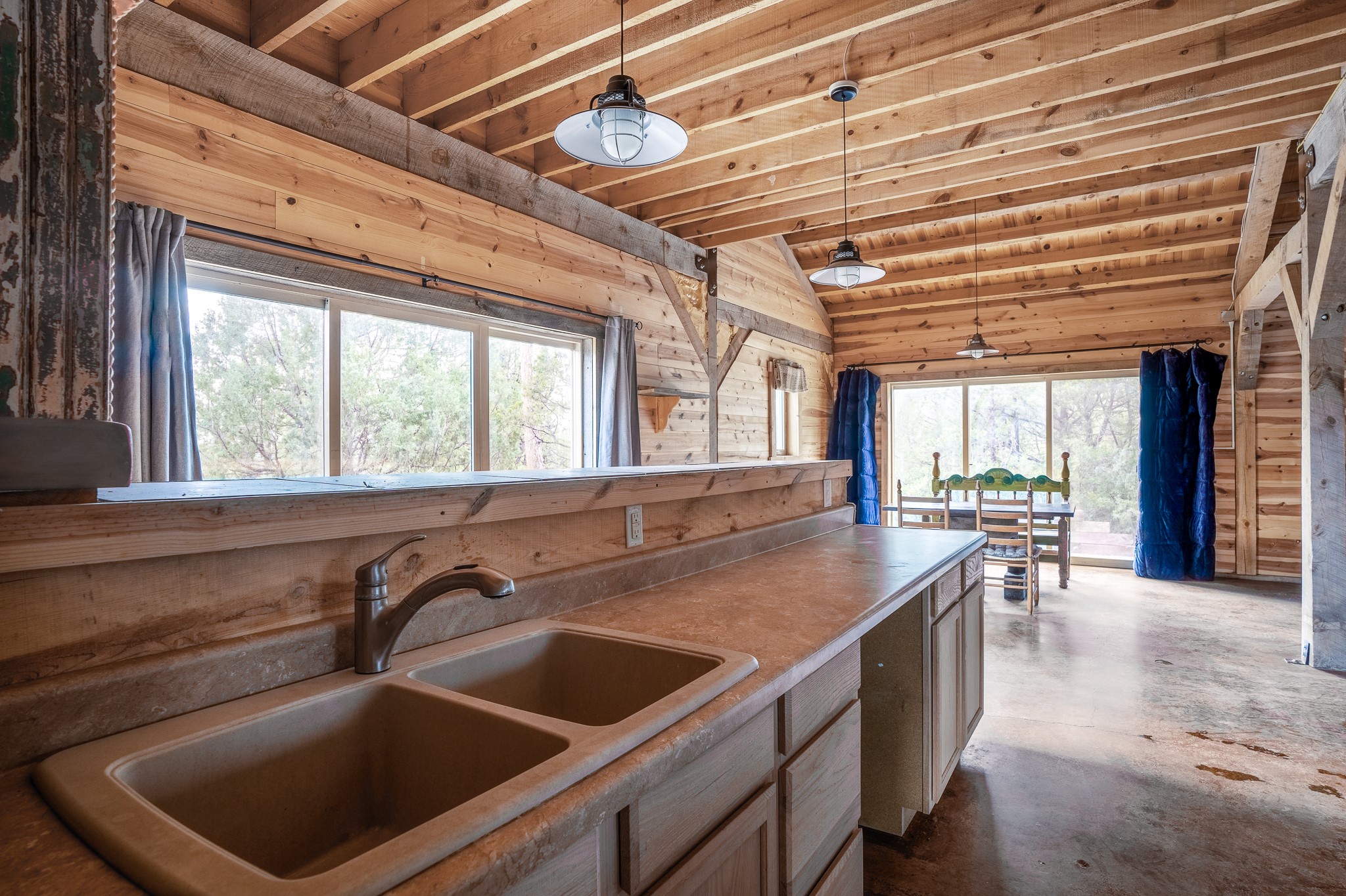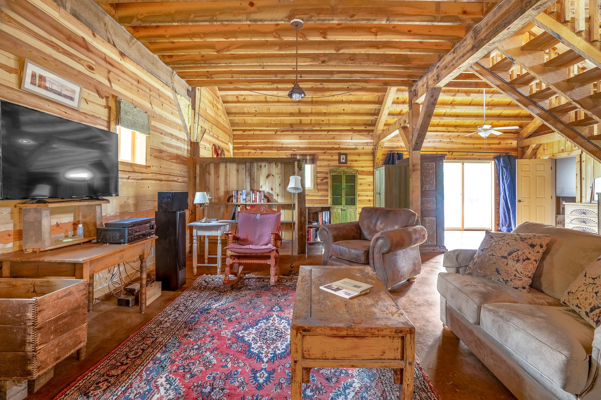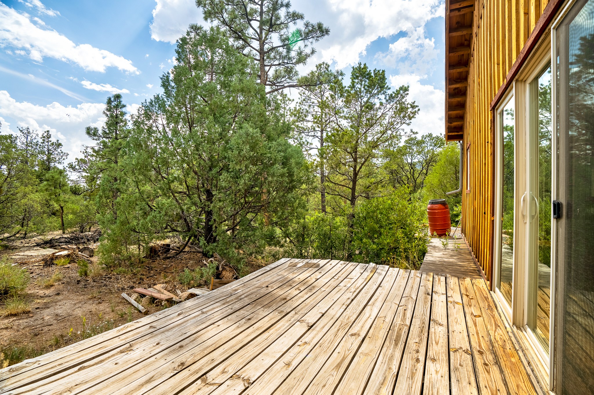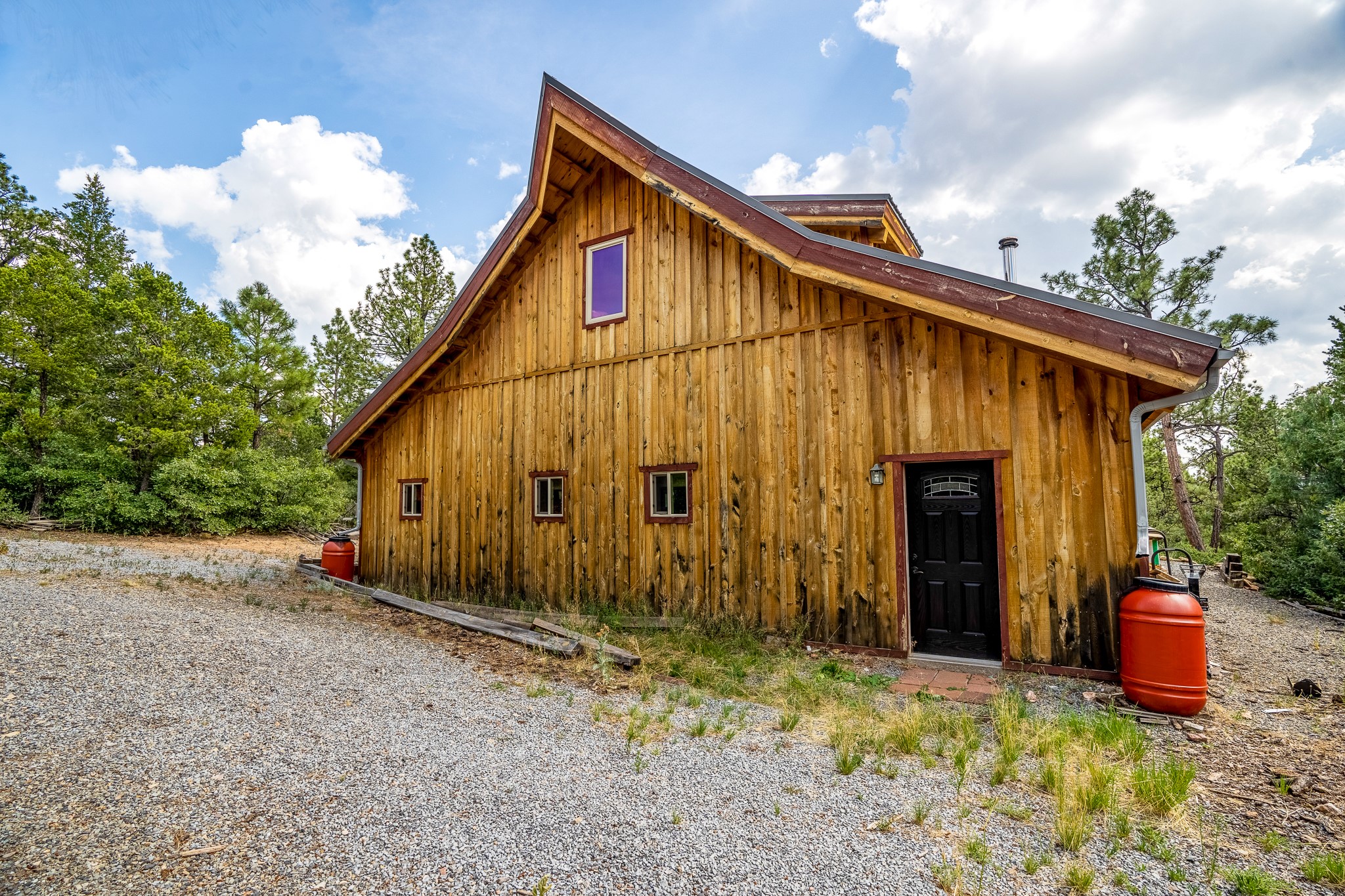 Discover serenity in this beautiful property, nine plus acres on La Cueva Road, in Glorieta. Embrace the rural setting with mature pine trees and captivating rock outcroppings. "The Barn," a spacious cabin-style home on the property, offers off-grid living at its finest. With a small PV solar system, water cistern, composting toilet and clawfoot bathtub, it's a sustainable retreat. Large exposed beams frame two loft spaces, connected by a great center staircase and catwalk. The open main level integrates the kitchen, dining, and living areas seamlessly with 3 sets of glass doors to nature. The original main structure will require renovation and is currently uninhabitable but offers features such as a private well, septic, electric utility services, large south-facing windows, sun deck, loft space, and a private primary suite. Escape the city to this rustic haven just 40 minutes from Santa Fe. Whether you seek tranquility or a creative sanctuary, this property offers both - a genuine mountain retreat. This property is an estate and being sold "as-is" with limited information available. Will most likely need to be a cash transaction given condition.