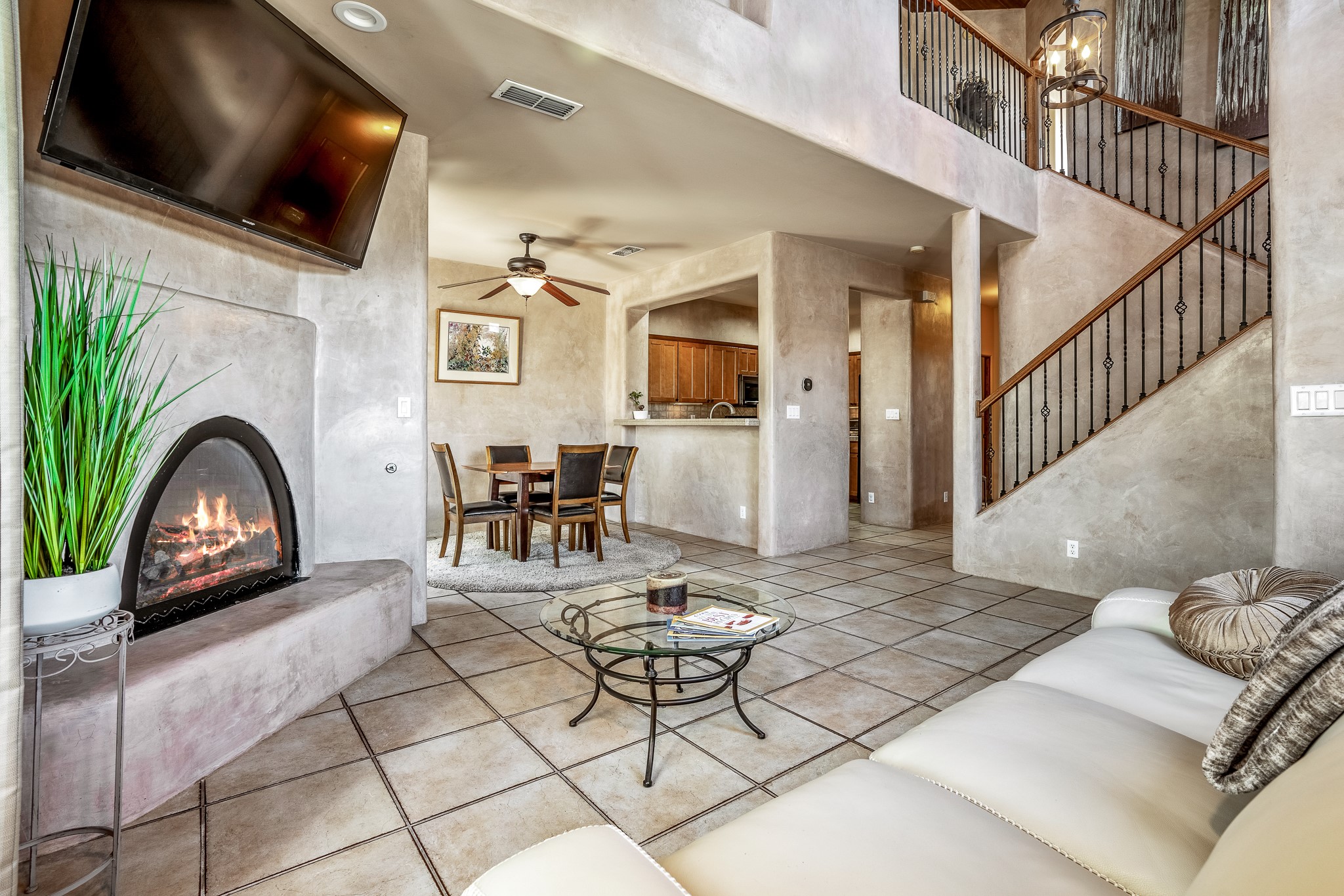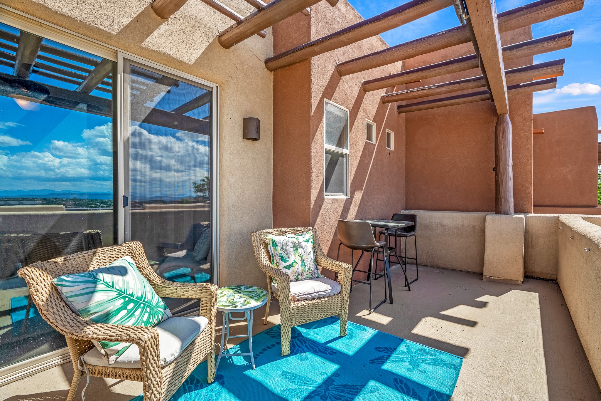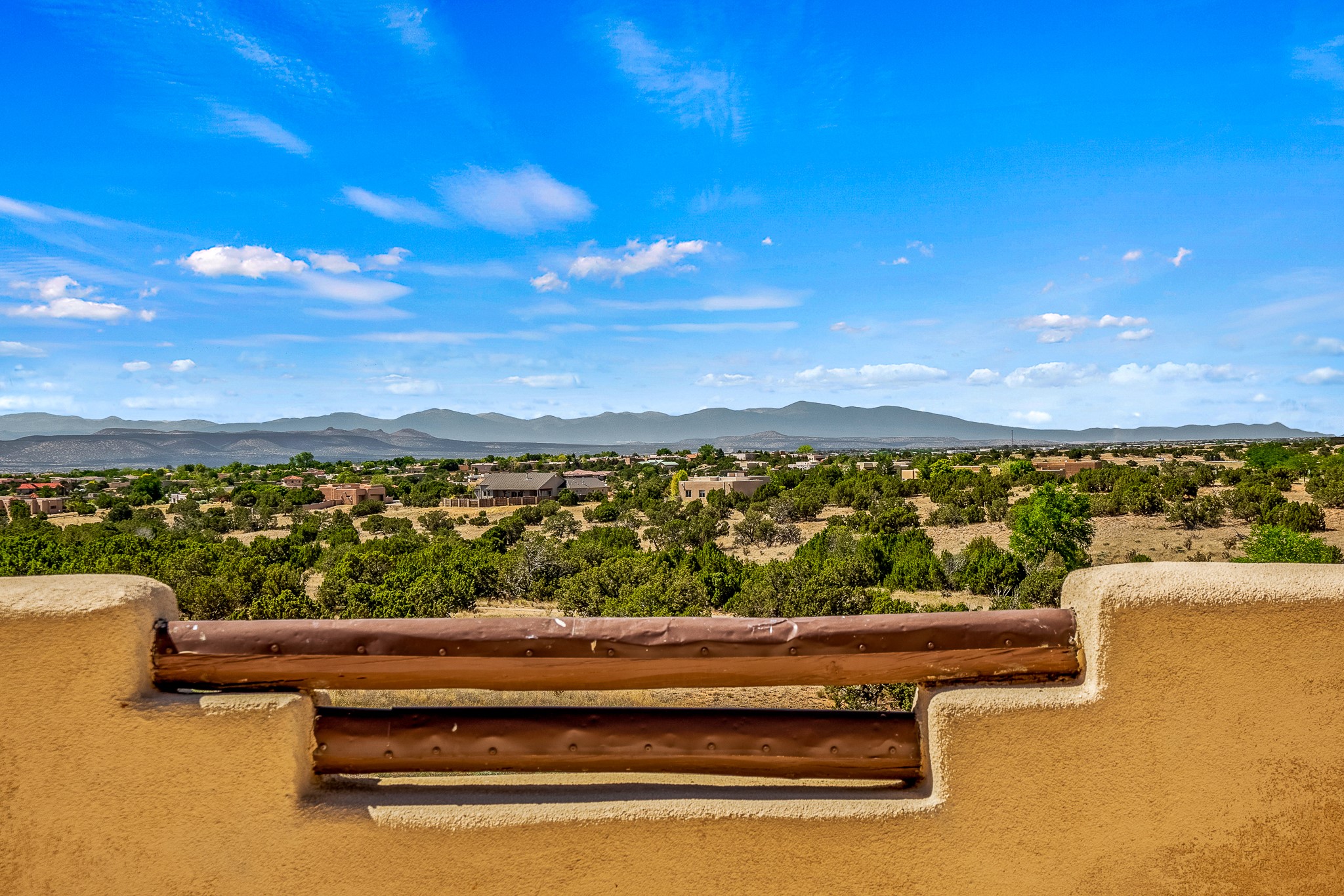 Enchanting townhome in Rancho Viejo with superior finishes and superb VIEWS. This end-unit beauty in move-in ready condition has all the southwestern charm you seek in a peaceful community minutes from downtown Santa Fe. High ceilings are accentuated by round vigas with tongue & groove planks in rich wood tones while gleaming plaster walls, a corner kiva fireplace and wrought iron staircase add to the grace and elegance of this showpiece. Large windows capture mountain views in every level and allow natural light to fill the interior spaces. The open concept living, dining and kitchen areas with an easy flow between the inside and outdoor courtyards. An office and powder room on the main level add convenience and functionality. Fabulous views can be enjoyed from every window, displaying multiple mountain ranges, and boasts gorgeous sunrises and sunsets. A large upstairs deck adjoining the owner's suite brings the outdoors right inside. A second bedroom and hallway bath is sure to make guests feel at home. Other features include an attached 2-car garage, multiple flagstone patios, and recent re-roof. A groomed trail system through miles of open space, is a cyclist/walker/runner's dream. HOA dues cover most of exterior maintenance and repairs. Come see for yourself!