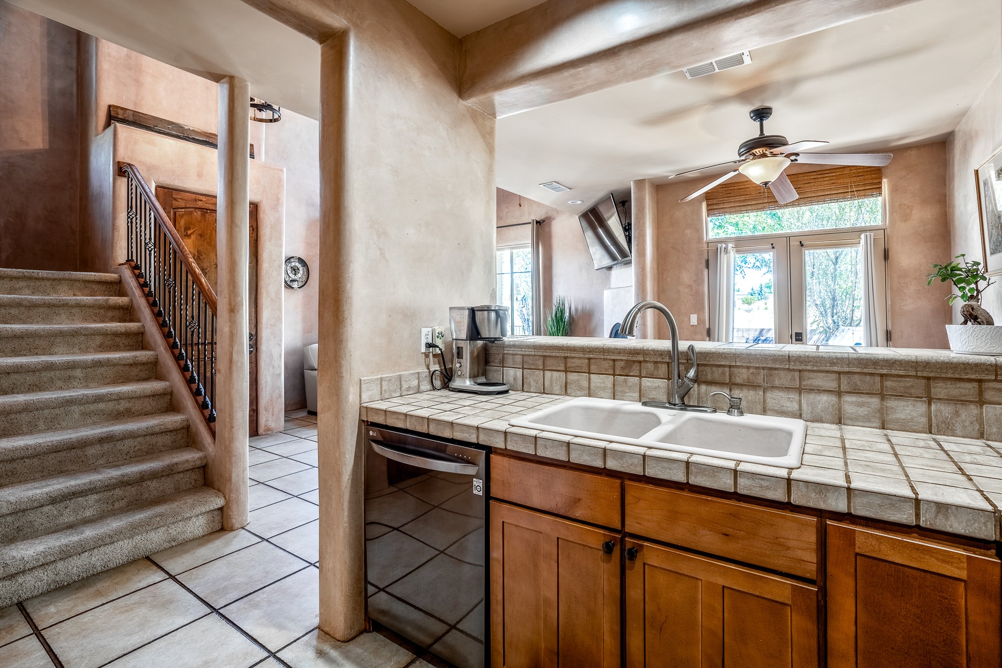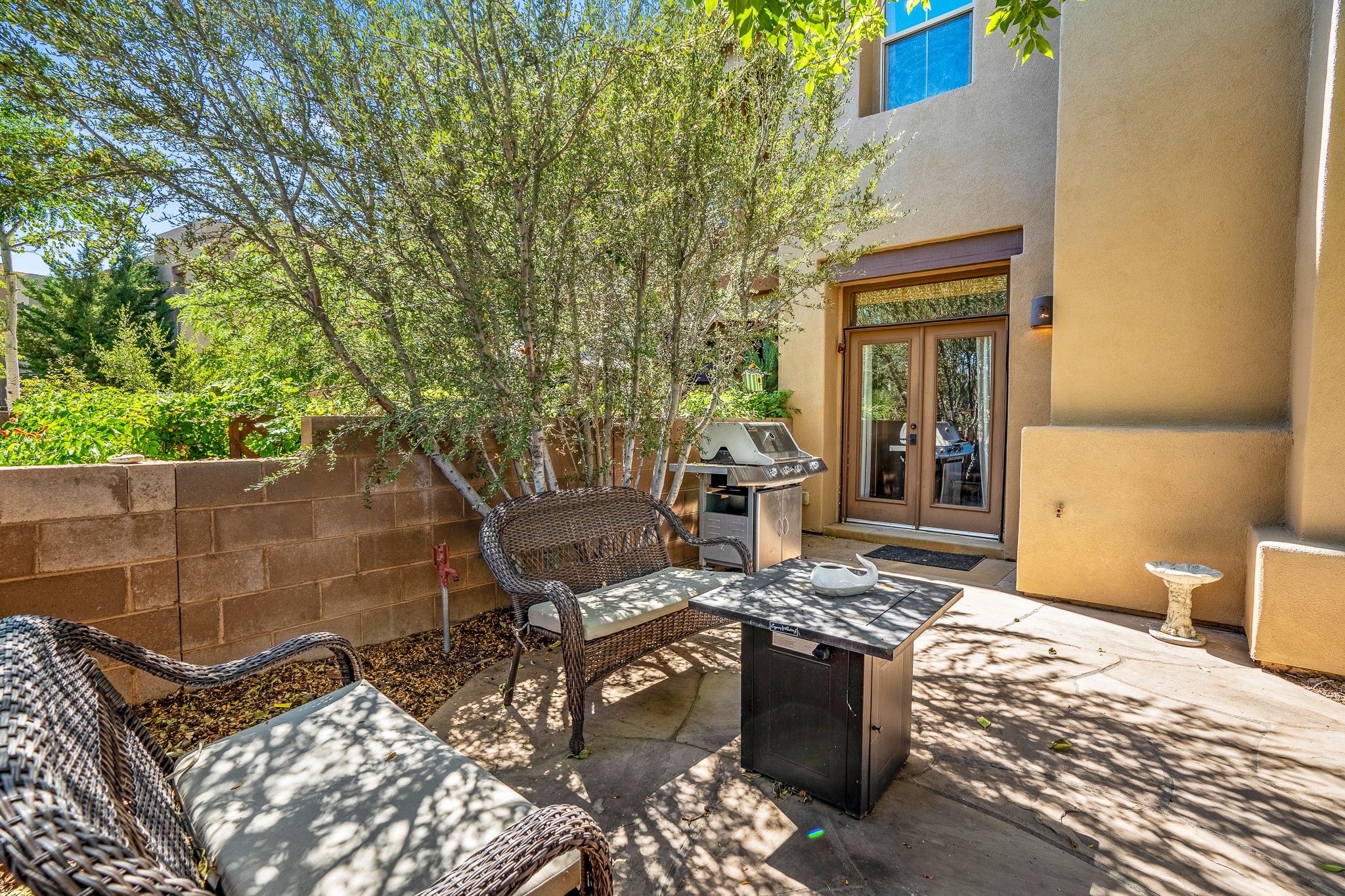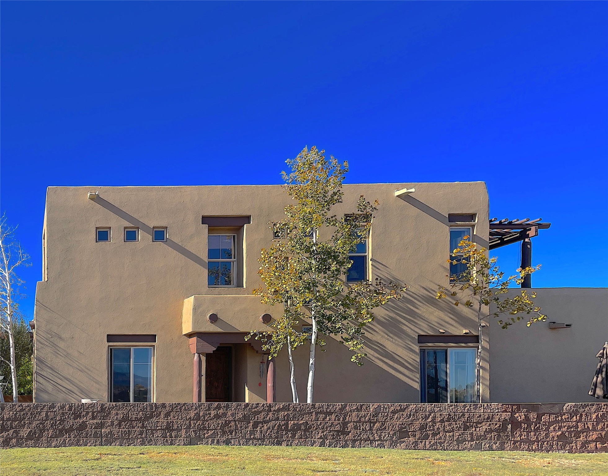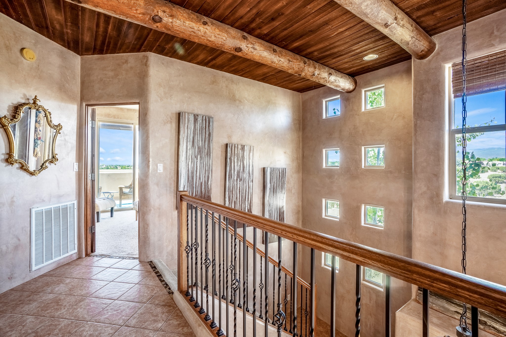 Enchanting townhome in Rancho Viejo with superior finishes and superb VIEWS. This end-unit beauty in move-in ready condition has all the southwestern charm you seek in a peaceful community minutes from downtown Santa Fe. High ceilings are accentuated by round vigas with tongue & groove planks in rich wood tones while gleaming plaster walls, a corner kiva fireplace and wrought iron staircase add to the grace and elegance of this showpiece. Large windows capture mountain views in every level and allow natural light to fill the interior spaces. The open concept living, dining and kitchen areas with an easy flow between the inside and outdoor courtyards. An office and powder room on the main level add convenience and functionality. Fabulous views can be enjoyed from every window, displaying multiple mountain ranges, and boasts gorgeous sunrises and sunsets. A large upstairs deck adjoining the owner's suite brings the outdoors right inside. A second bedroom and hallway bath is sure to make guests feel at home. Other features include an attached 2-car garage, multiple flagstone patios, and recent re-roof. A groomed trail system through miles of open space, is a cyclist/walker/runner's dream. HOA dues cover most of exterior maintenance and repairs. Come see for yourself!