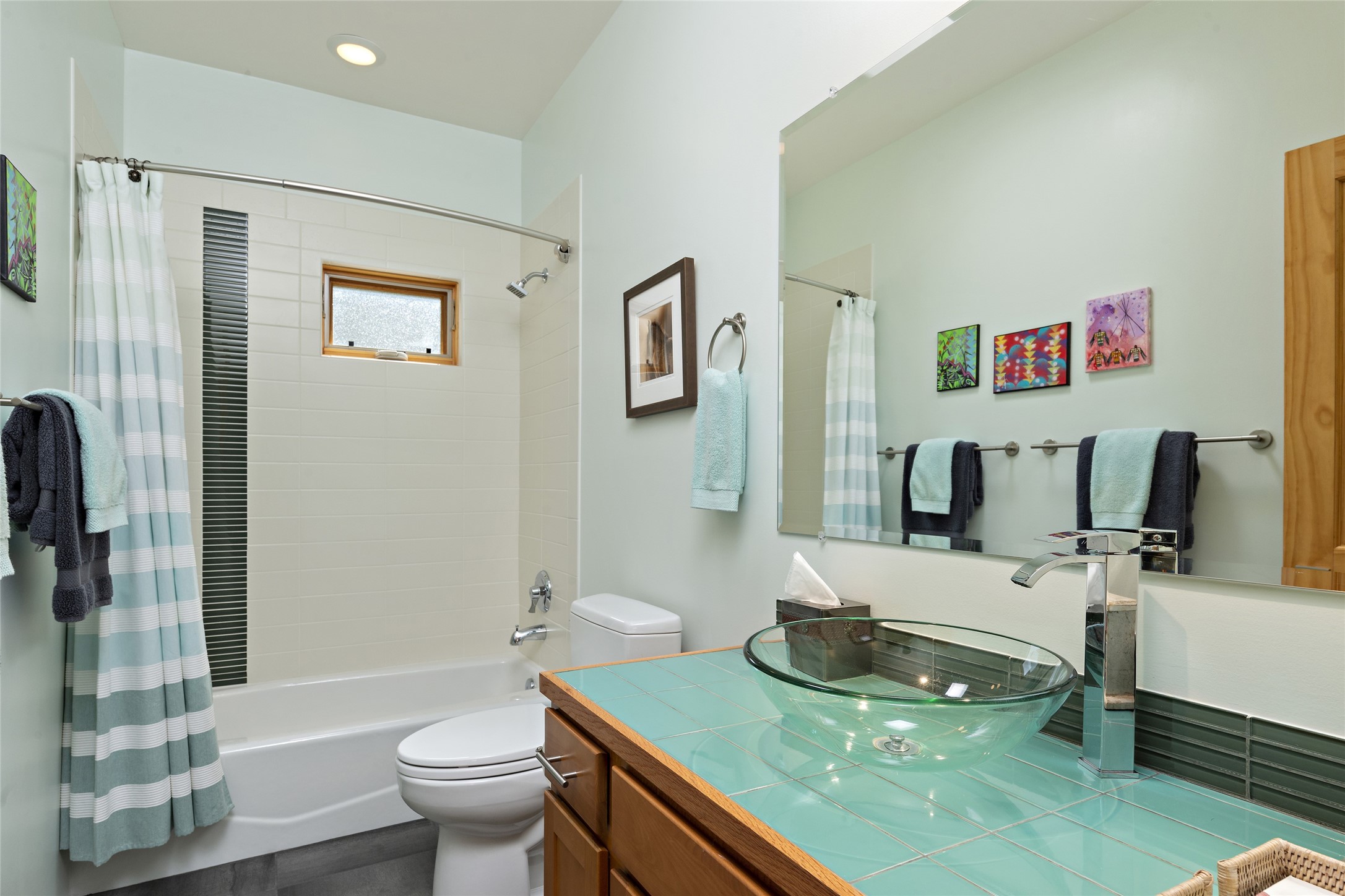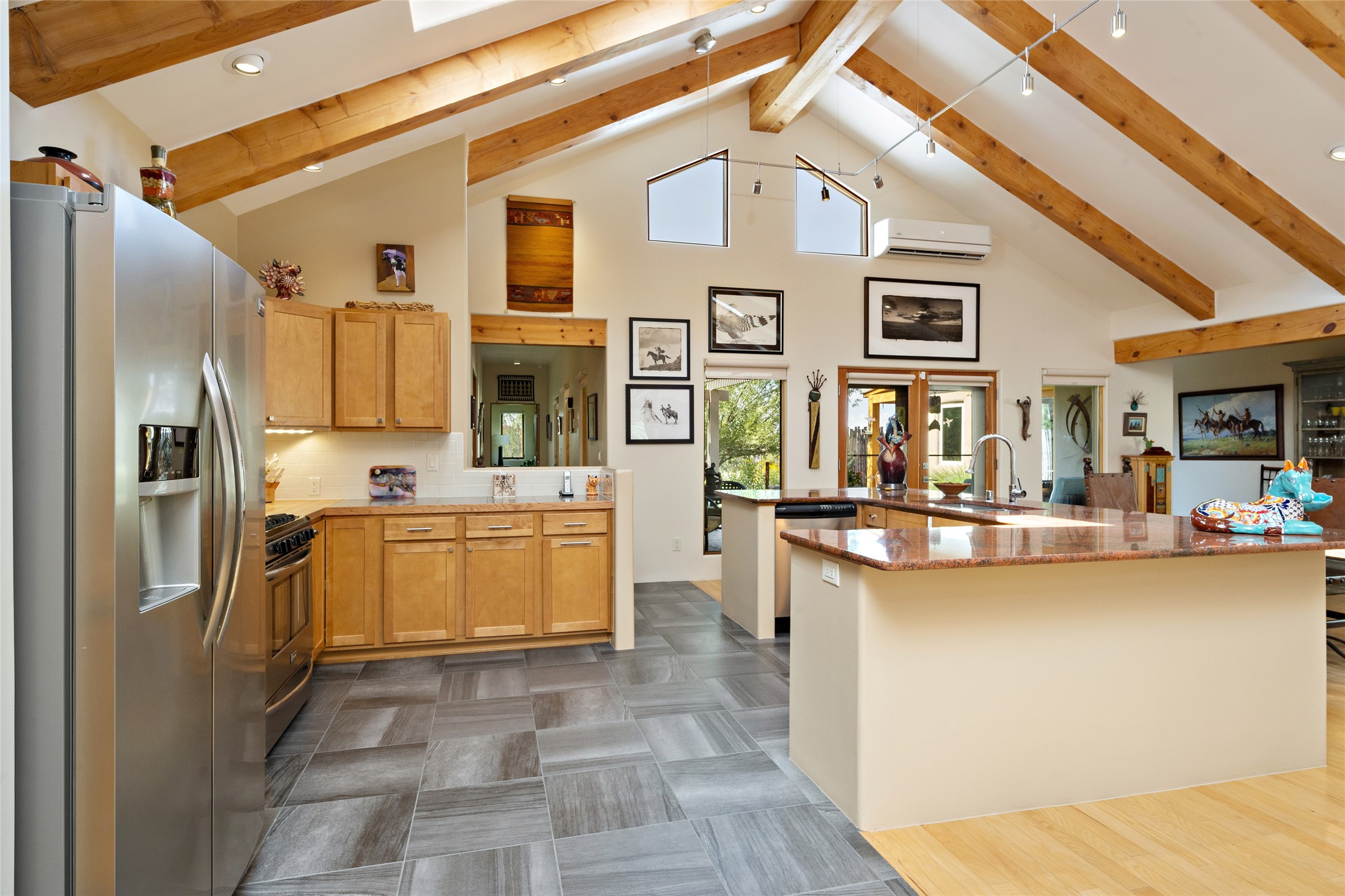 The home and location you have been waiting for - MOVE IN READY! Pitched pro-panel roof, 2300 square feet of absolute luxury, 3 bedrooms, 2 full baths all on one level. Large primary bedroom and guest room have California Closet Systems. Engineered wooden flooring and tile. The Primary suite is totally separated from the other two bedrooms. Third bedroom set up as an office has a built in desk and Closet Systems, all new solar shades and cellular shades throughout. New refrigerator and 4 mini-splits, plantation shutters, in-floor radiant heat. Laundry has CA Built-Ins, lighting with dimmers and on demand hot water. Living room boasts an elegant gas fireplace, open living room, kitchen and dining room with views to the landscaped back and side patio, coyote fencing, drip irrigation in all landscaped areas with native plants and trees leading to a designated green space. New gutters, 360 gallon catchment rain barrel; plus there are peak-boo views of the Sangre foothills from the living room. This home is a rare sparkling jewel that will amaze you!
